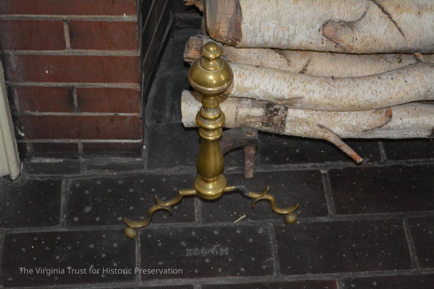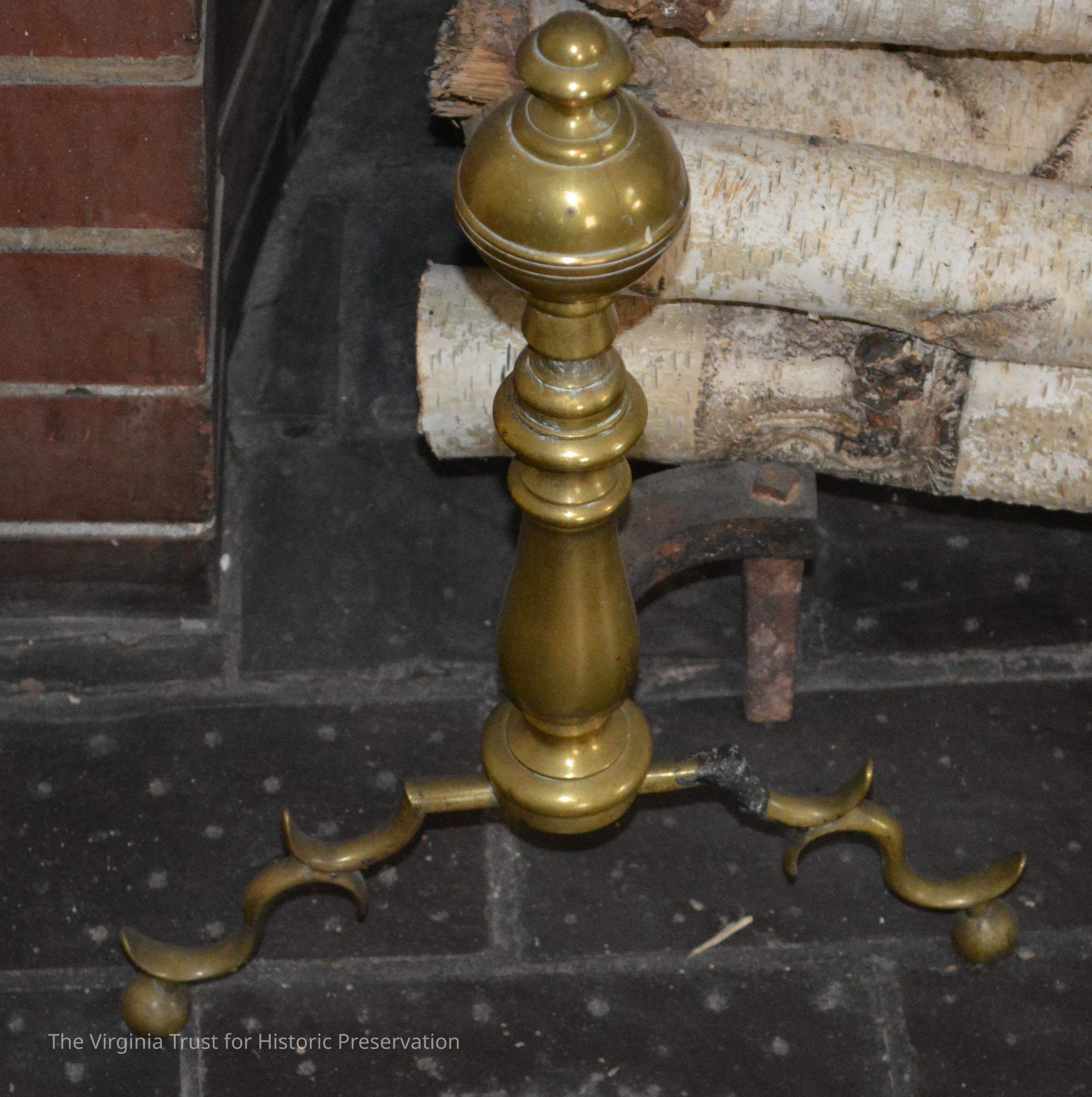 One of a pair of brass fireplace andirons. Queen Anne style.
