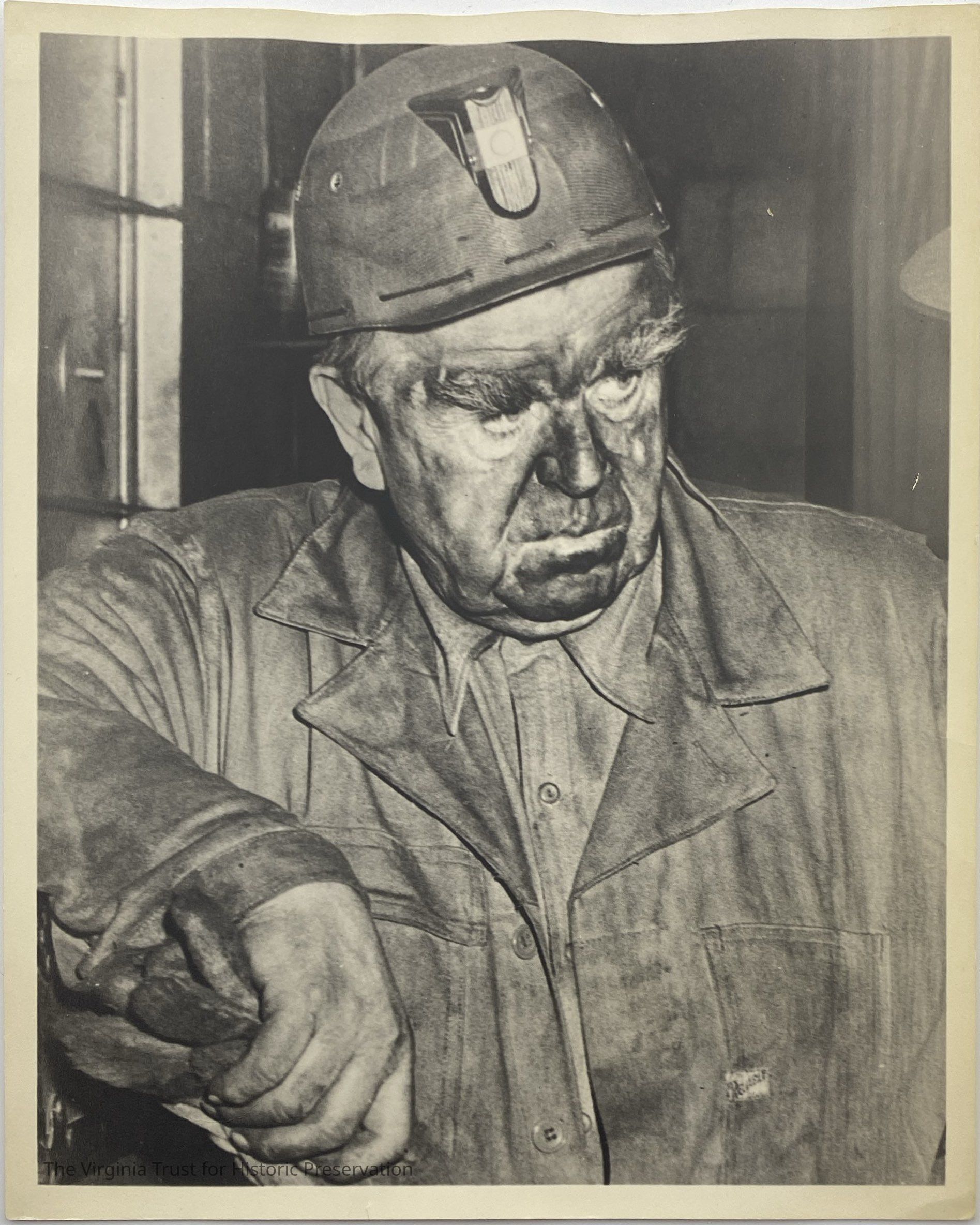 Reproduction black and white photograph of John L. Lewis in a coal miners uniform and hard hat. His fave is covered with coal dust. Lewis looks away from camera. Photograph taken after Lewis visited the mine disaster in West Frankfurt, Illinois.