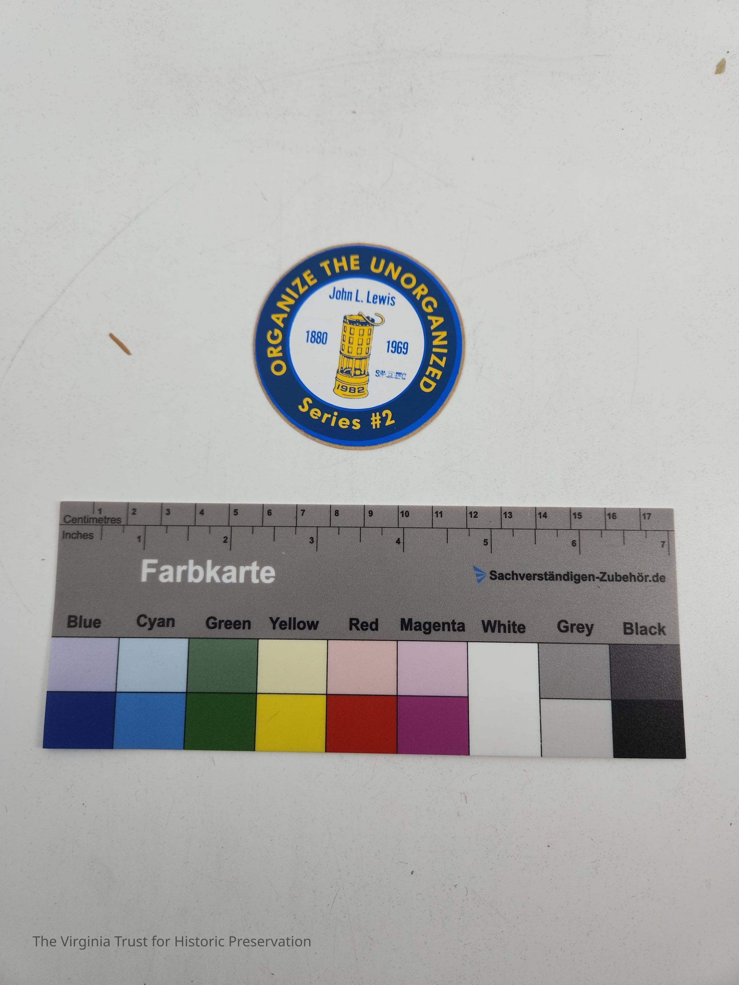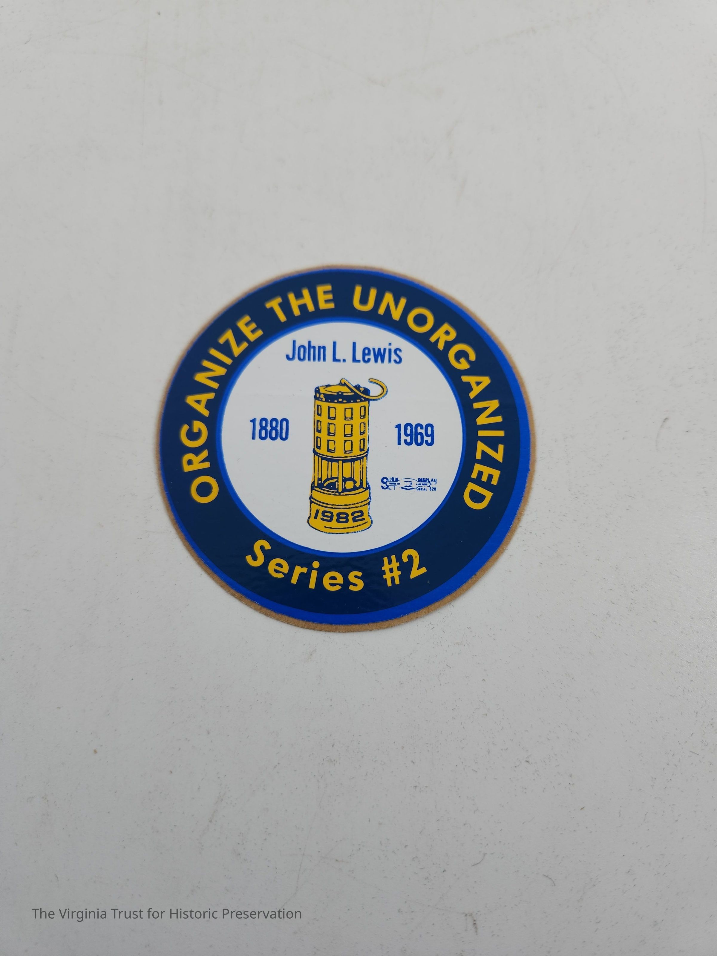 Blue, yellow, and white circular campaign sticker. Slogan of "ORGANIZE THE UNORGANIZED" and "JOHN L. LEWIS 1880-1969" and "SERIES #2" Group of 5 campaign stickers, promoting the UMWA, Mondale and John L. Lewis. All are still attached to their original adhesive backing and are in near pristine condition.