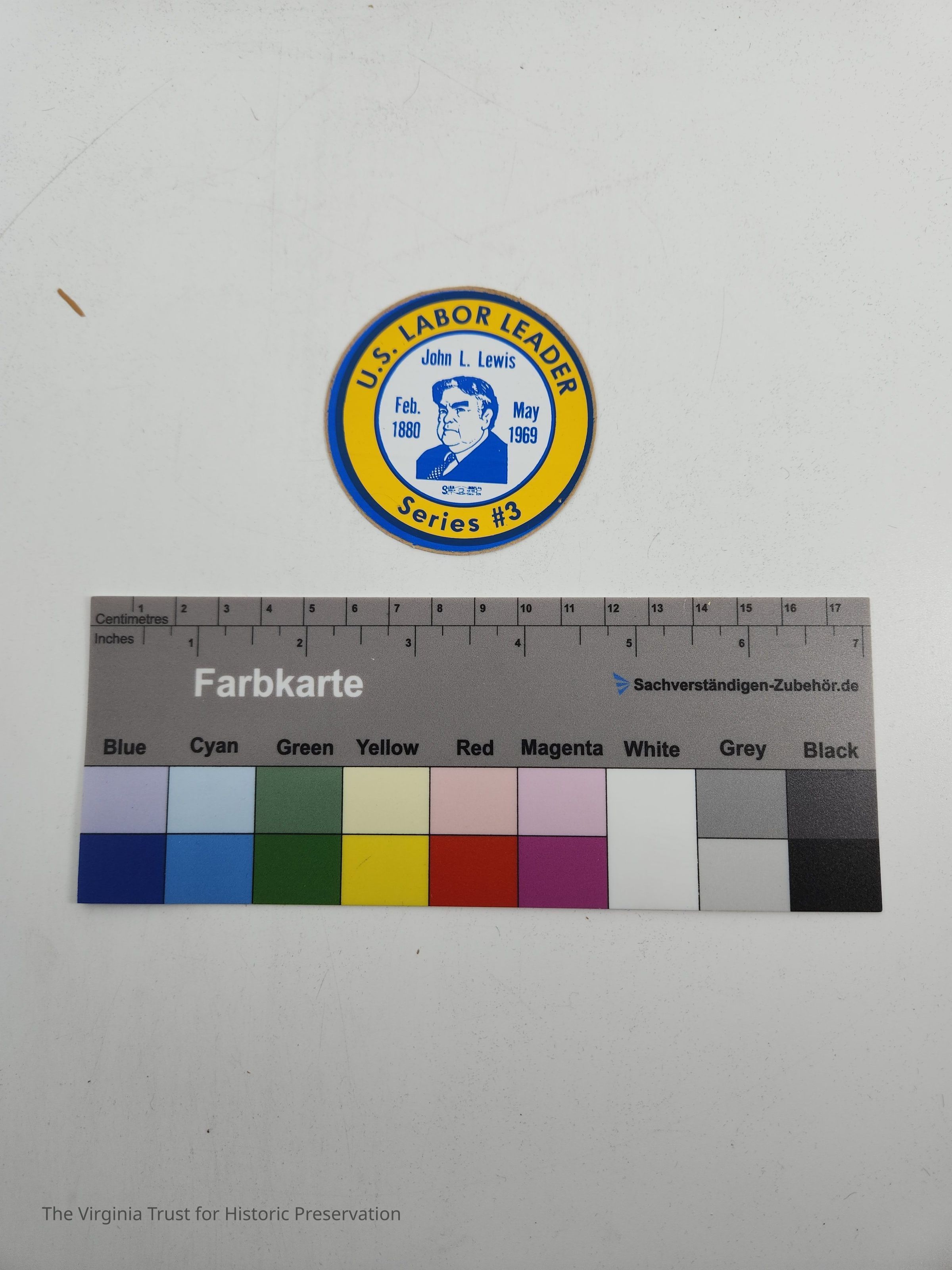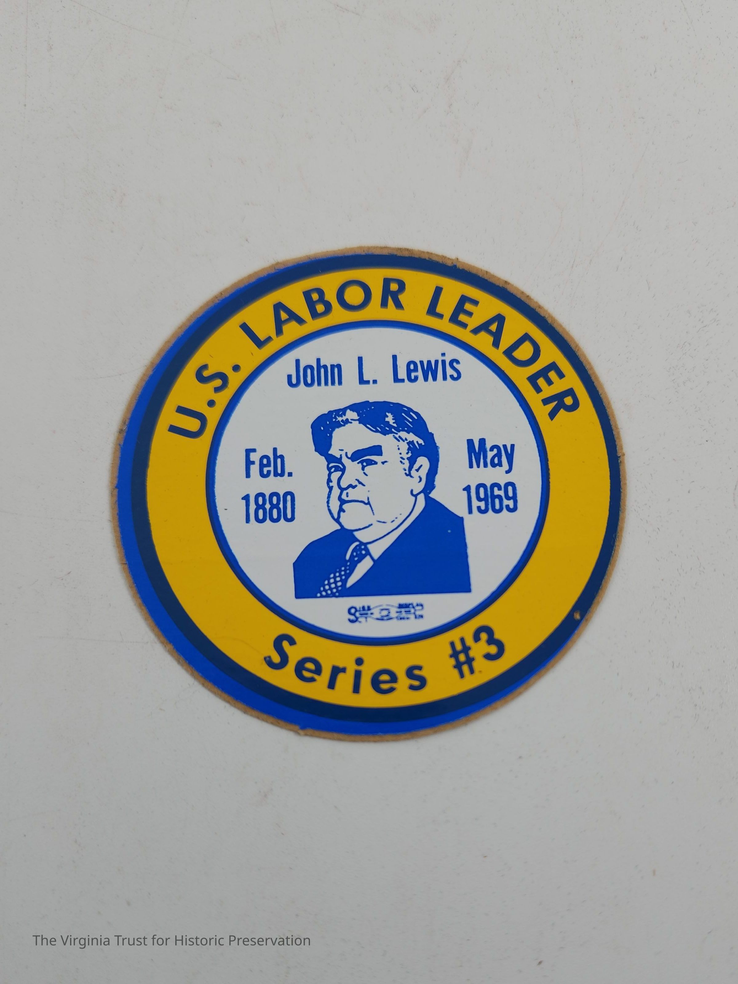 Yellow, white, and blue circular campaign sticker with "U.S. LABOR LEADER JOHN L LEWIS" "FEB 1880 MAY 1969" "SERIES #3" written on it as well as a picture of John L Lewis. One of a group of 5 campaign stickers, promoting the UMWA, Mondale and John L. Lewis. All are still attached to their original adhesive backing and are in near pristine condition.