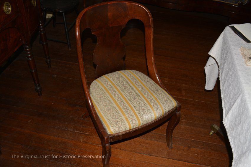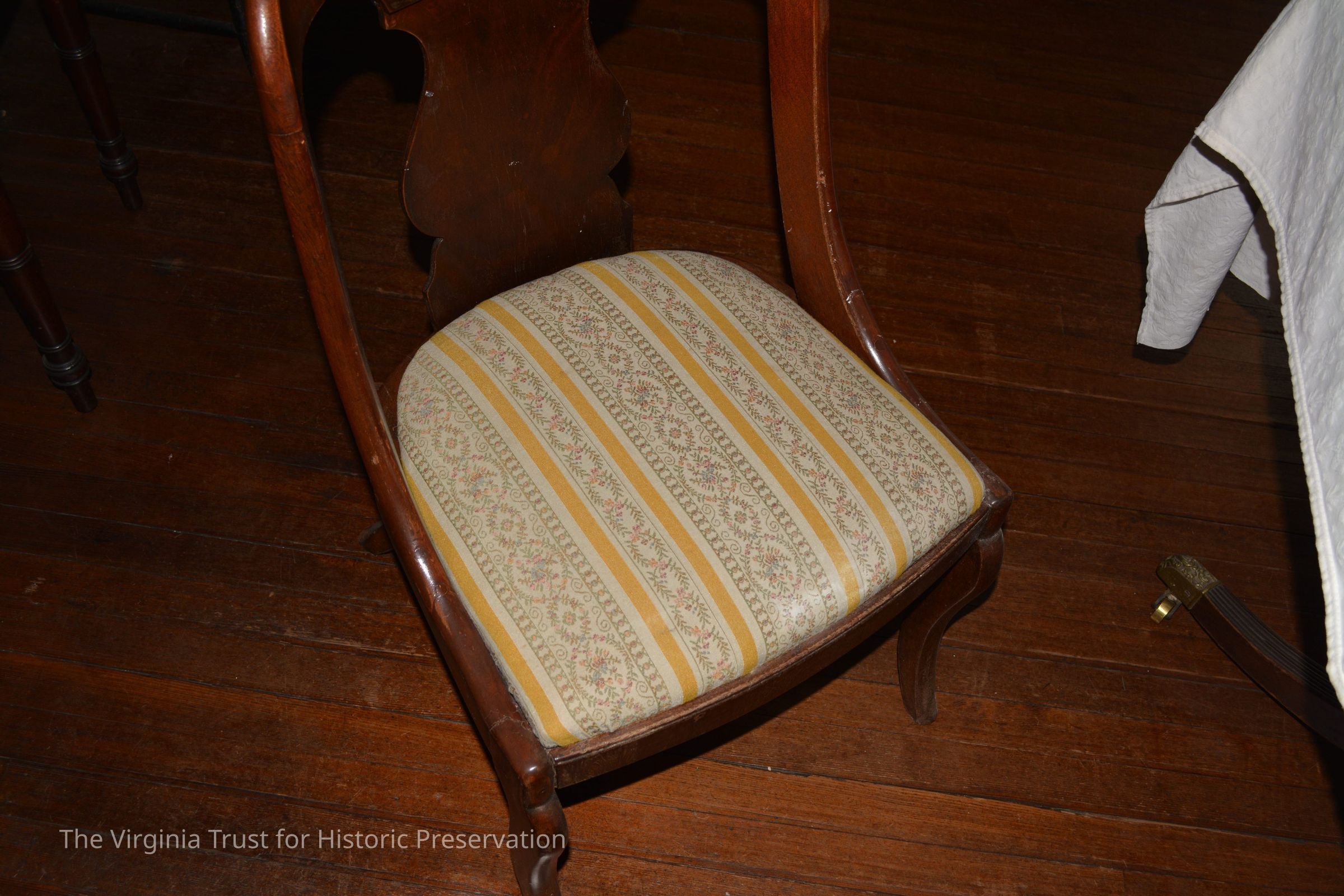 Chair with striped upholstery. Vertical stripes alternate between solid yellow line and a floral wreath line.