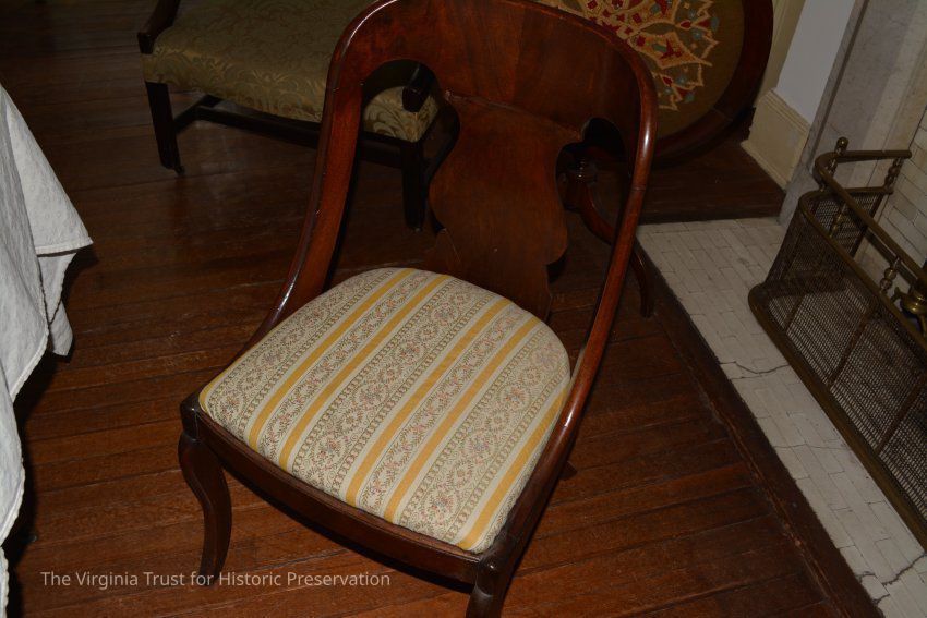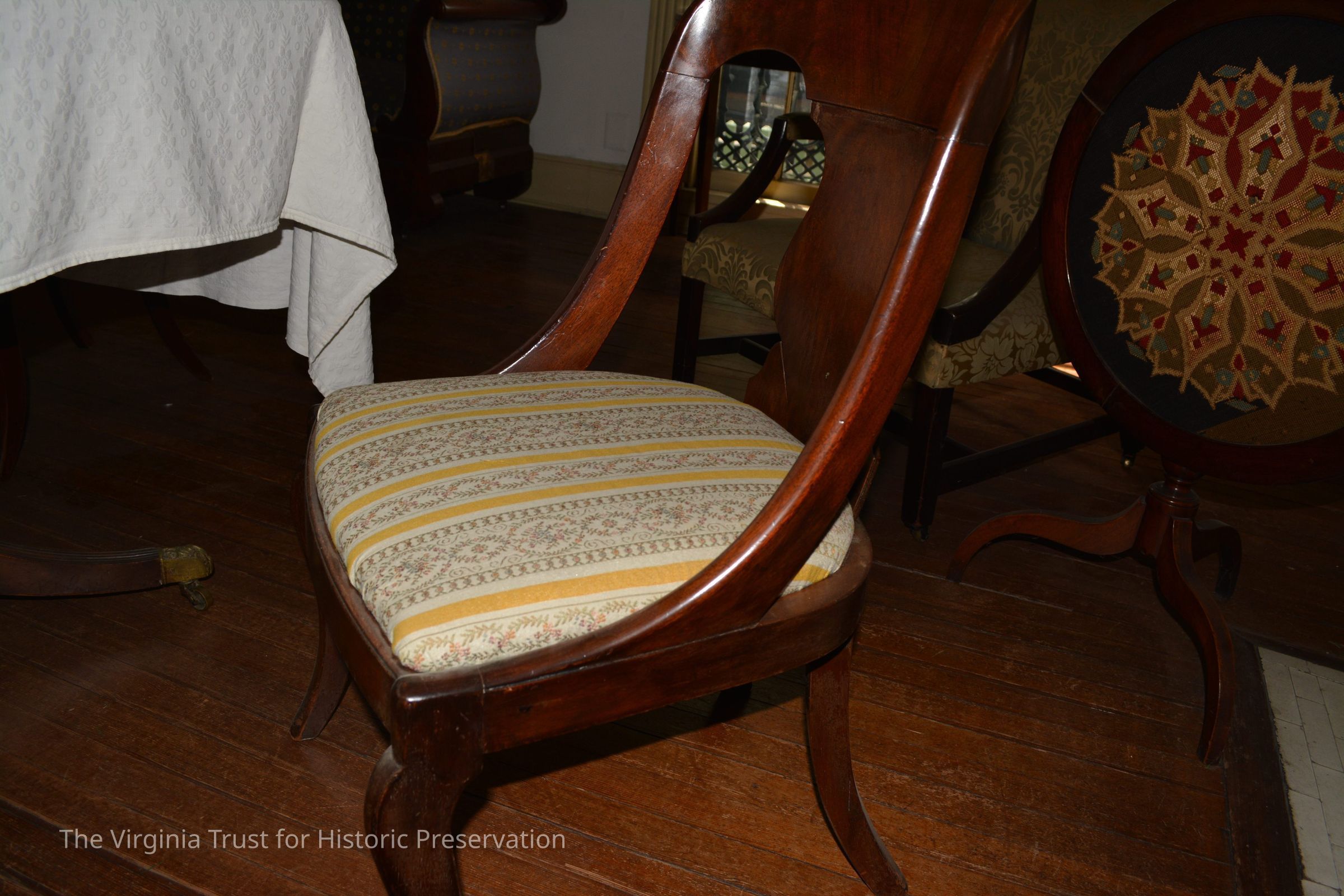 Chair with striped upholstery. Vertical stripes alternate between a solid yellow line and lines with a floral wreath design.