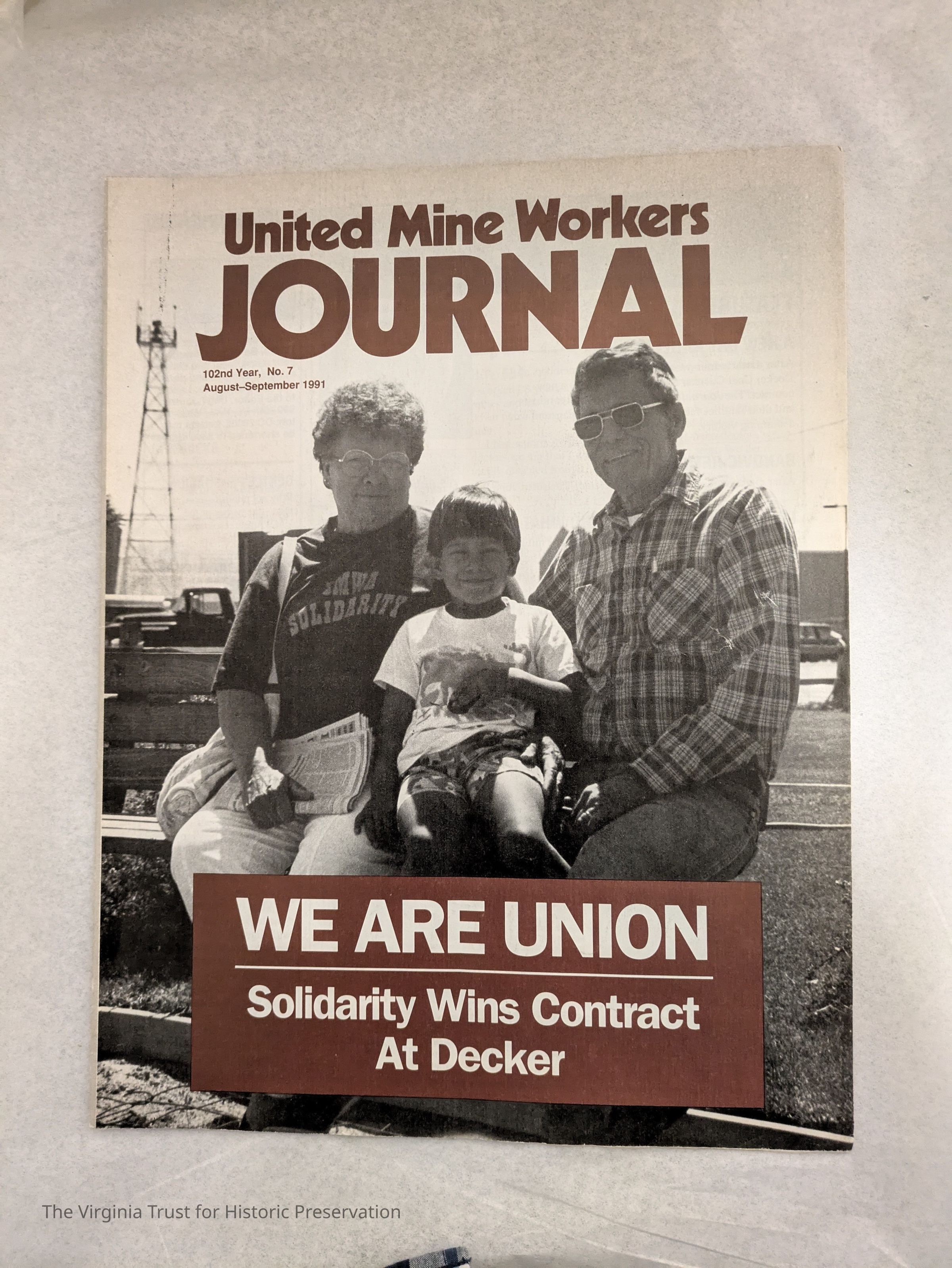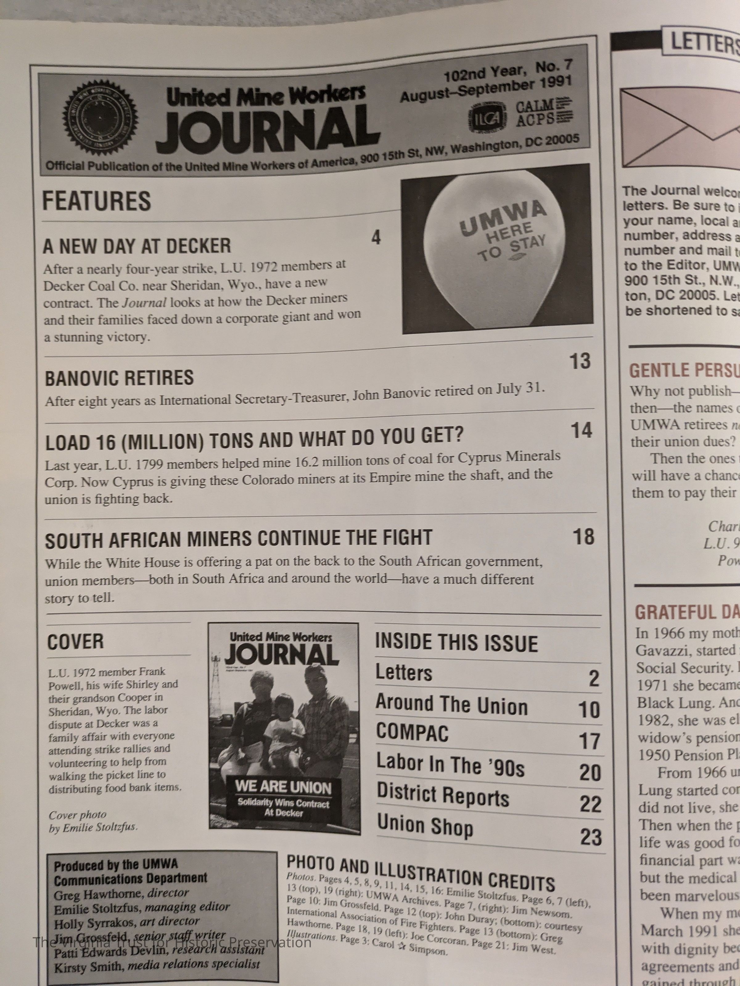 United Mine Workers Journal, 102nd Year, No. 7, August-September 1991, pp.23. Headline is "We Are Union; Solidarity Wins Contract at Decker." Cover photo is of the L.U. member Frank Powell, his wife Shirley and their grandson Cooper in Sheridan, Wyoming. Featured is the success of the L.U. 1972 members in getting new contract after nearly four year strike.Dimensions