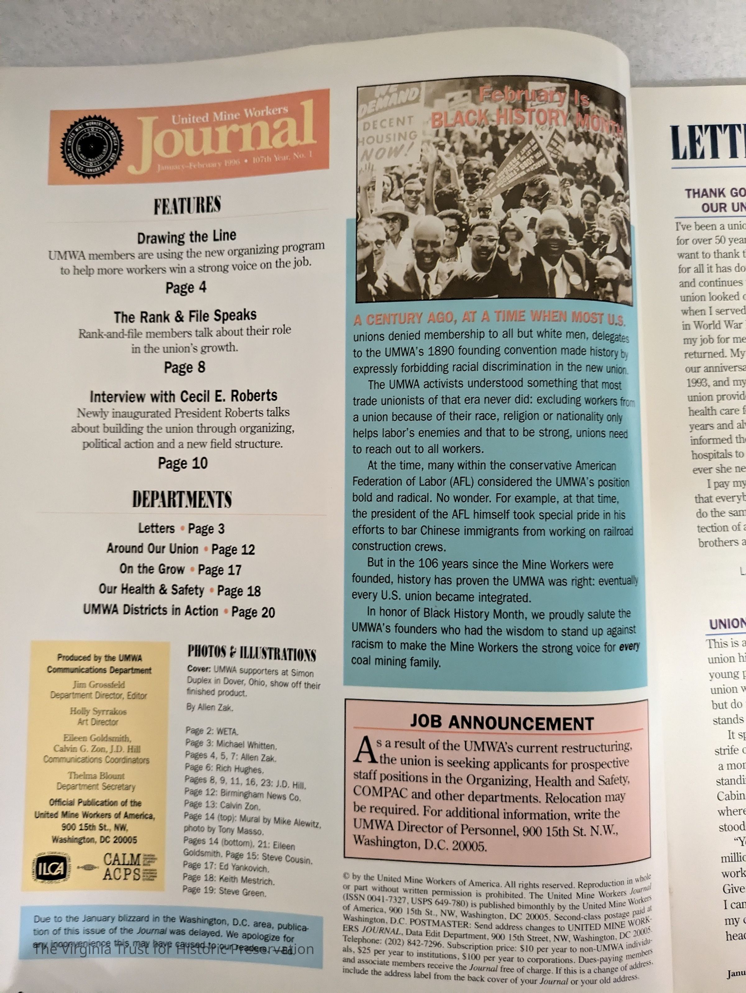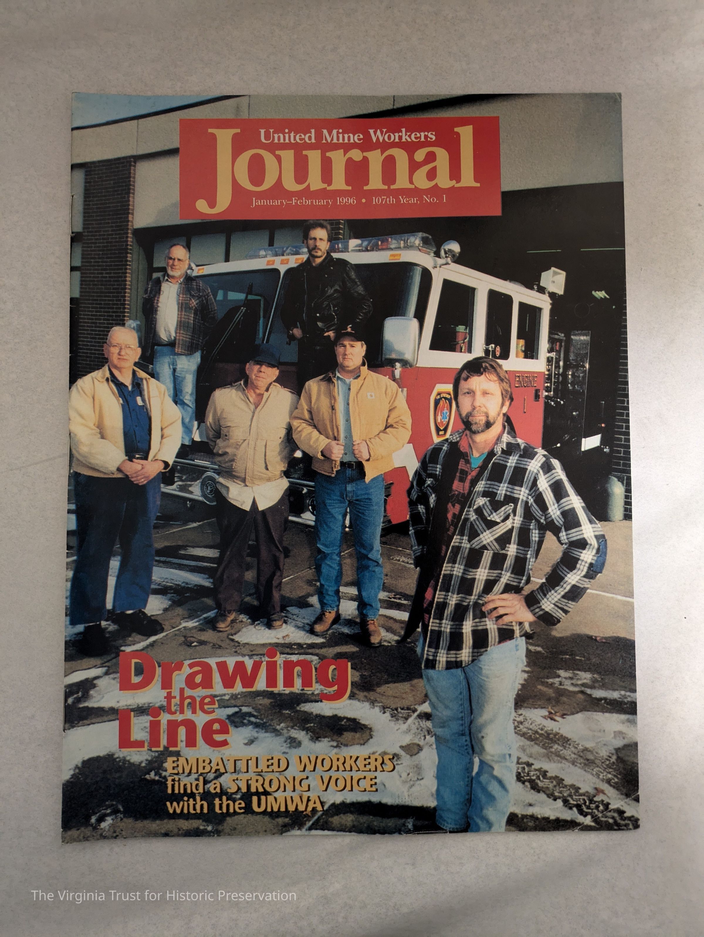 United Mine Workers Journal, 107th Year, No. 1, January-February 1996, pp 23. Headline is "Drawing the Line: Embattled Workers find a Strong Voice with the UMWA." Cover photo is of the UMWA supporters at Simon Duplex in Dover, Ohio with their finished product. Featured story is about how UMWA members are using a new organizing program to help more workers win a strong voice on the job.Dimensions