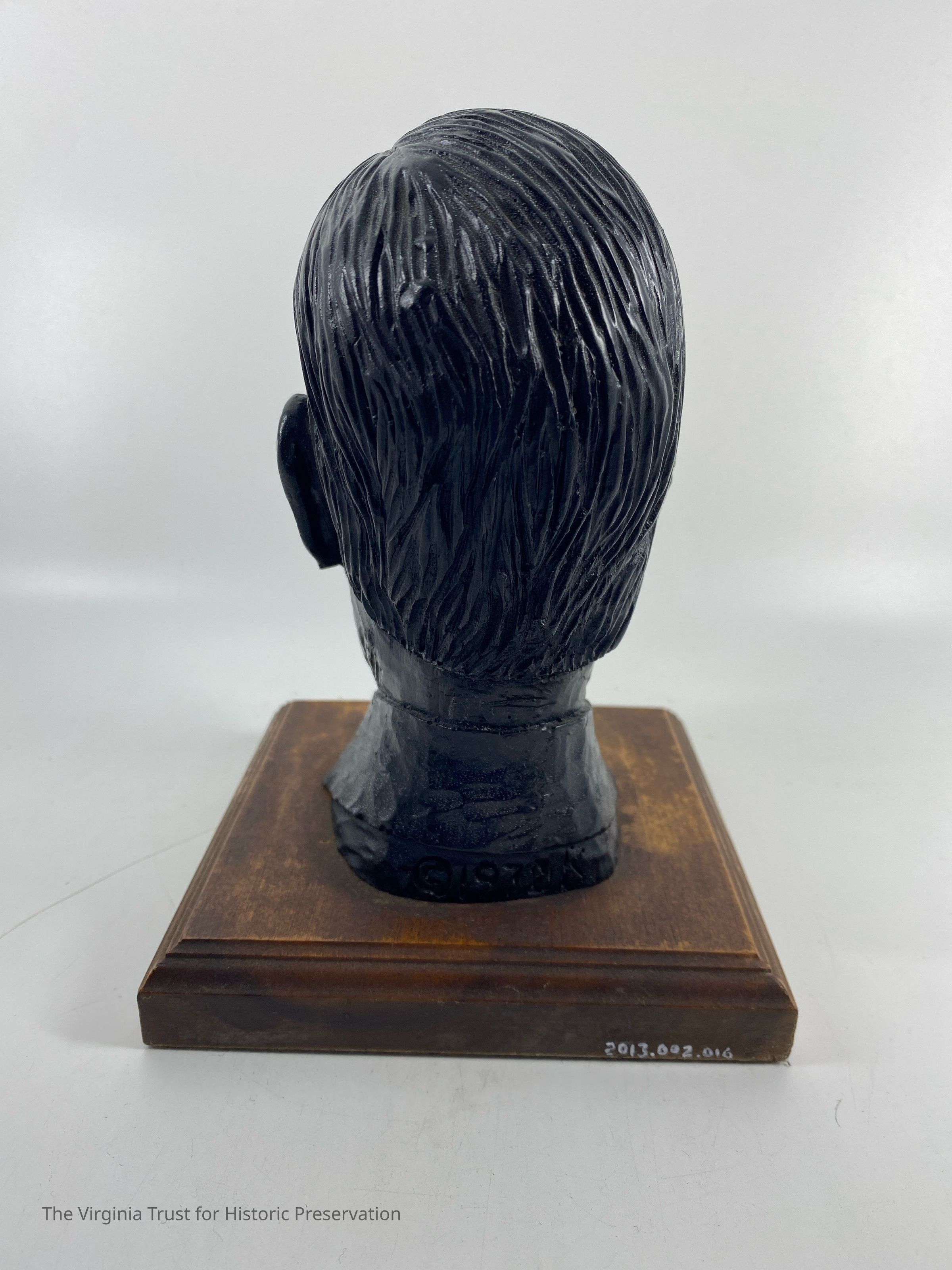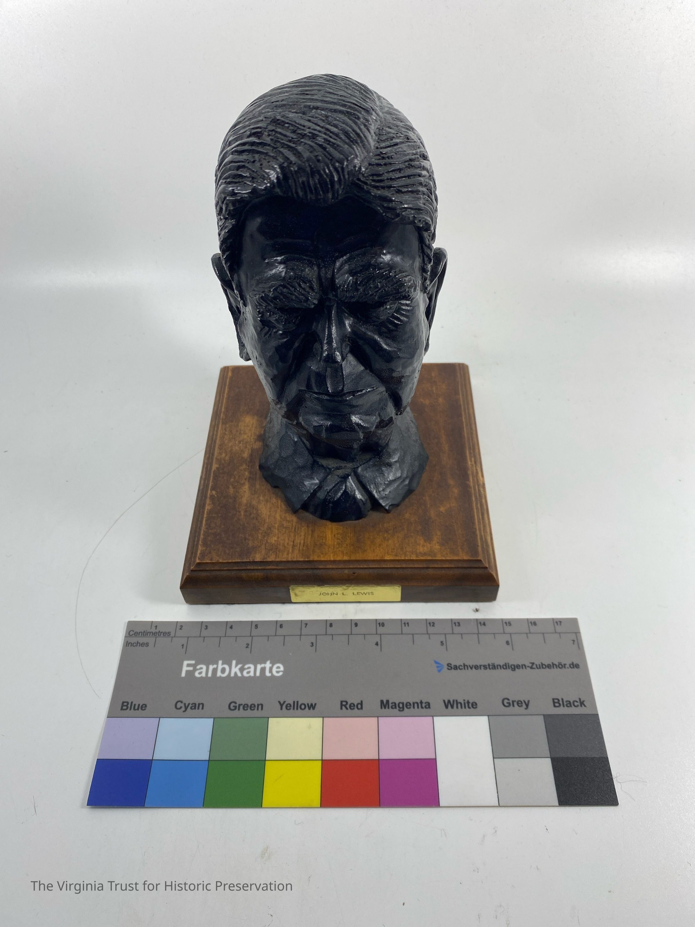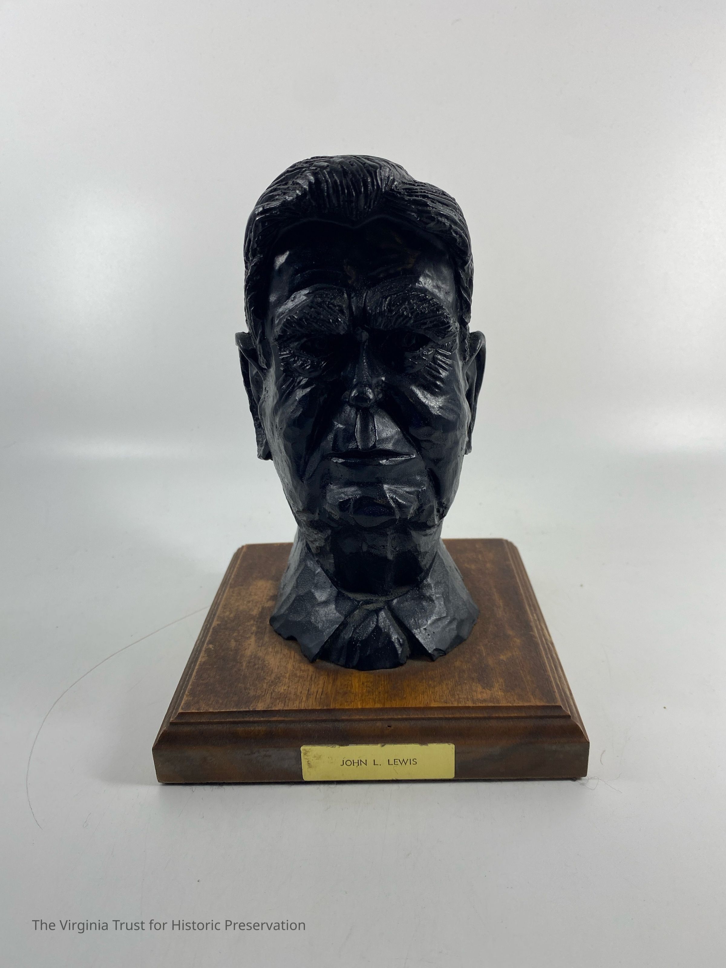 A bust of John L. Lewis carved in coal. The bust sits on a wooden base, 12.5 cm x 12.5 cm. A small gold colored sticker with "John L. Lewis" imprinted on it is affixed to the base. On the bottom of the felt covered base is a sticker "Van's Coal Craft, P.O. Box 984, Beckley, West Virginia." There is also a sticker with the number 523 hand written in ink. Carved into the back of Lewis' color is the mark "1972 K."Dimensions