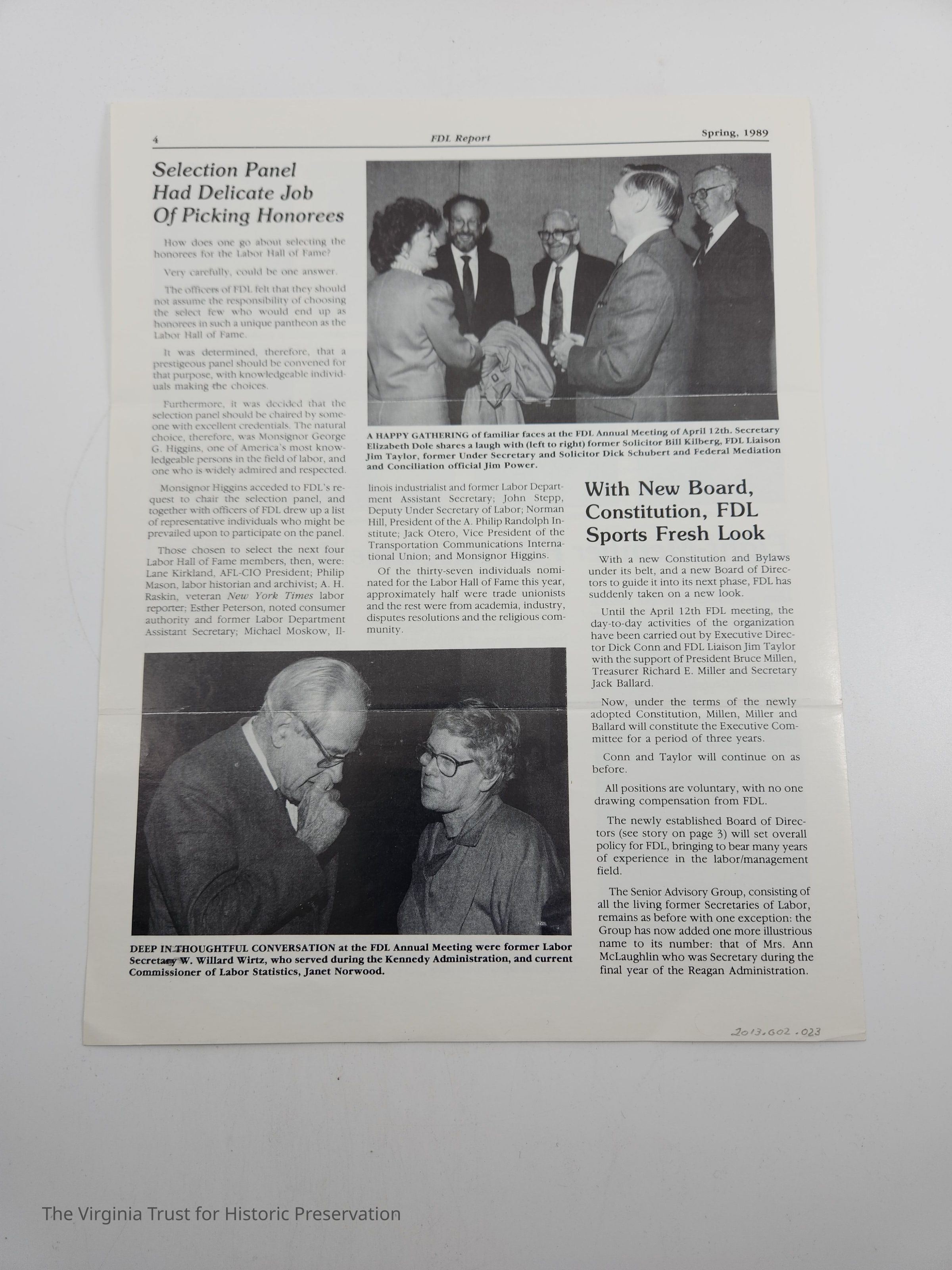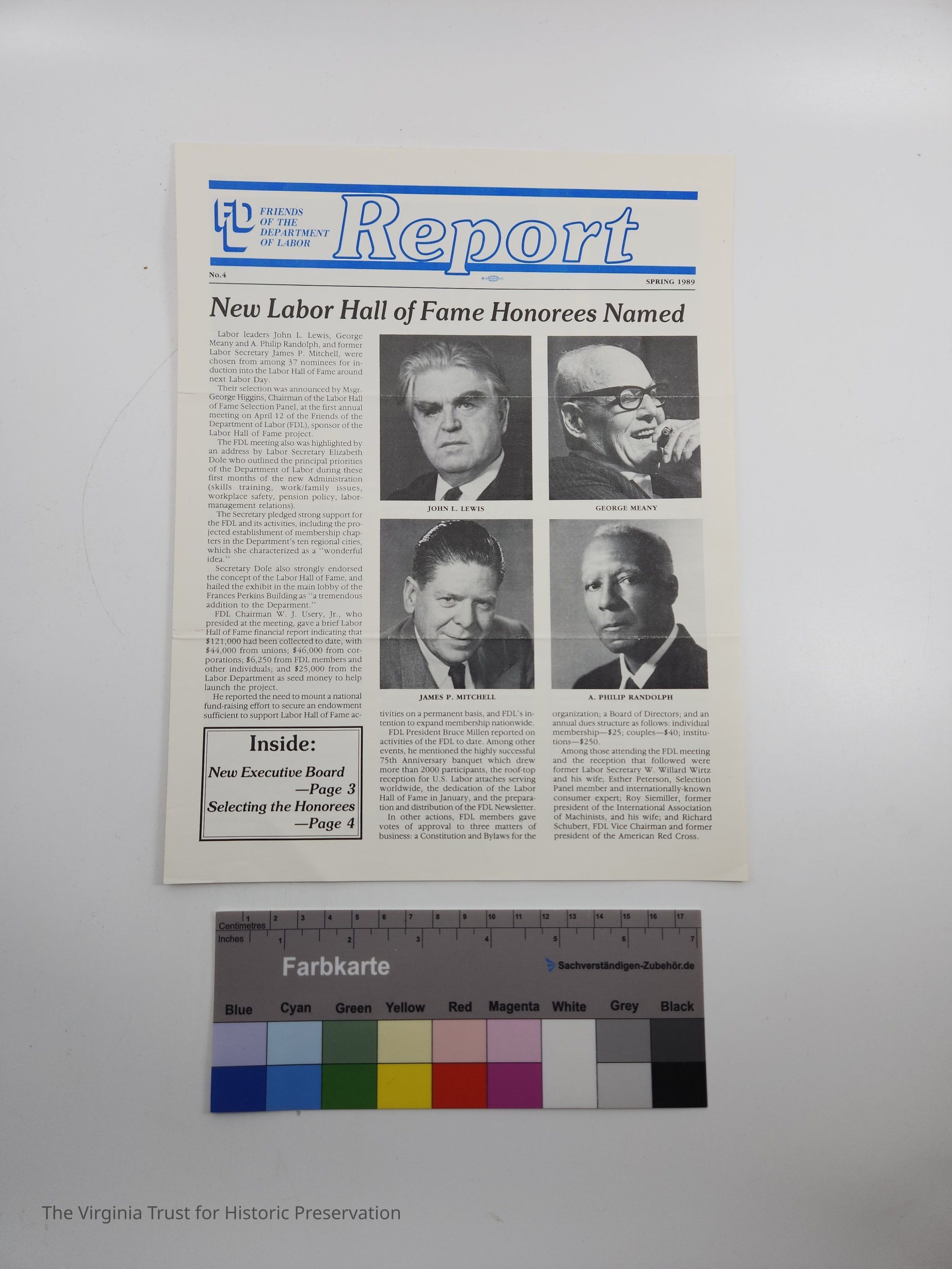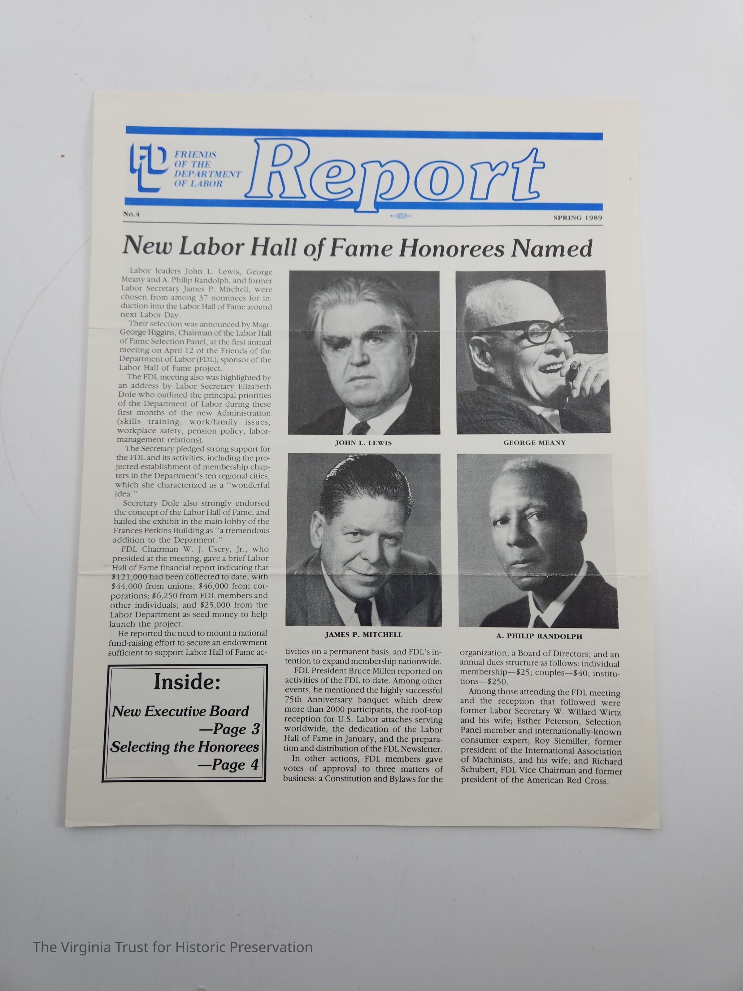 The newsletter is titled "Report." It is the Spring 1989 issue, No. 4. Front page article is titled "New Labor Hall of Fame Honorees Named" and is accompanied with the pictures of John L. Lewis, George Meany, James P. Mitchell, and A. Philip Randolph.