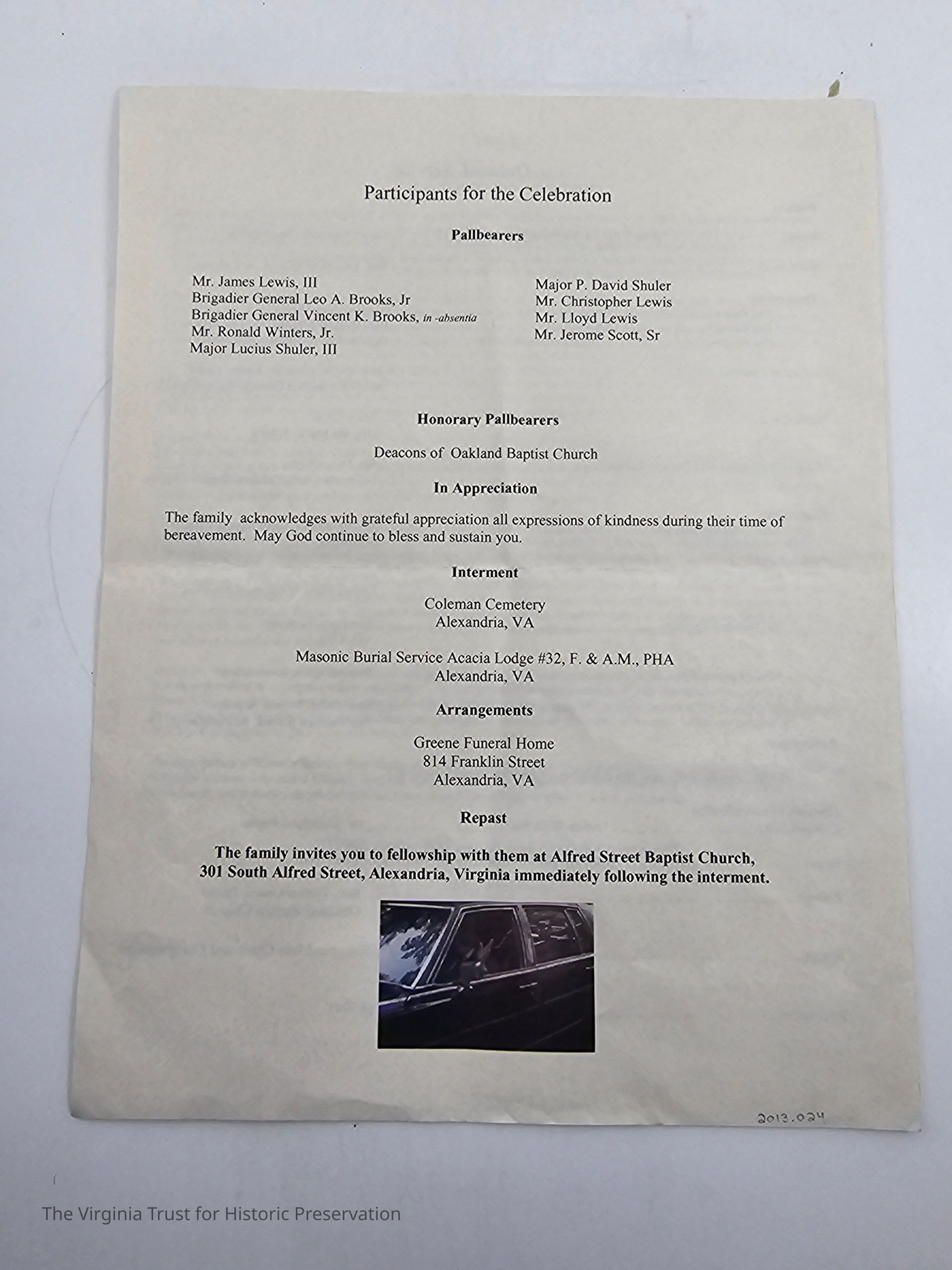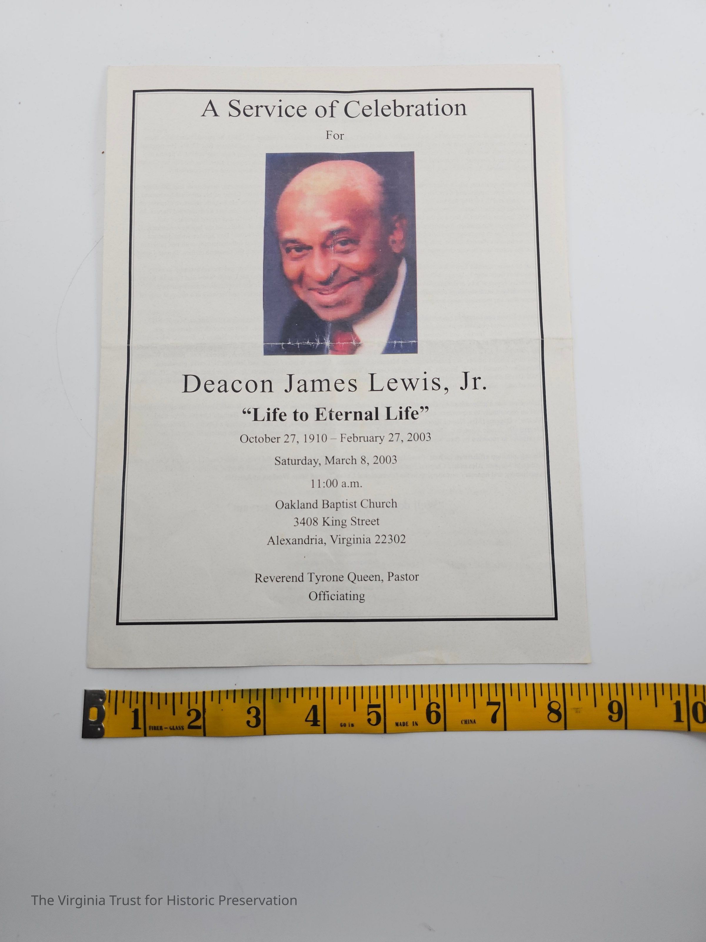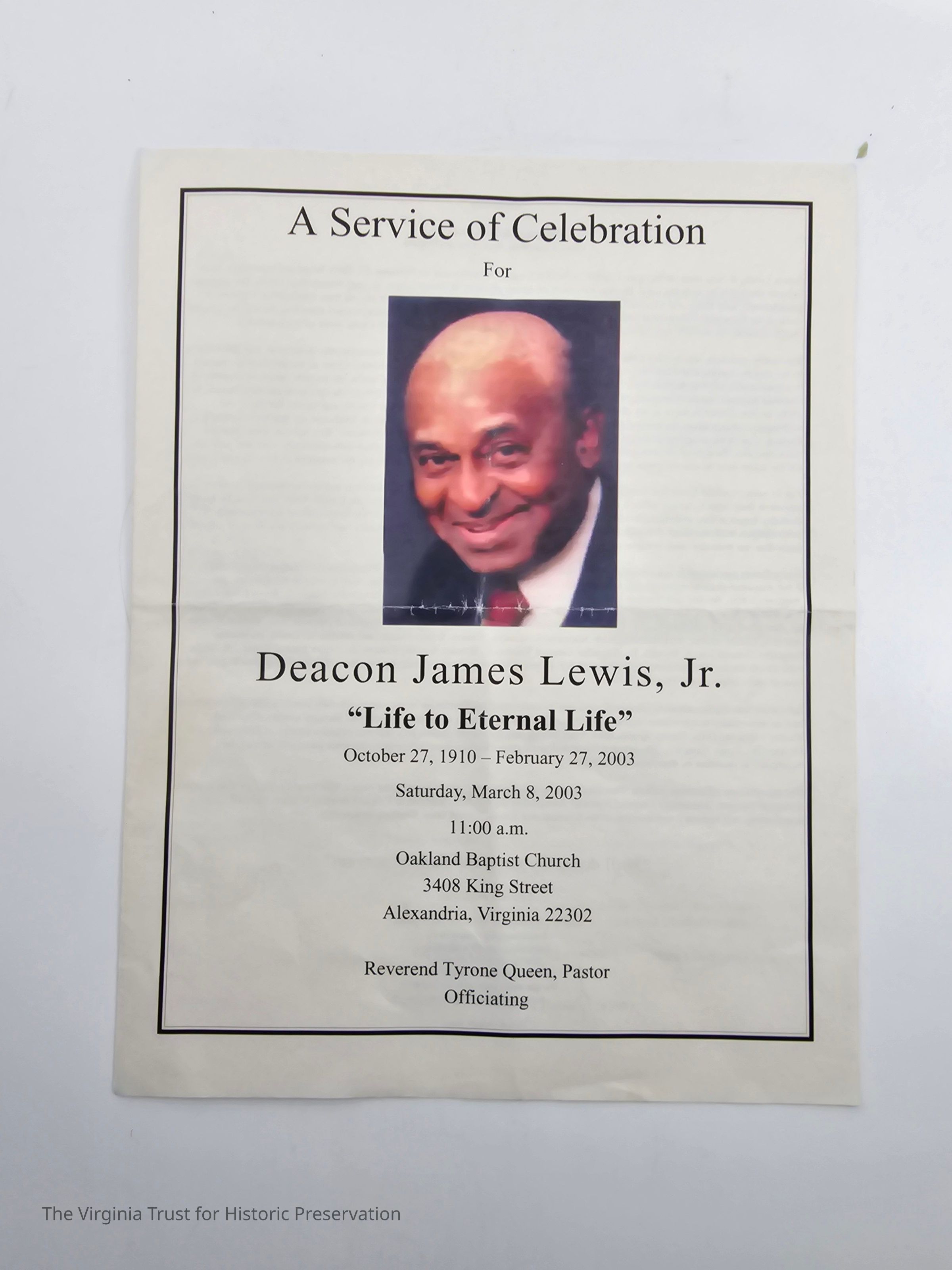 The program for "A Service of Celebration" for Deacon James Lewis, Jr. that was held on March 8, 2003 at the Oakland Baptist Church, 3408 King Street, Alexandria, VA 22302. The program contains an obituary as well as the order of the service. Participants for the service are listed on the back page which also notes the location for the fellowship that followed the service.