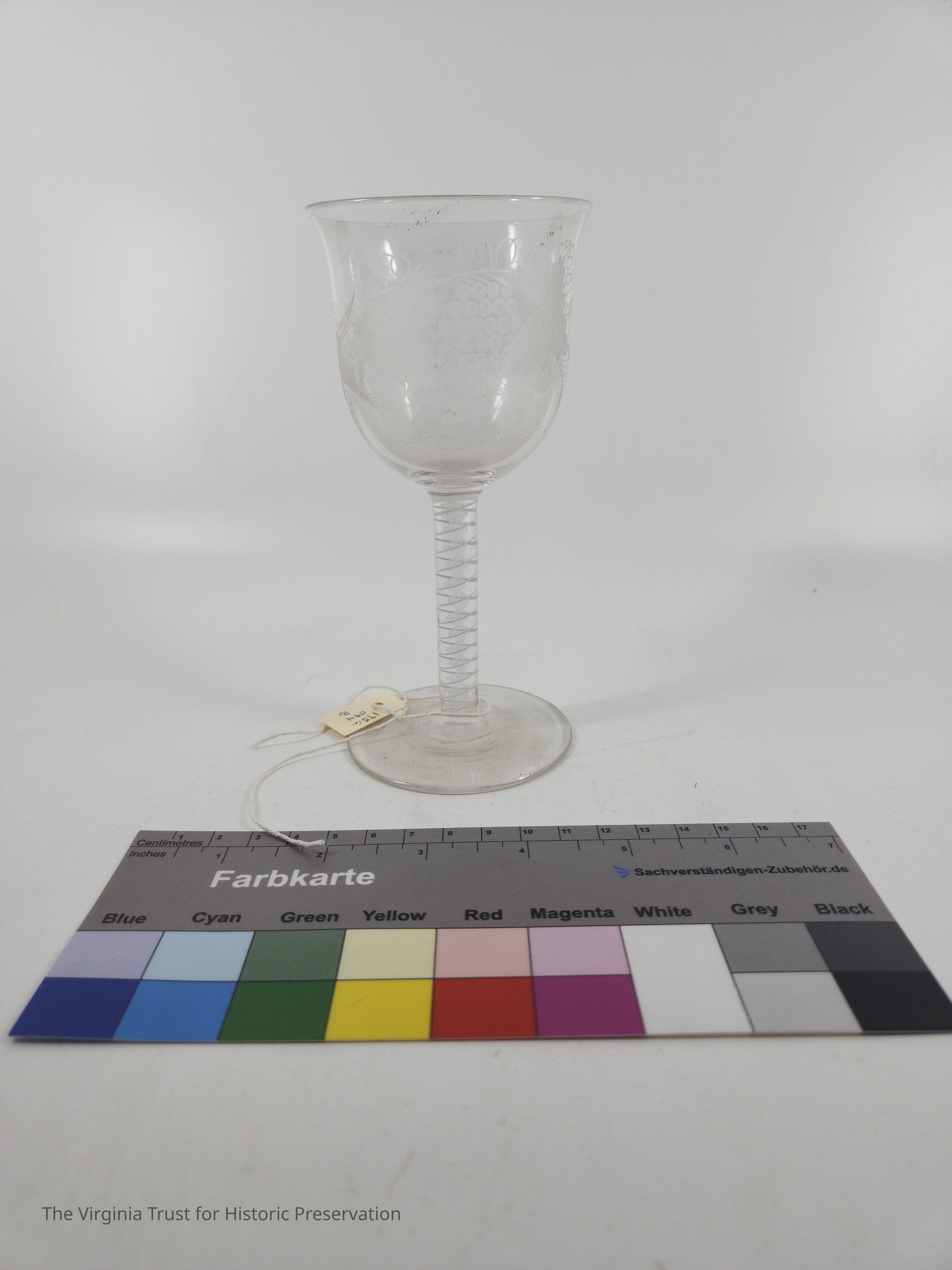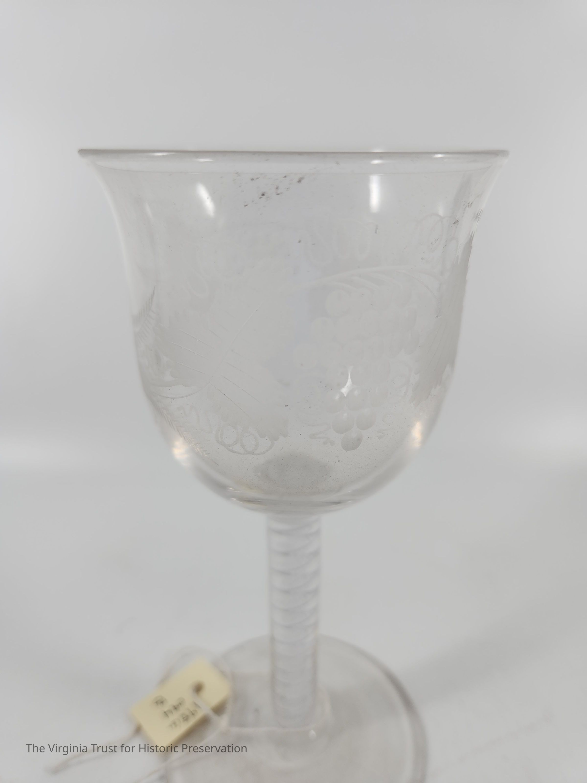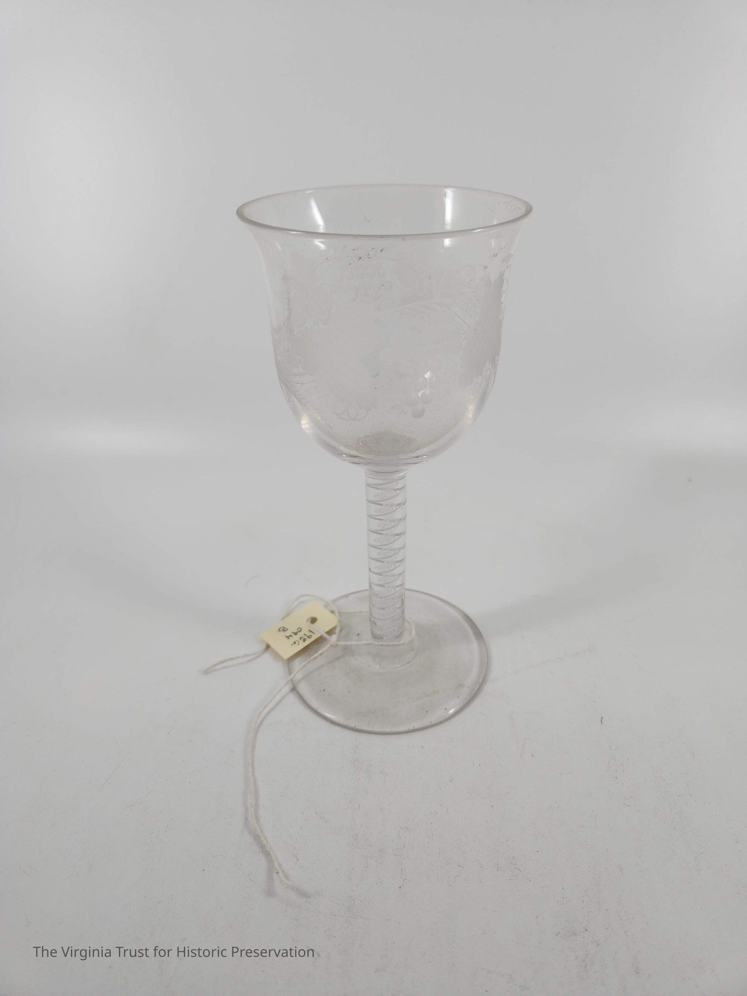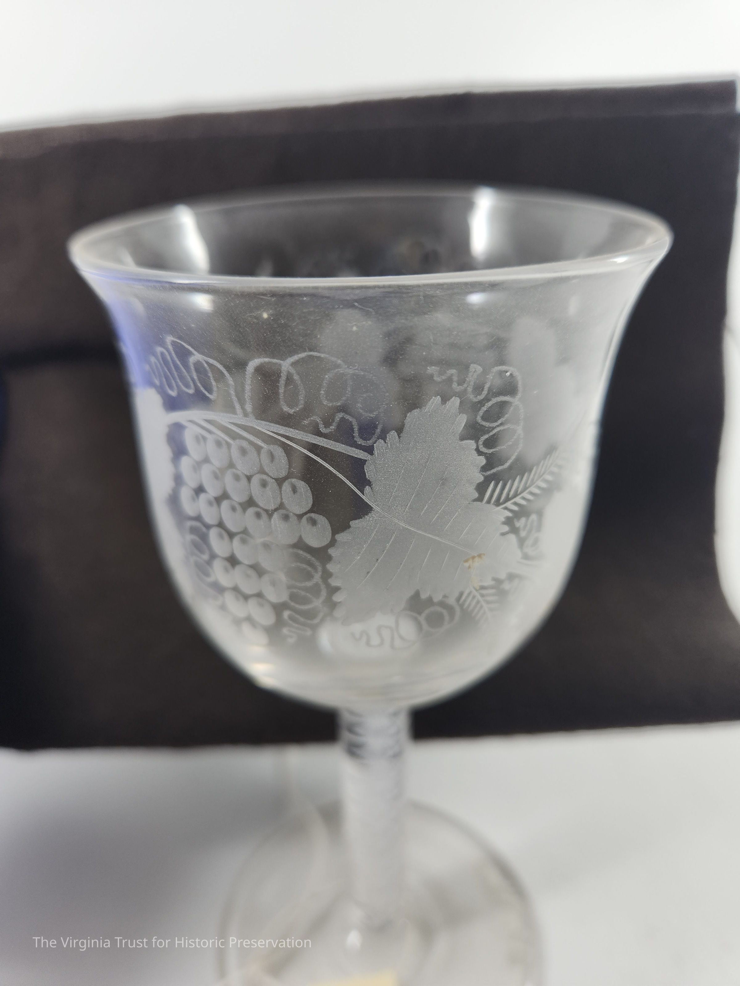One of a set of six stemmed glasses with spiral air design in stem and grape leaf and grape bunches as the design (engraved) of the bowl.