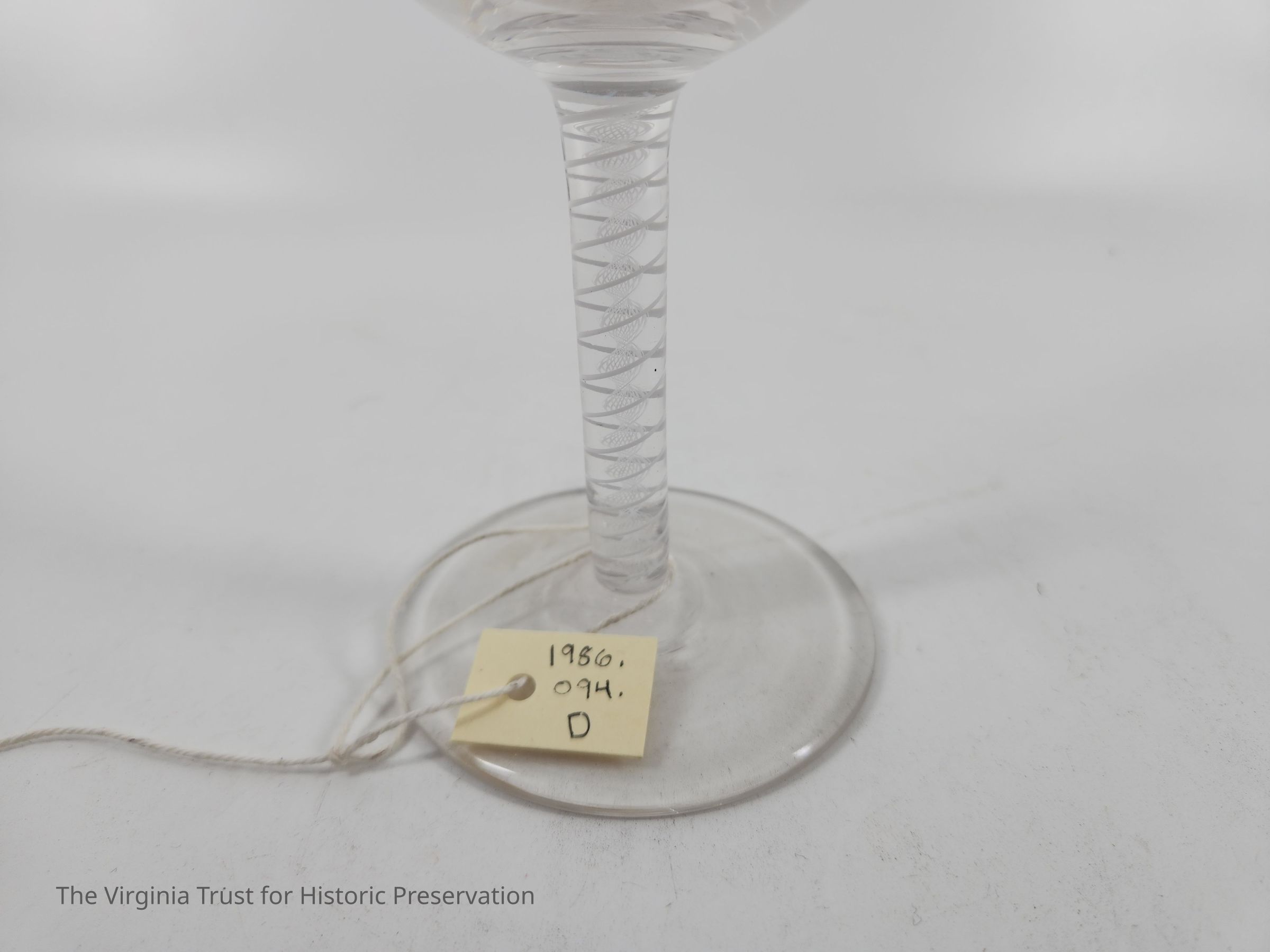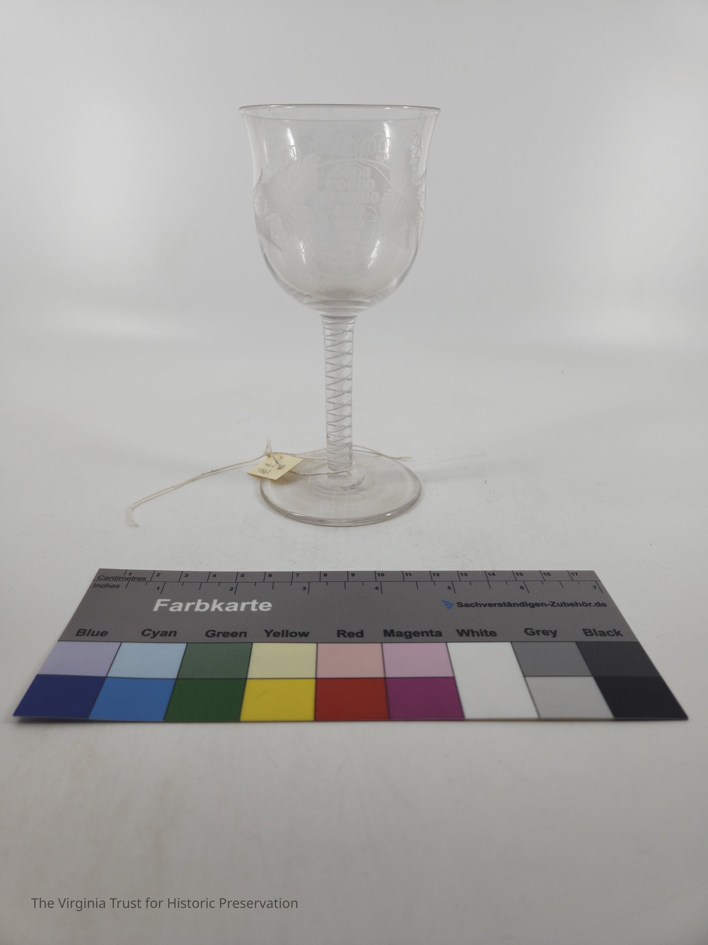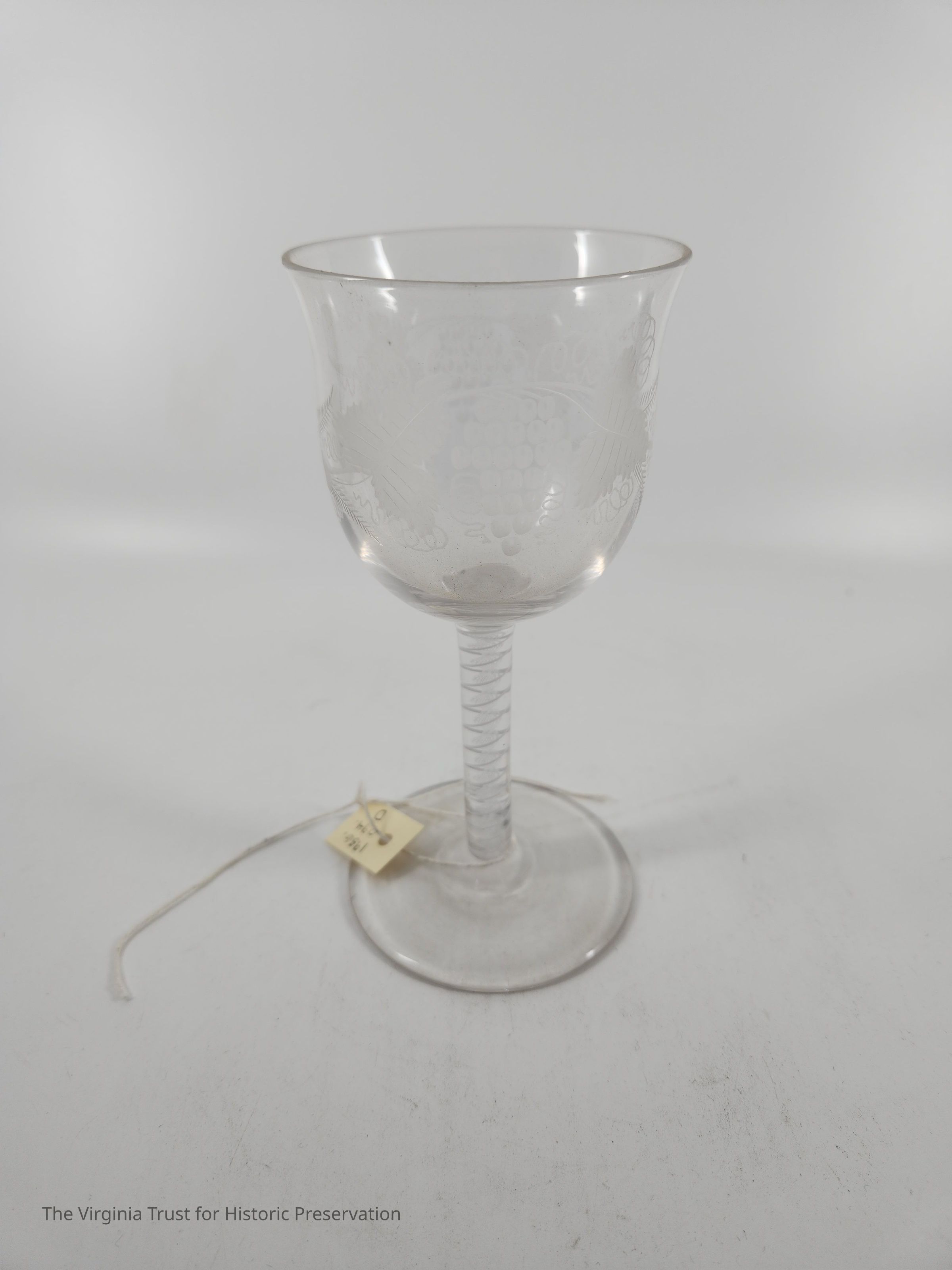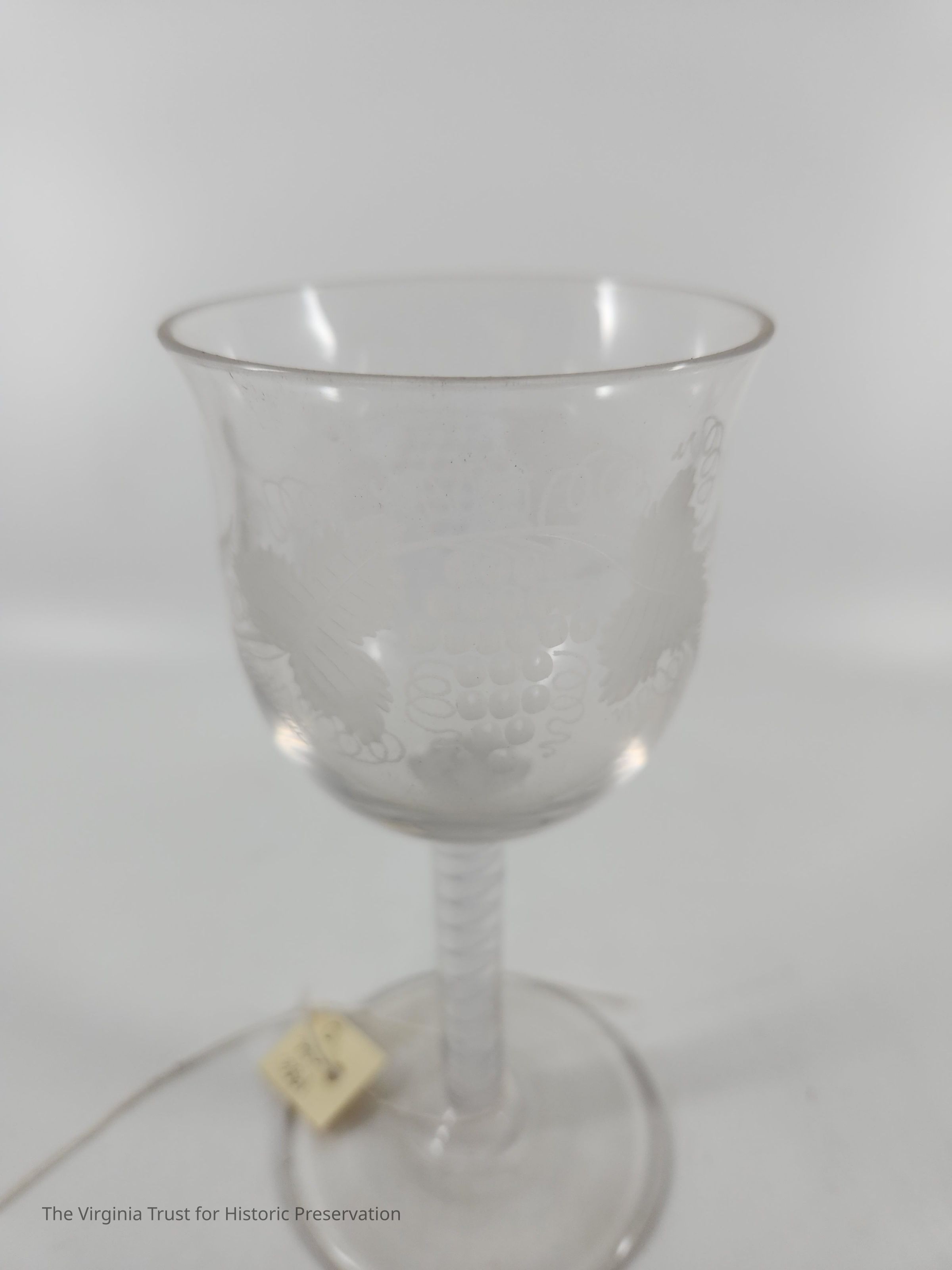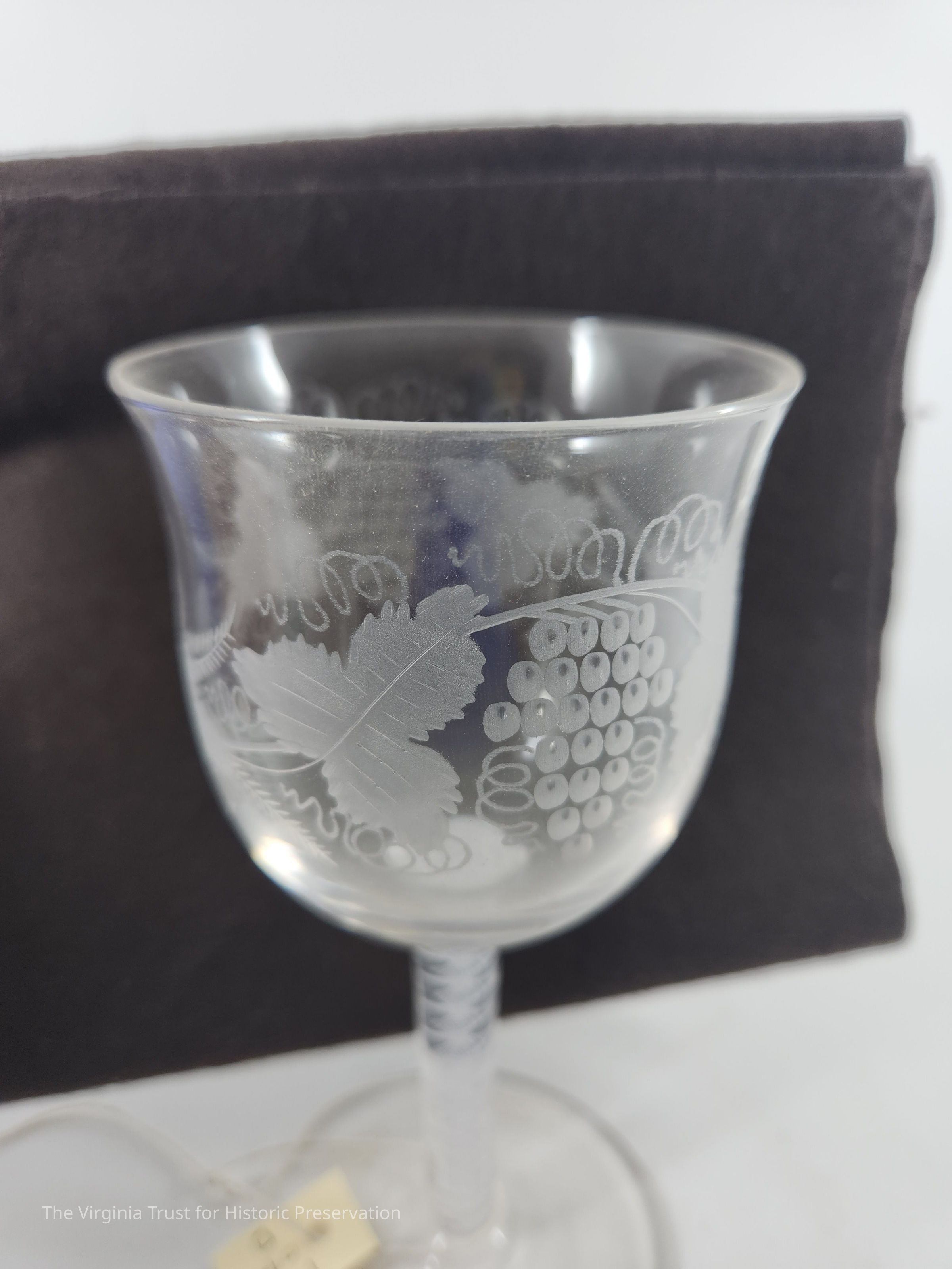 One of a set of six stemmed glasses with spiral air design in stem and grape leaf and grape bunches as the design (engraved) of the bowl. Cotton twist stems. Bohemian.