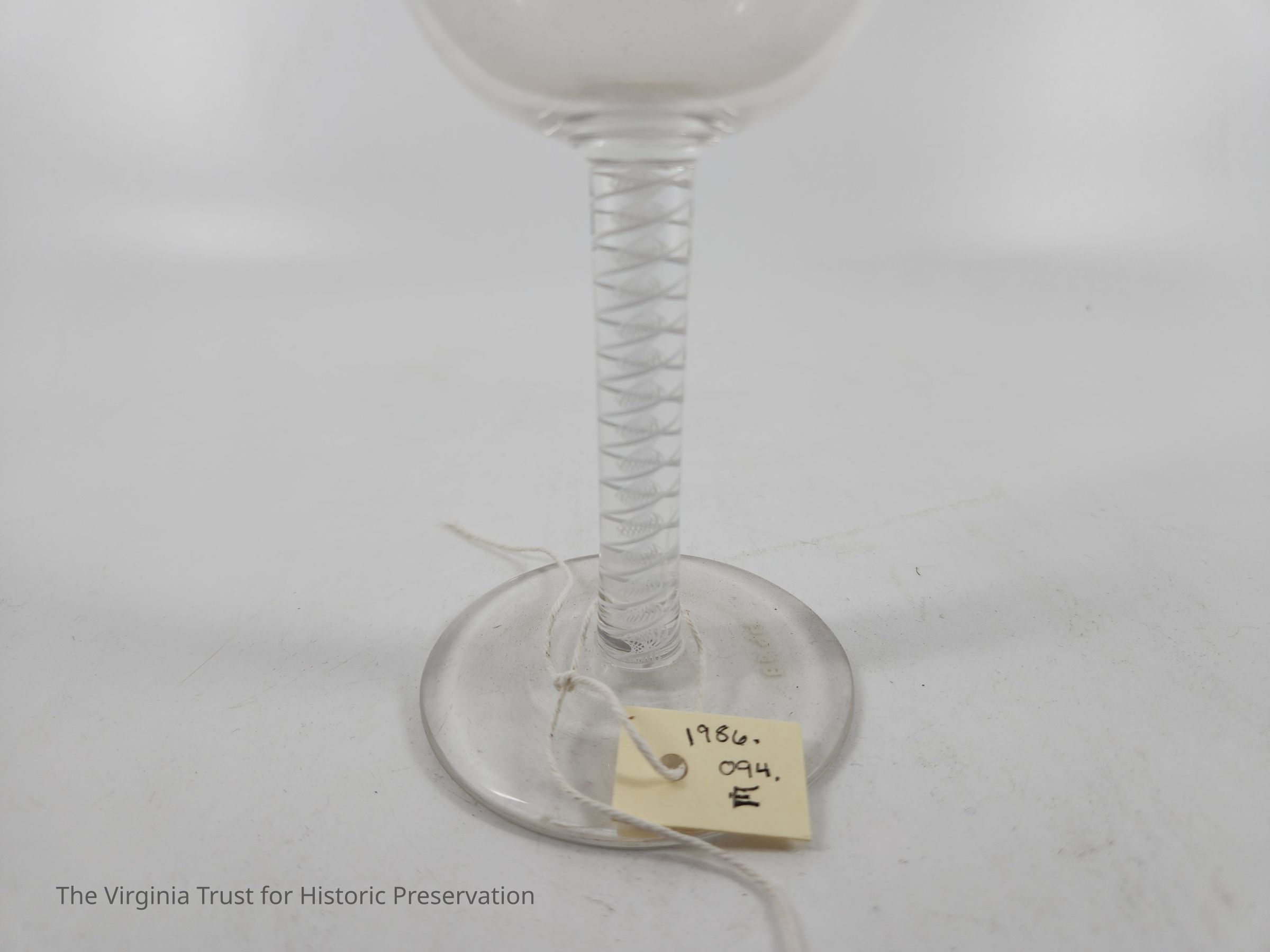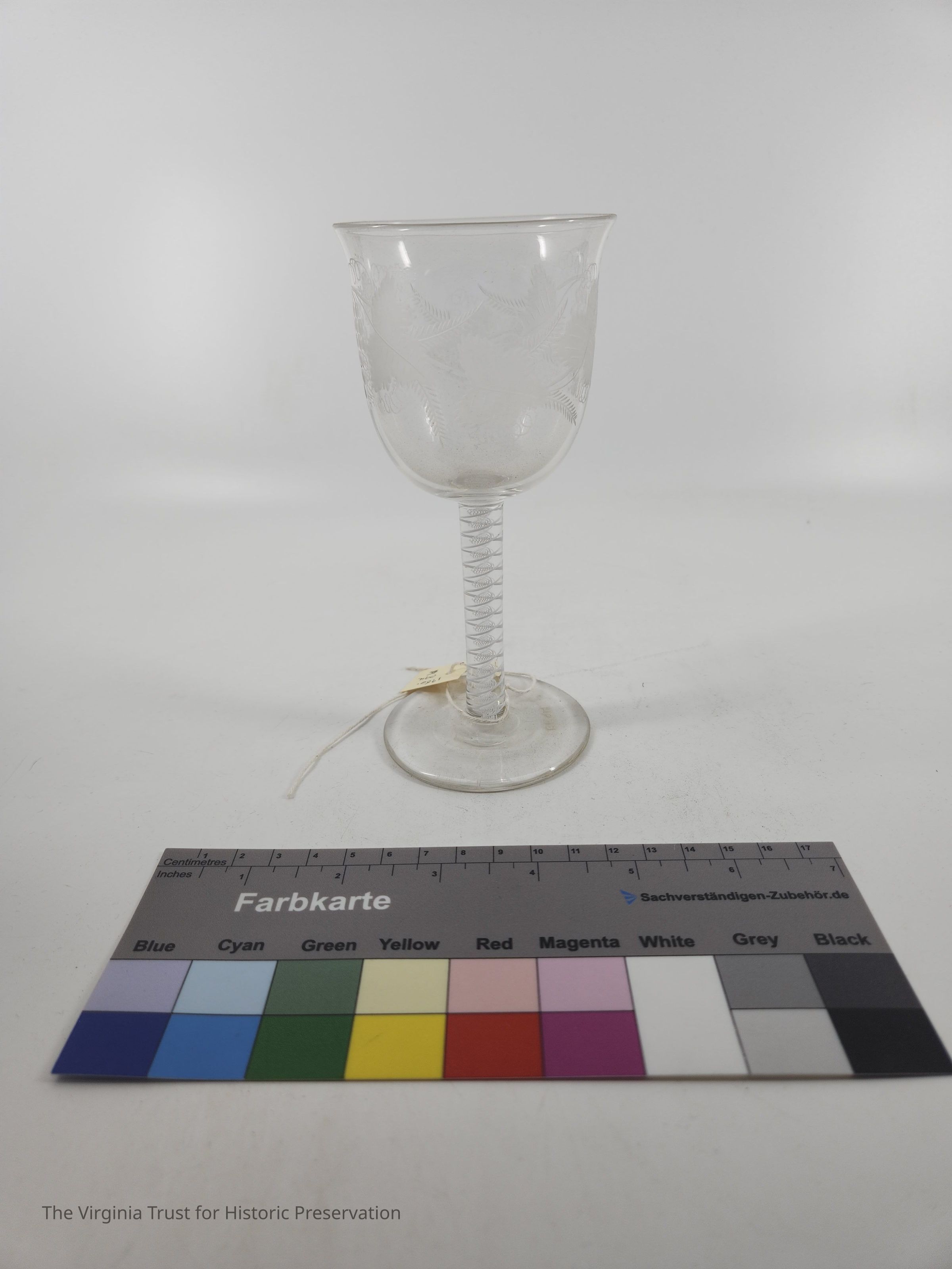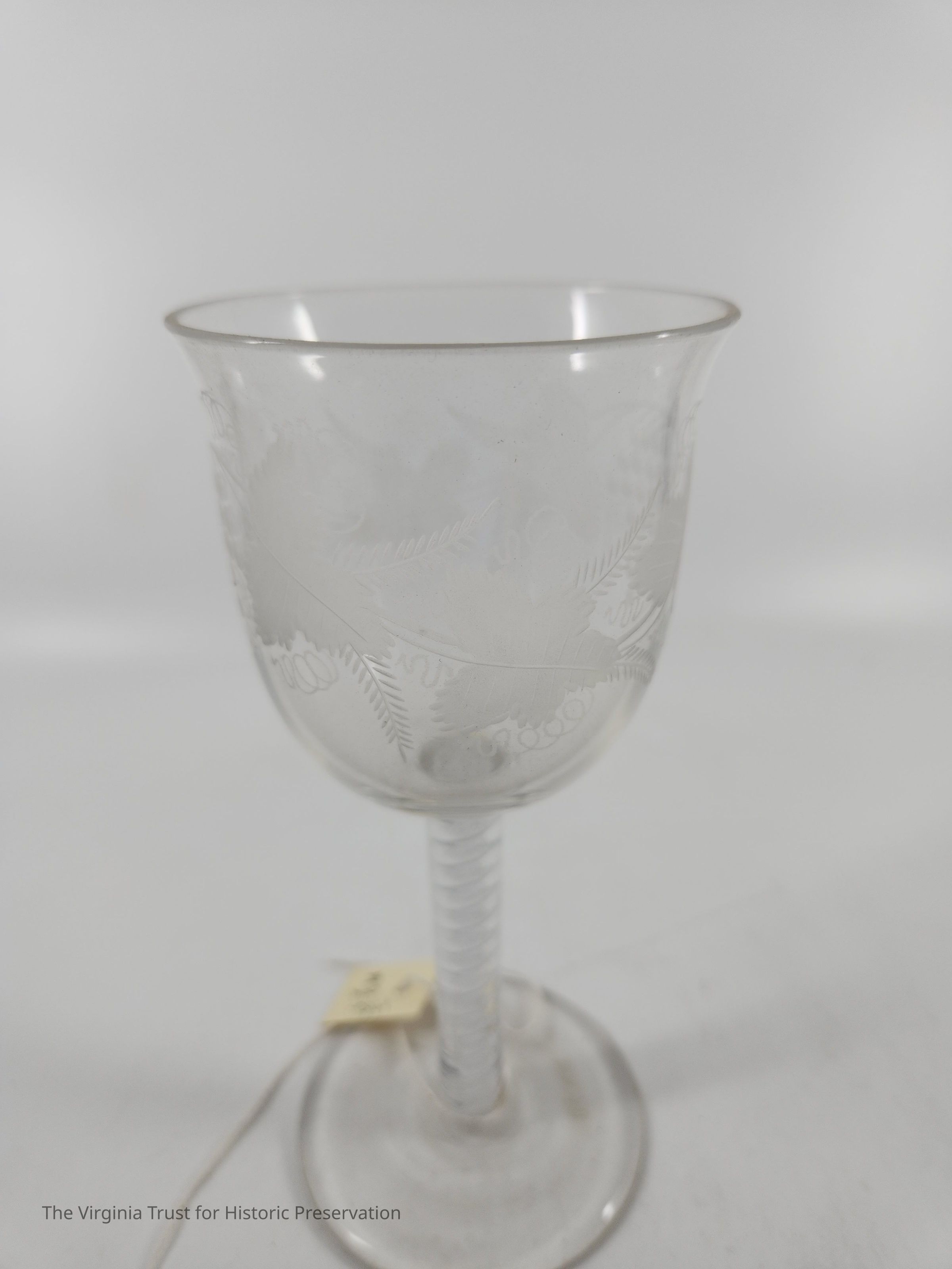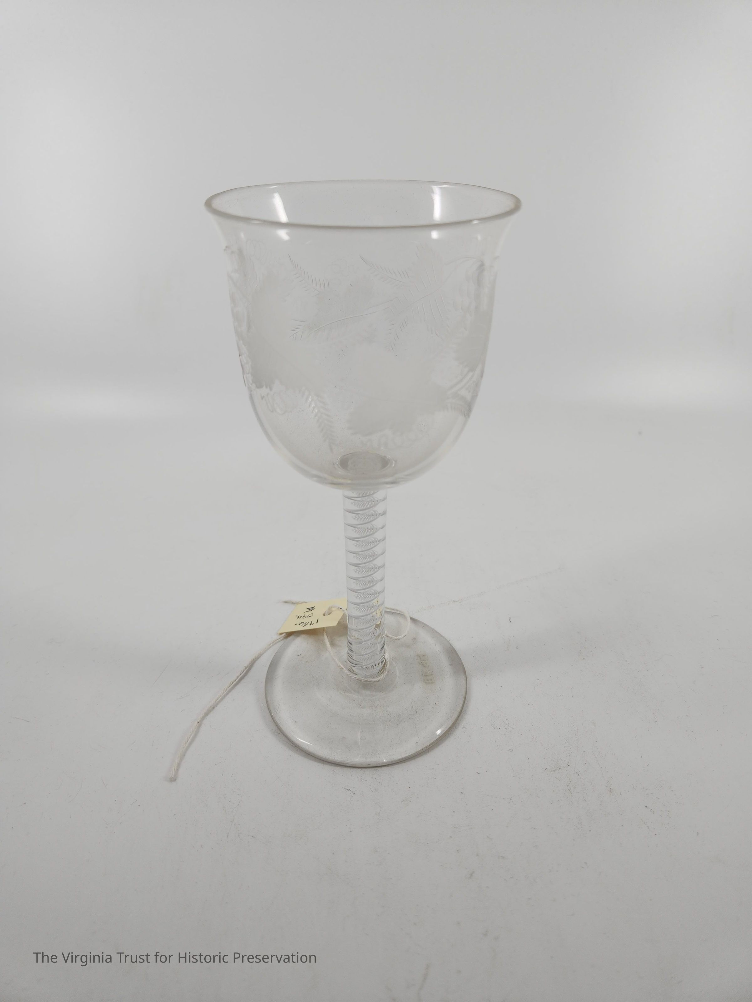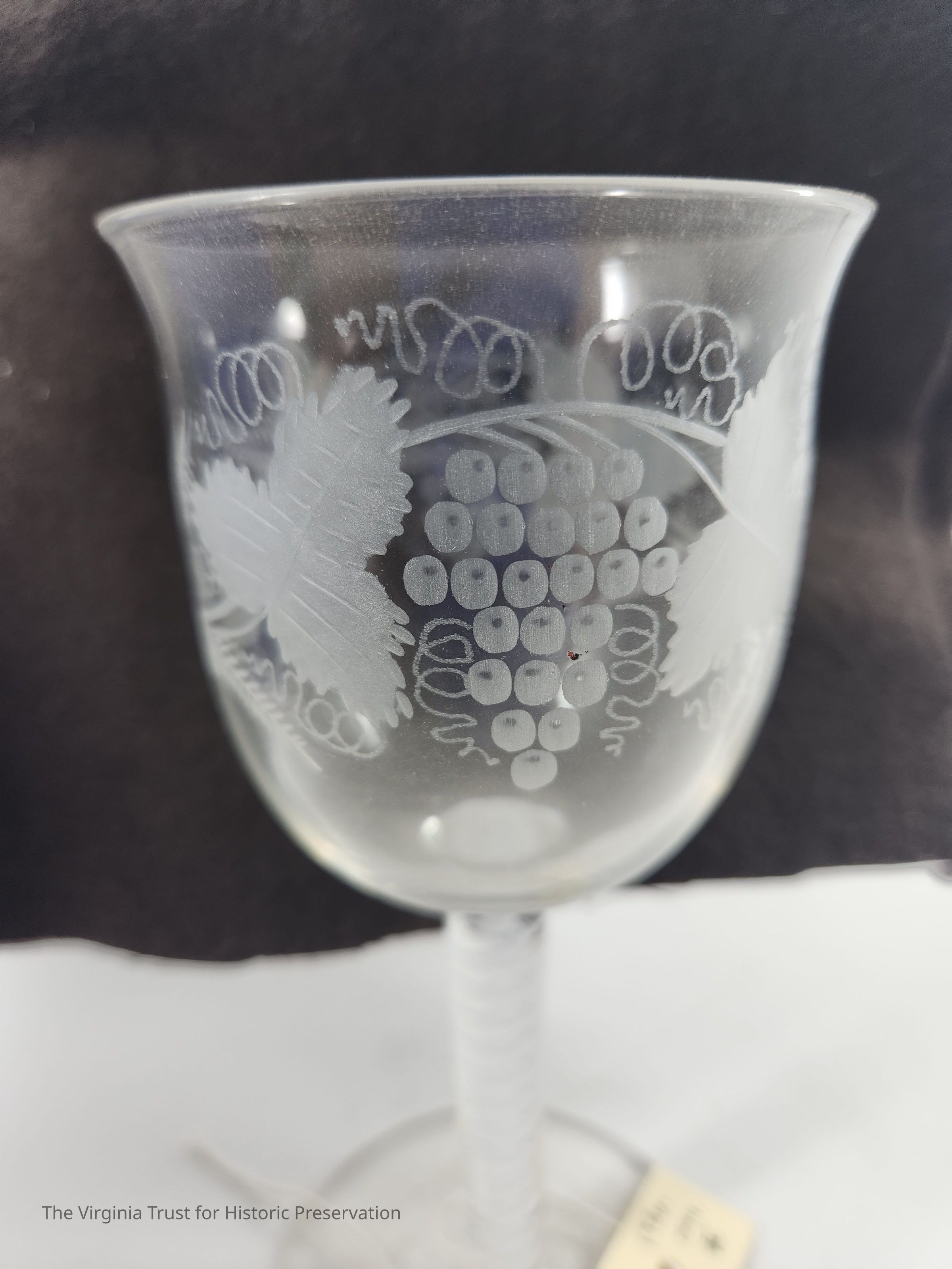 One of a set of six stemmed glasses with spiral air design in stem and grape leaf and grape bunches as the design (engraved) of the bowl. Cotton twist stems. Bohemian.