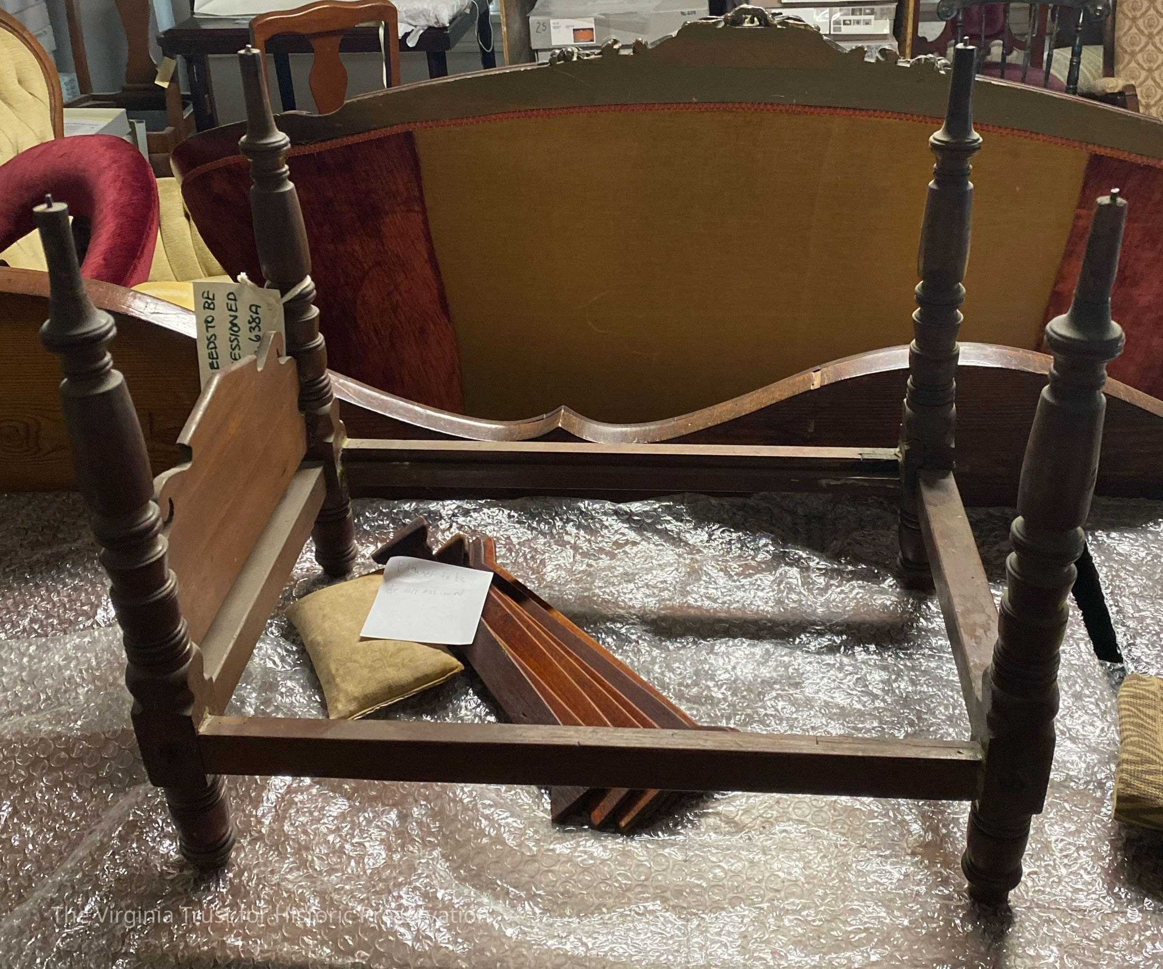 Wooden four poster doll bed with linens. Includes frame (A), 7 slats (B-H), tufted mattress (I), bolster (J), two pillows (K-L) and white linen spread with embroidered scalloped edges (M) and two matching pillowcases (N-O). Pillows have floral design.Dimensions
