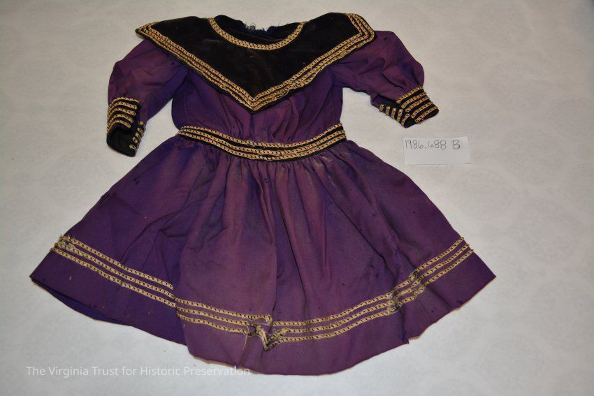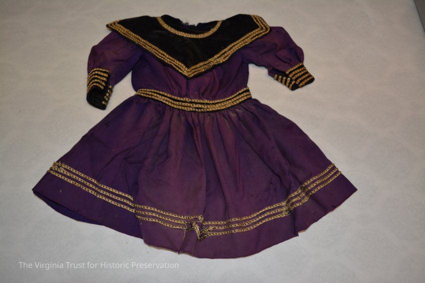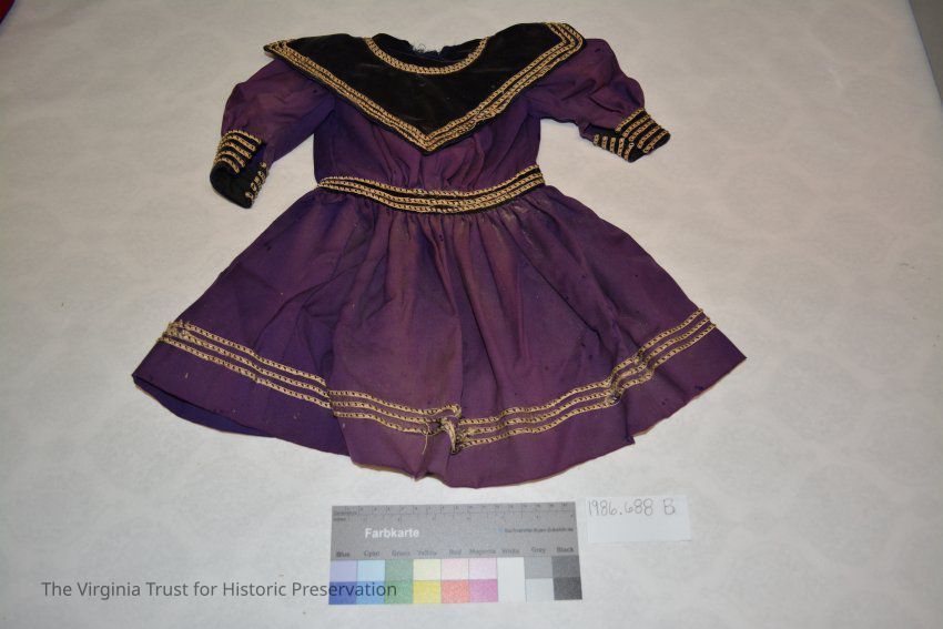 Purple dress with dark blue velvet cloth wrapped around chest and shoulders.