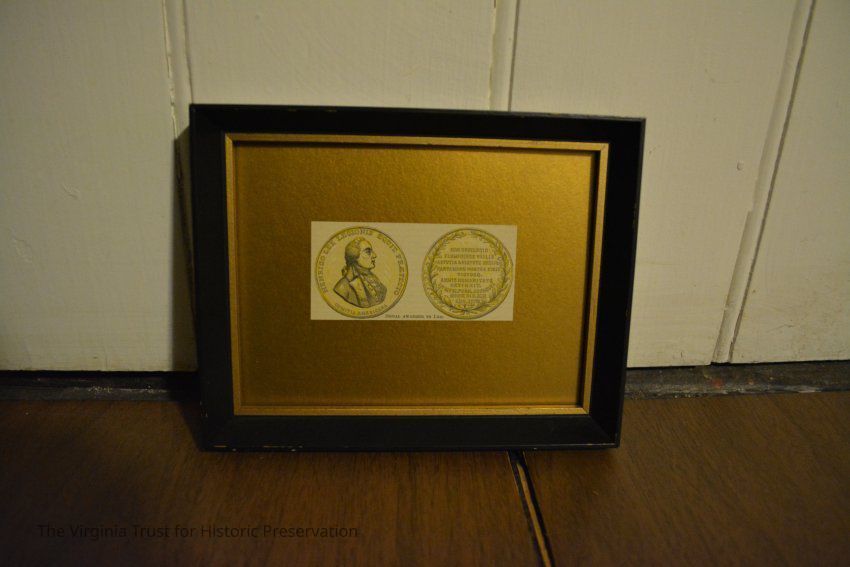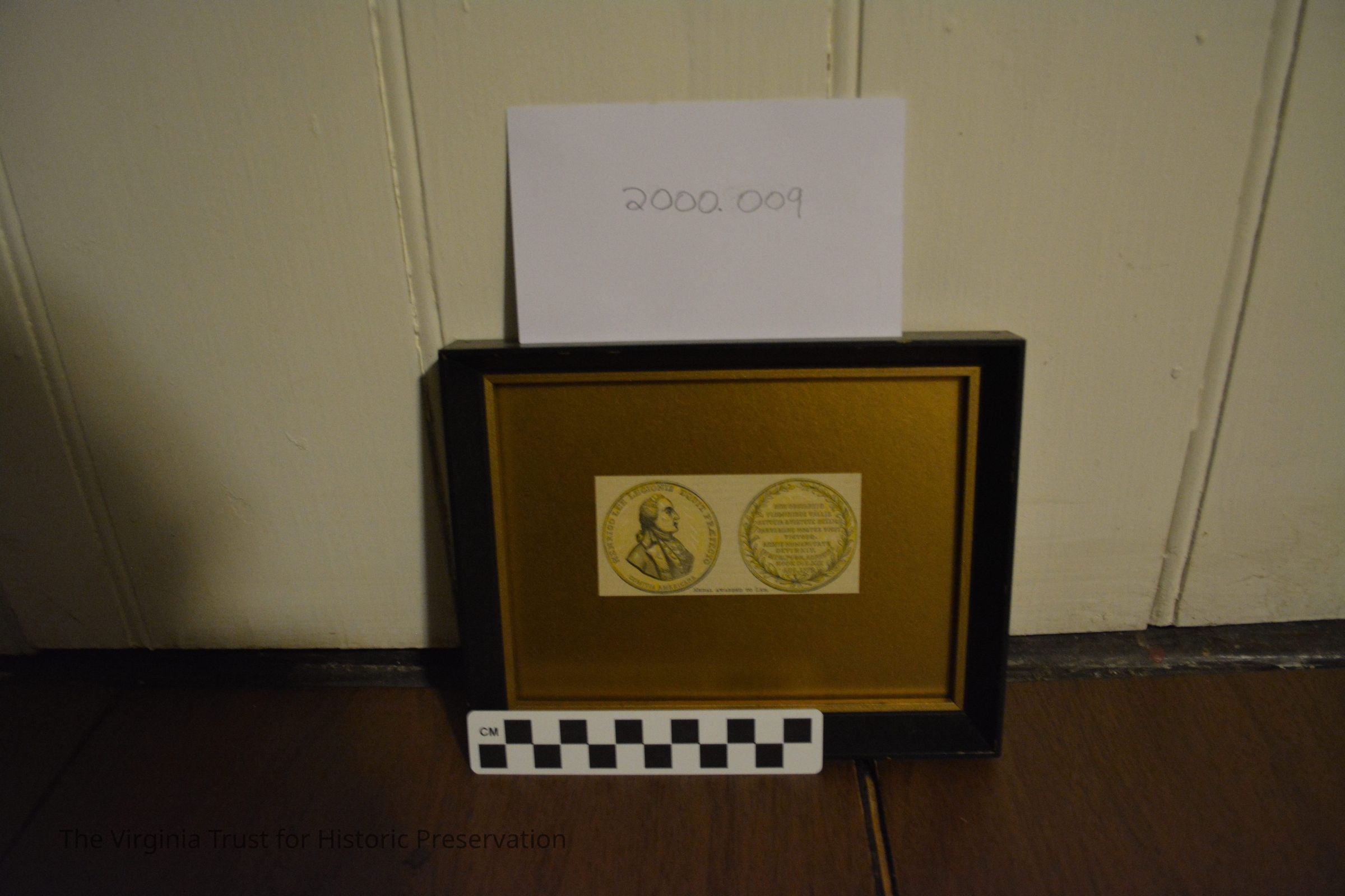 Colored etching: "Medal Award to Lee." Picture of a two sided coin. Gold background. Black frame with gold.
