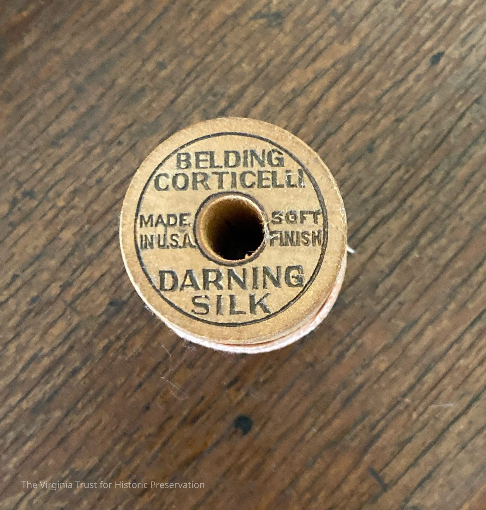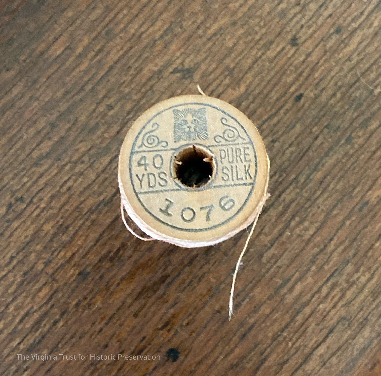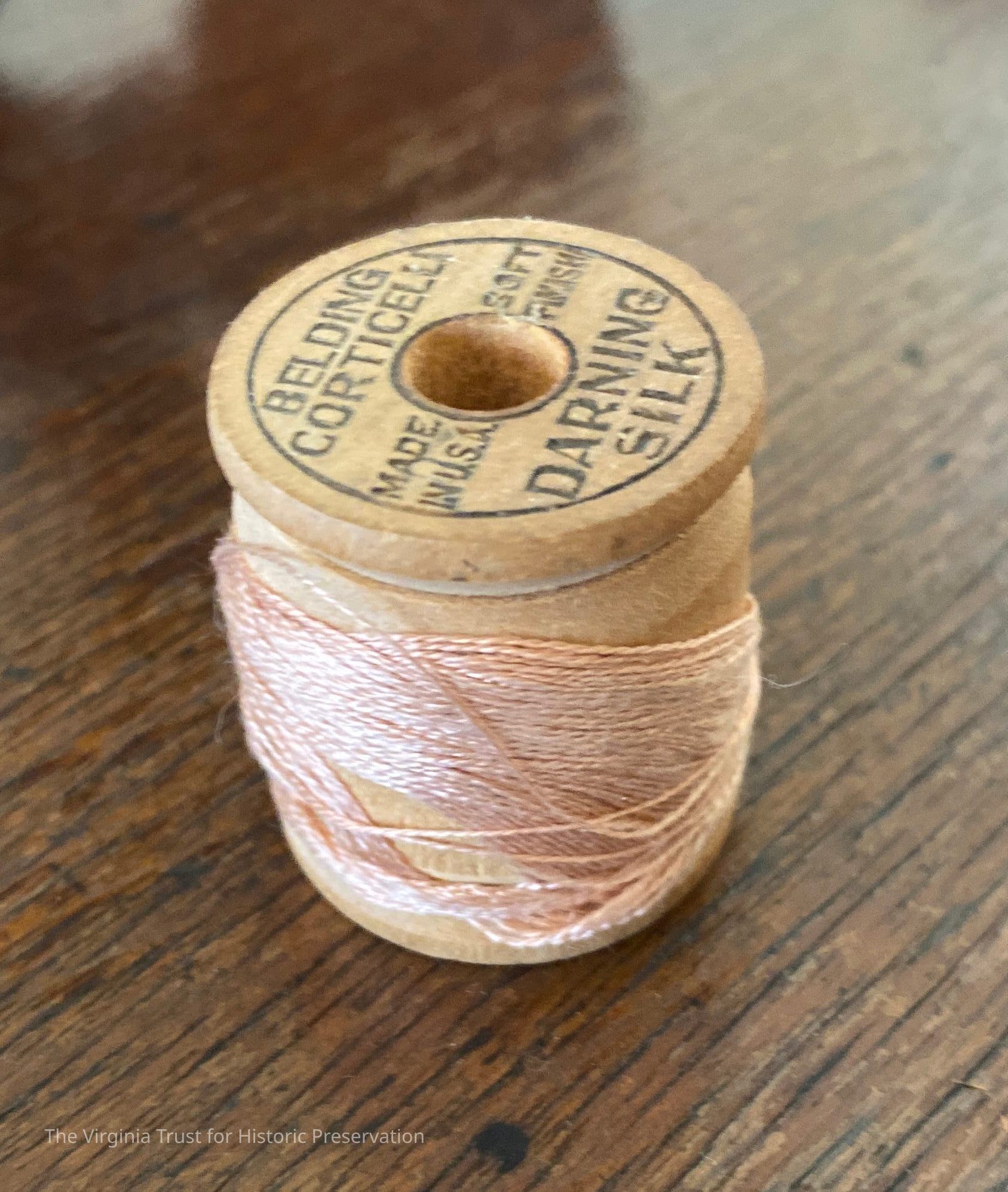 Wooden sewing spool with pink thread. End 1 labelled “40 yds, Pure Silk, 1076”. End 2 labelled “Belding Corticelli, Made in USA, Soft Finish, Darning Silk”.