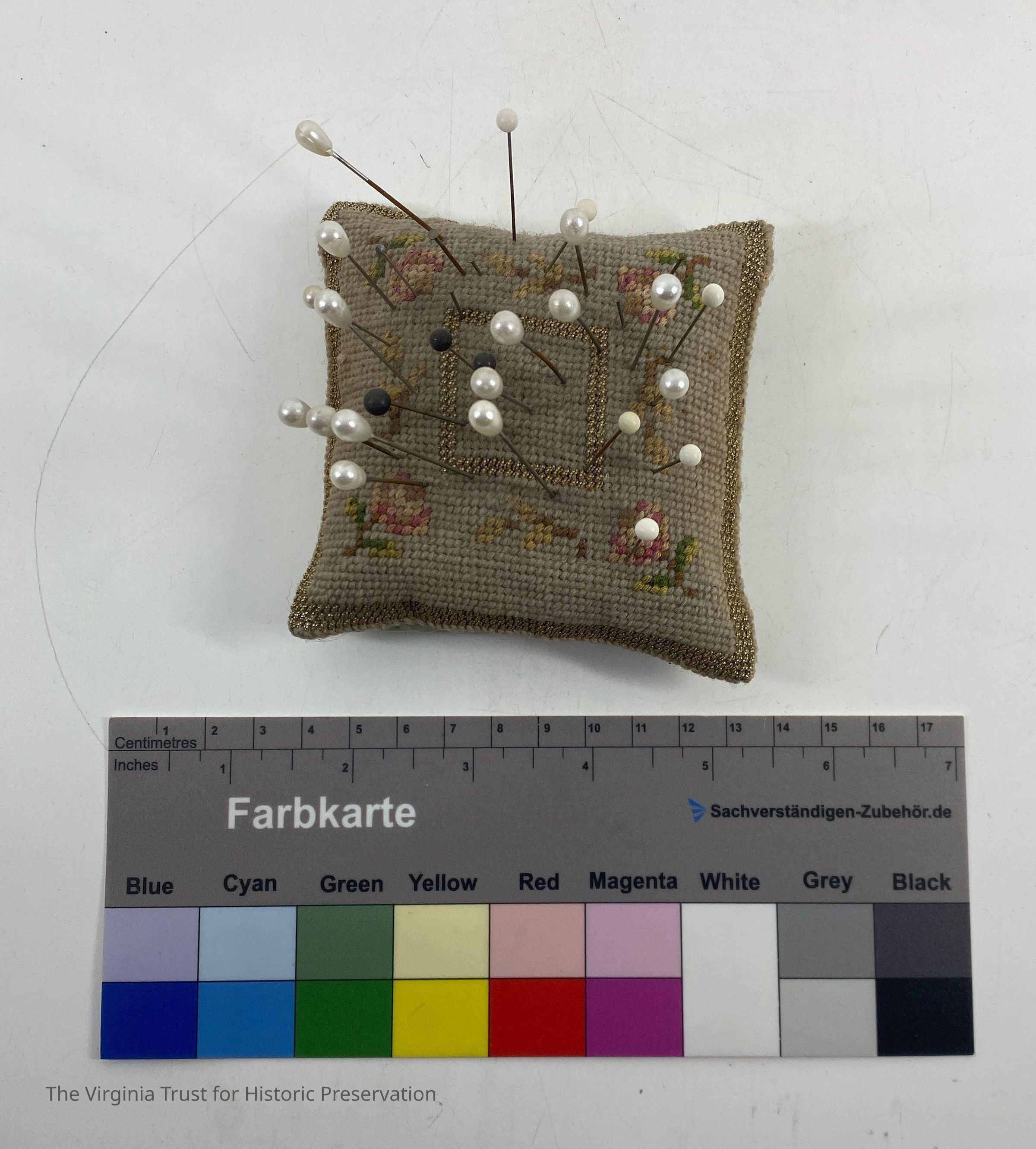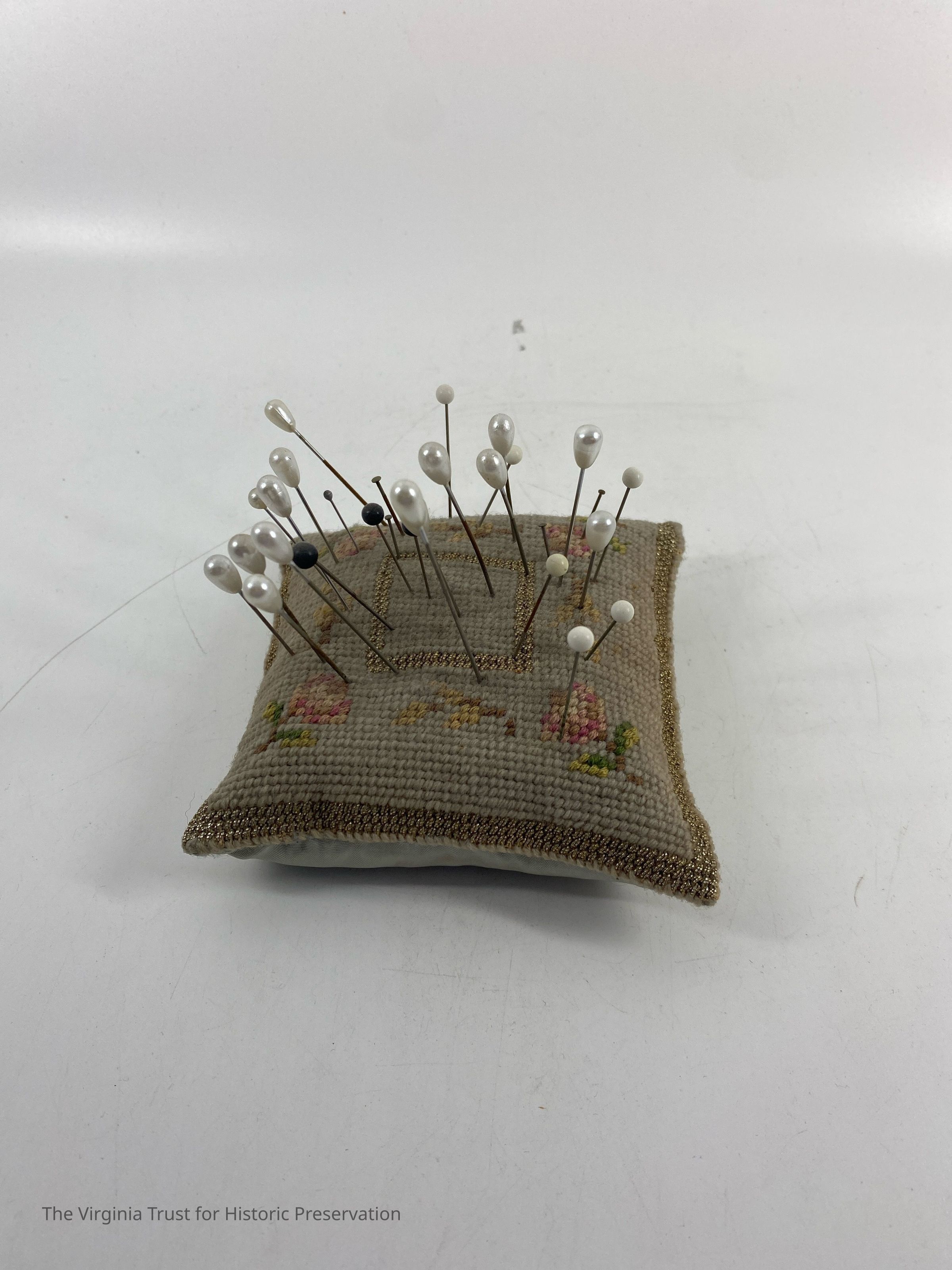 Small square embroidered pin cushion with 30 pins. Pink flower design on each corner with a gold square in the center.