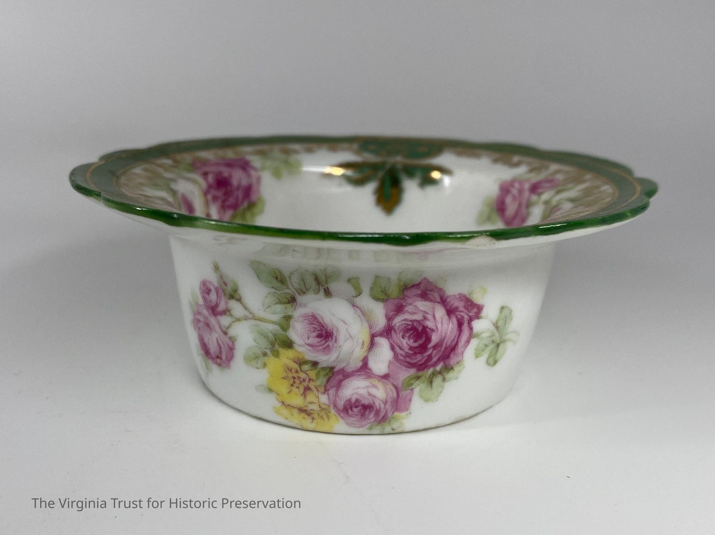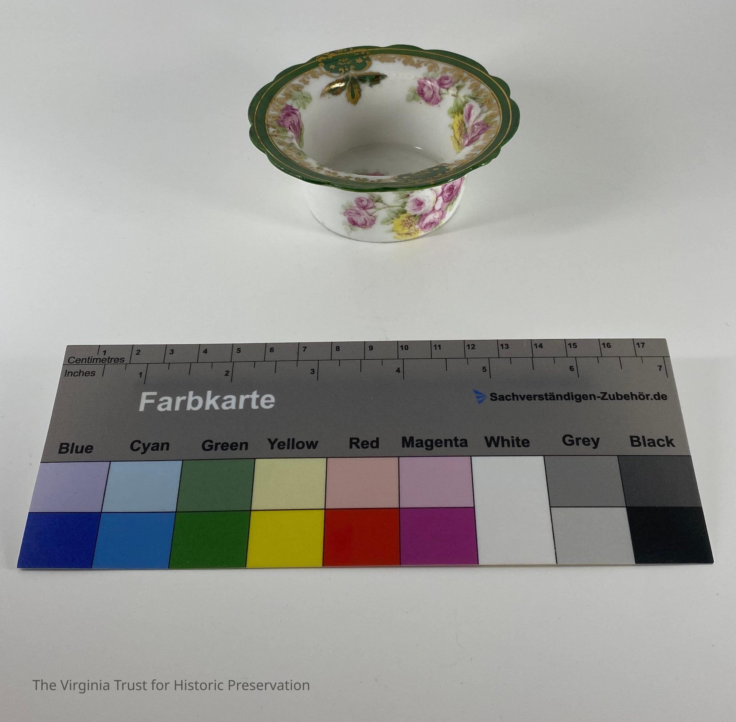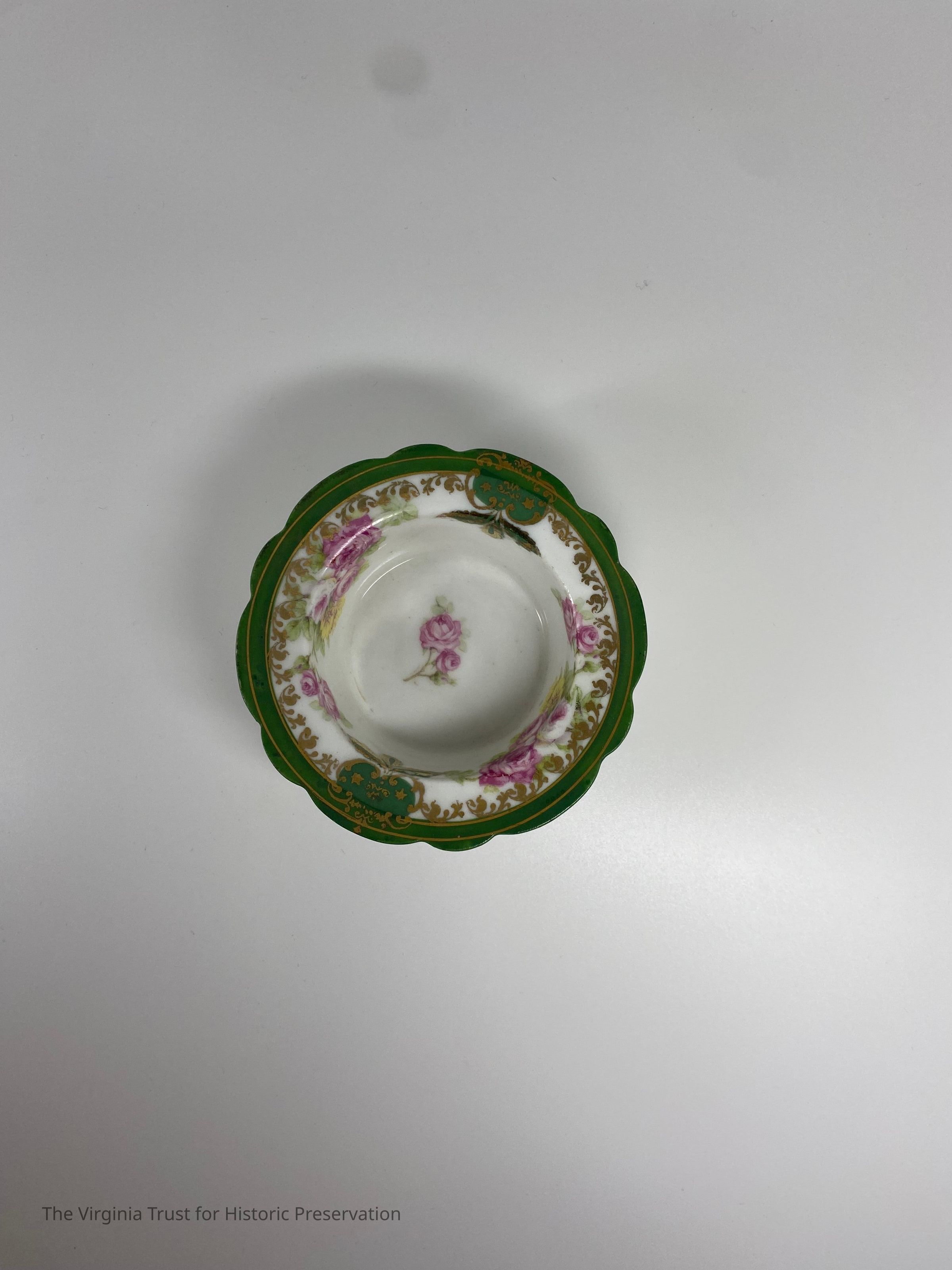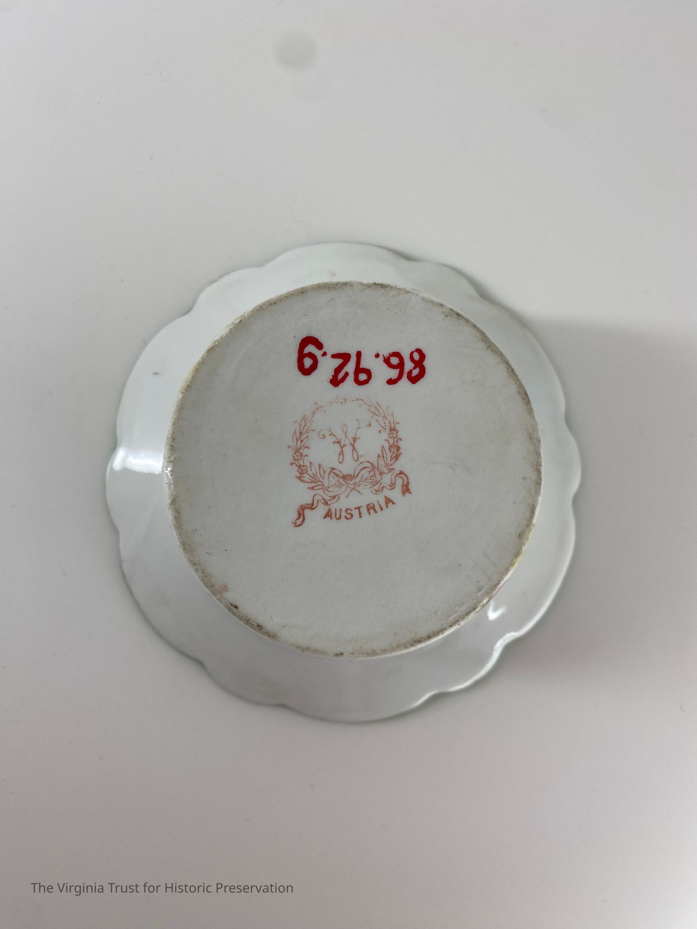 One of five ramekins that match the pattern on corresponding saucers (1986.092 A-F). Ramekins have peony in center on bottom. No handles. All have "Austria" with a wreath design stamped on the bottoms. Bottoms of ramekins are not glossed over like the rest of the surface.Dimensions