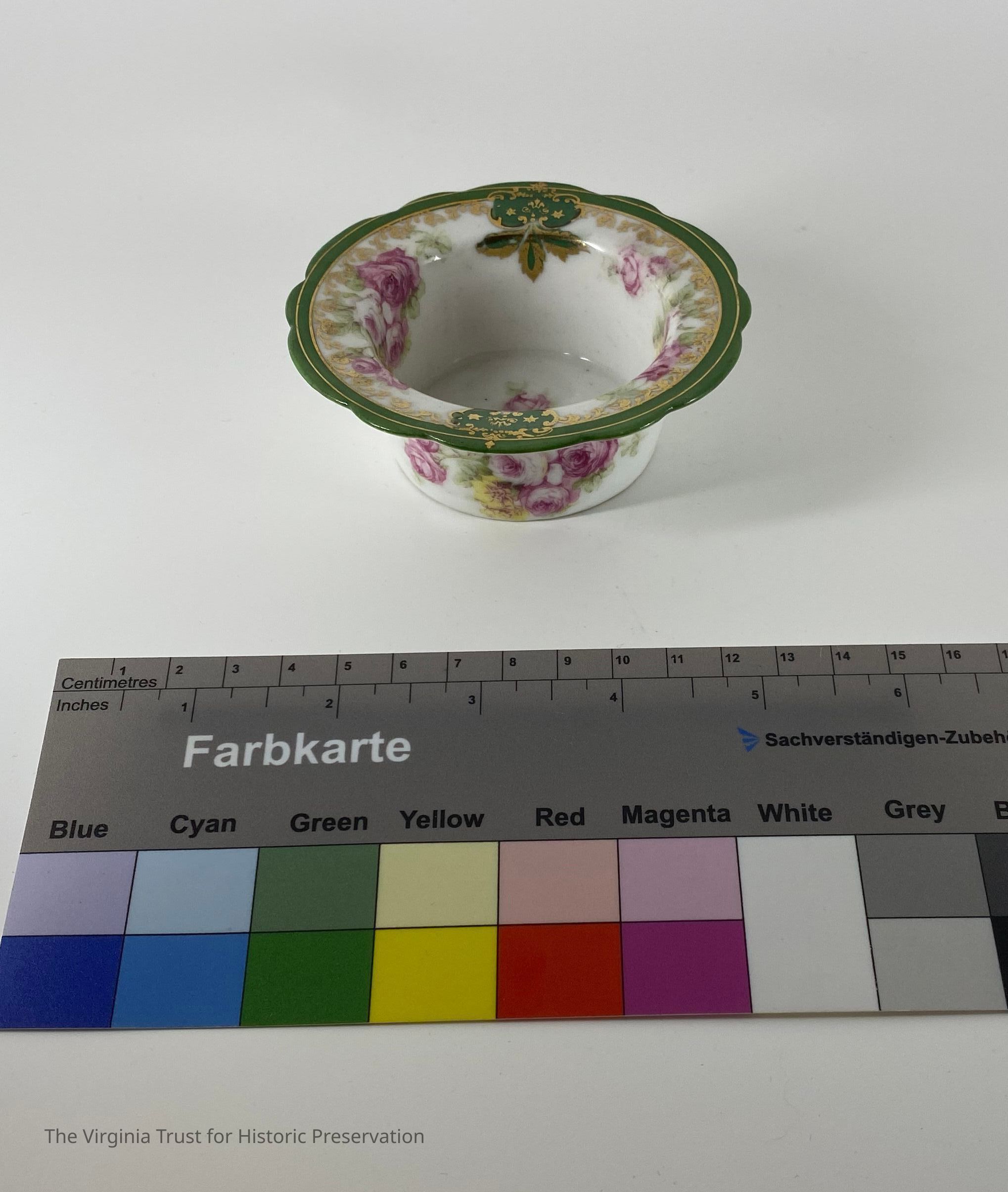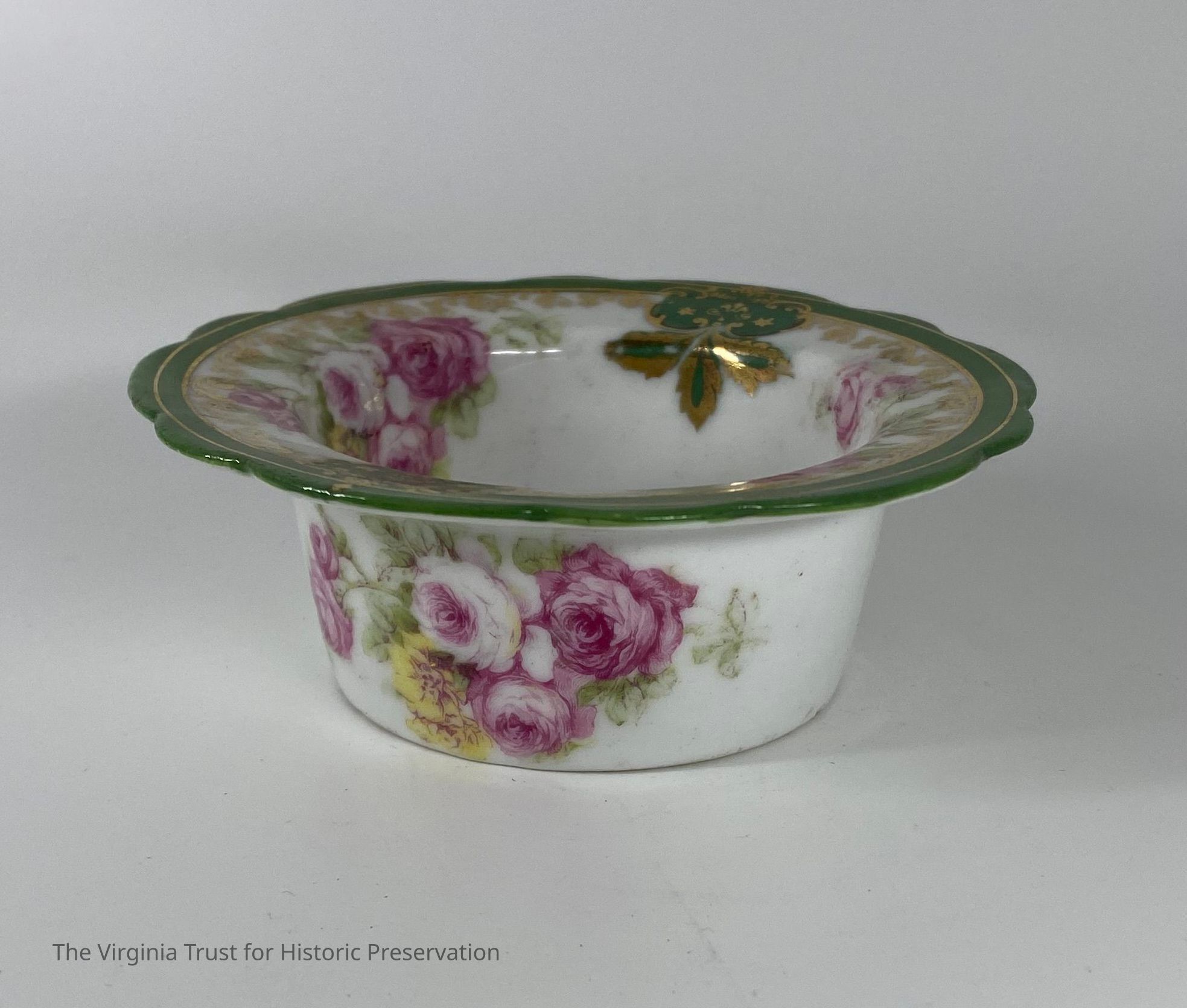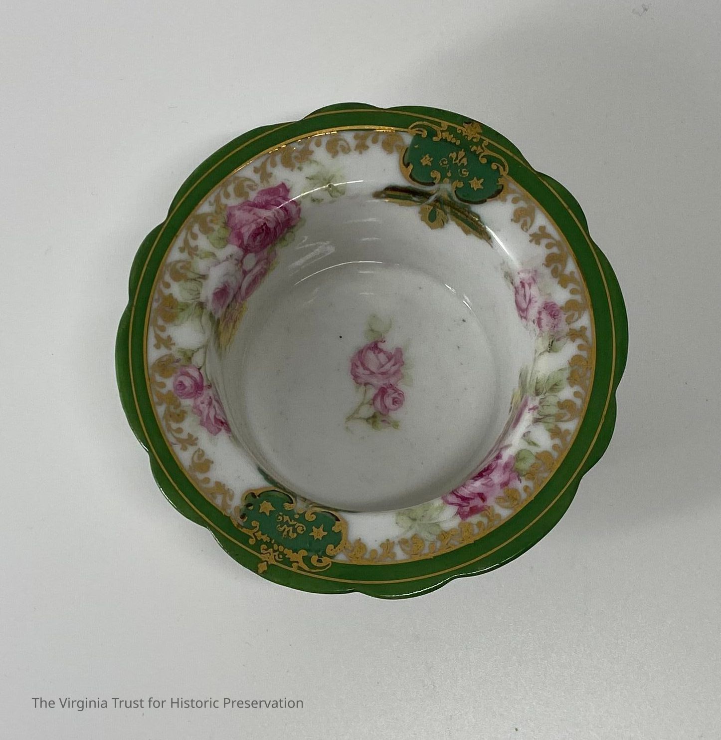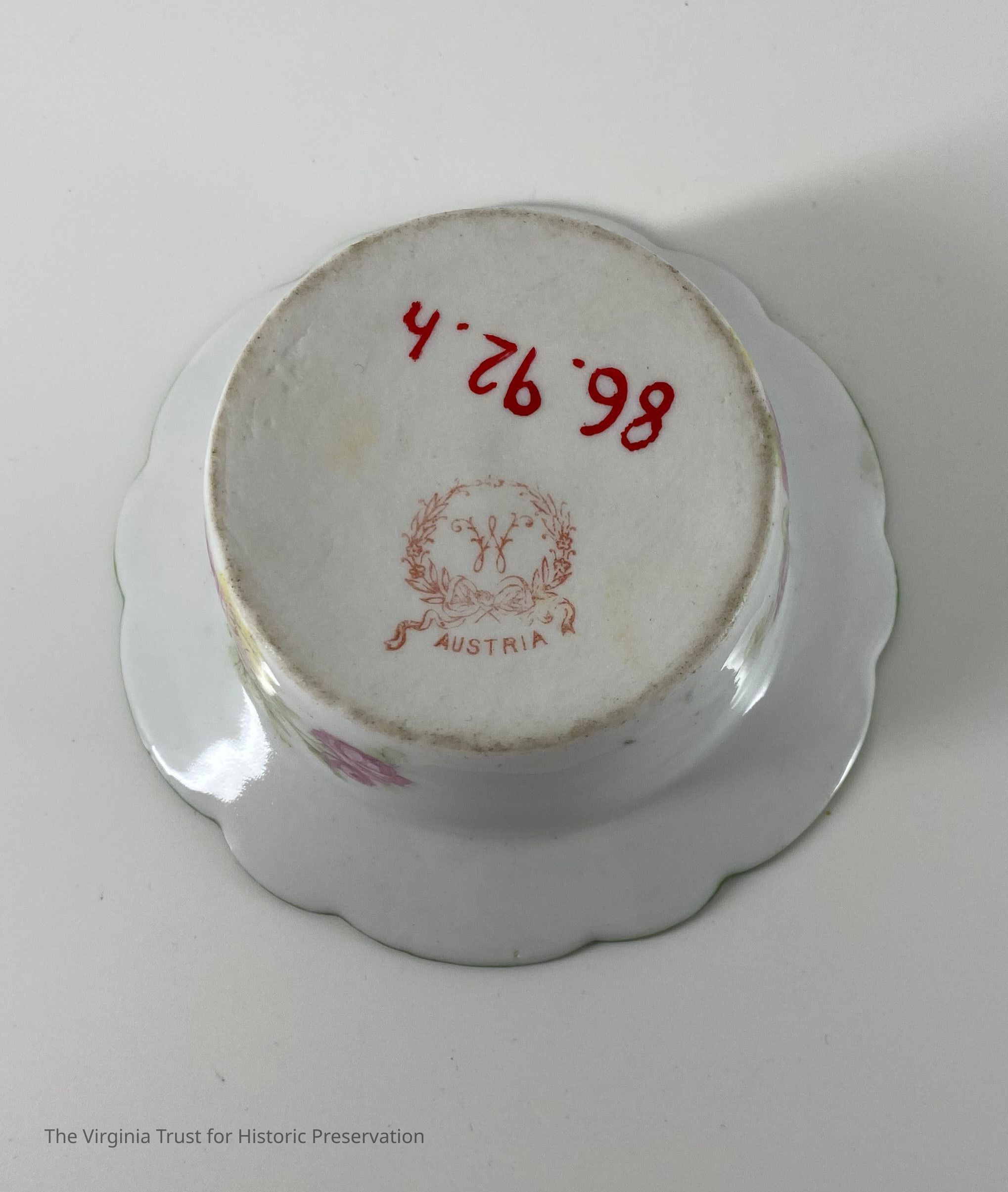 One of five ramekins that match the pattern on corresponding saucers (1986.092 A-F). Ramekins have peony in center on bottom. No handles. All have "Austria" with a wreath design stamped on the bottoms. Bottoms of ramekins are not glossed over like the rest of the surface.Dimensions