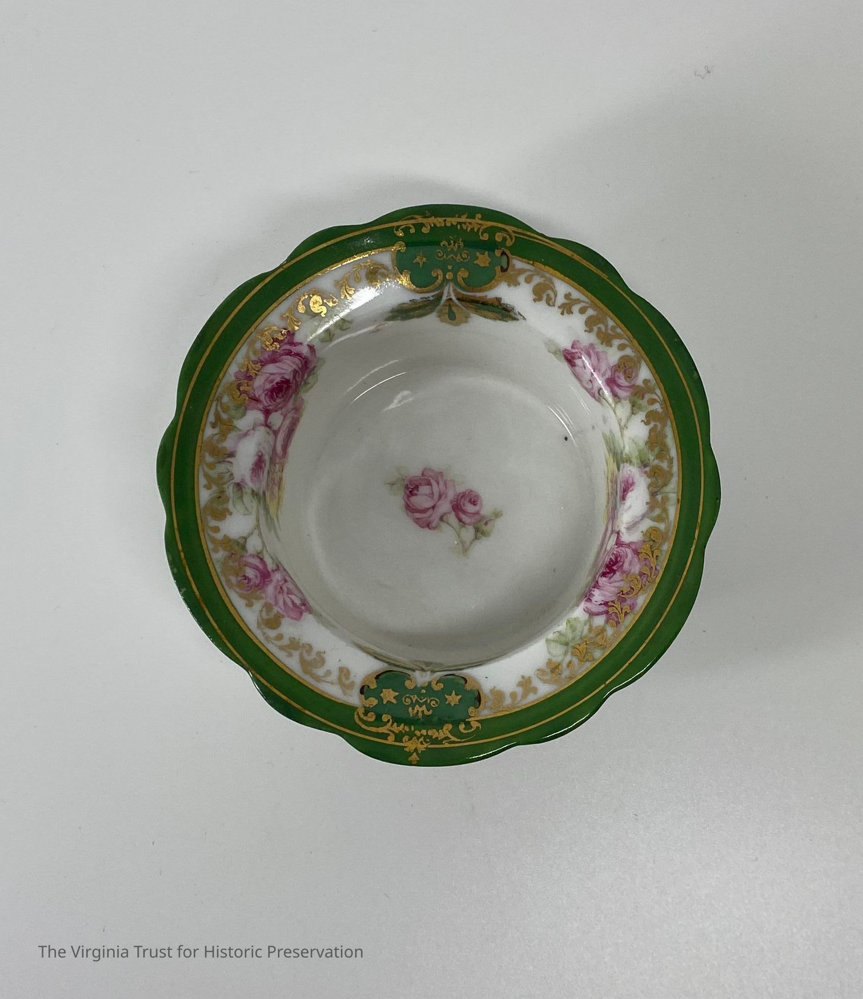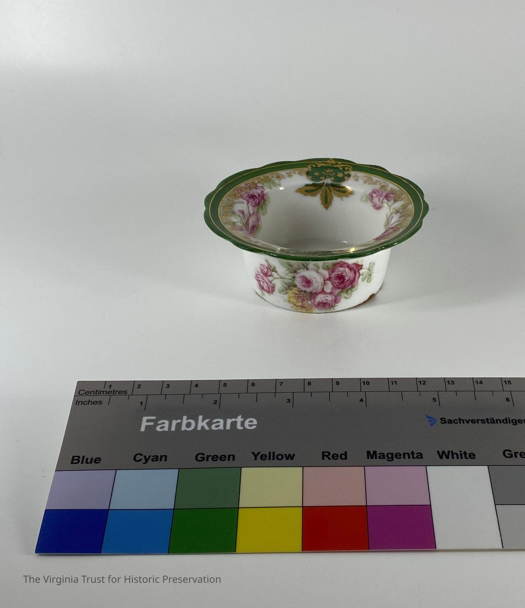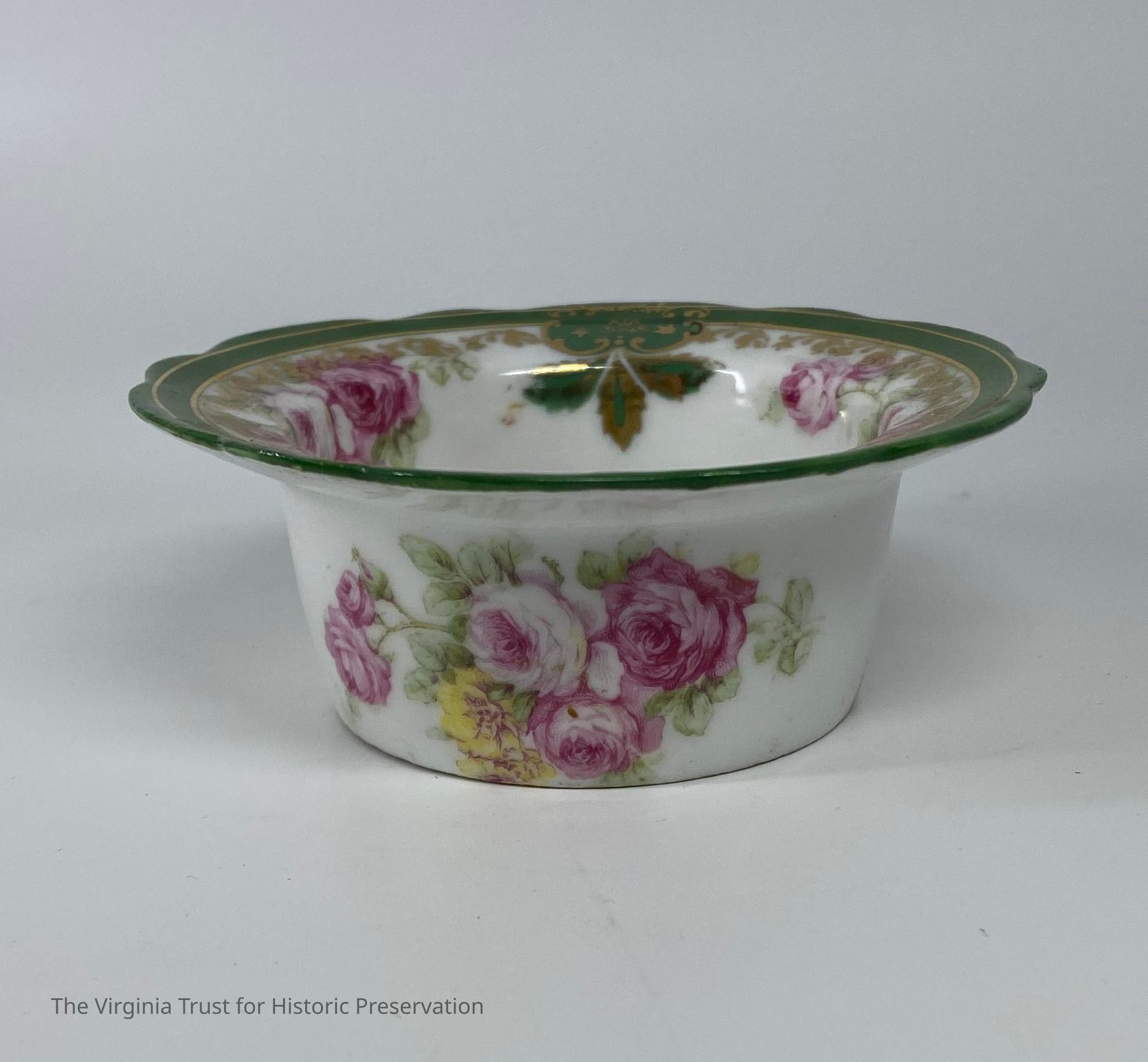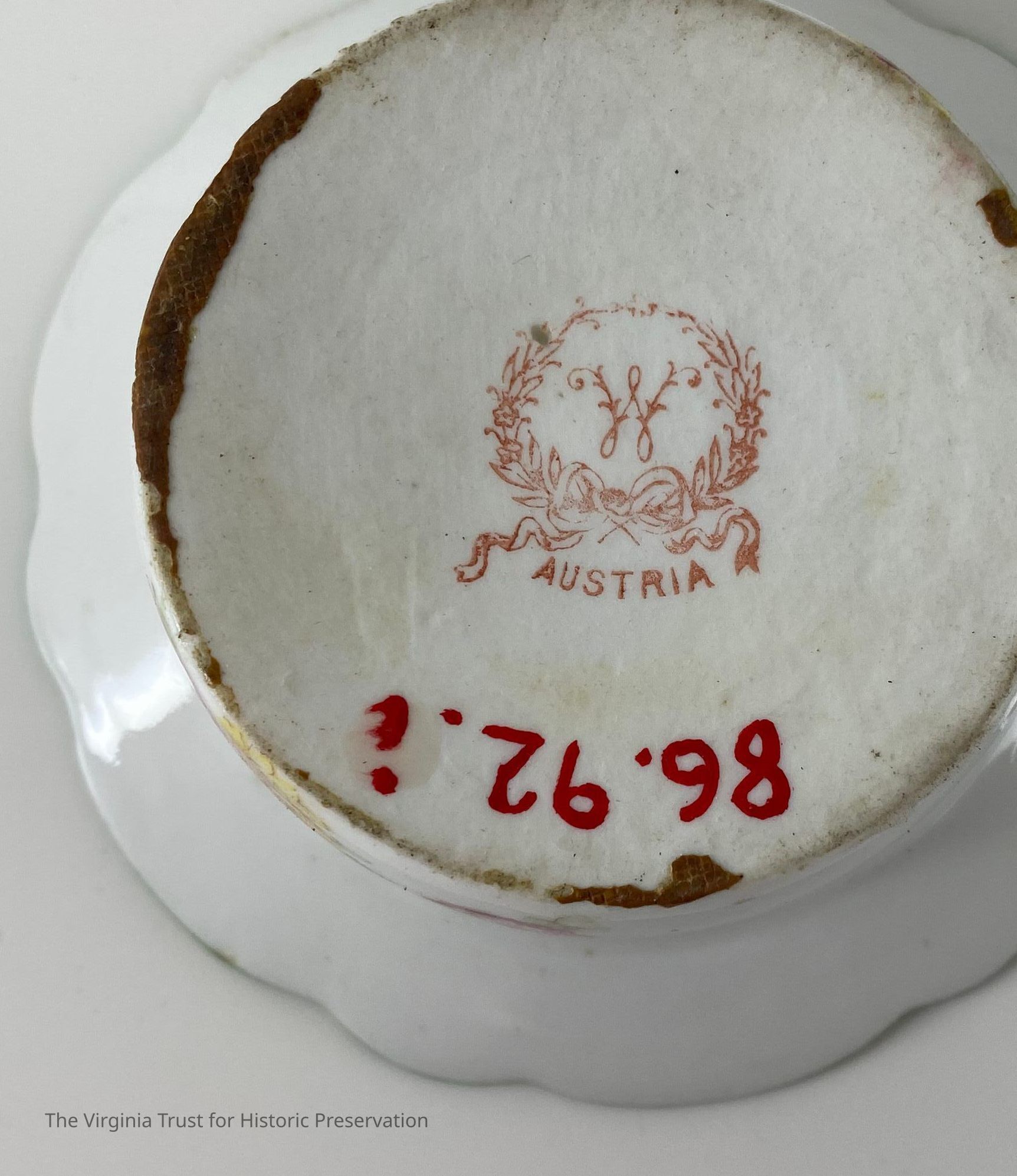 One of five ramekins that match the pattern on corresponding saucers (1986.092 A-F). Ramekins have peony in center on bottom. No handles. All have "Austria" with a wreath design stamped on the bottoms. Bottoms of ramekins are not glossed over like the rest of the surface.Dimensions