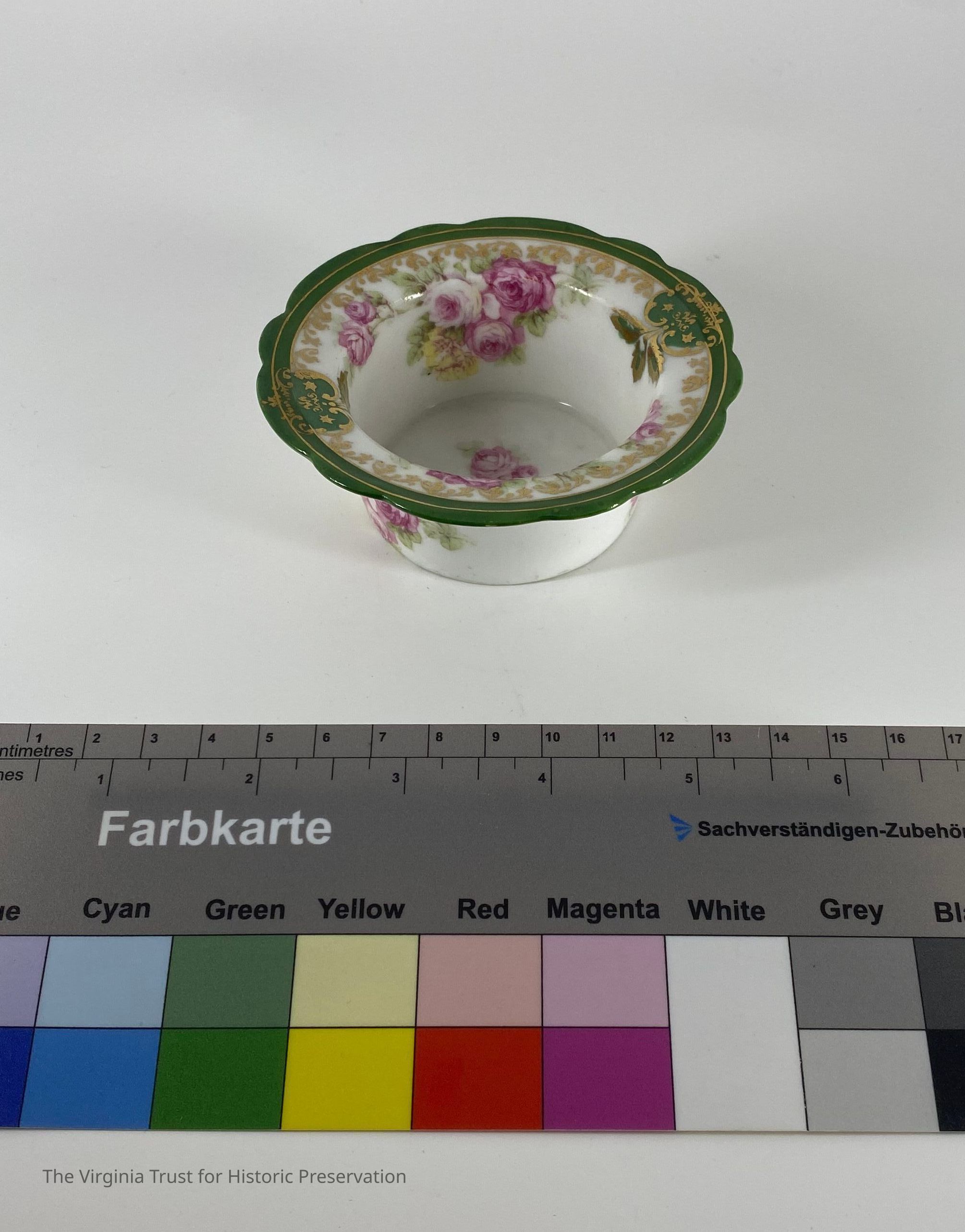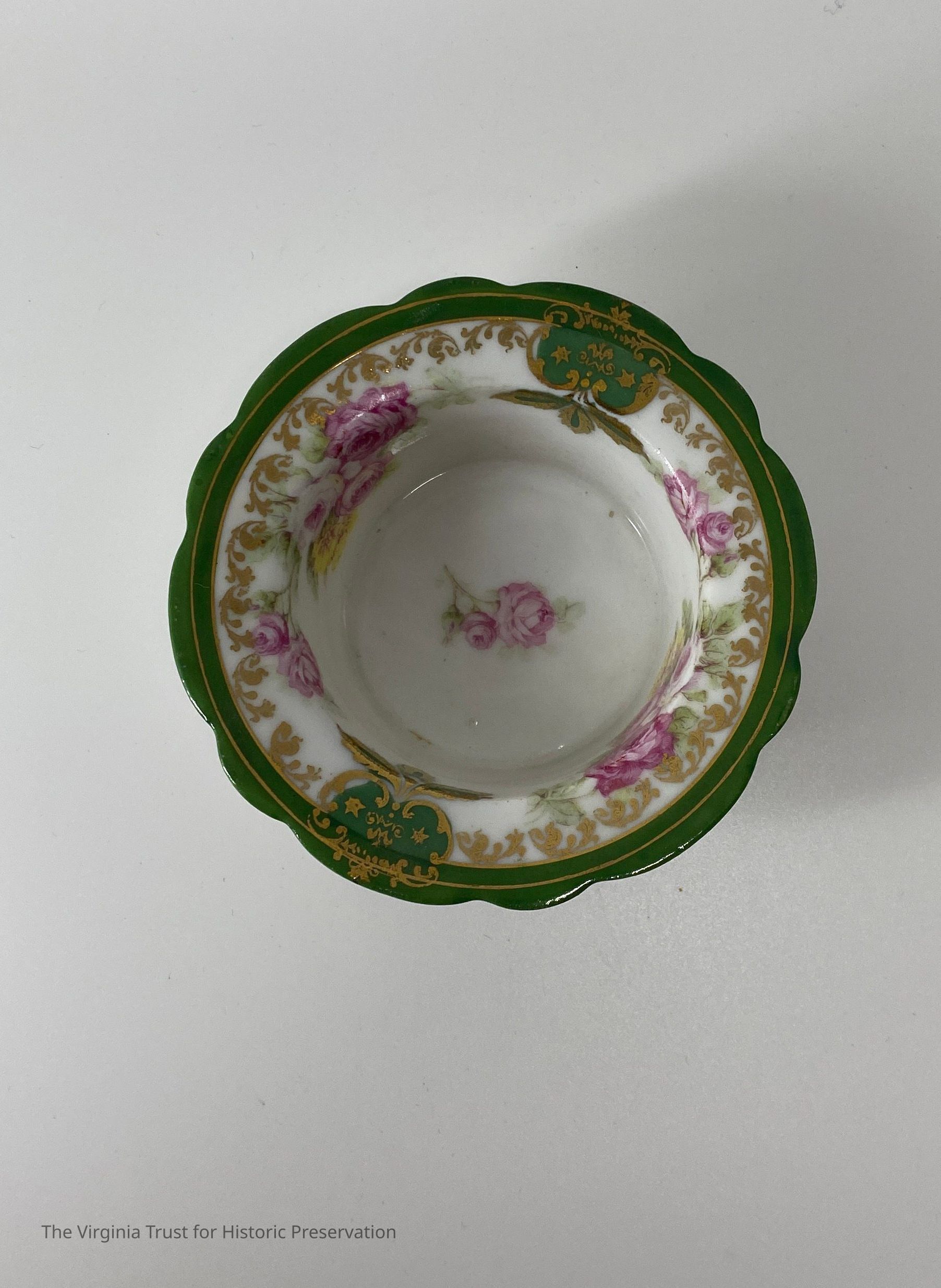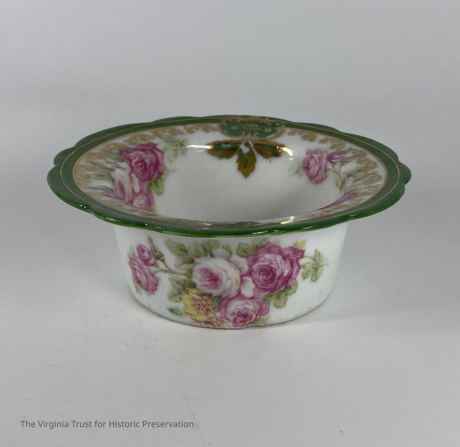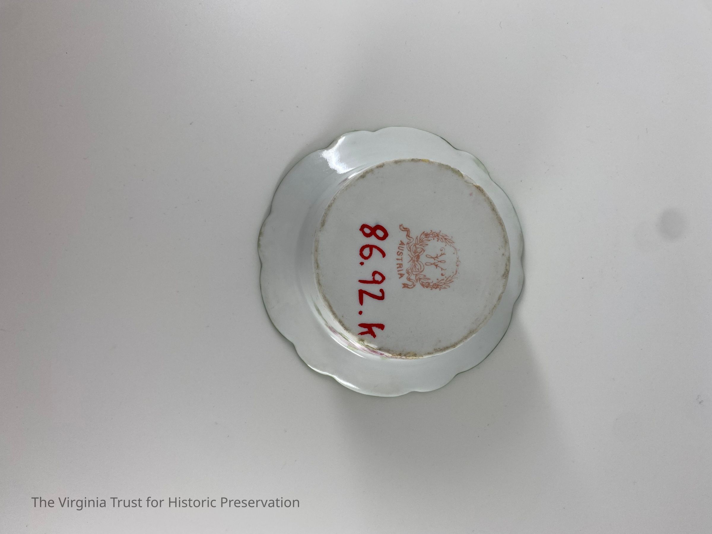 One of five ramekins that match the pattern on corresponding saucers (1986.092 A-F). Ramekins have peony in center on bottom. No handles. All have "Austria" with a wreath design stamped on the bottoms. Bottoms of ramekins are not glossed over like the rest of the surface.Dimensions