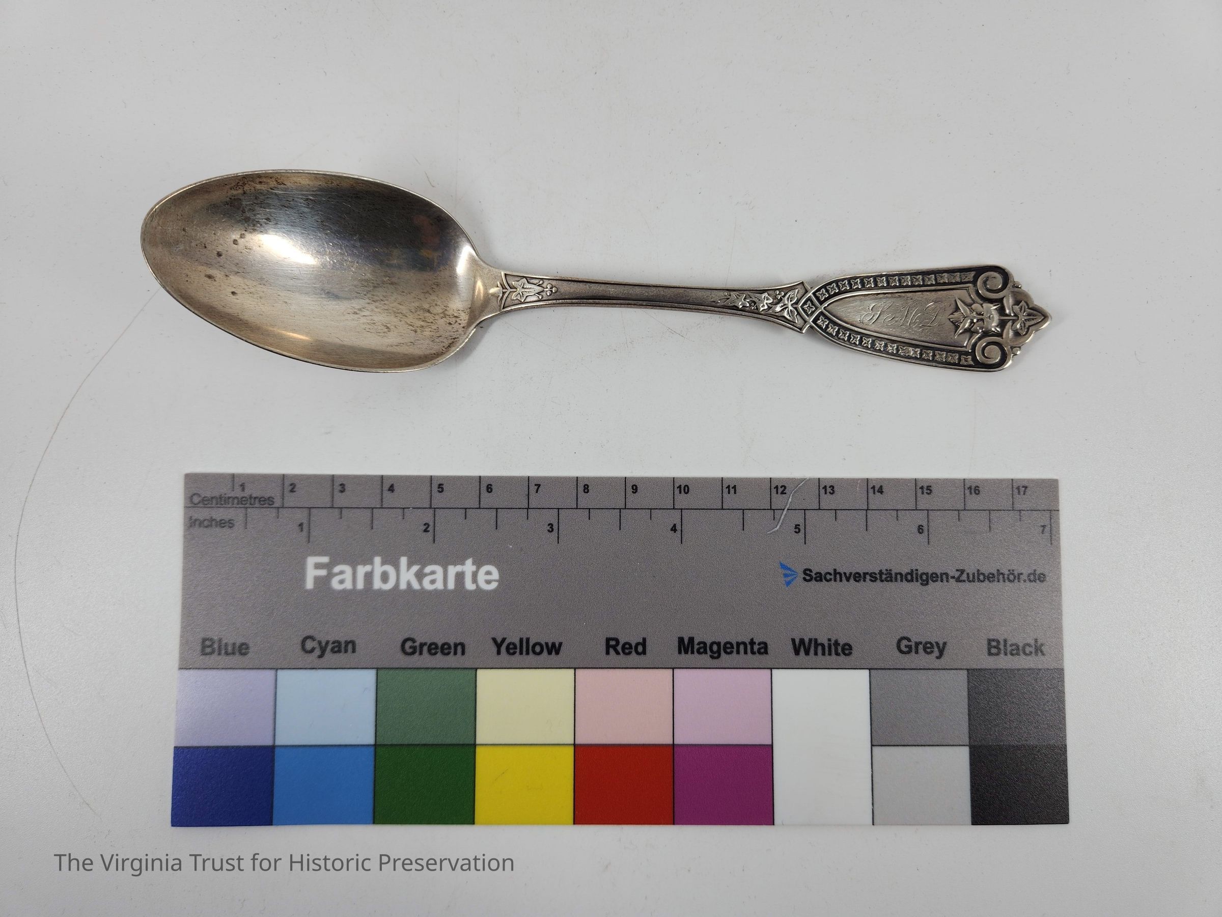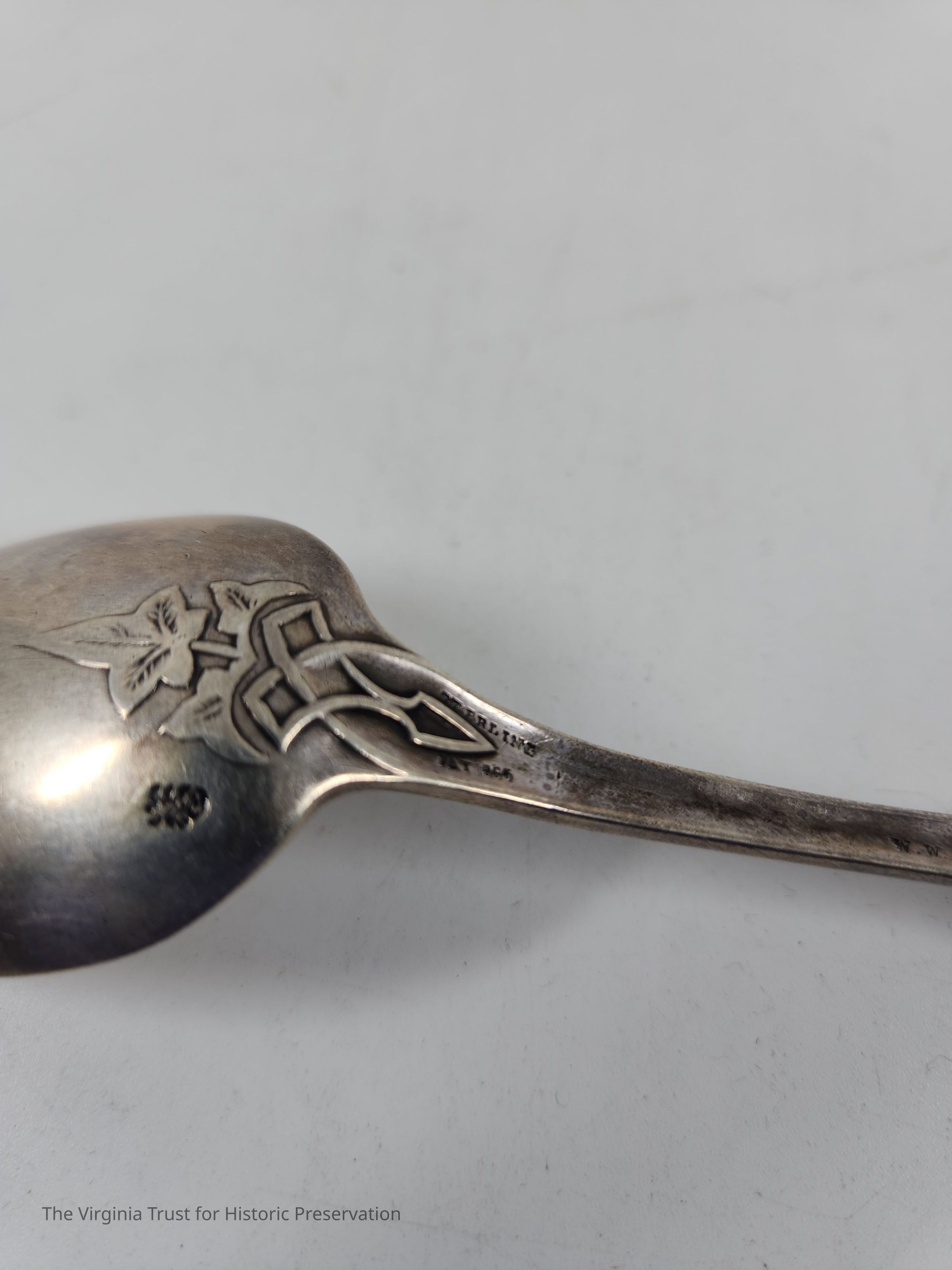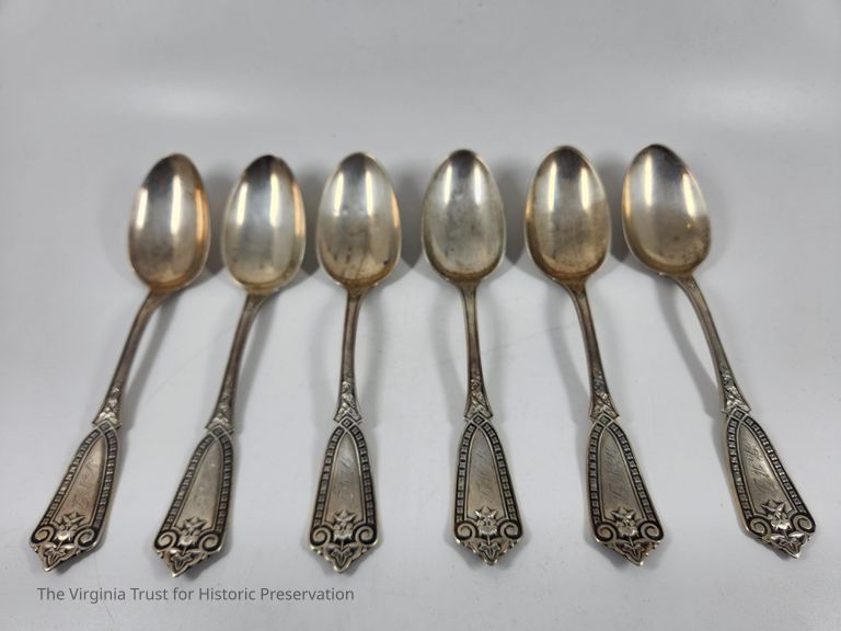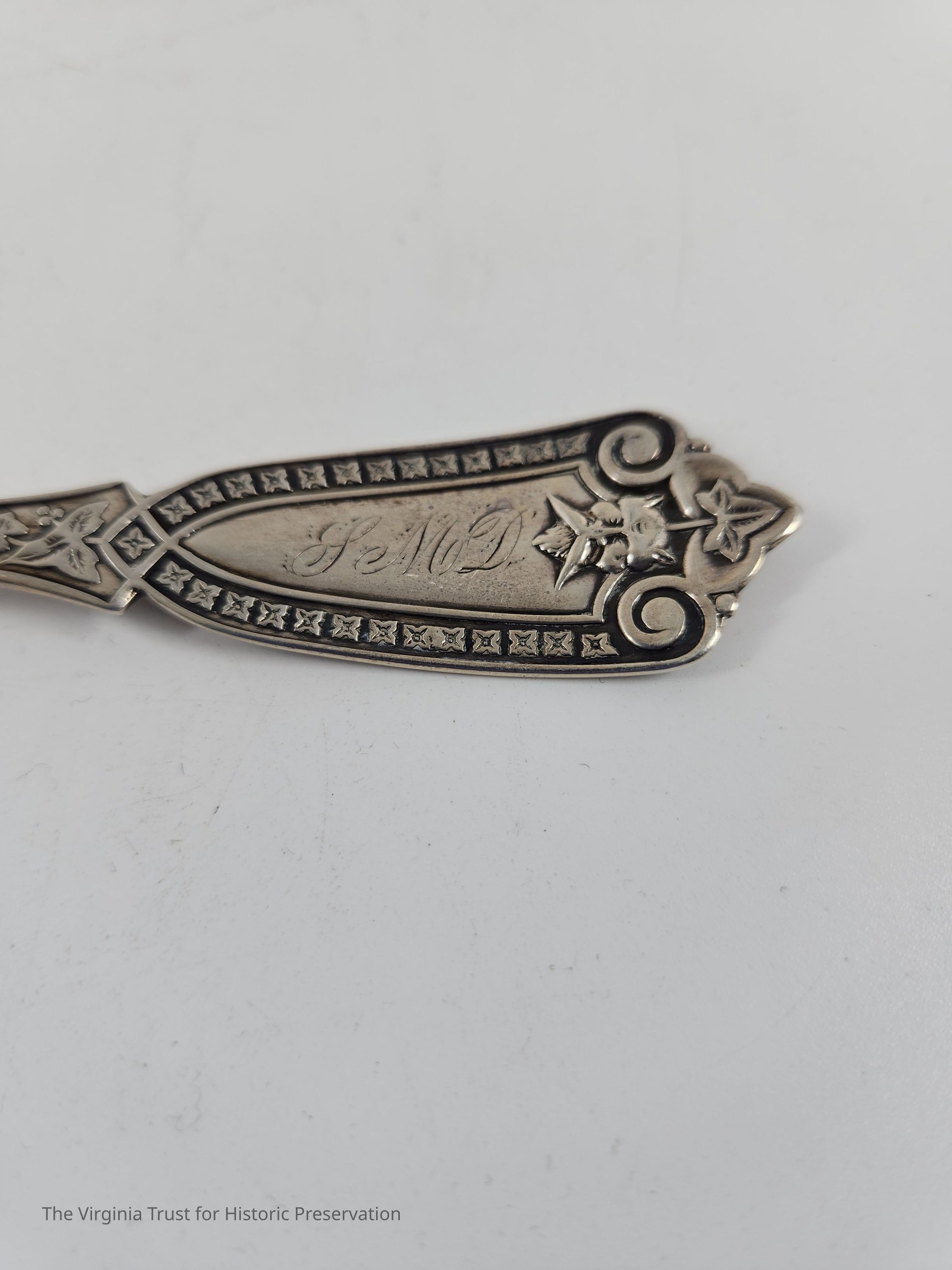 Part of six matching sterling silver dessert spoons part of 16 piece spoon set of three different sizes. SMD monogram (probably for Sarah Miranda Downham). Whiting Ivy Pattern originally produced by Henry Hebbard.