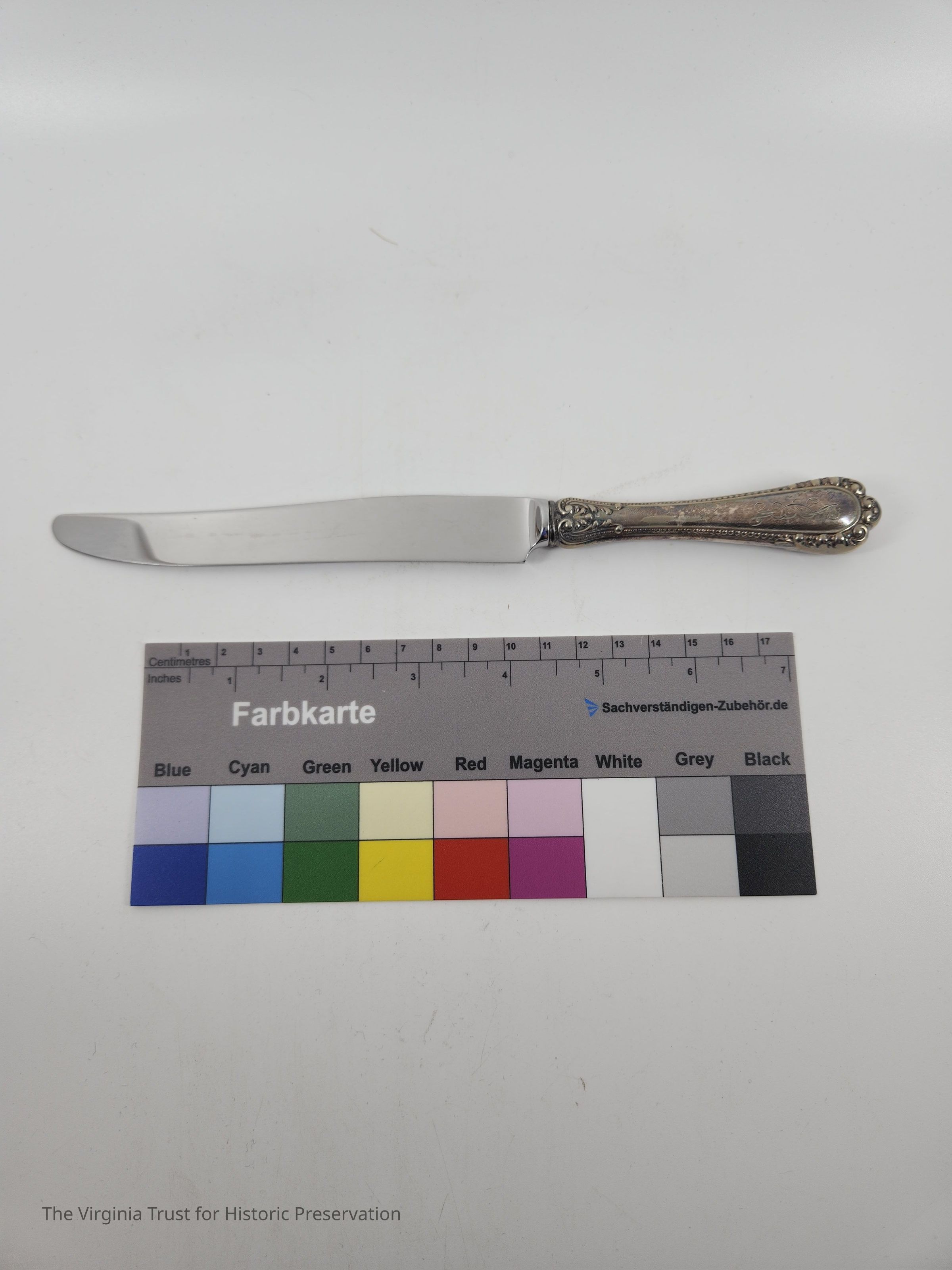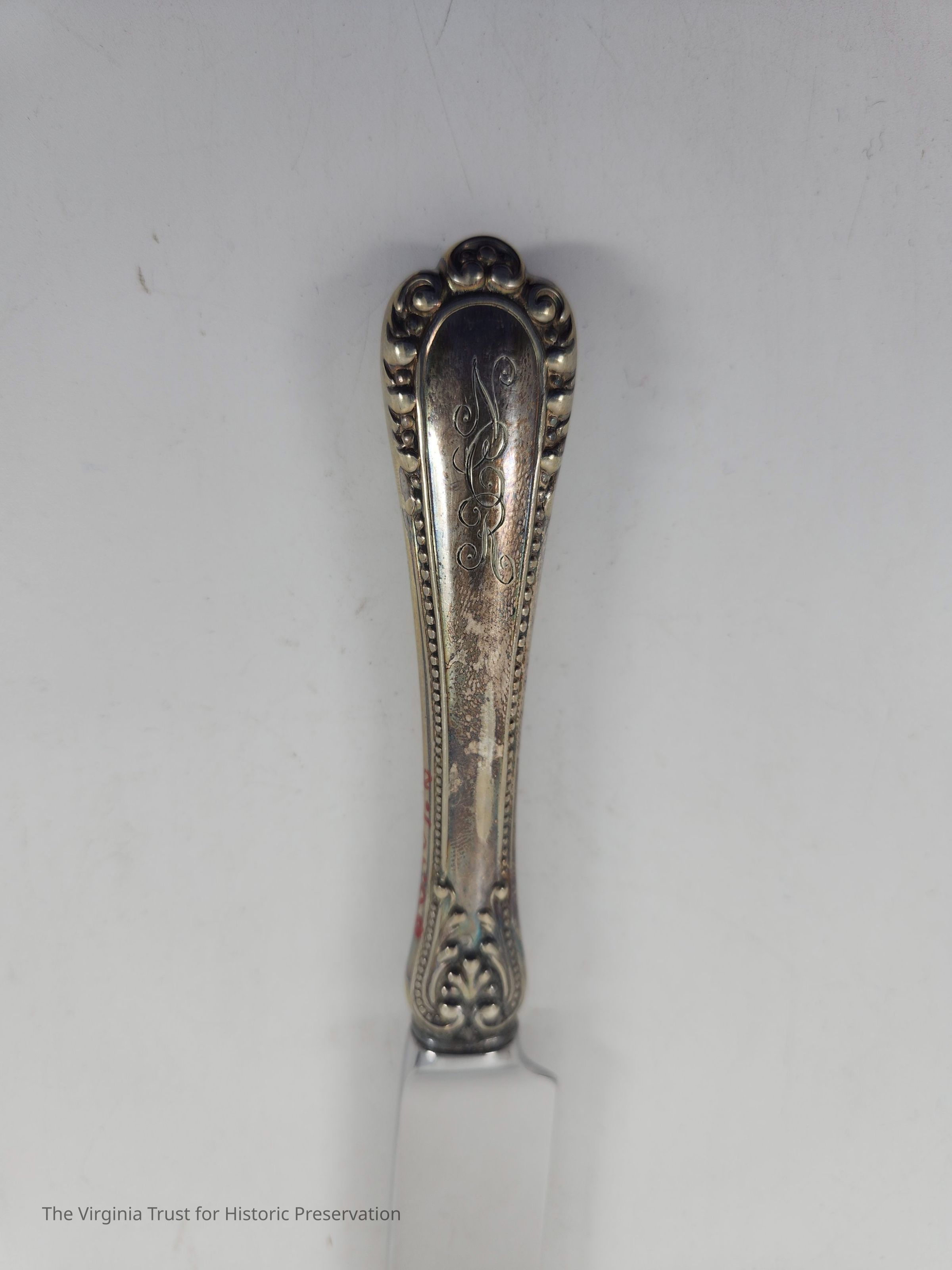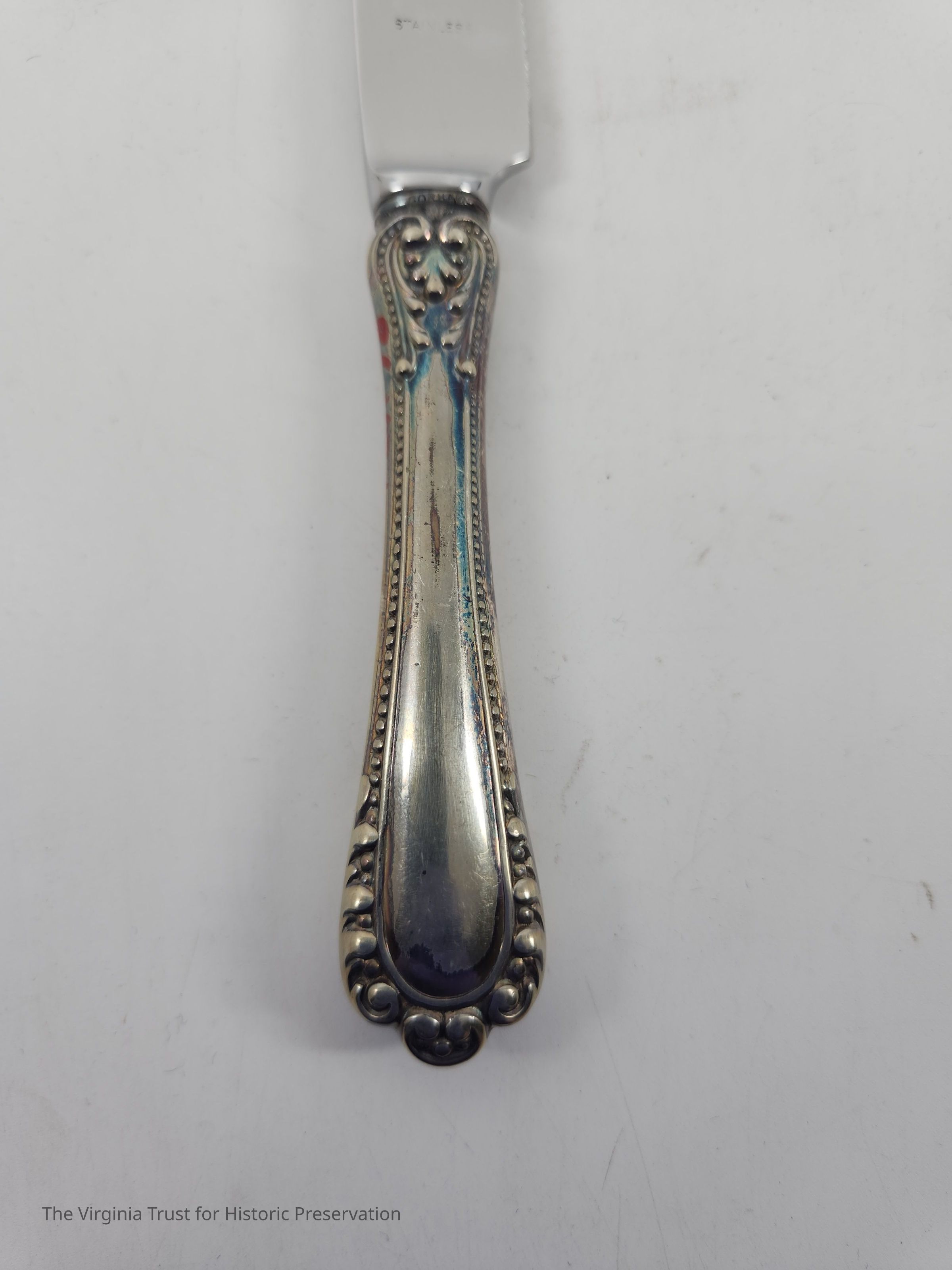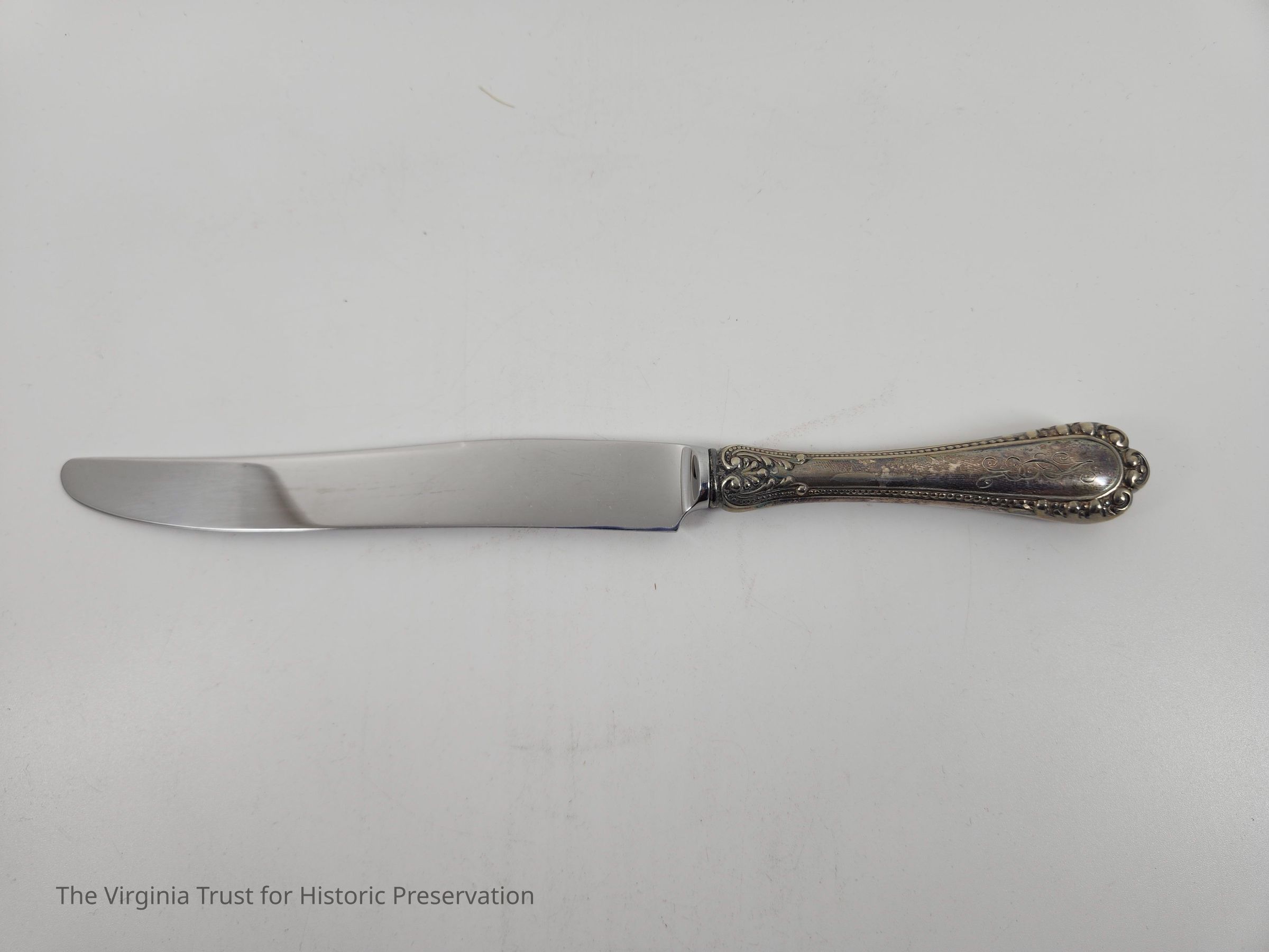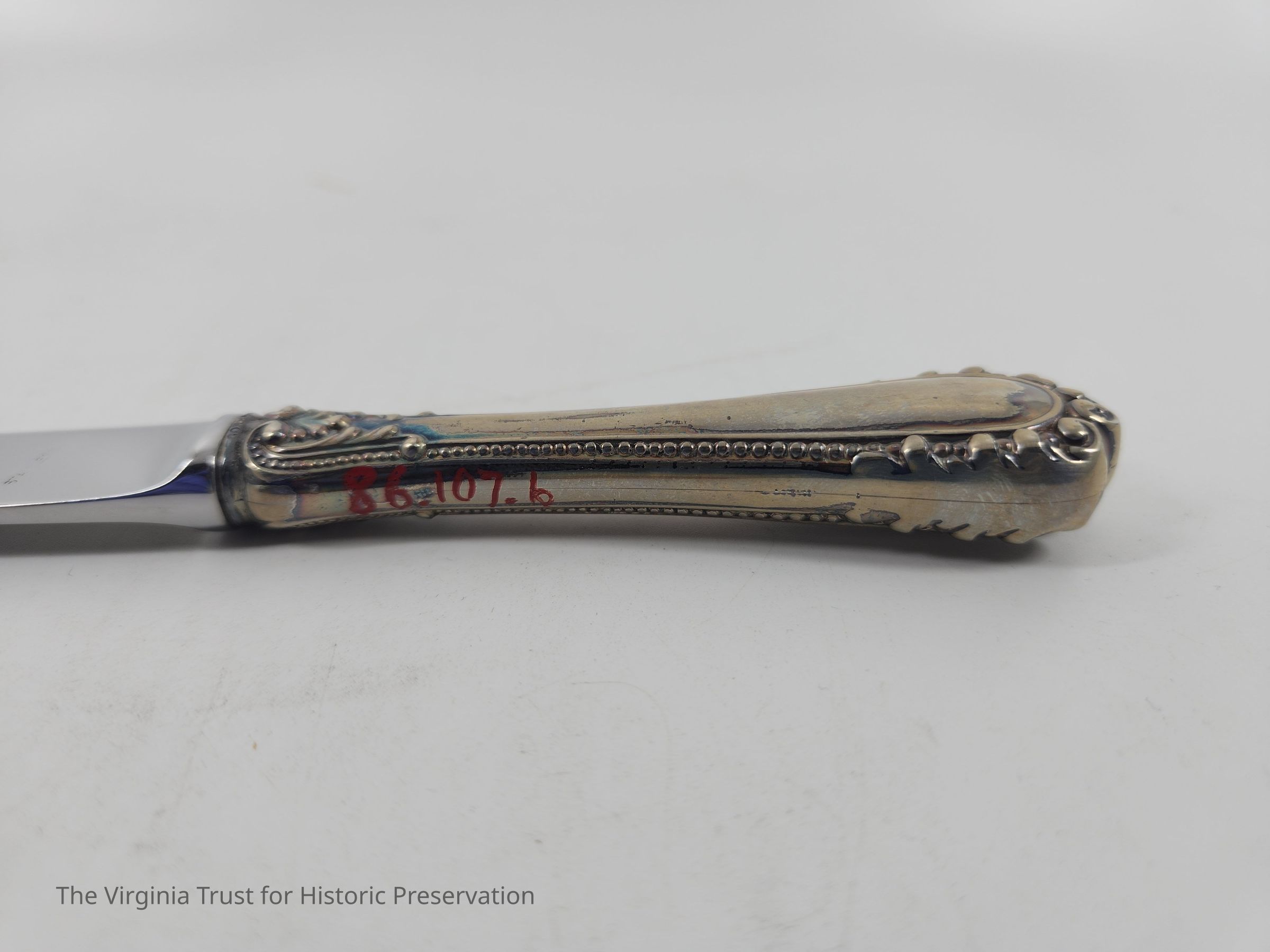 Part of a set of 12 heavy plate silver knives in the Gorham Manufacturing Company 1896 Winthrop pattern. Six knives (1986.107 A-F) monogrammed "NCR" and other six blunt blade knives monogrammed "NBC" (1986.107 G-L). Four have stainless steel blades that were put in in February of 1981 and eight have their original steel blades.