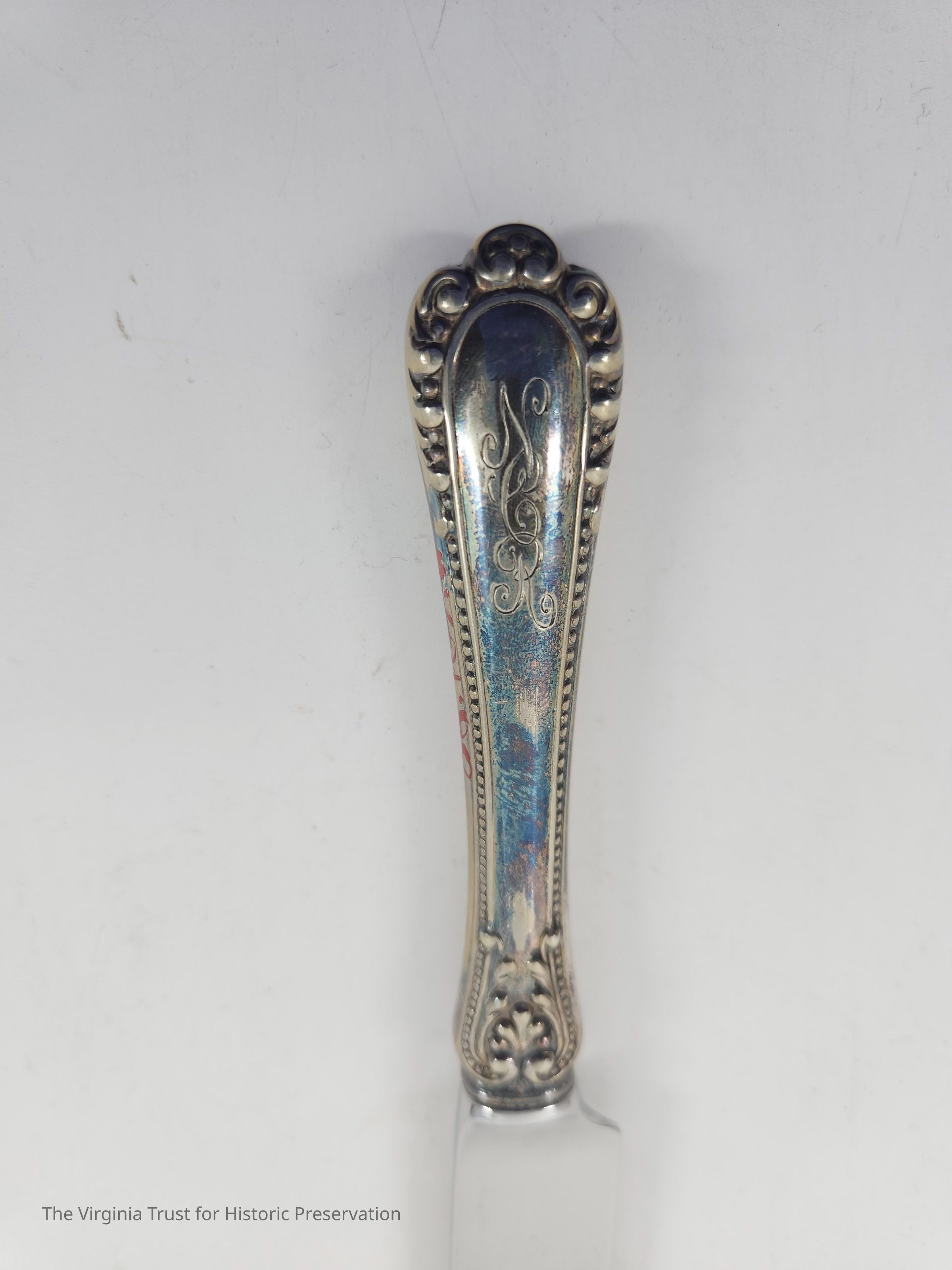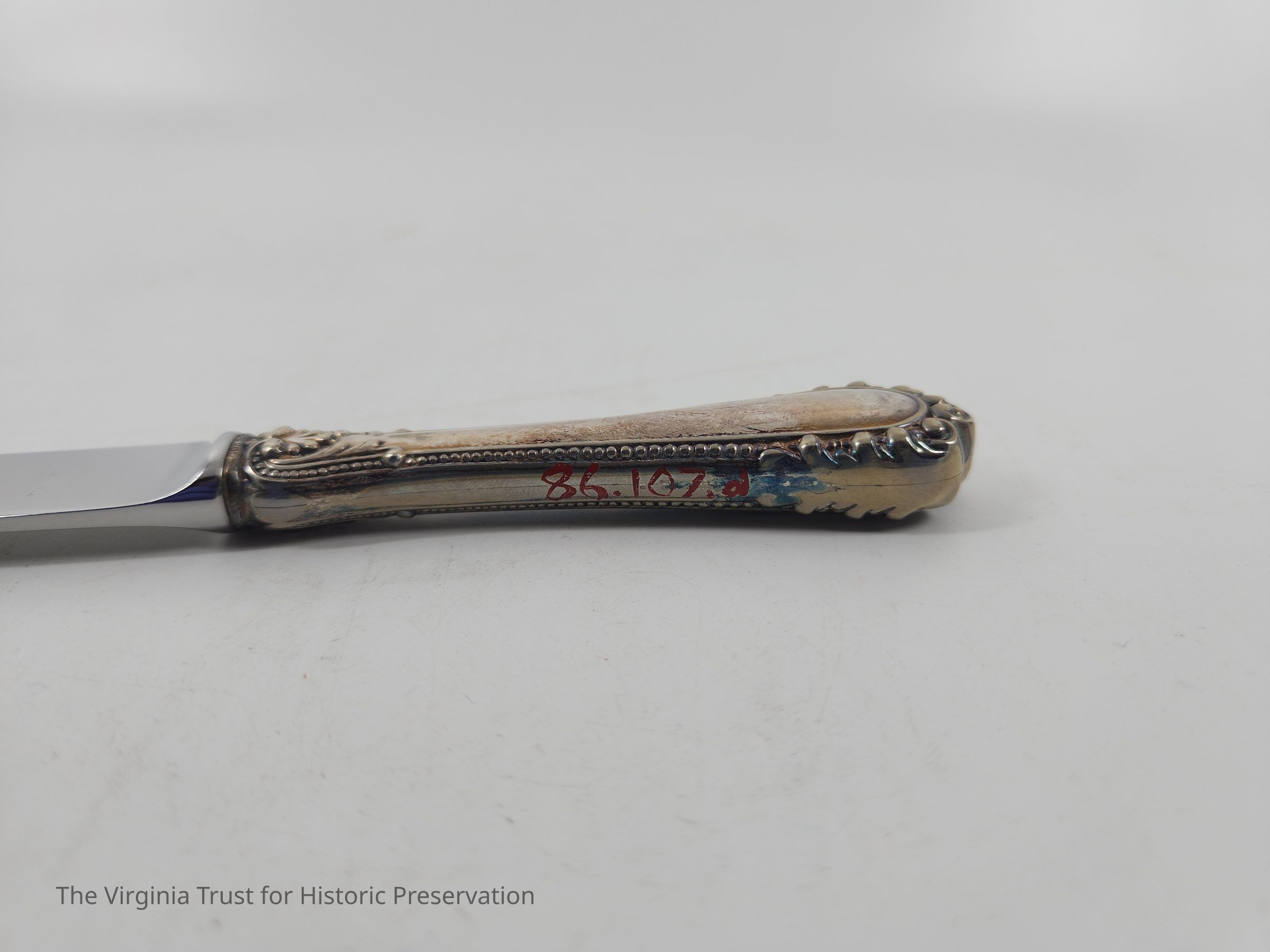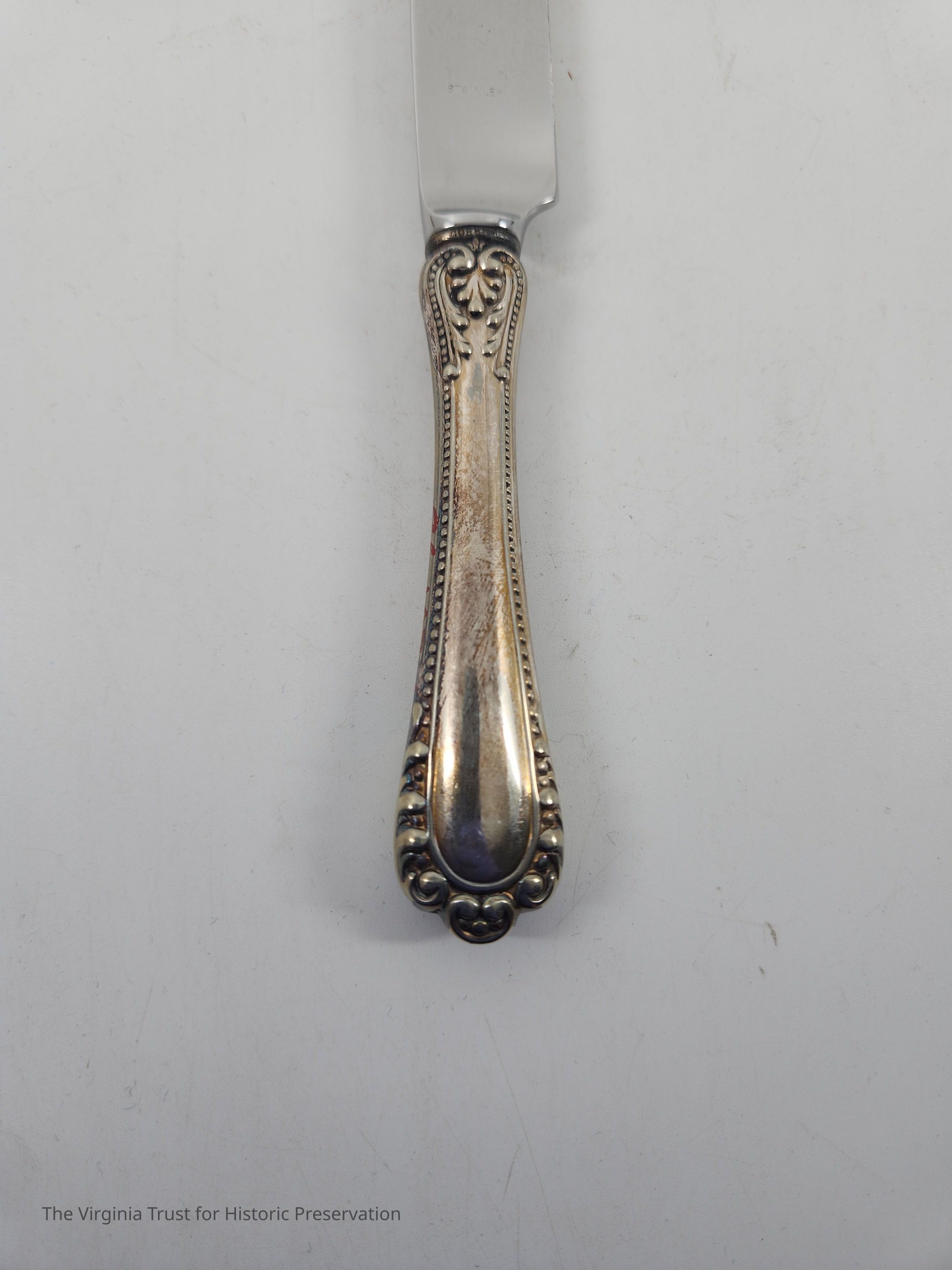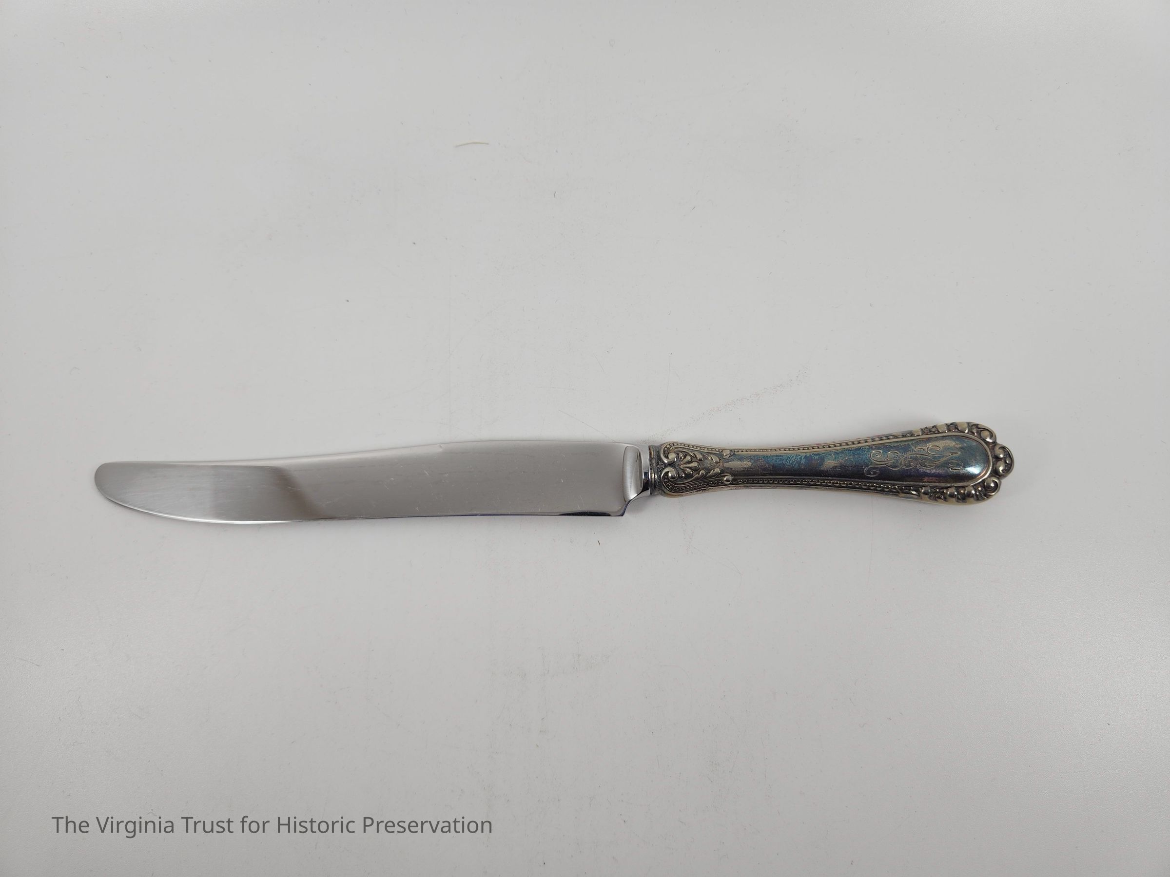 Part of a set of 12 heavy plate silver knives in the Gorham Manufacturing Company 1896 Winthrop pattern. Six knives (1986.107 A-F) monogrammed "NCR" and other six blunt blade knives monogrammed "NBC" (1986.107 G-L). Four have stainless steel blades that were put in in February of 1981 and eight have their original steel blades.
