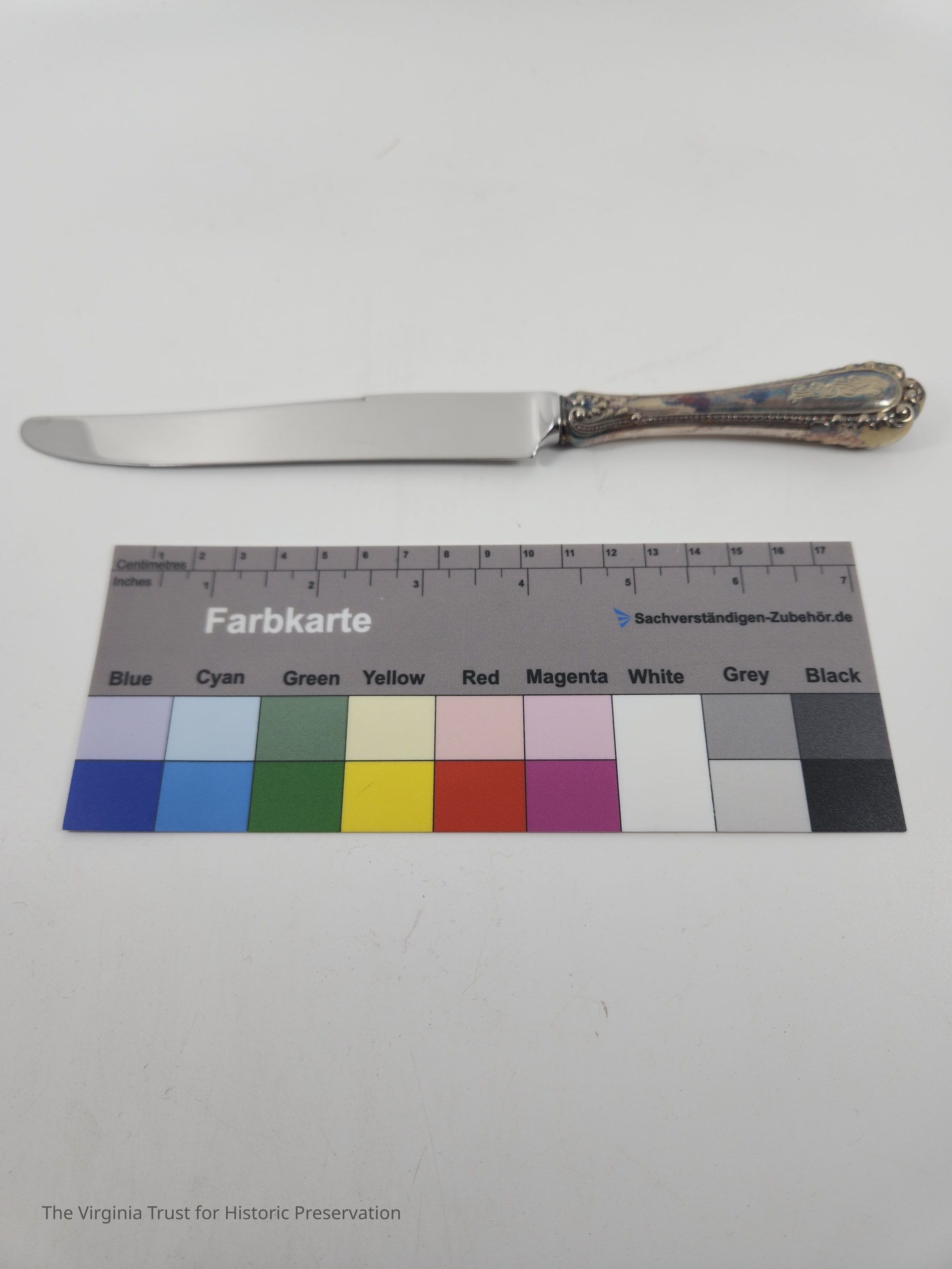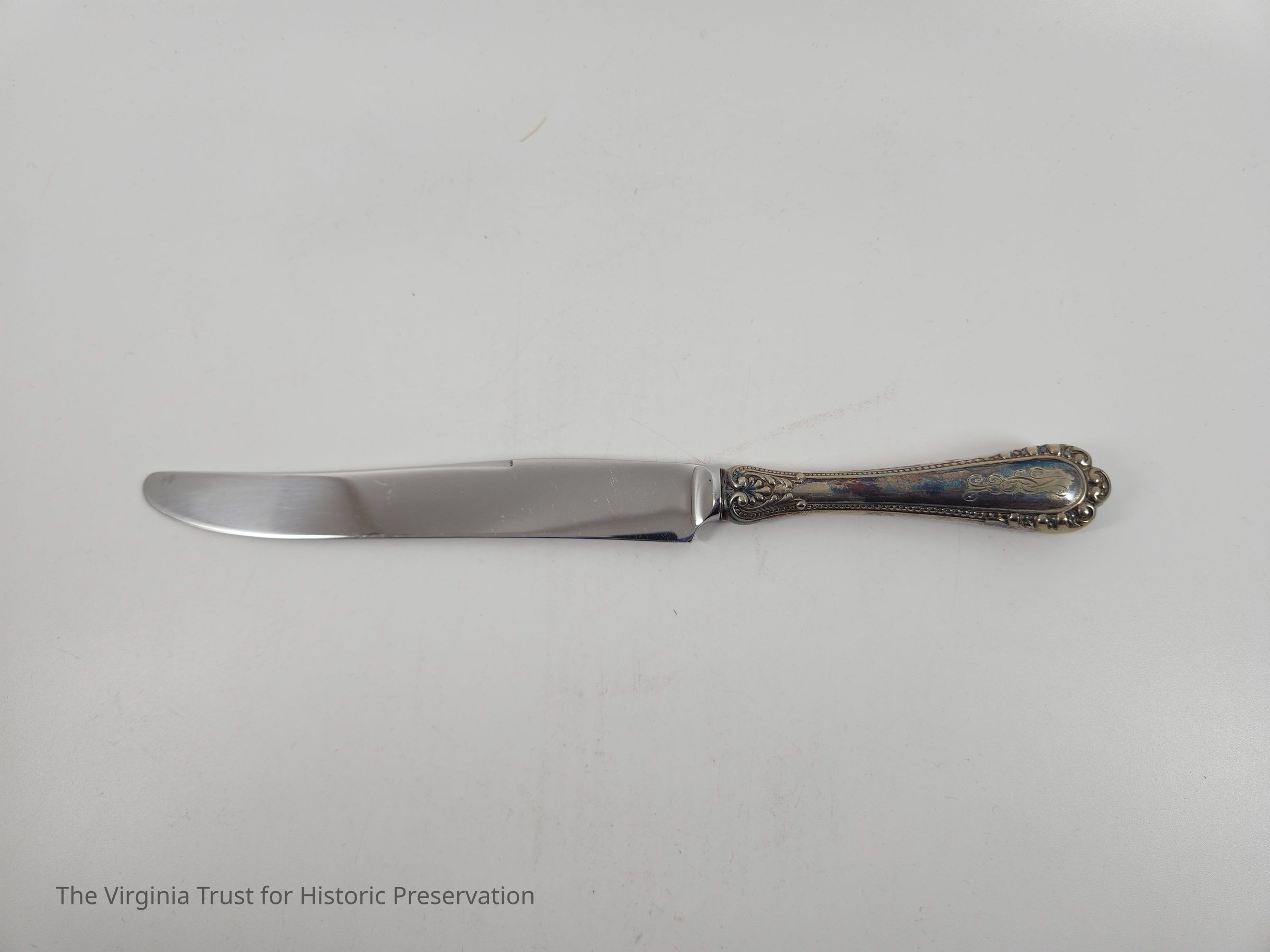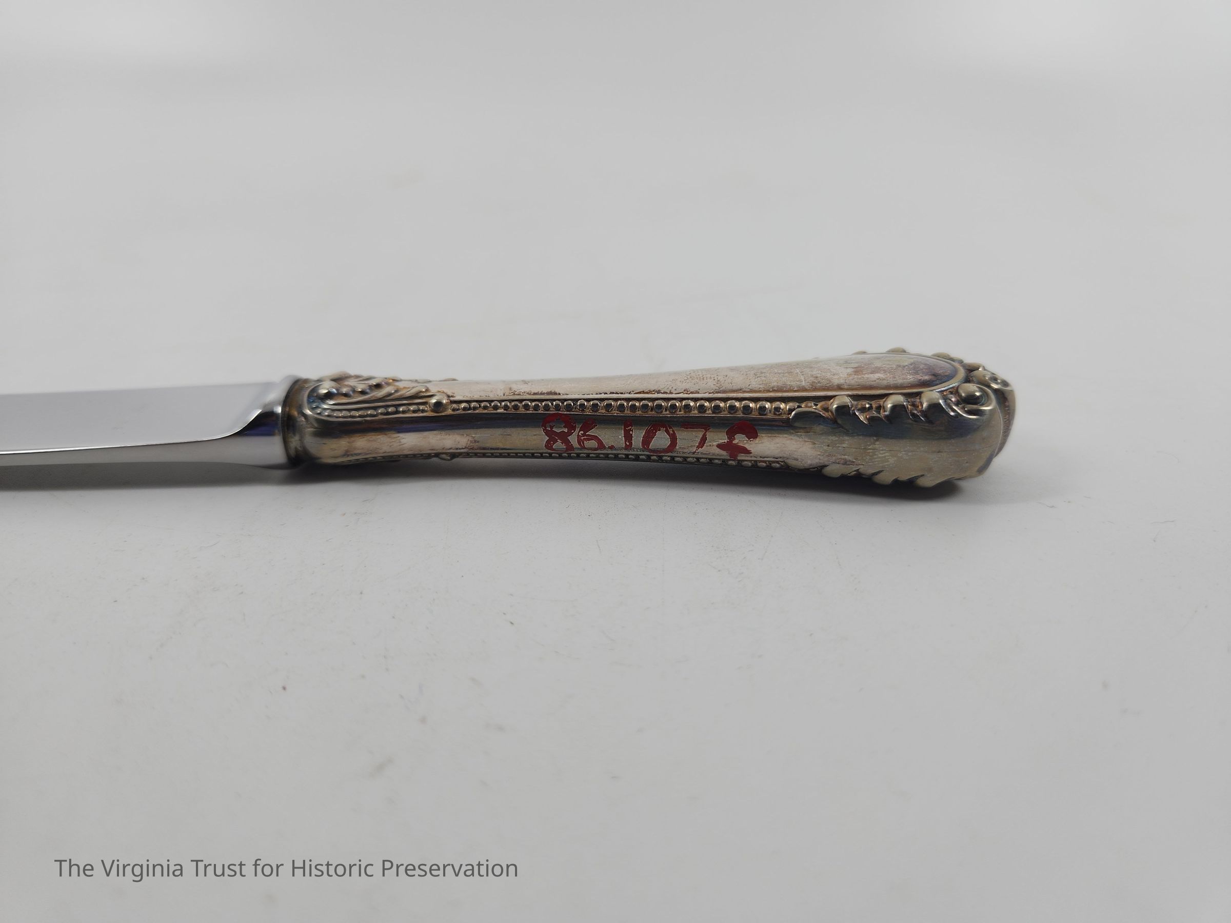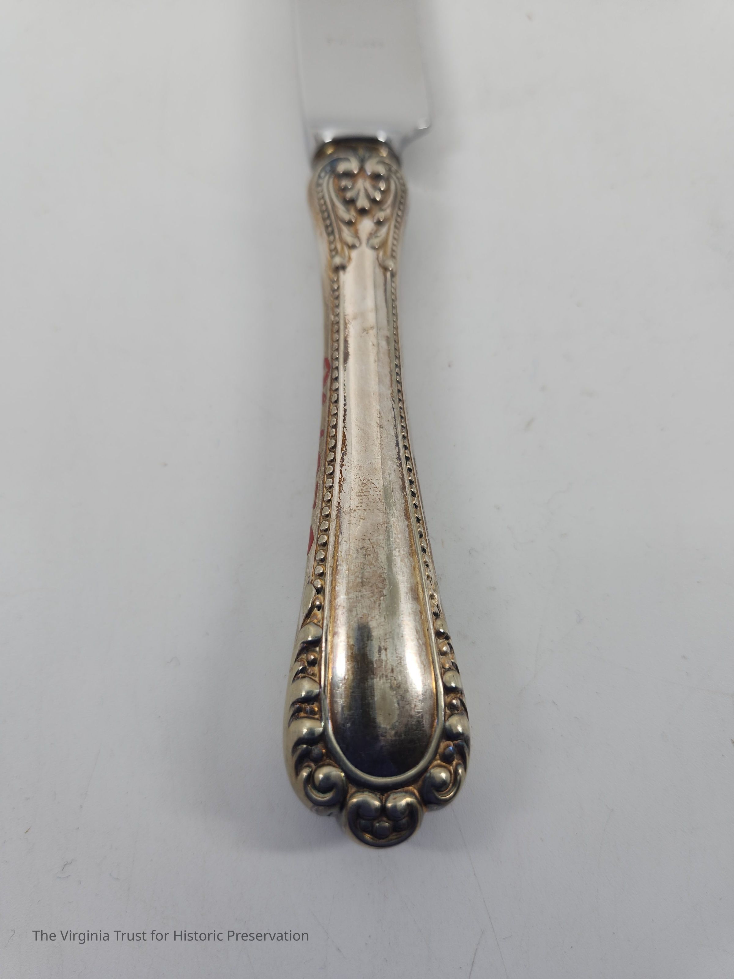 Part of a set of 12 heavy plate silver knives in the Gorham Manufacturing Company 1896 Winthrop pattern. Six knives (1986.107 A-F) monogrammed "NCR" and other six blunt blade knives monogrammed "NBC" (1986.107 G-L). Four have stainless steel blades that were put in in February of 1981 and eight have their original steel blades.