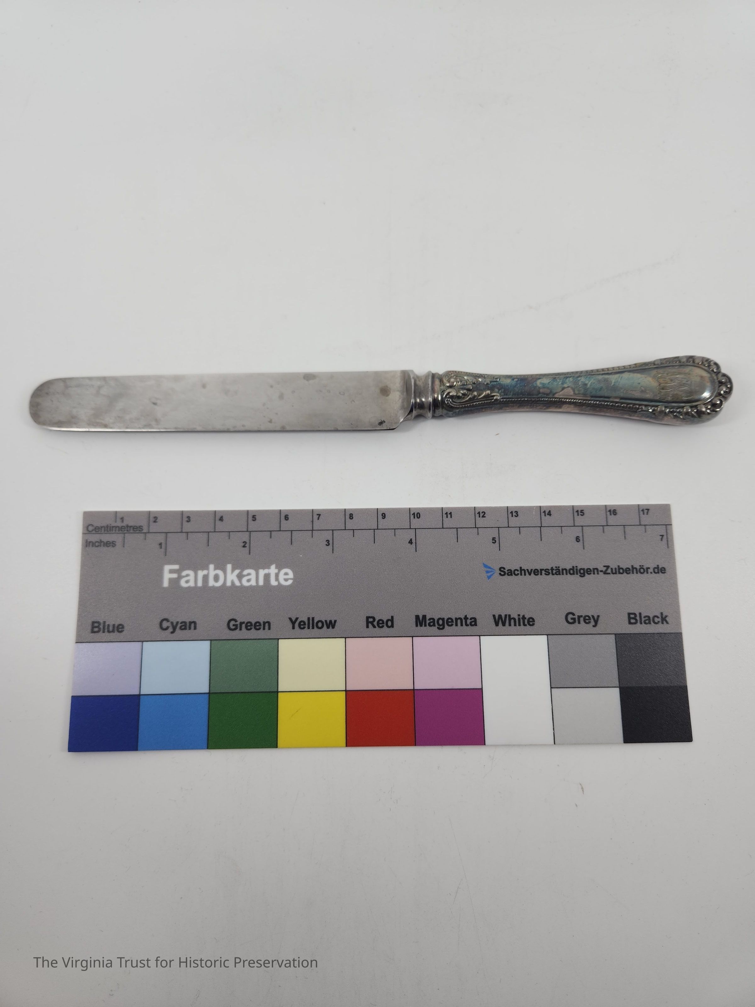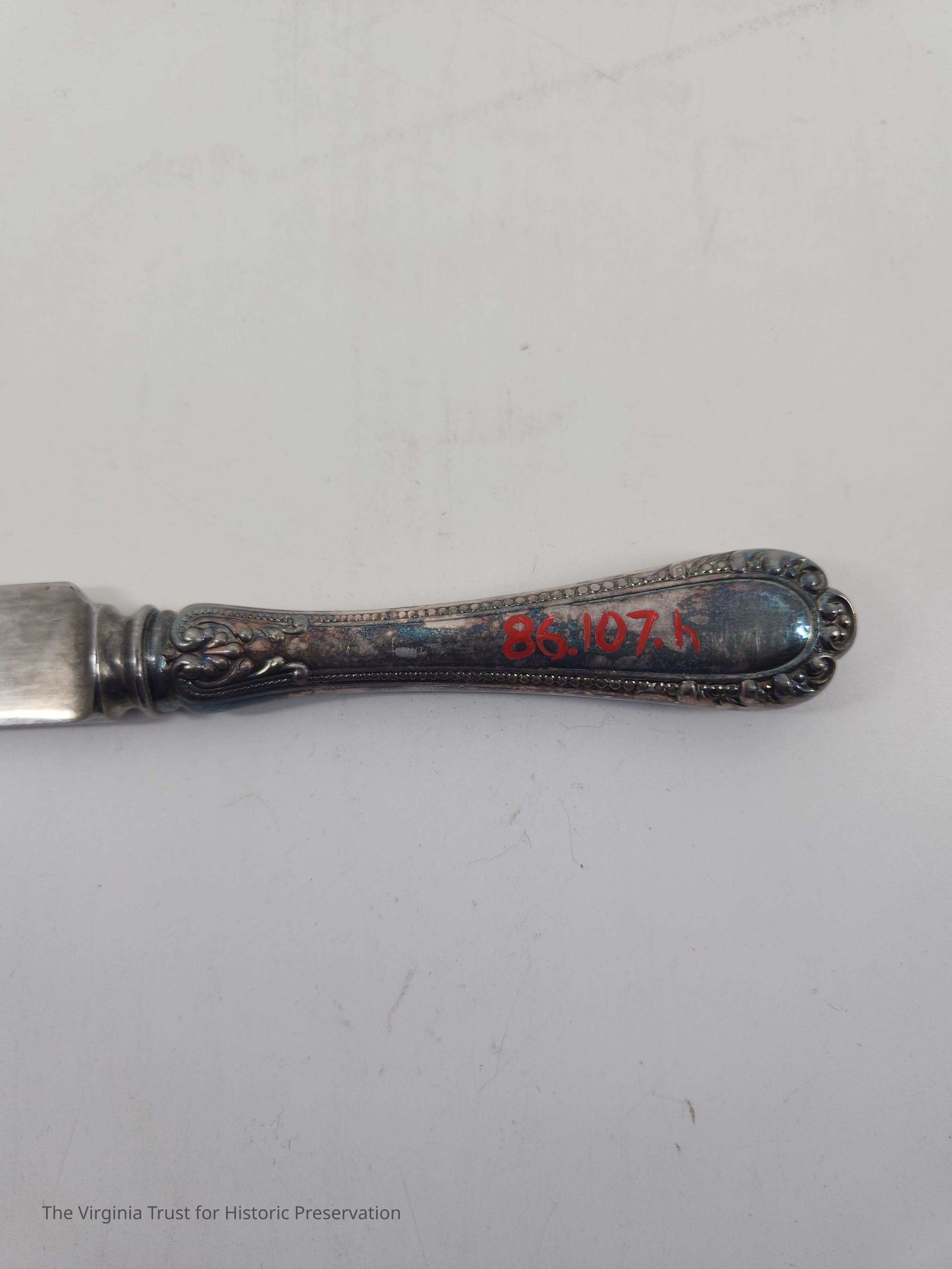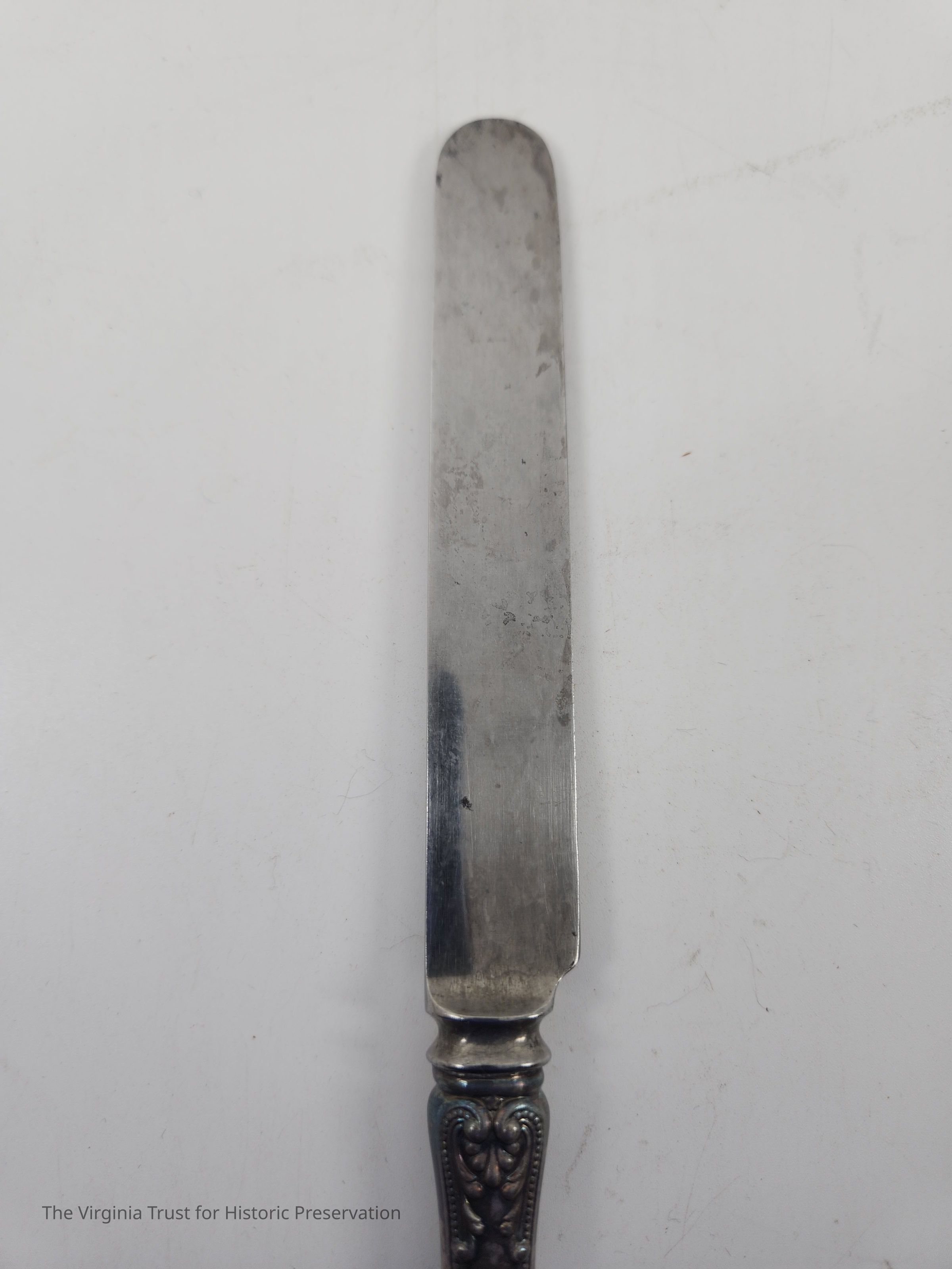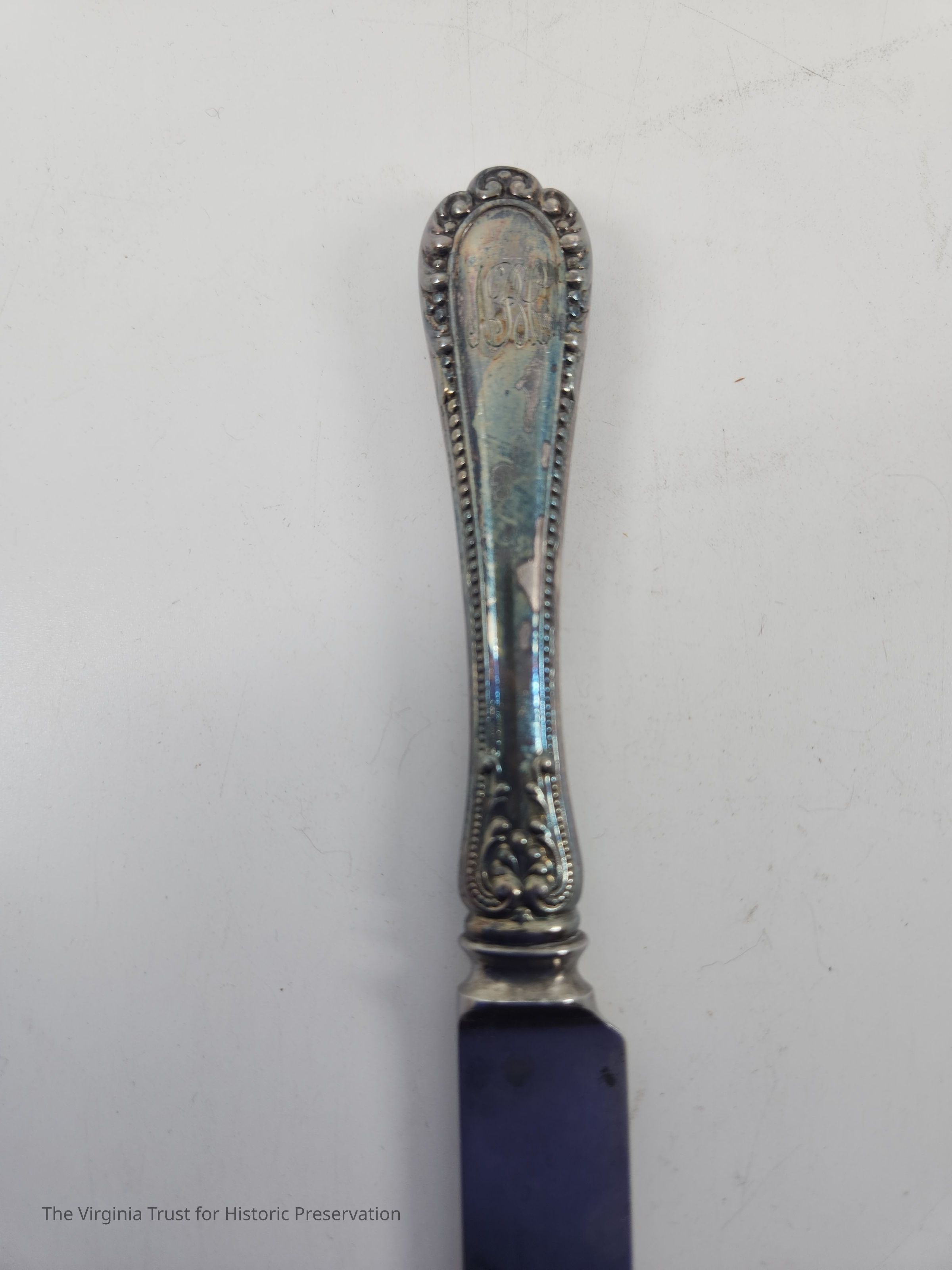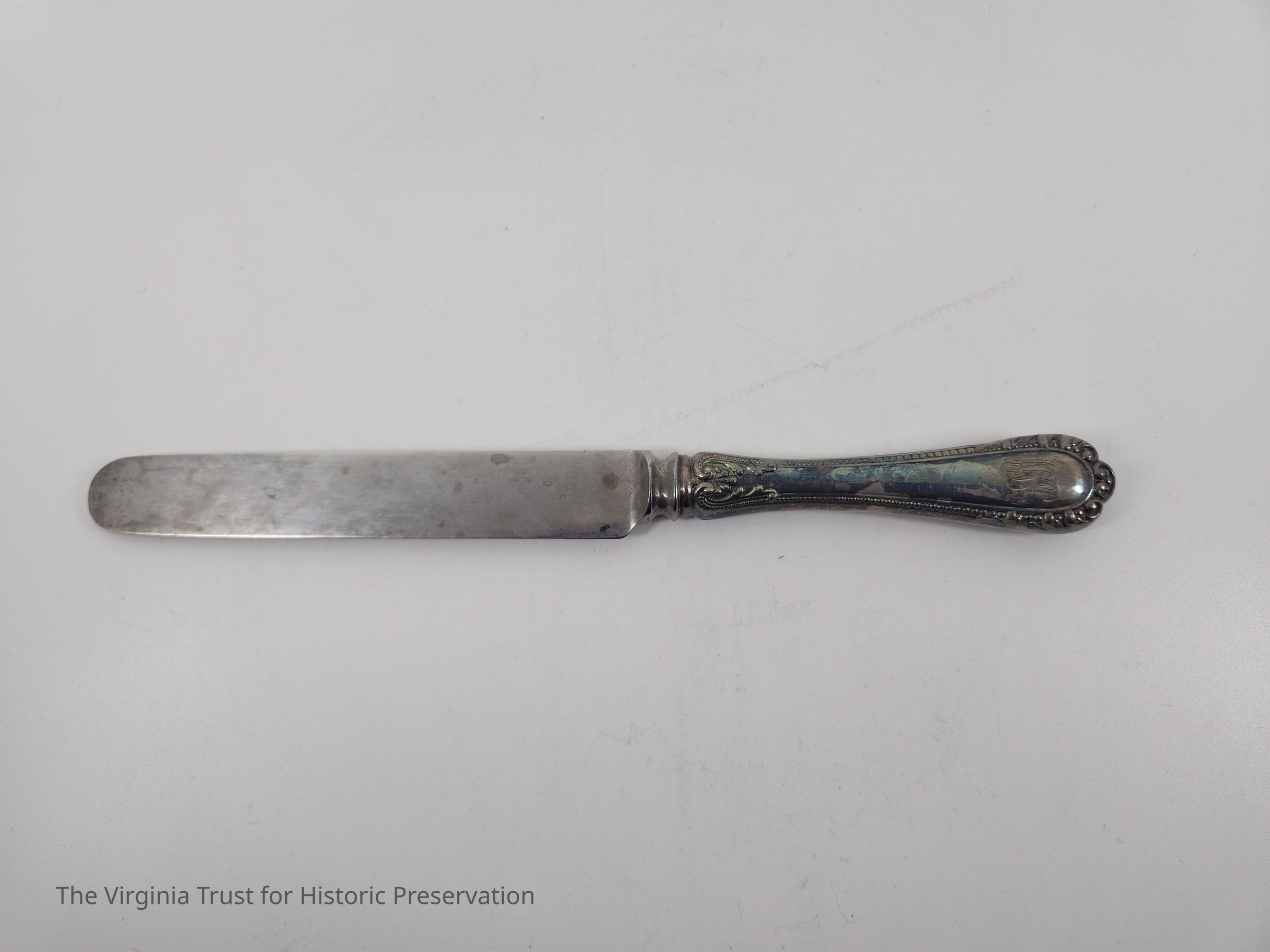 Part of a set of 12 heavy plate silver knives in the Gorham Manufacturing Company 1896 Winthrop pattern. Six knives (1986.107 A-F) monogrammed "NCR" and other six blunt blade knives monogrammed "NBC" (1986.107 G-L). Four have stainless steel blades that were put in in February of 1981 and eight have their original steel blades.Dimensions