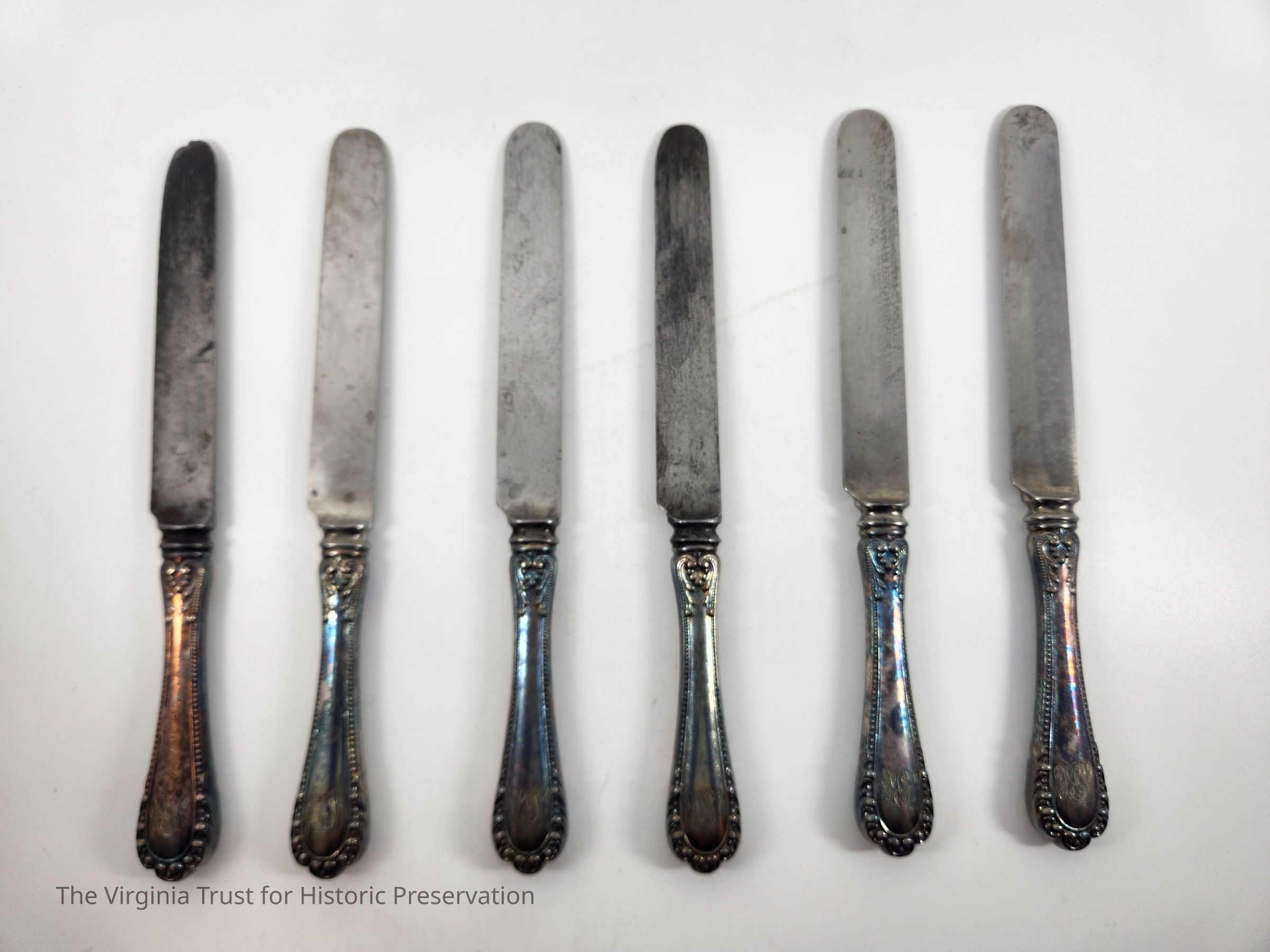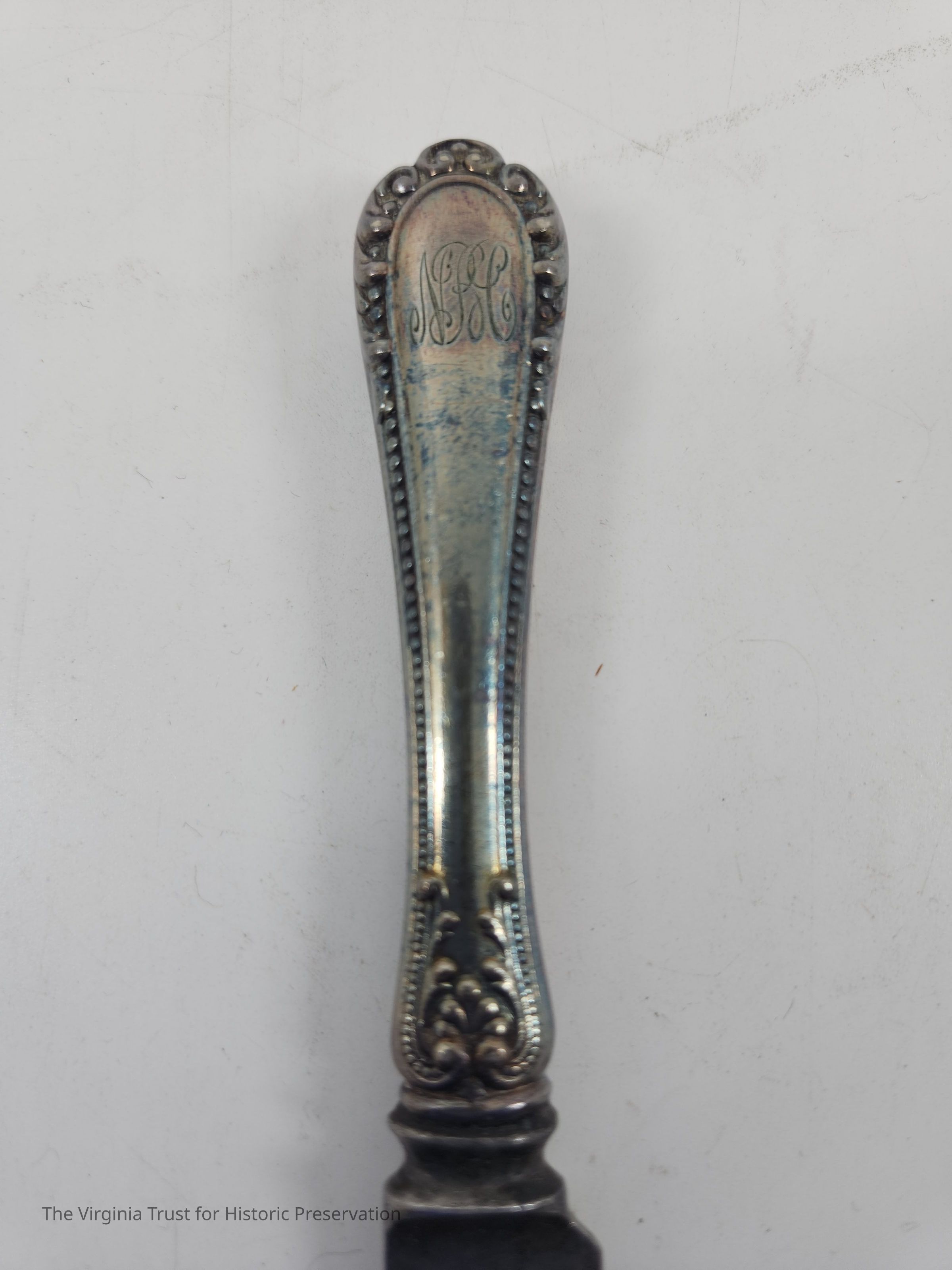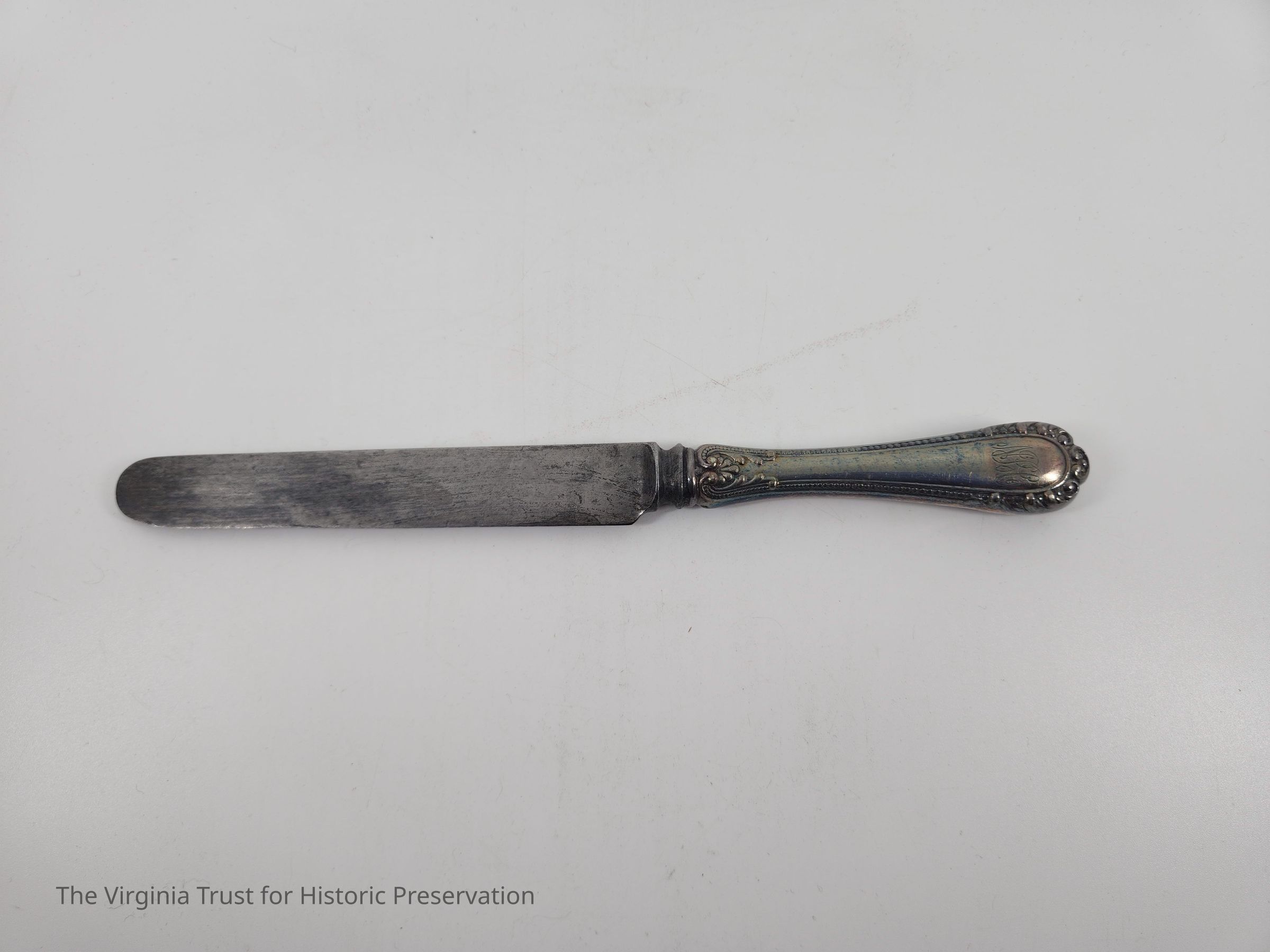 Part of a set of 12 heavy plate silver knives in the Gorham Manufacturing Company 1896 Winthrop pattern. Six knives (1986.107 A-F) monogrammed "NCR" and other six blunt blade knives monogrammed "NBC" (1986.107 G-L). Four have stainless steel blades that were put in in February of 1981 and eight have their original steel blades.Dimensions