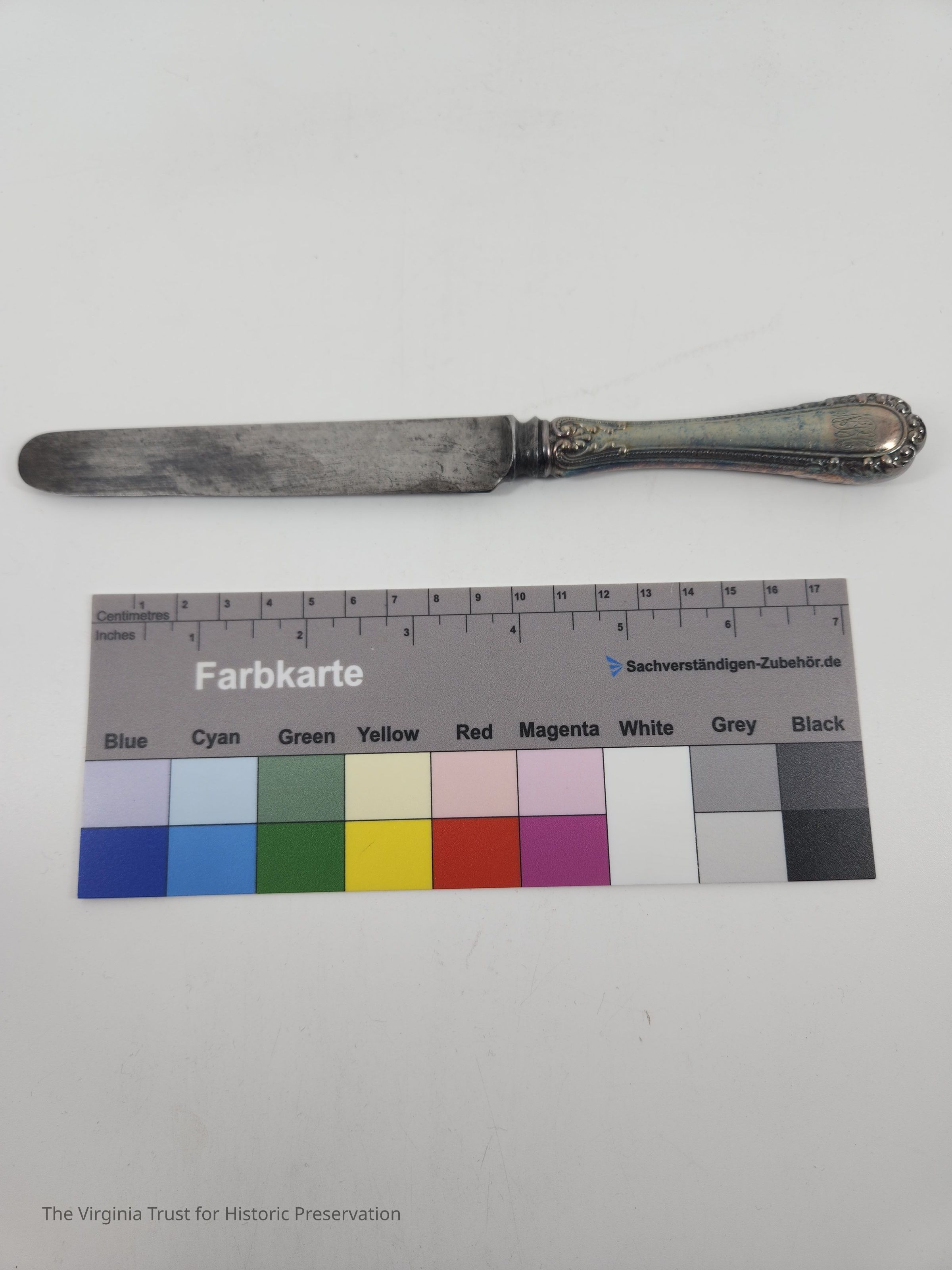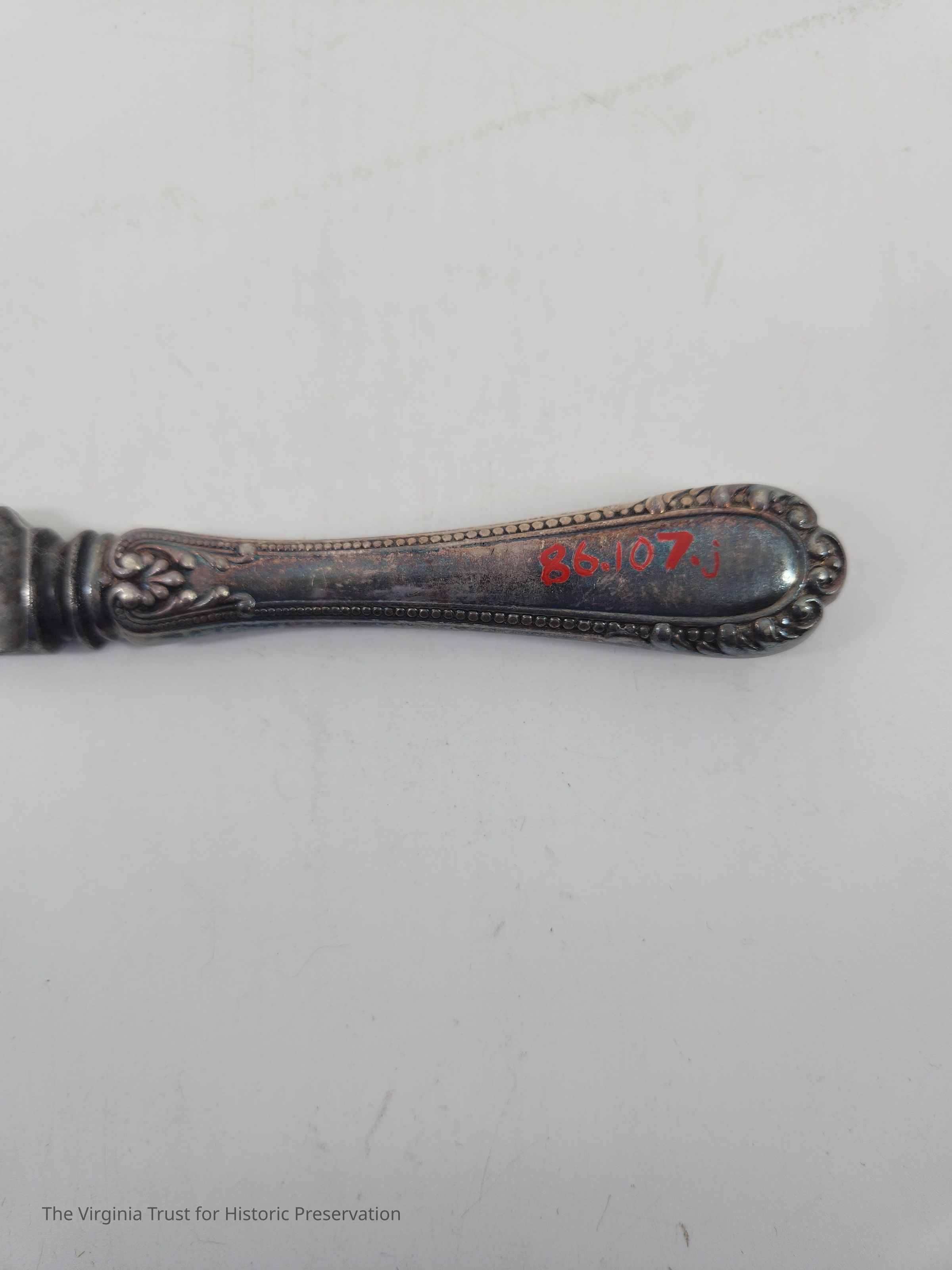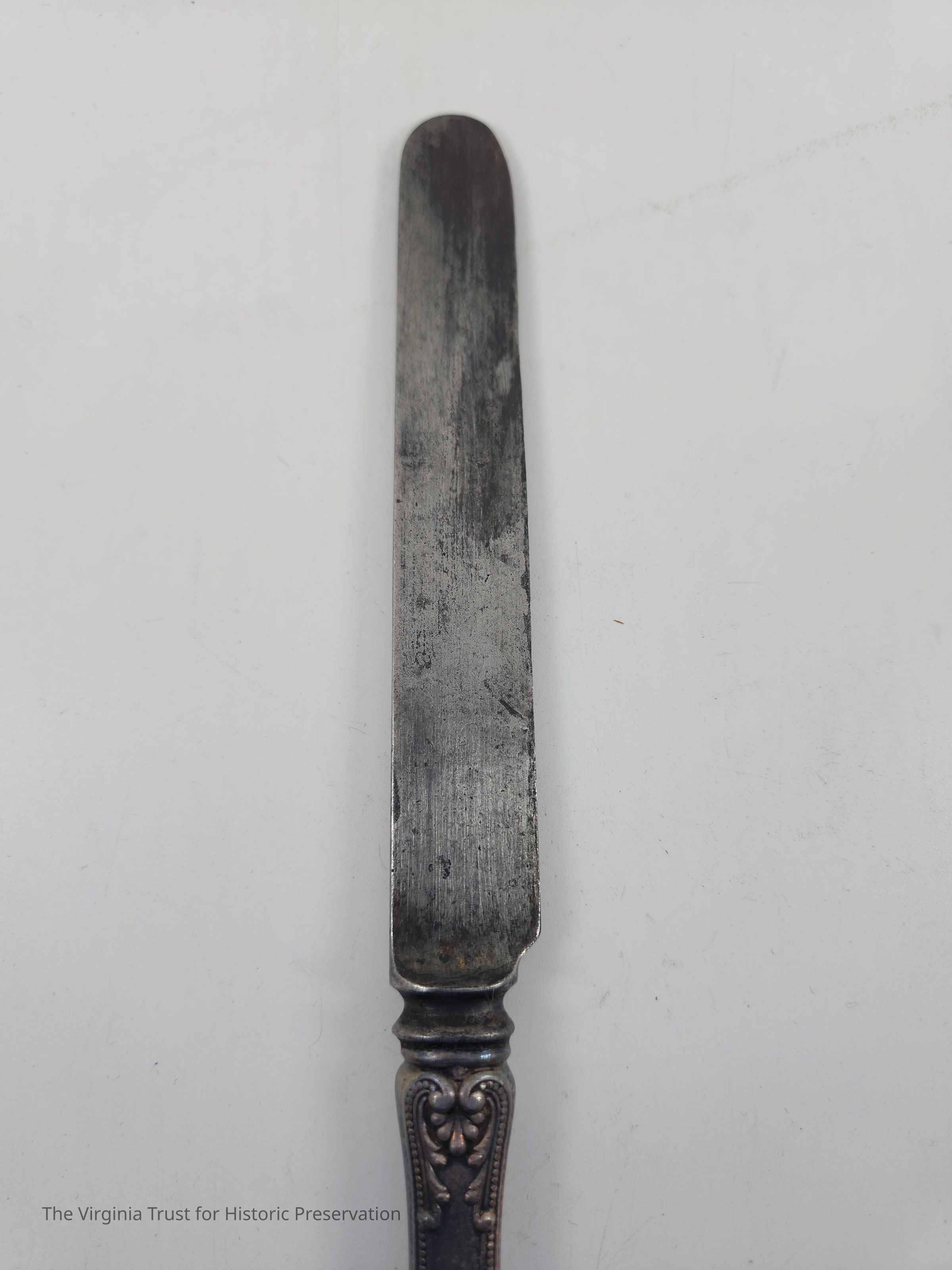 Part of a set of 12 heavy plate silver knives in the Gorham Manufacturing Company 1896 Winthrop pattern. Six knives (1986.107 A-F) monogrammed "NCR" and other six blunt blade knives monogrammed "NBC" (1986.107 G-L). Four have stainless steel blades that were put in in February of 1981 and eight have their original steel blades.Dimensions