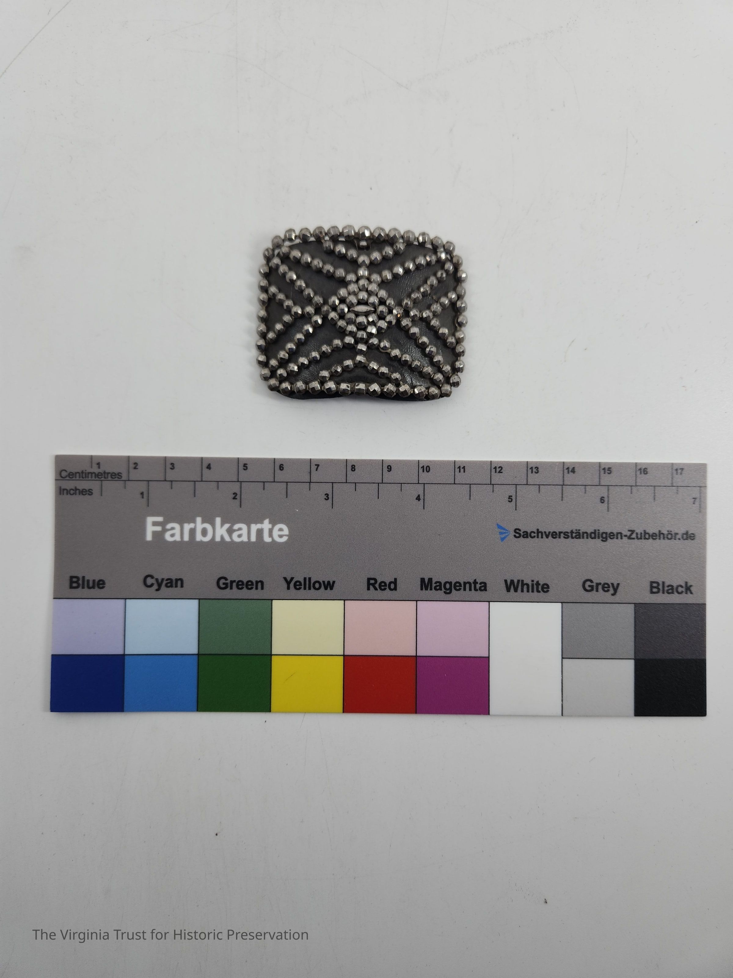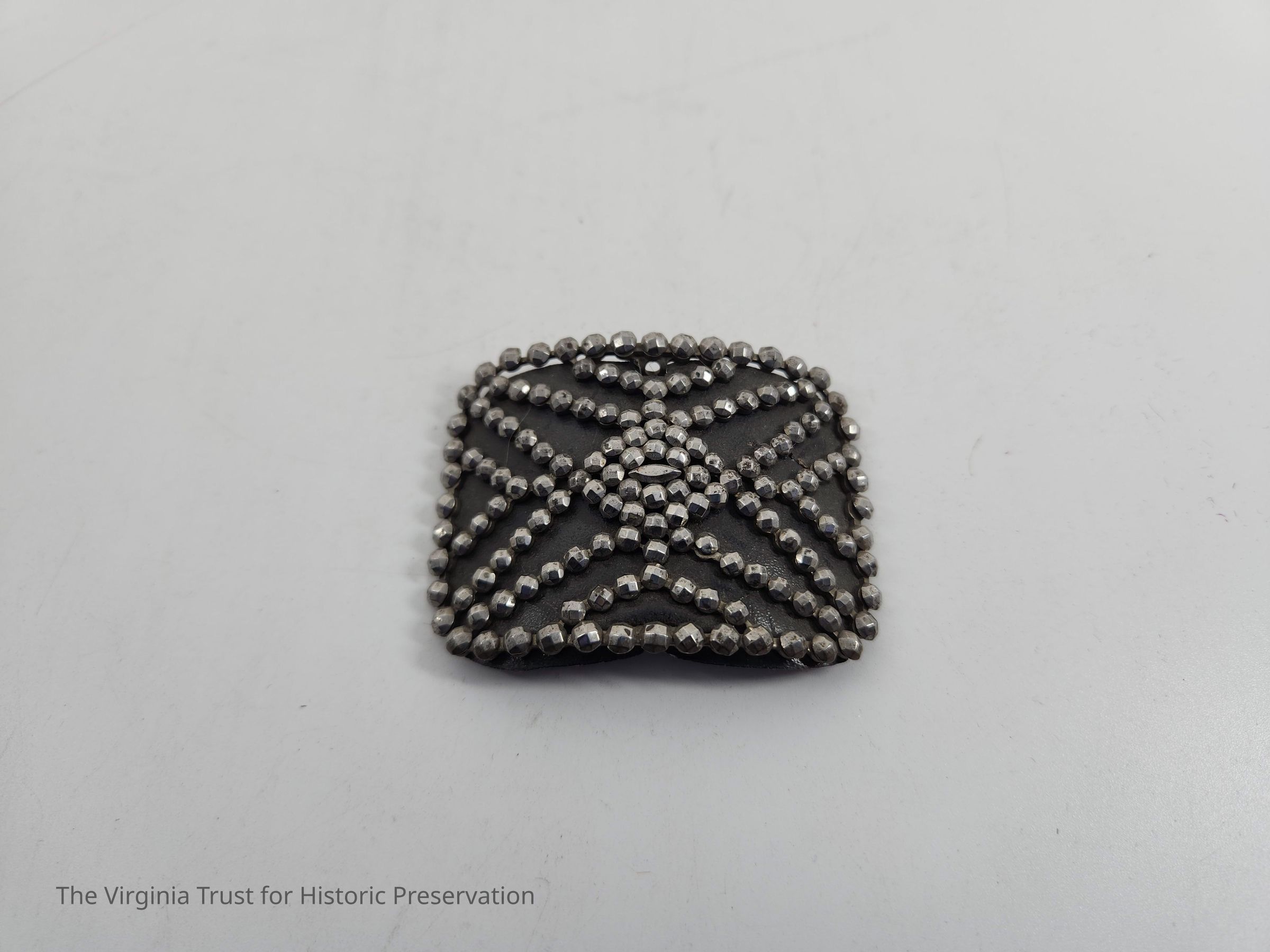 One of a pair of ladies' shoe buckles, made of black leather and an iron trim