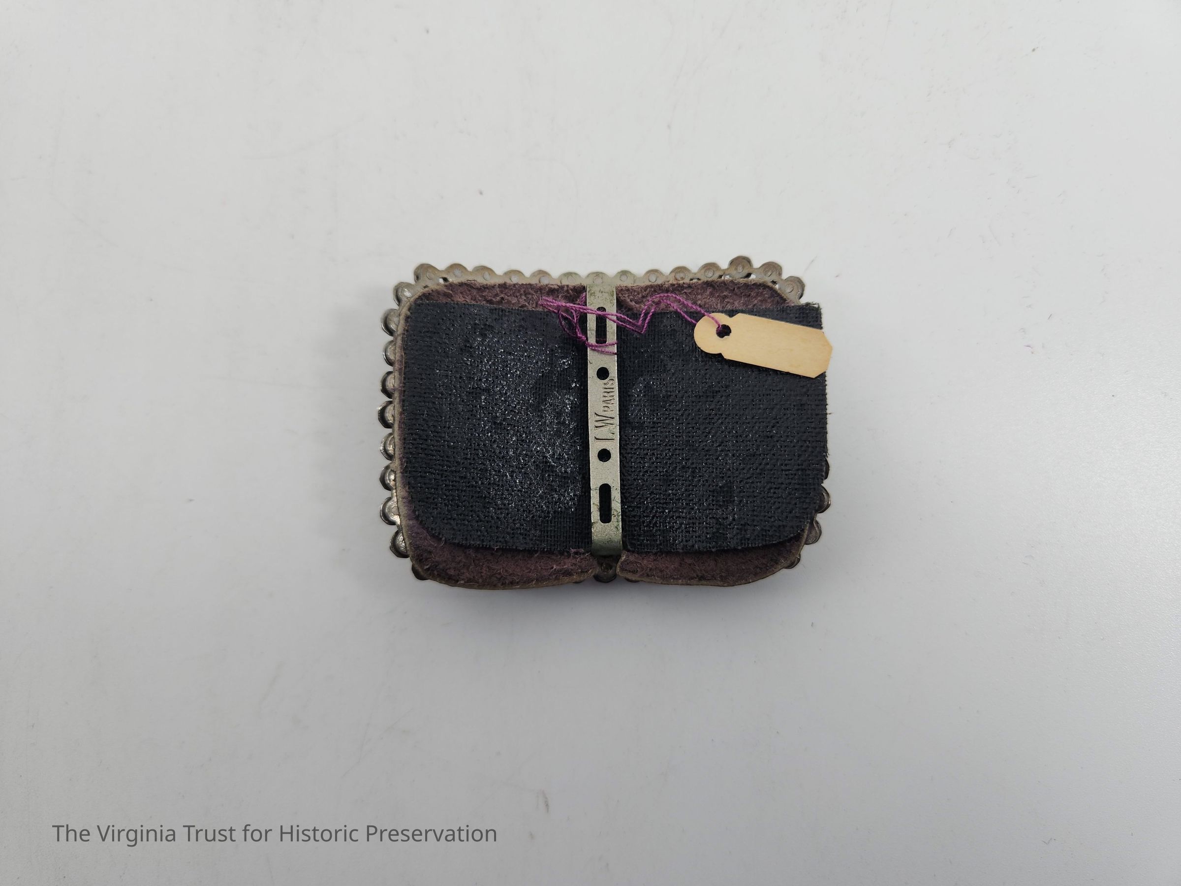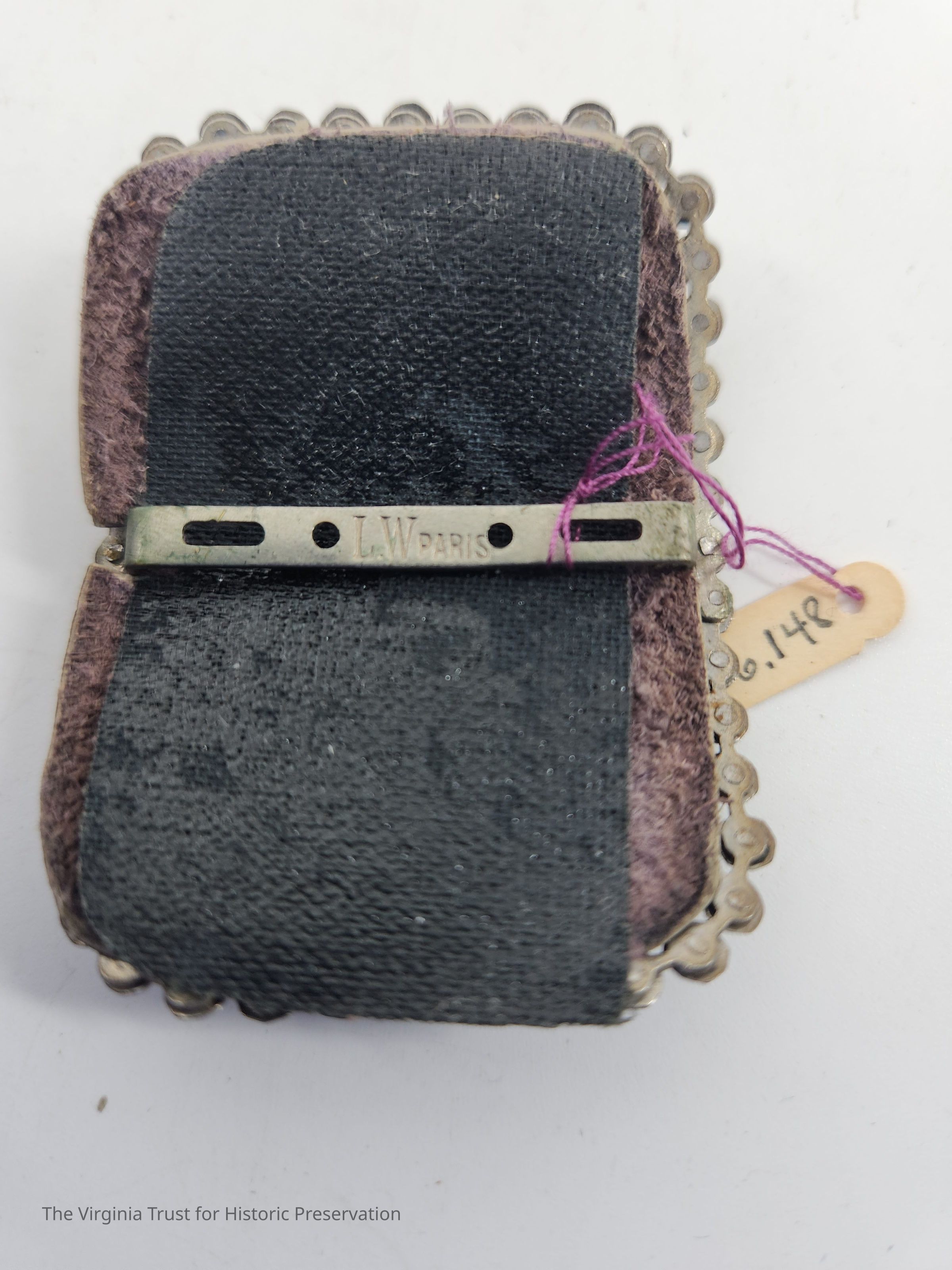 Pair of ladies shoe buckles. Black leather and cut iron trim. Marked "LW PARIS."