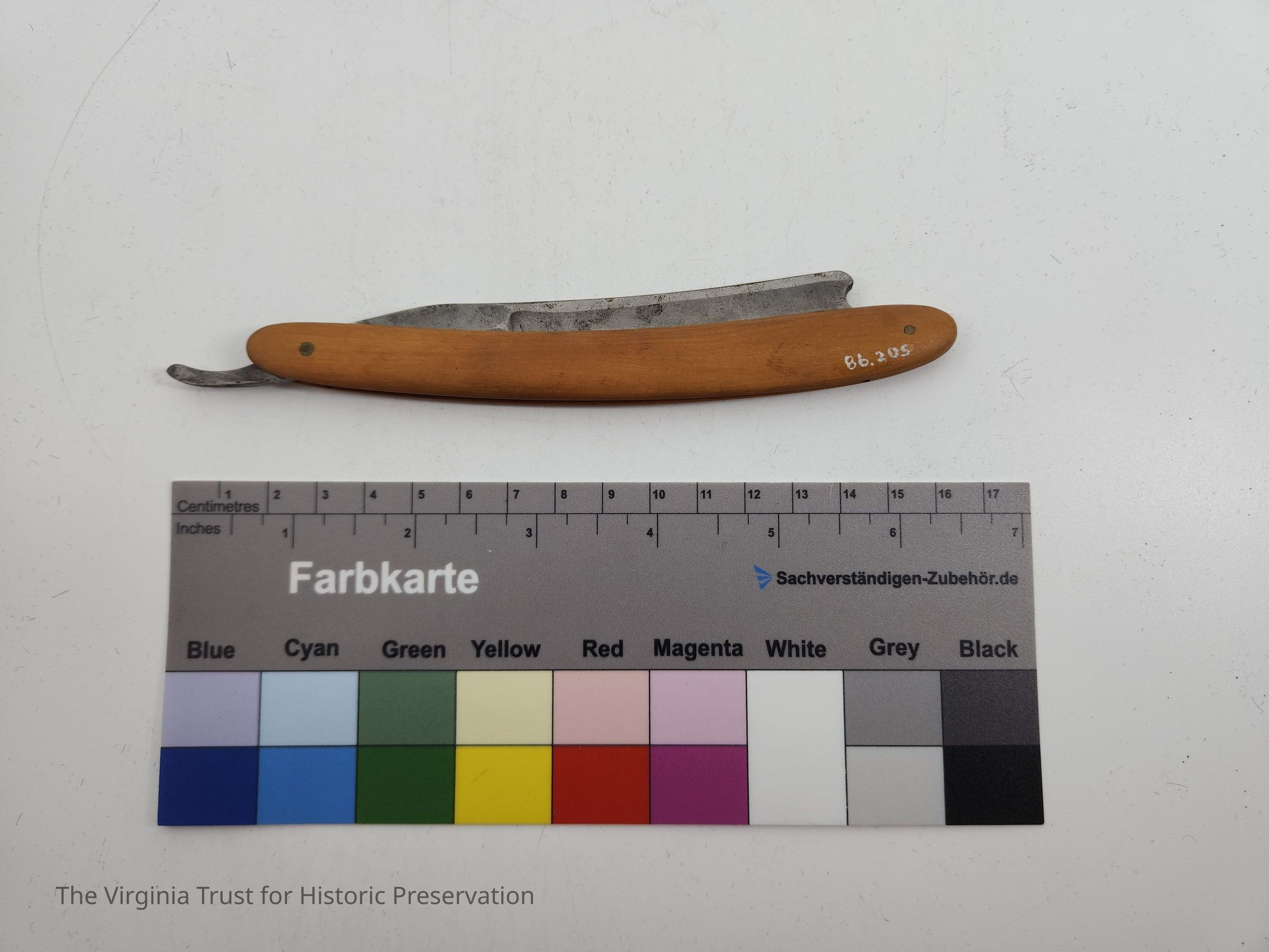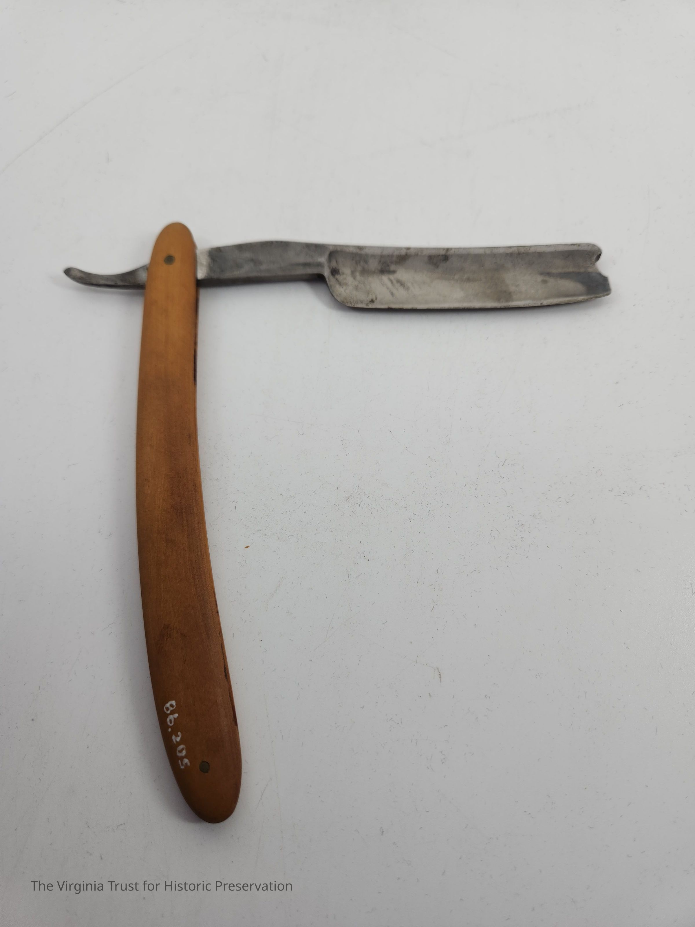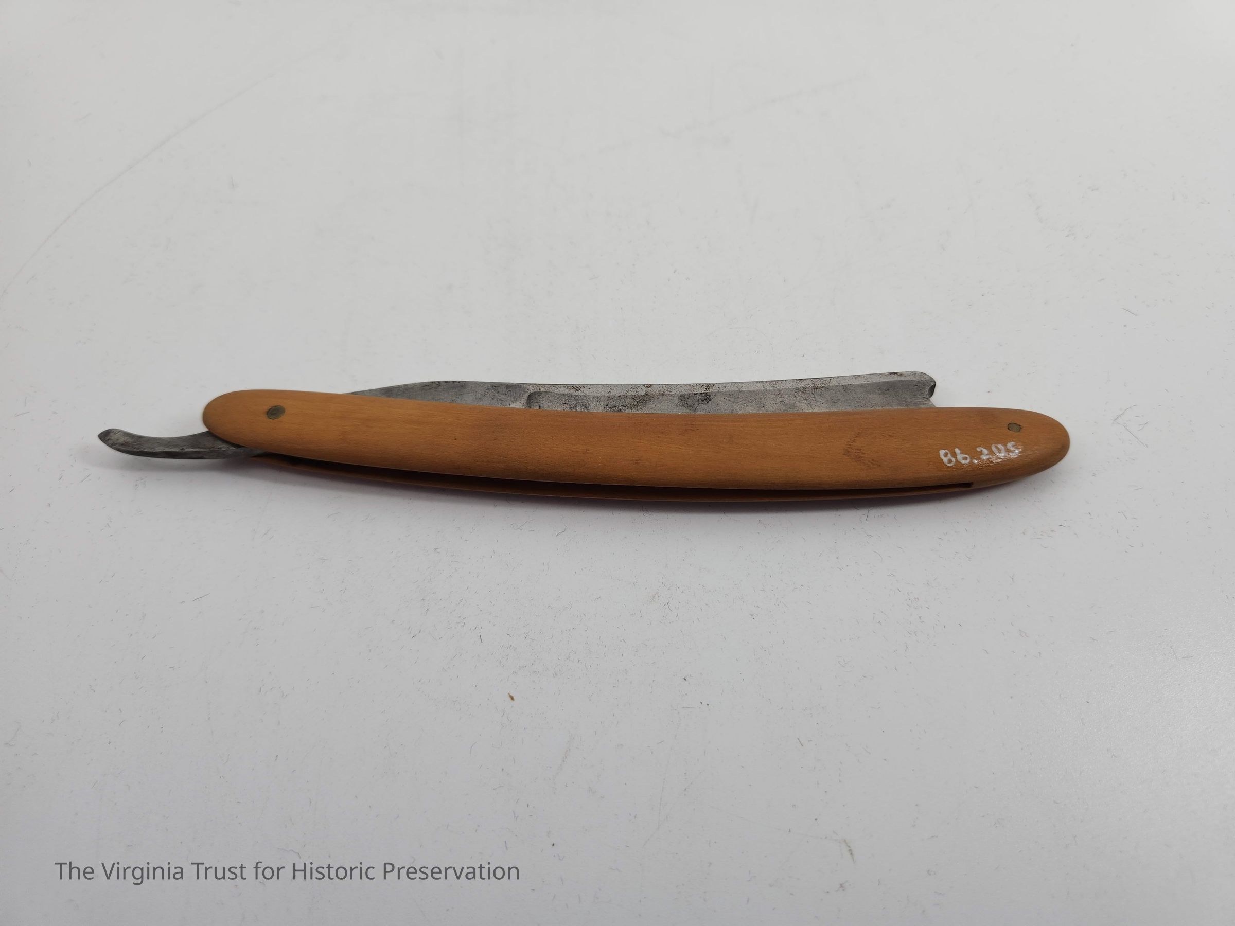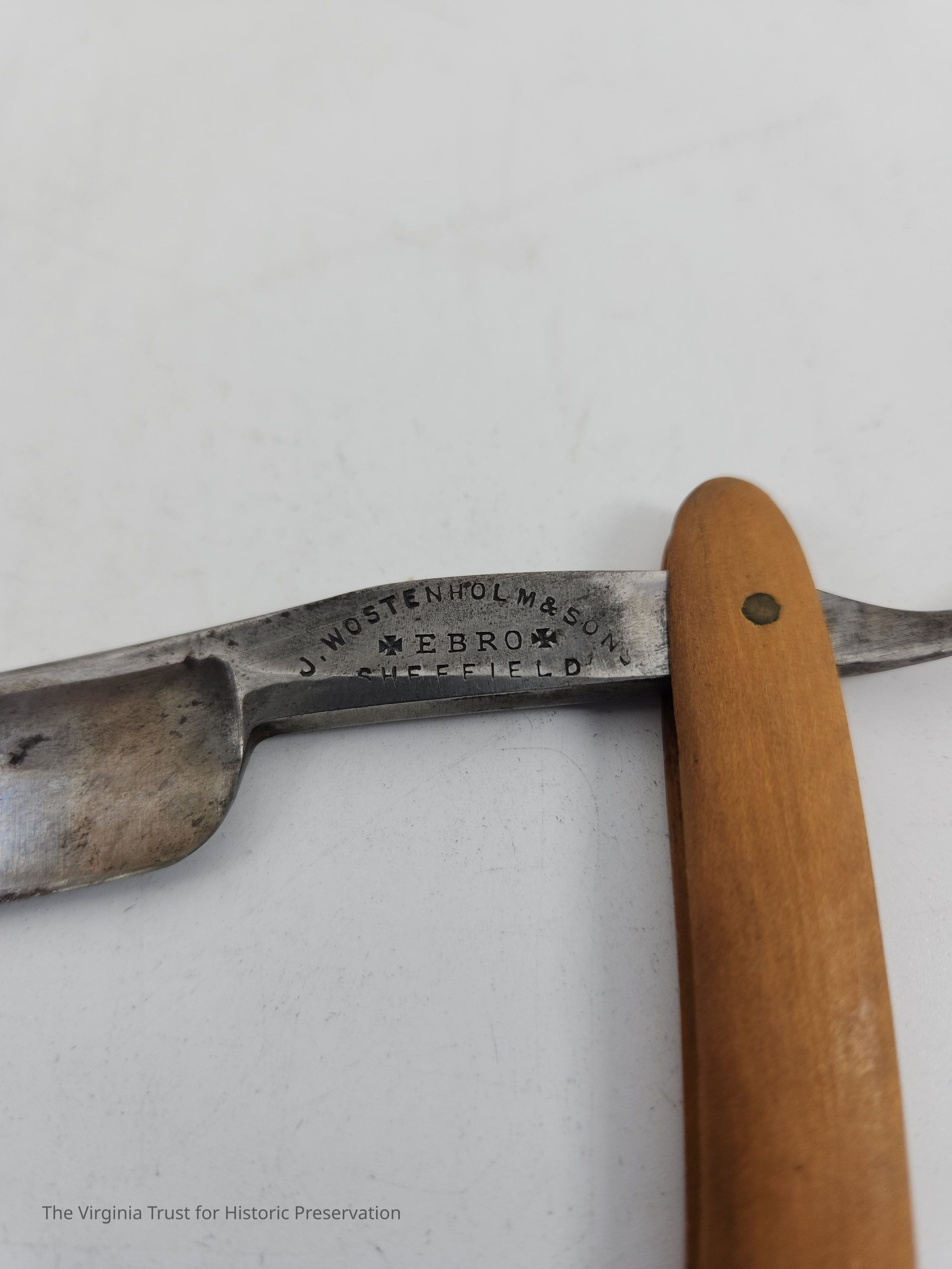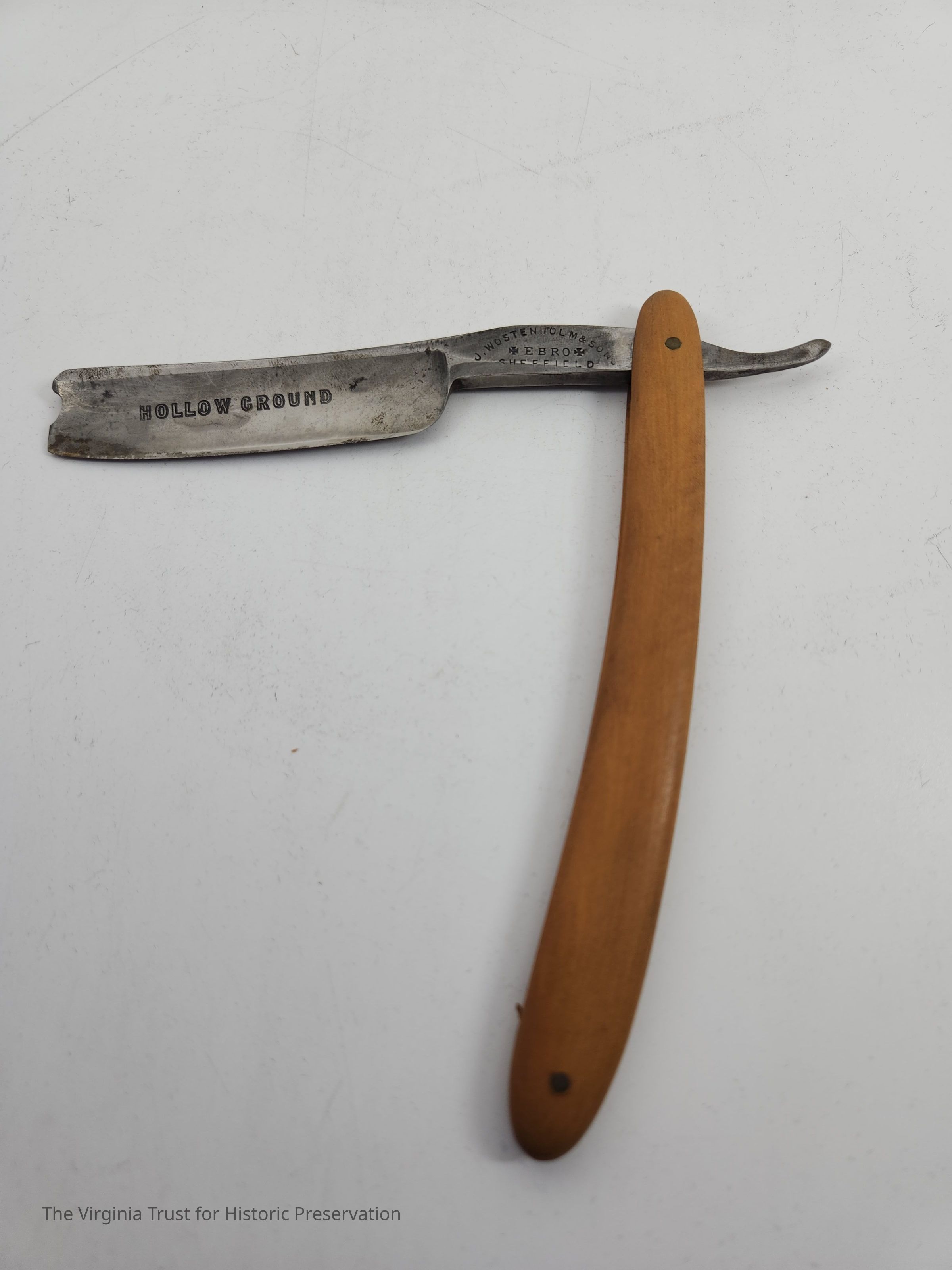 1 razor with wood case marked "Sheffield, J. Wostenholm & Sons." Labeled "Hollow Ground."