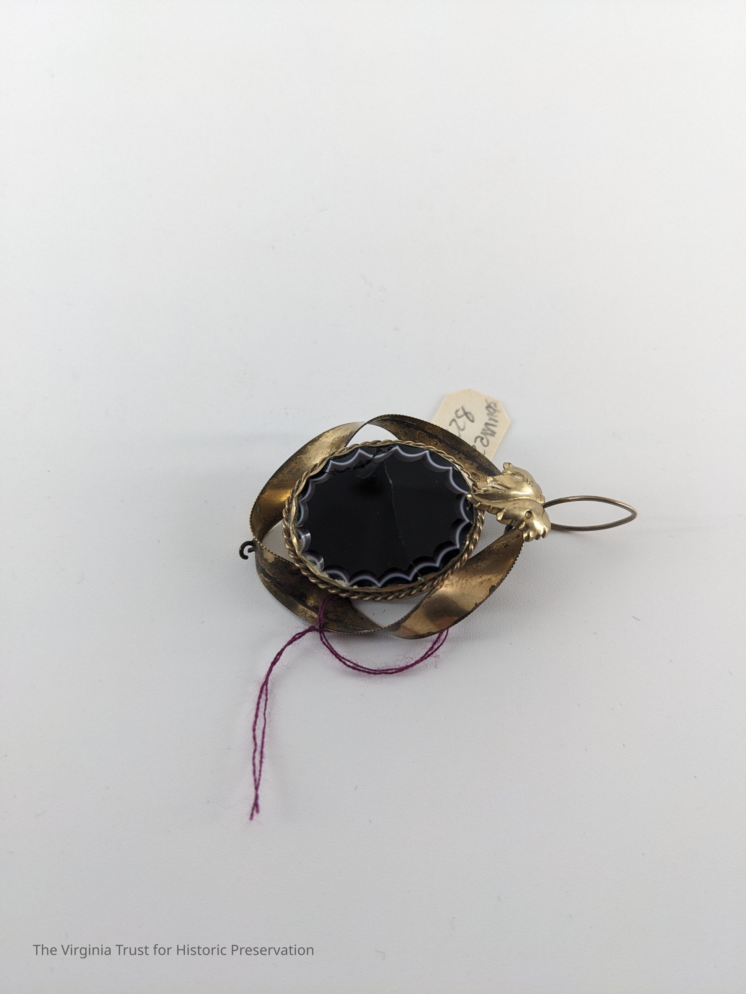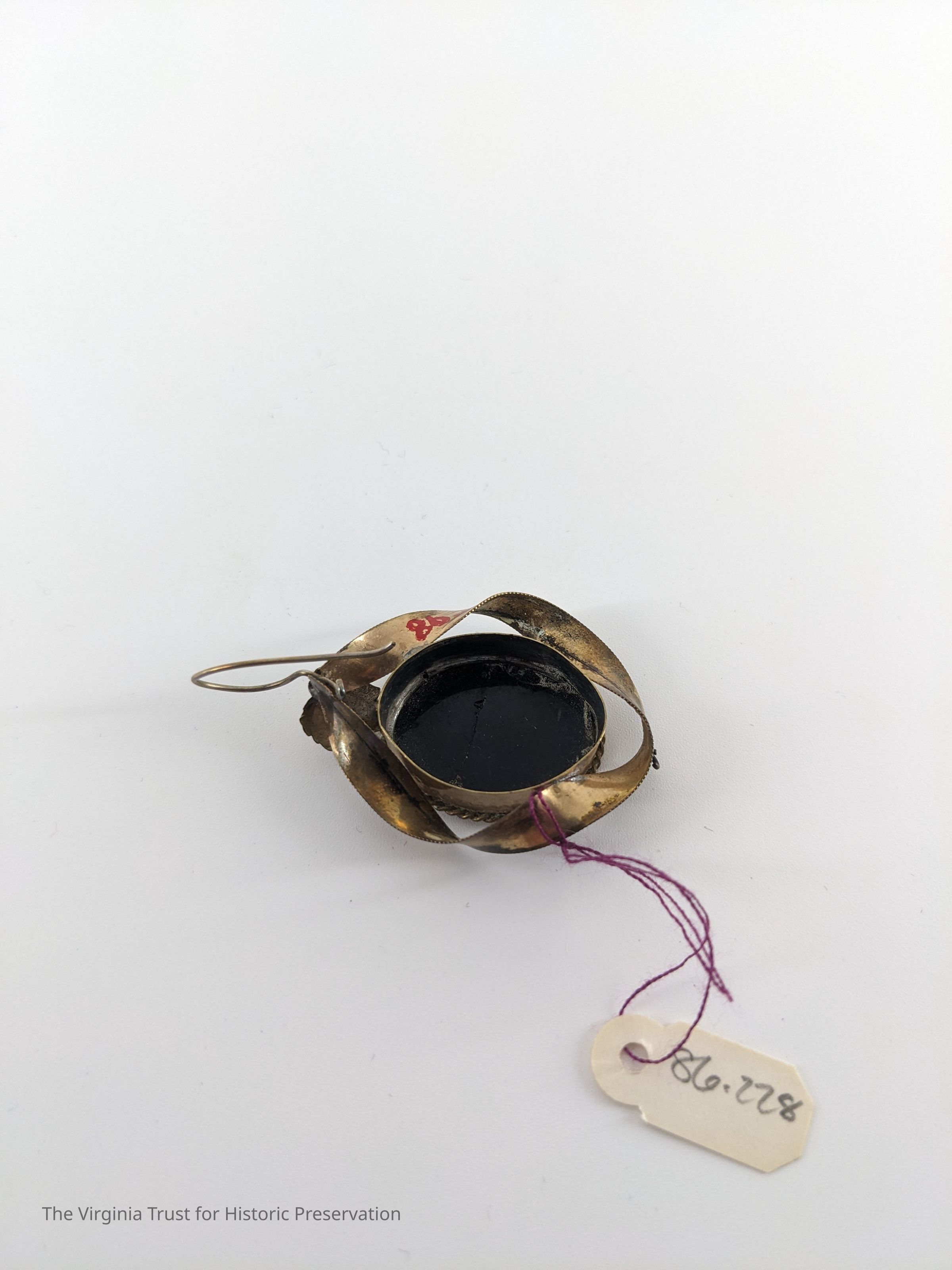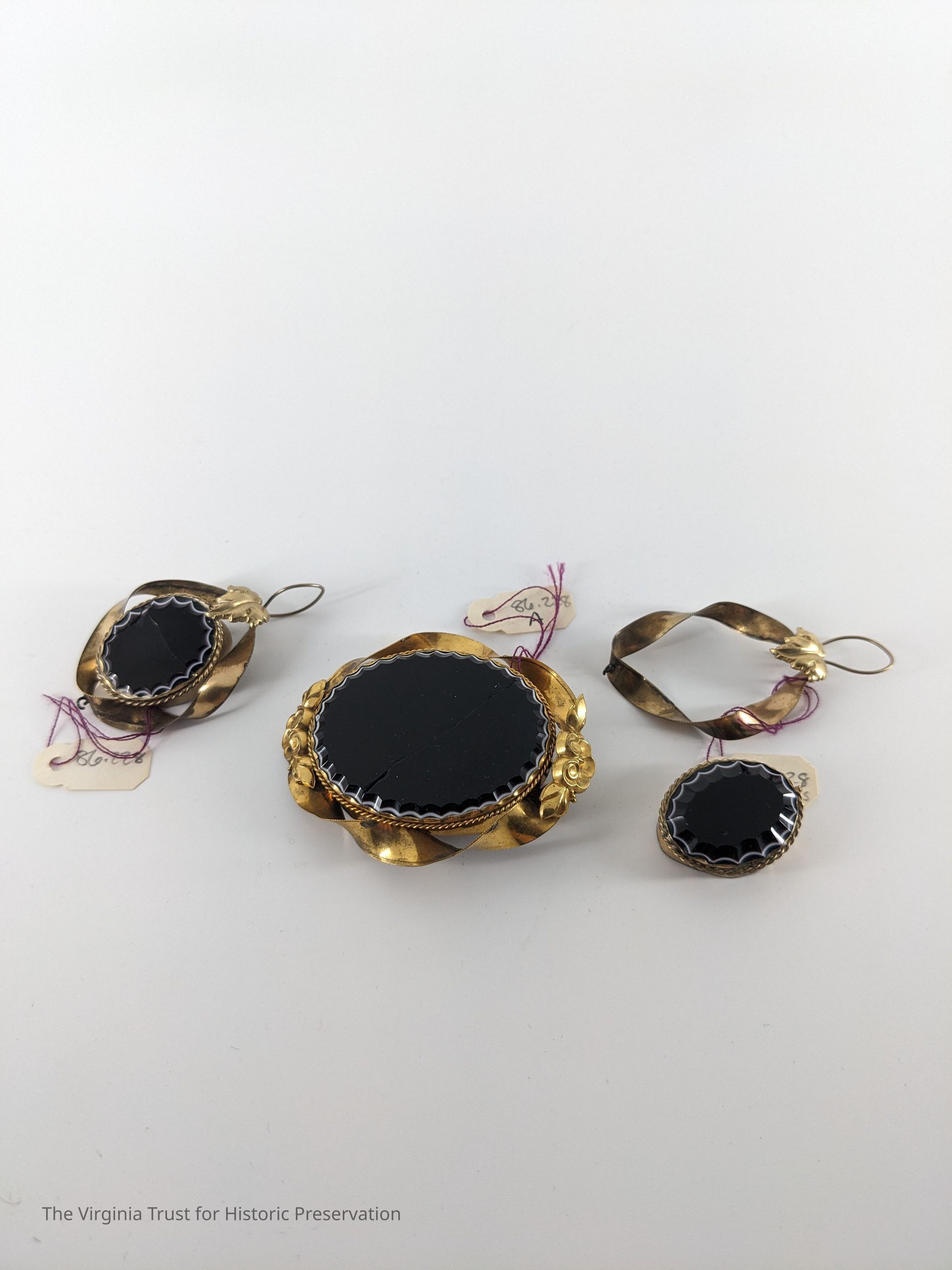 Pair of earrings for pierced ears. Twisted gold setting with black oval stones in center.