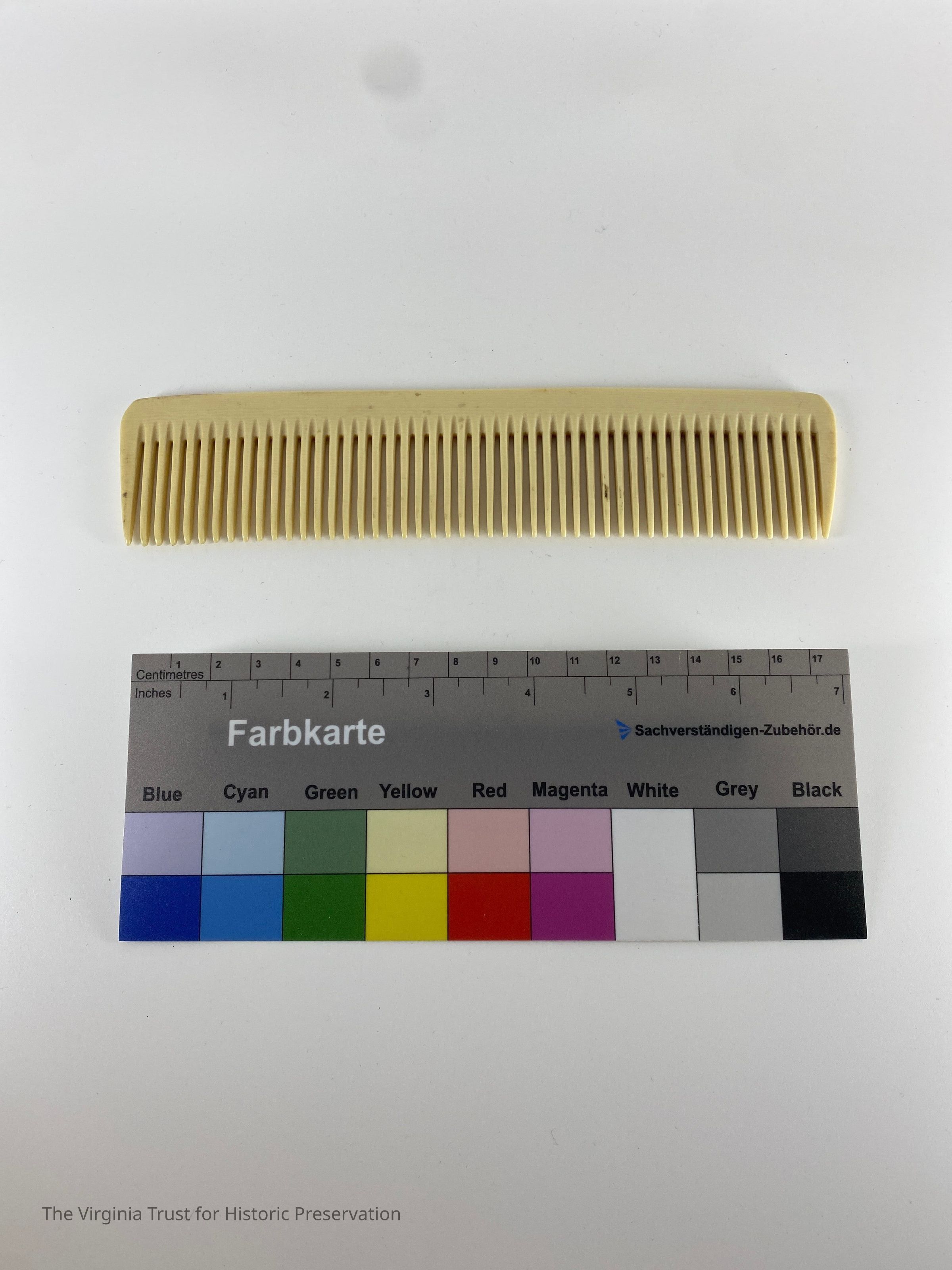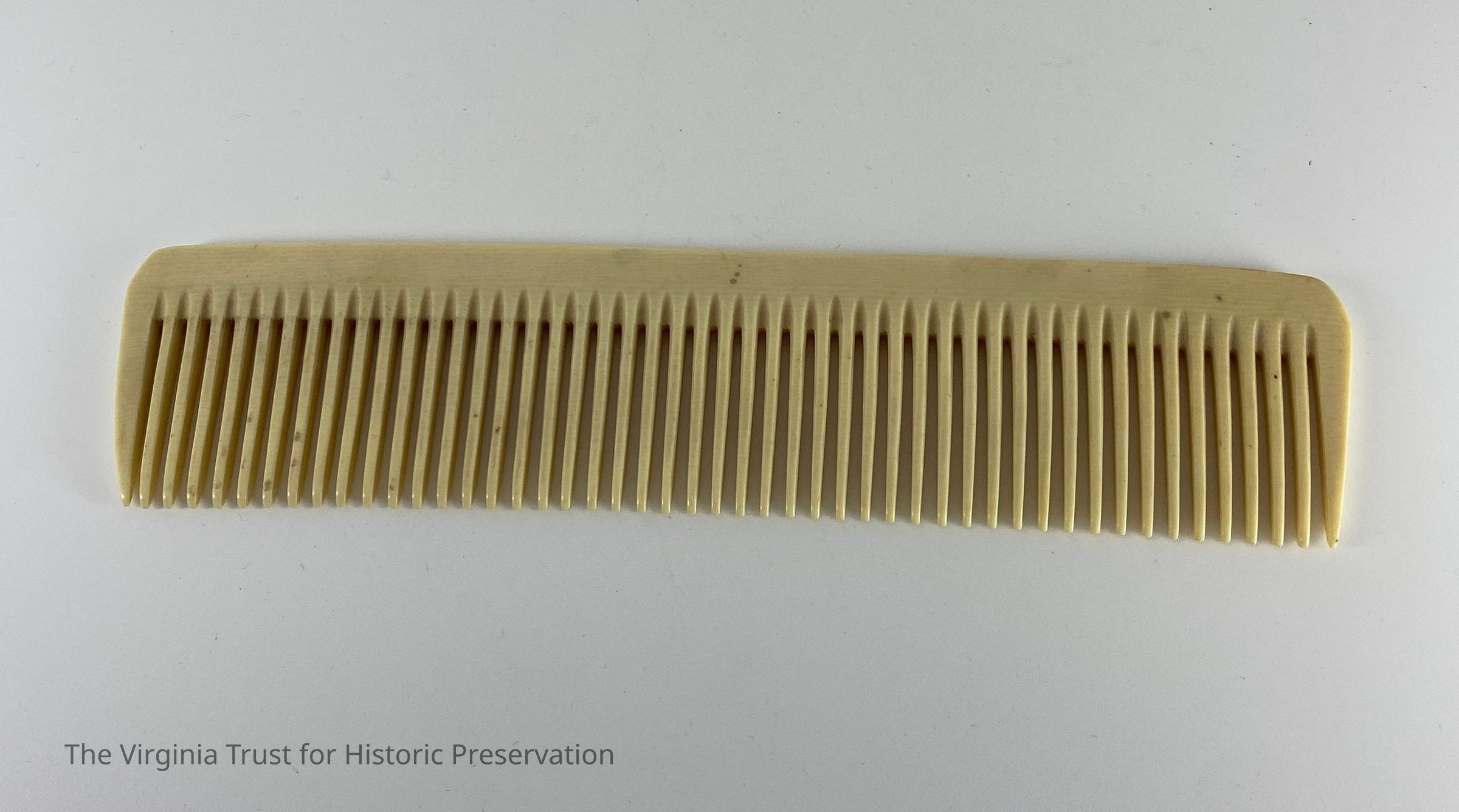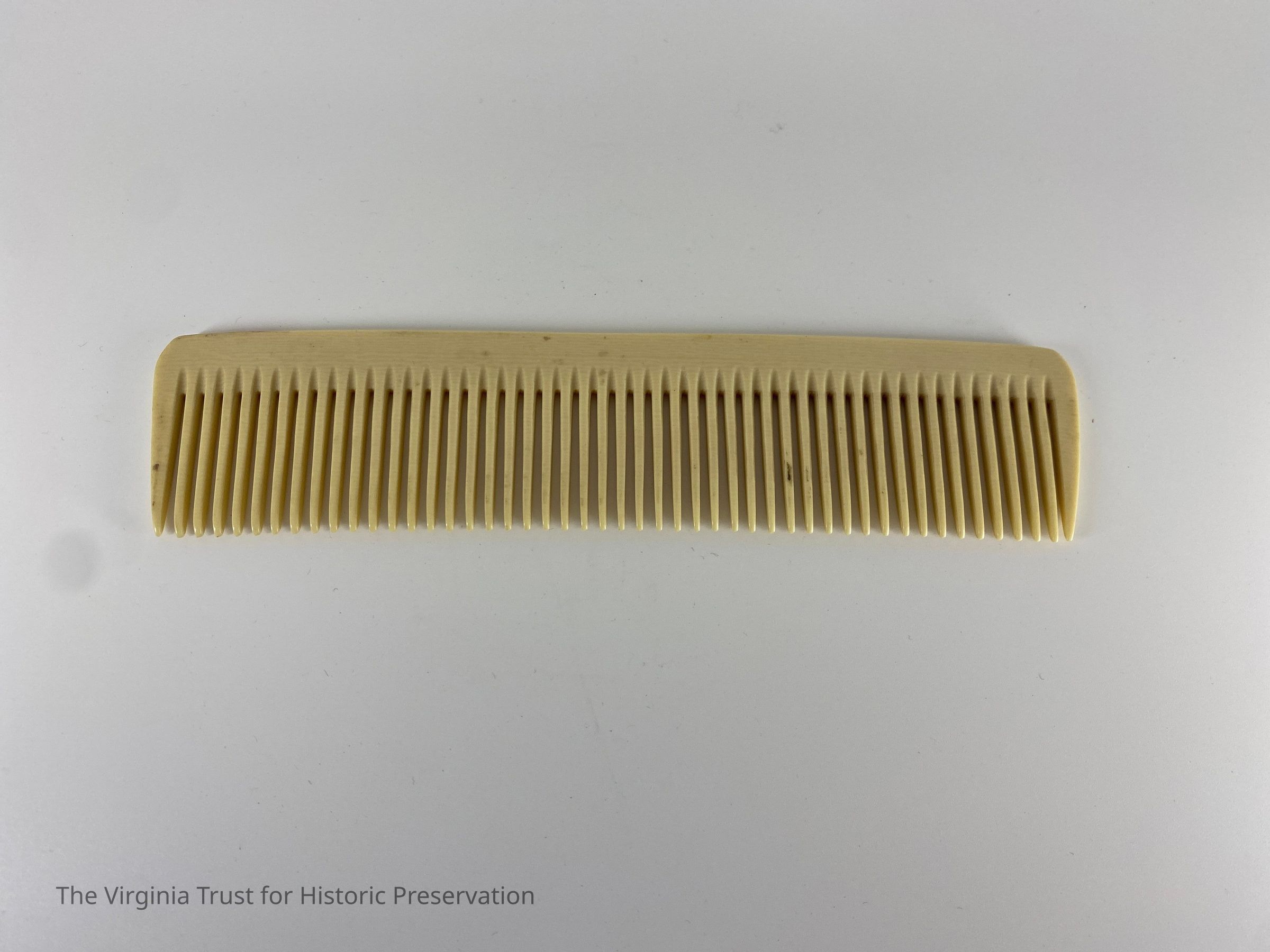 Ivory colored dresser set consisting of brush, comb, mirror, button (or corset) hook and nail implements. Nail implements unidentified and unmarked. Brush says "Ivory Pyralin DuBary."