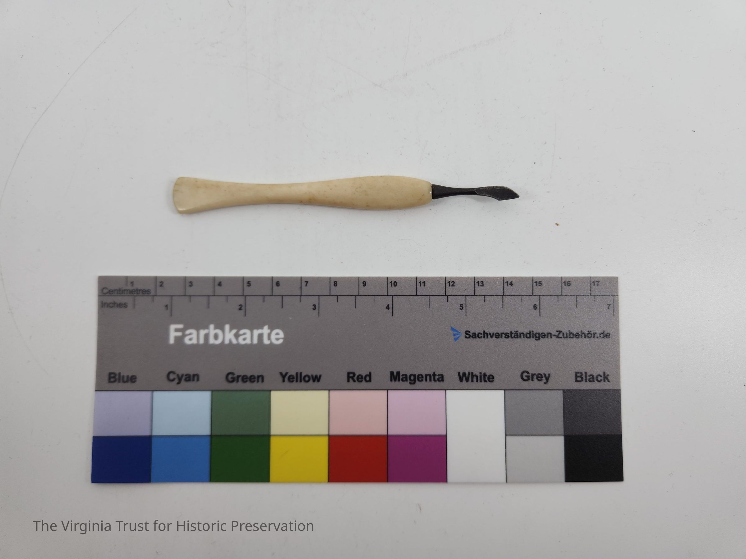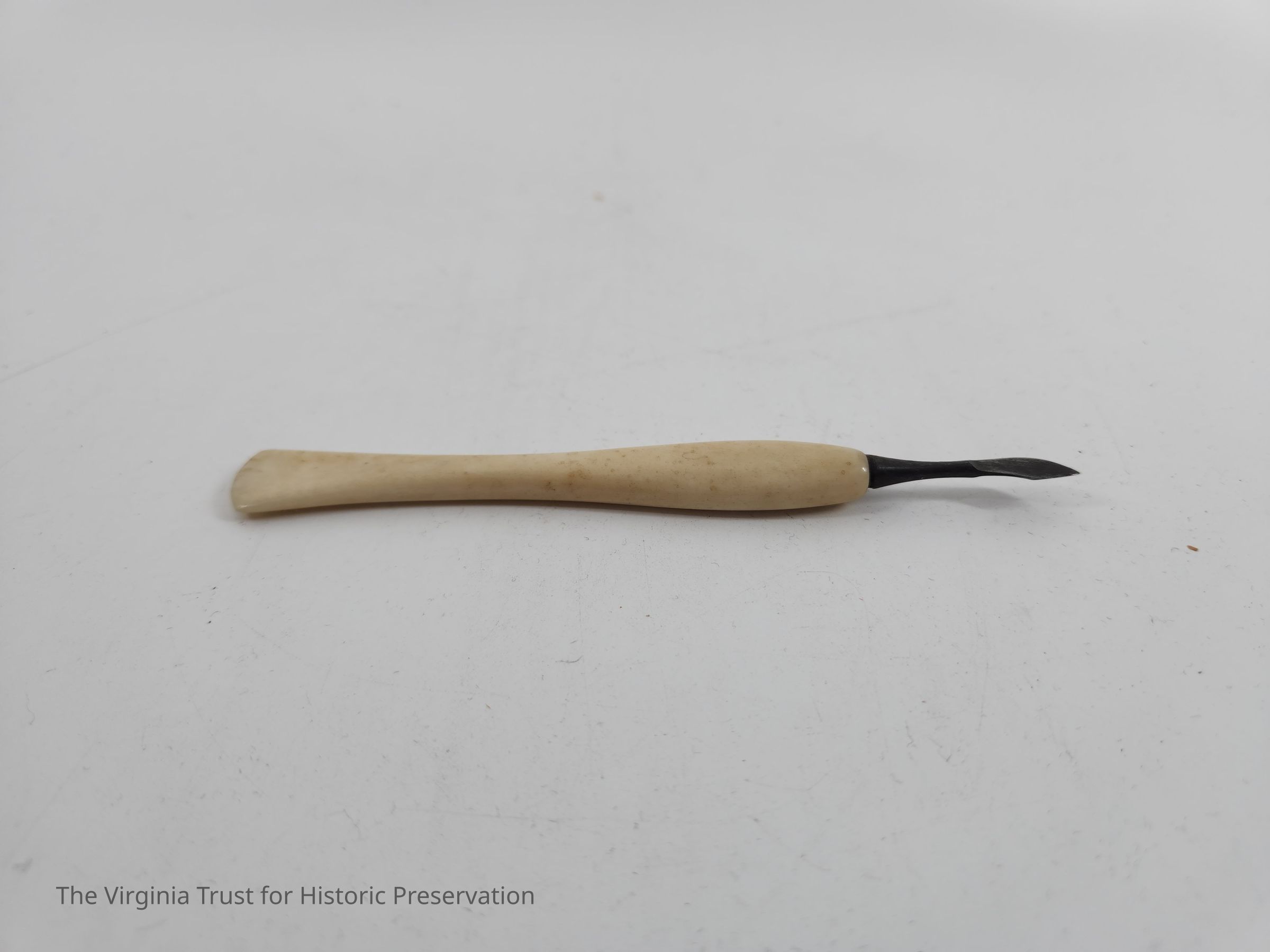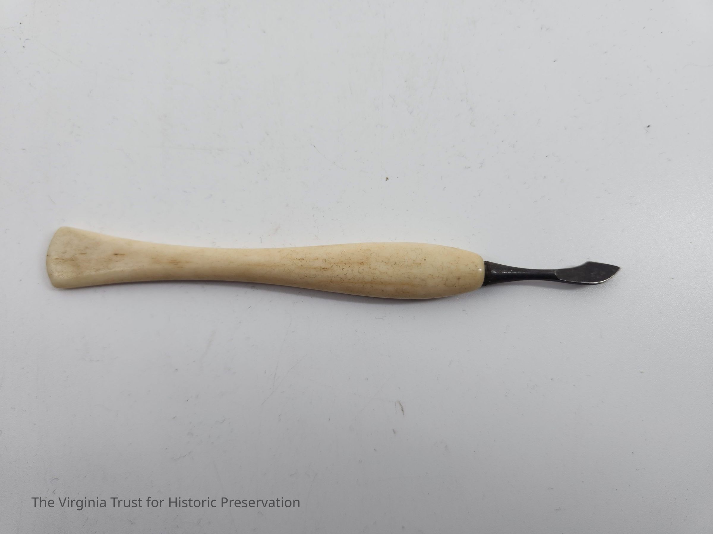 Ivory colored dresser set consisting of brush, comb, mirror, button (or corset) hook and nail implements. Nail implements unidentified and unmarked.