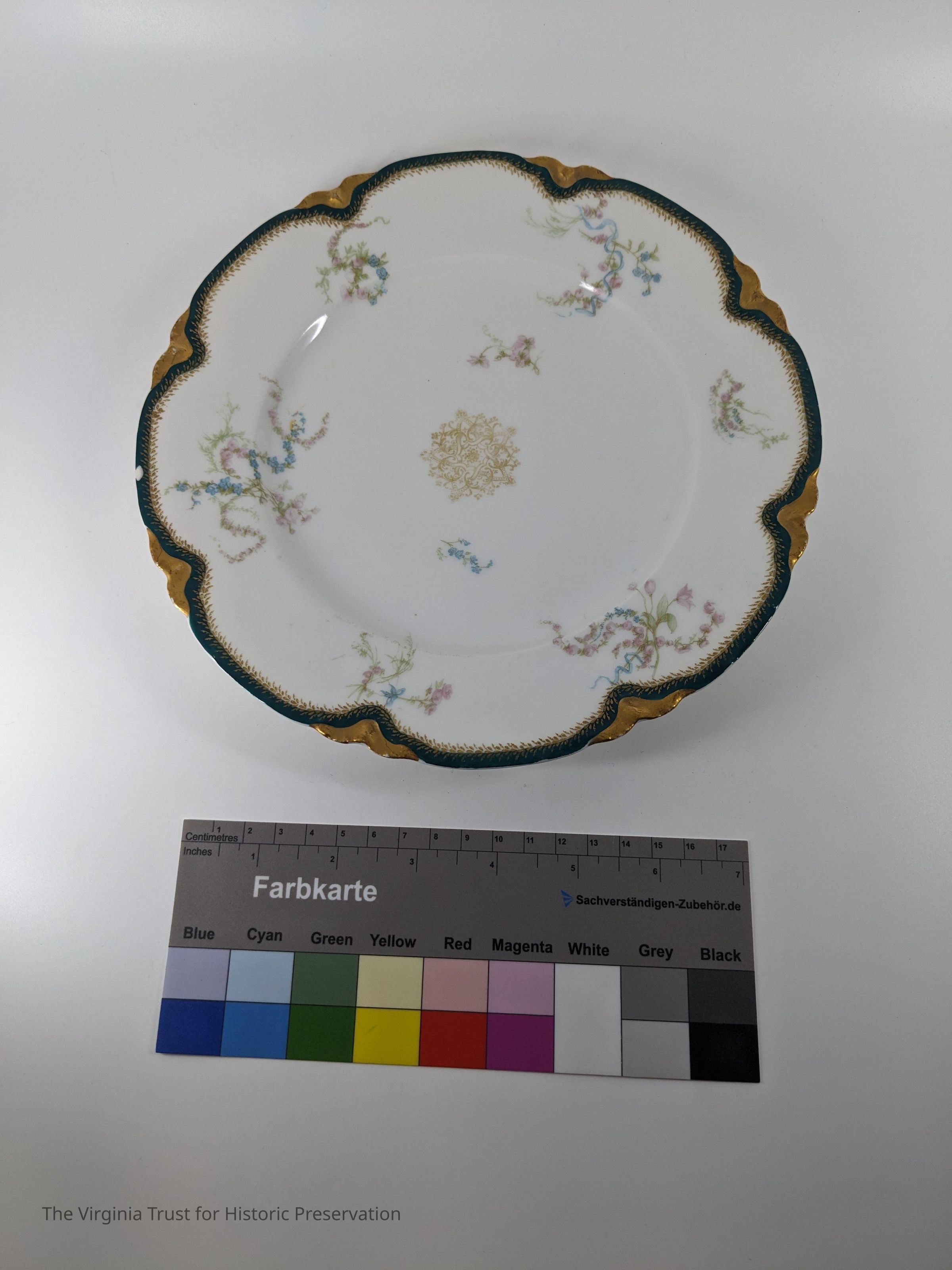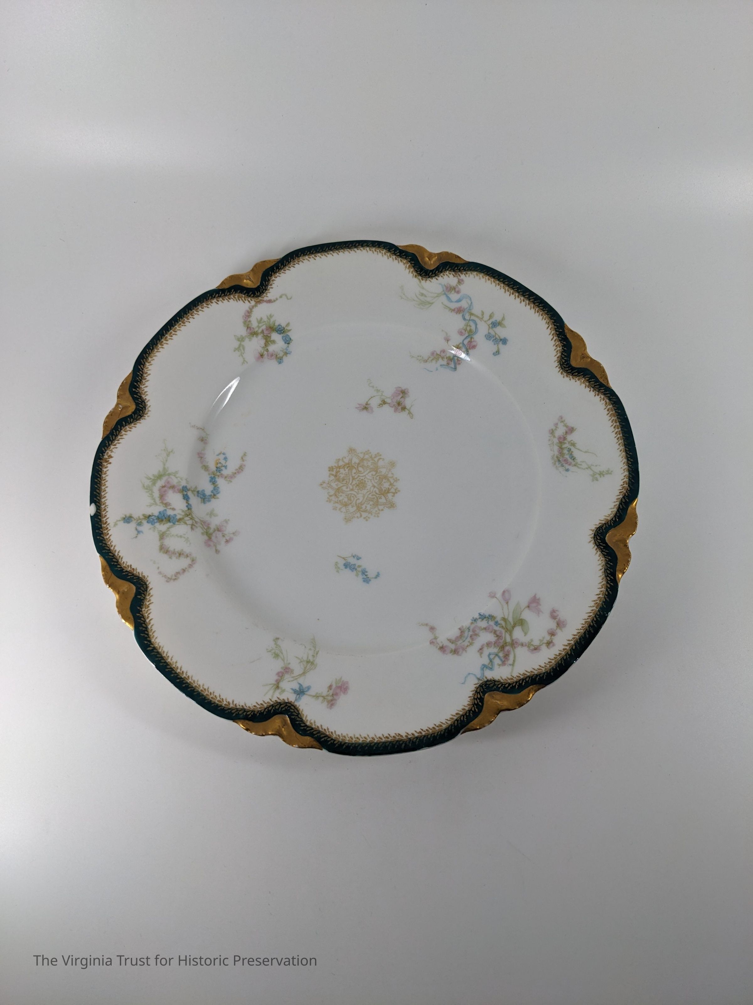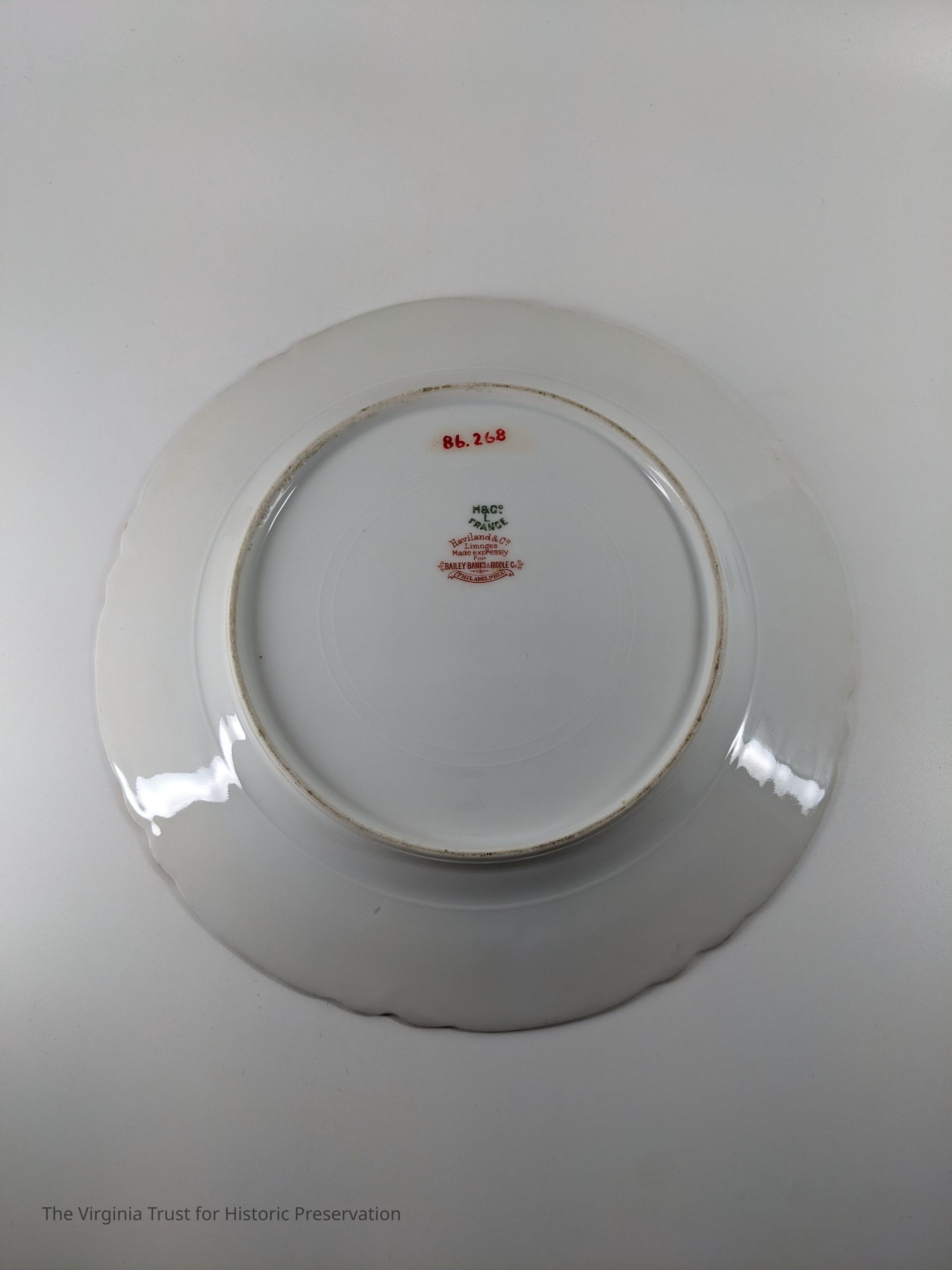 Eleven dessert plates with pale pattern of blue/green and gold. Marked "Haviland & Co. Limoges, Made for Bailey, Banks, and Biddle, Phil. H 7 Co. France."