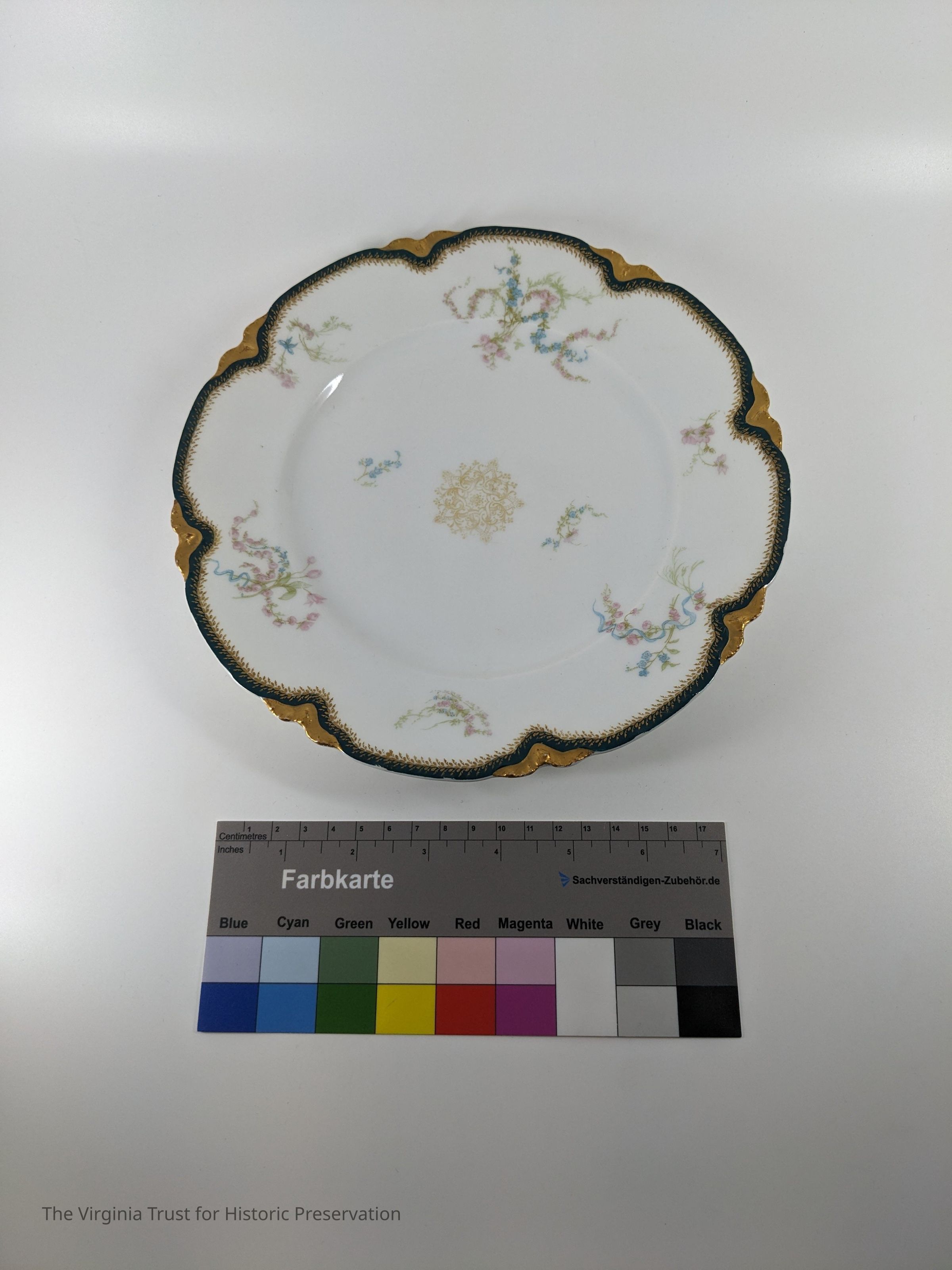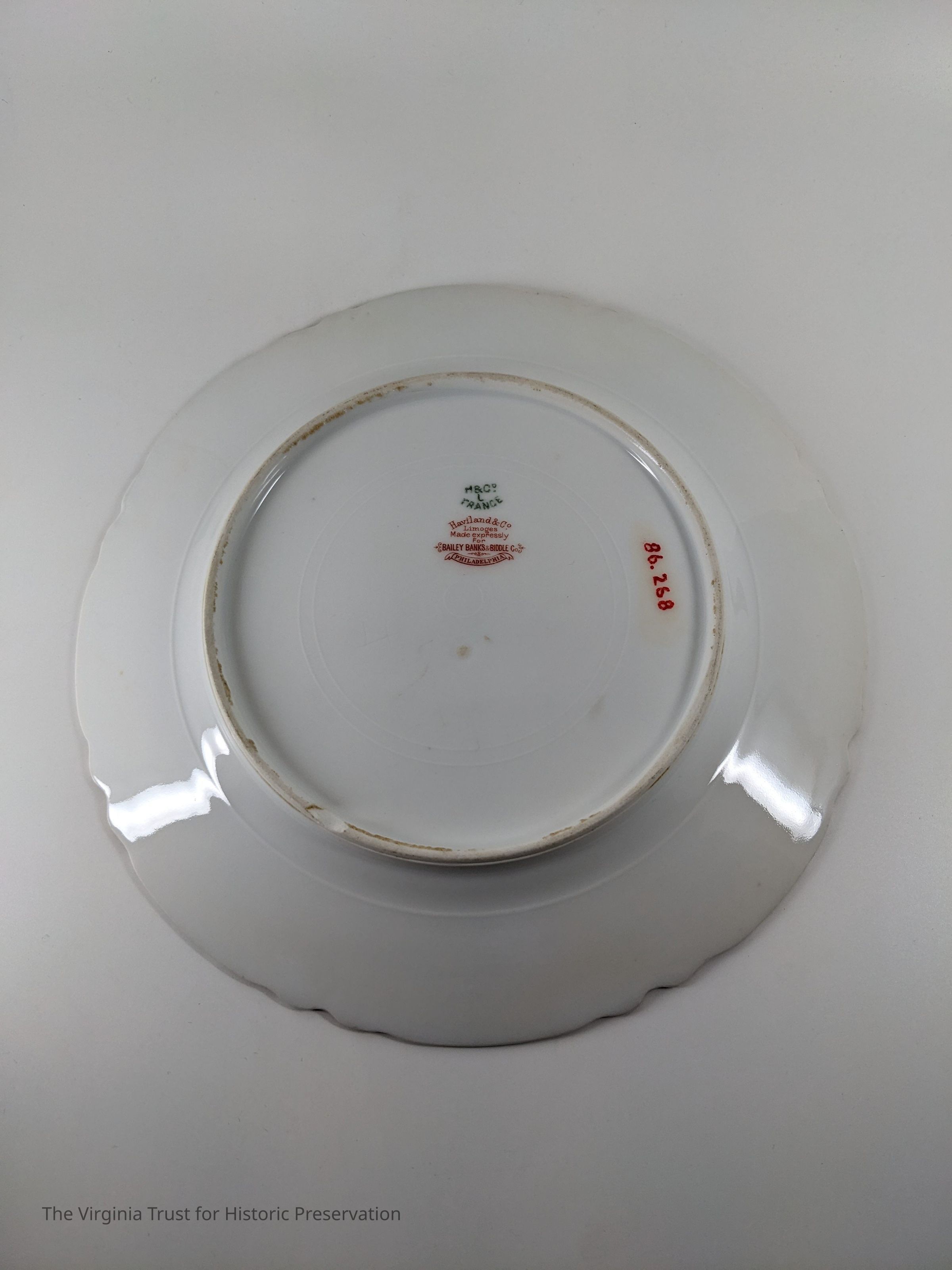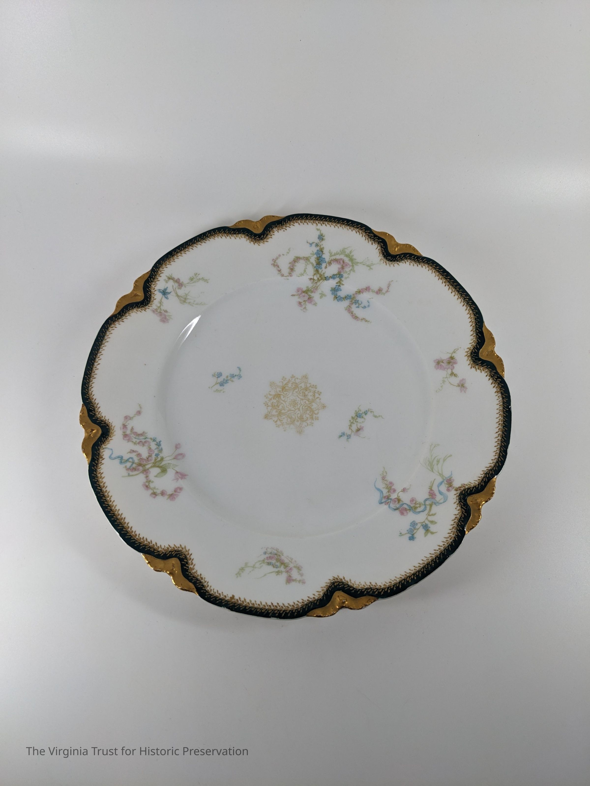 Eleven dessert plates with pale pattern of blue/green and gold. Marked "Haviland & Co. Limoges, Made for Bailey, Banks, and Biddle, Phil. H 7 Co. France."
