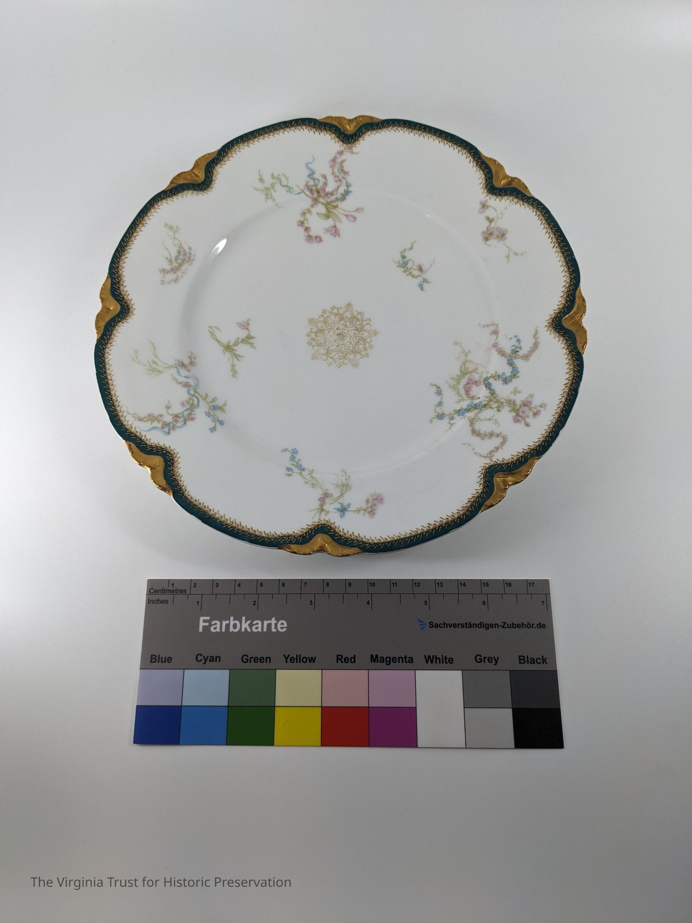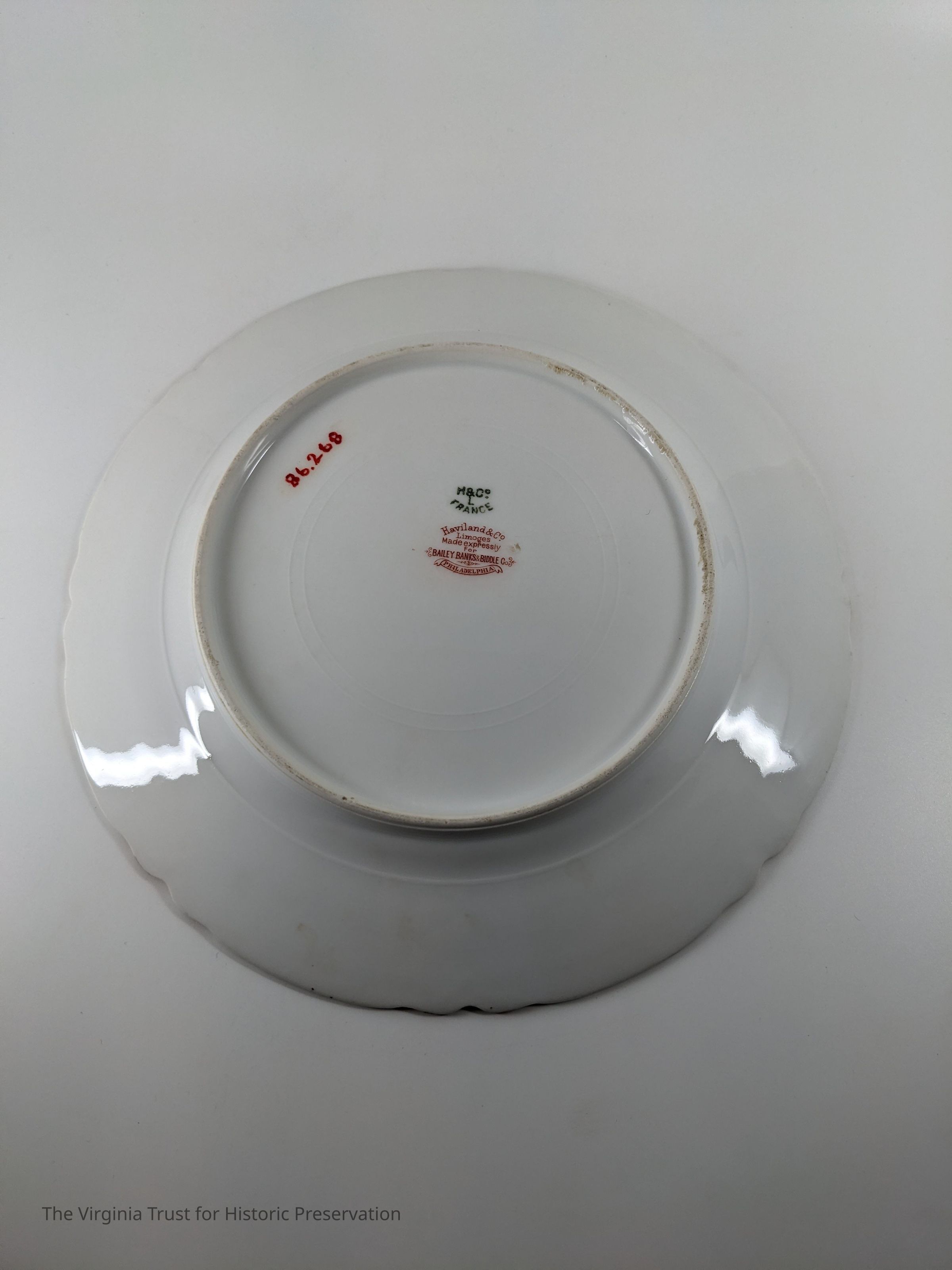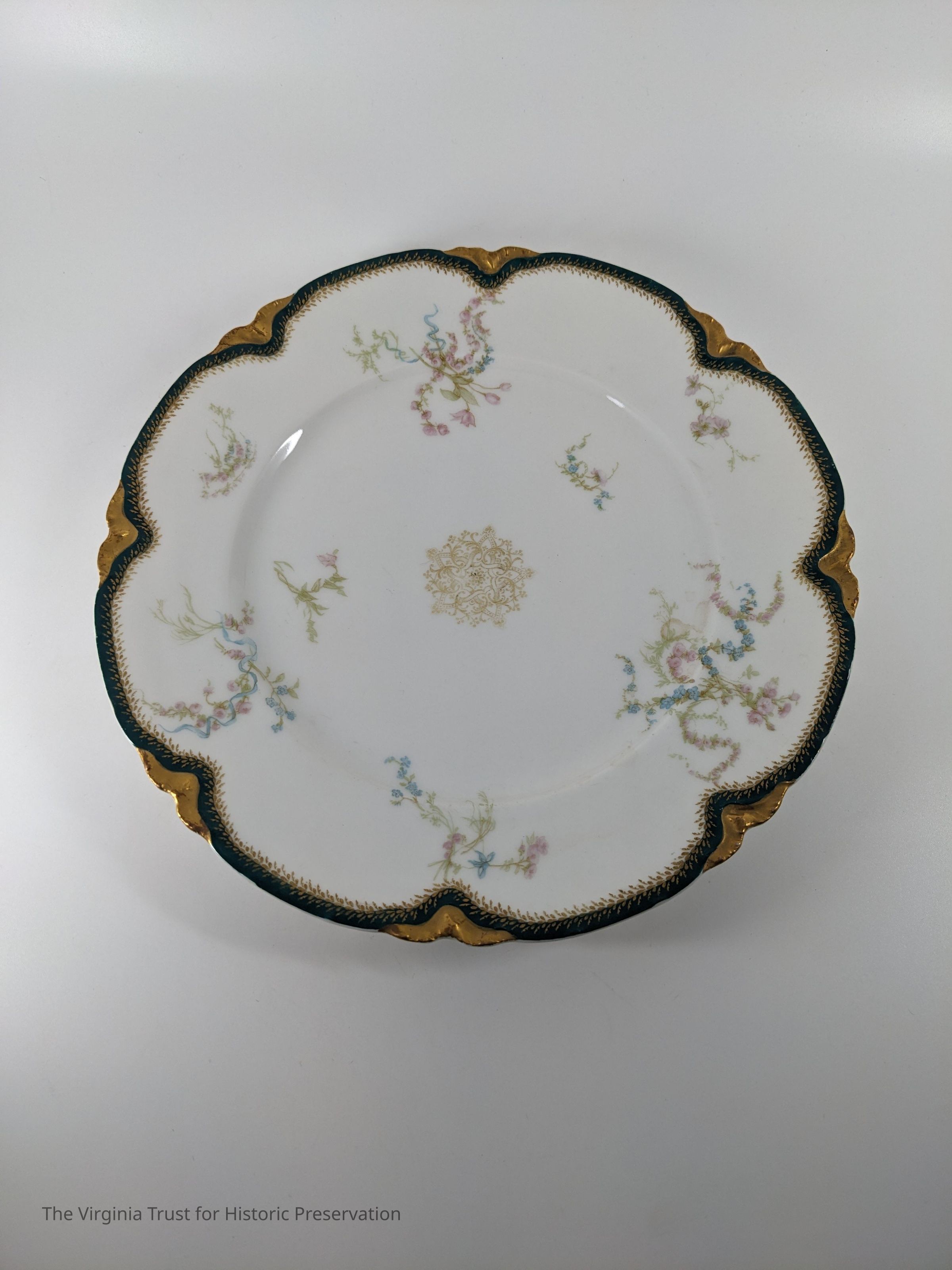 Eleven dessert plates with pale pattern of blue/green and gold. Marked "Haviland & Co. Limoges, Made for Bailey, Banks, and Biddle, Phil. H 7 Co. France."