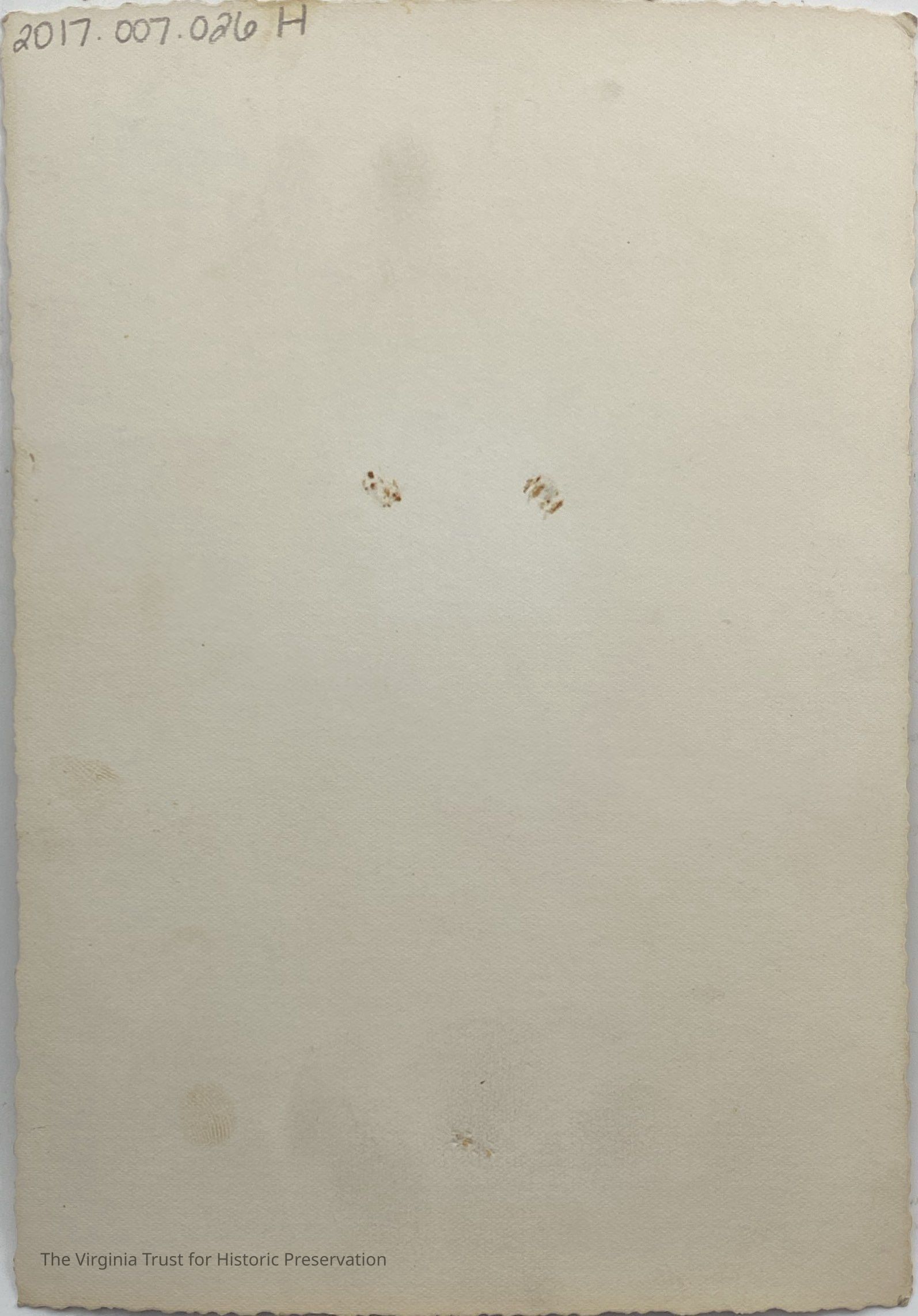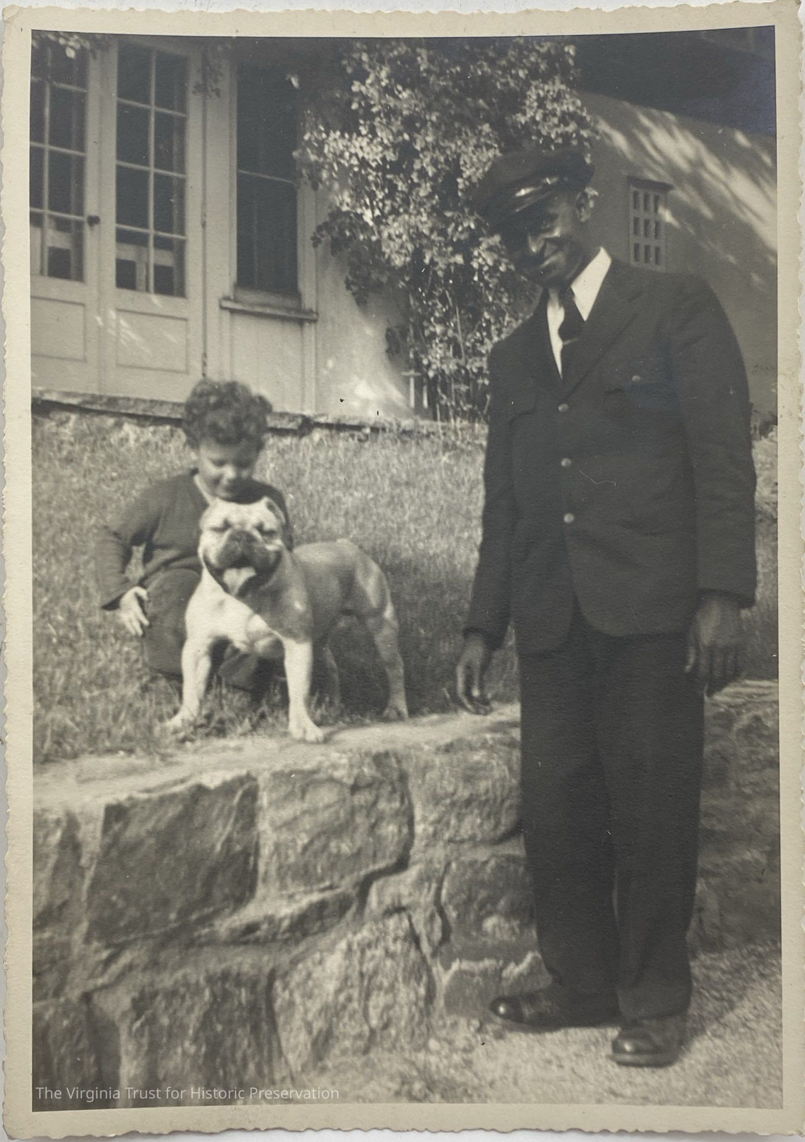 Black and white photograph of James Lewis, Jr. i’m chauffeur suit and cap with bulldog (possibly Socrates - John L. Lewis family dog), and child (possibly one of John’s children). James stands in front of a short brick wall and lawn, while dog and child stand in grass lawn. A house in the background.Dimensions