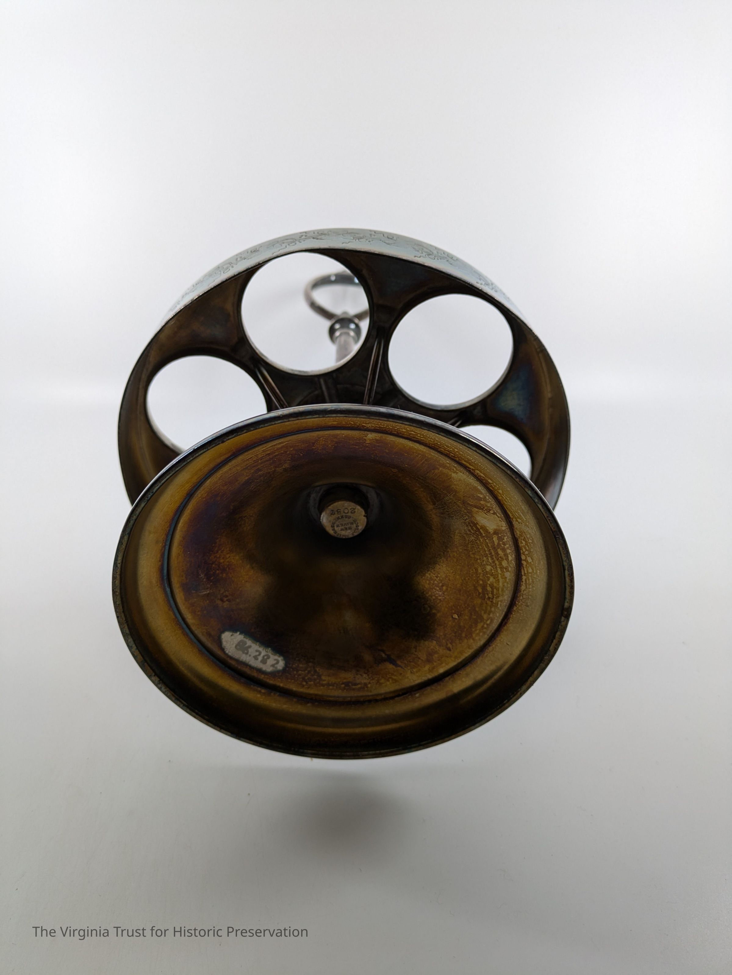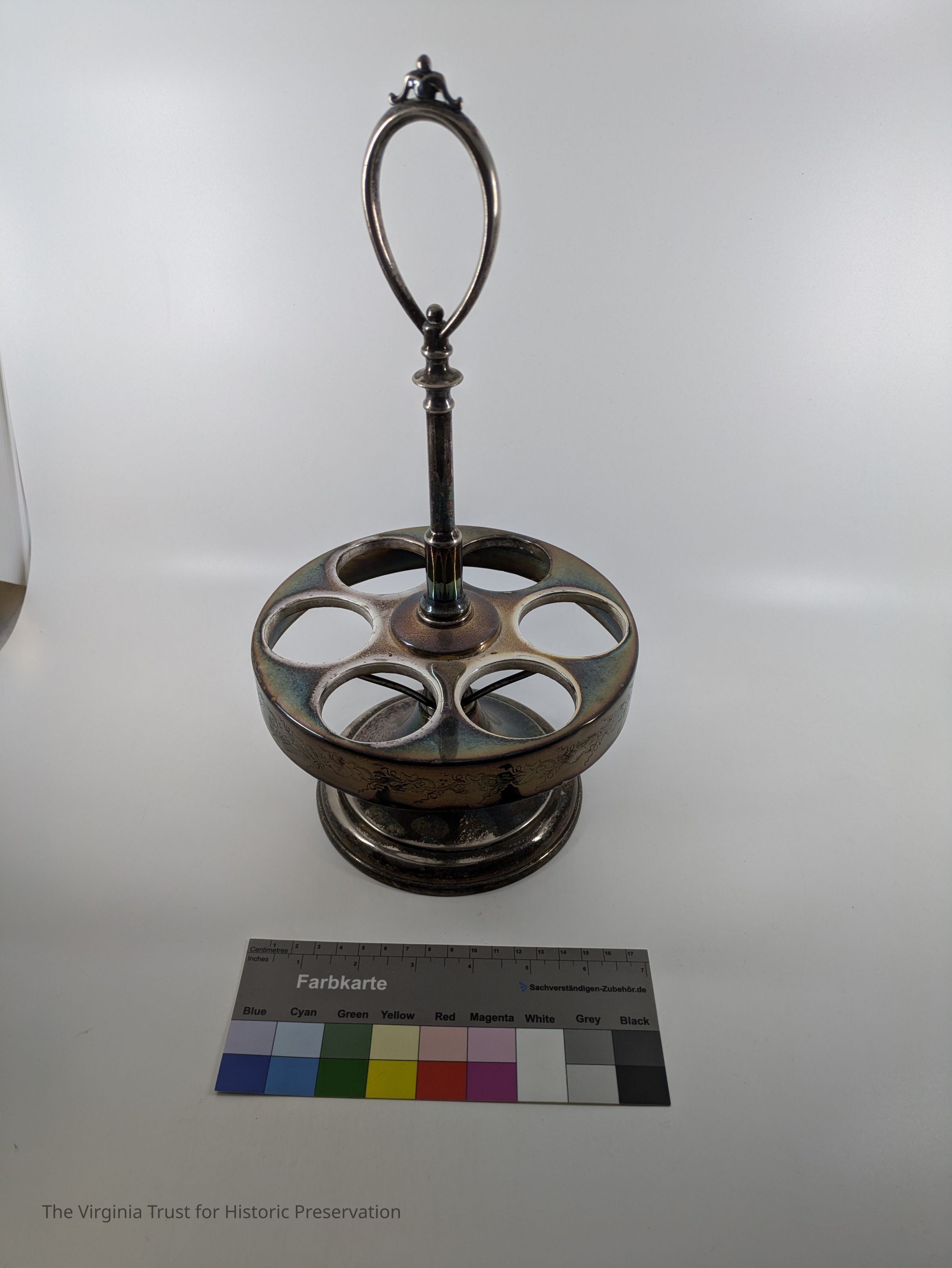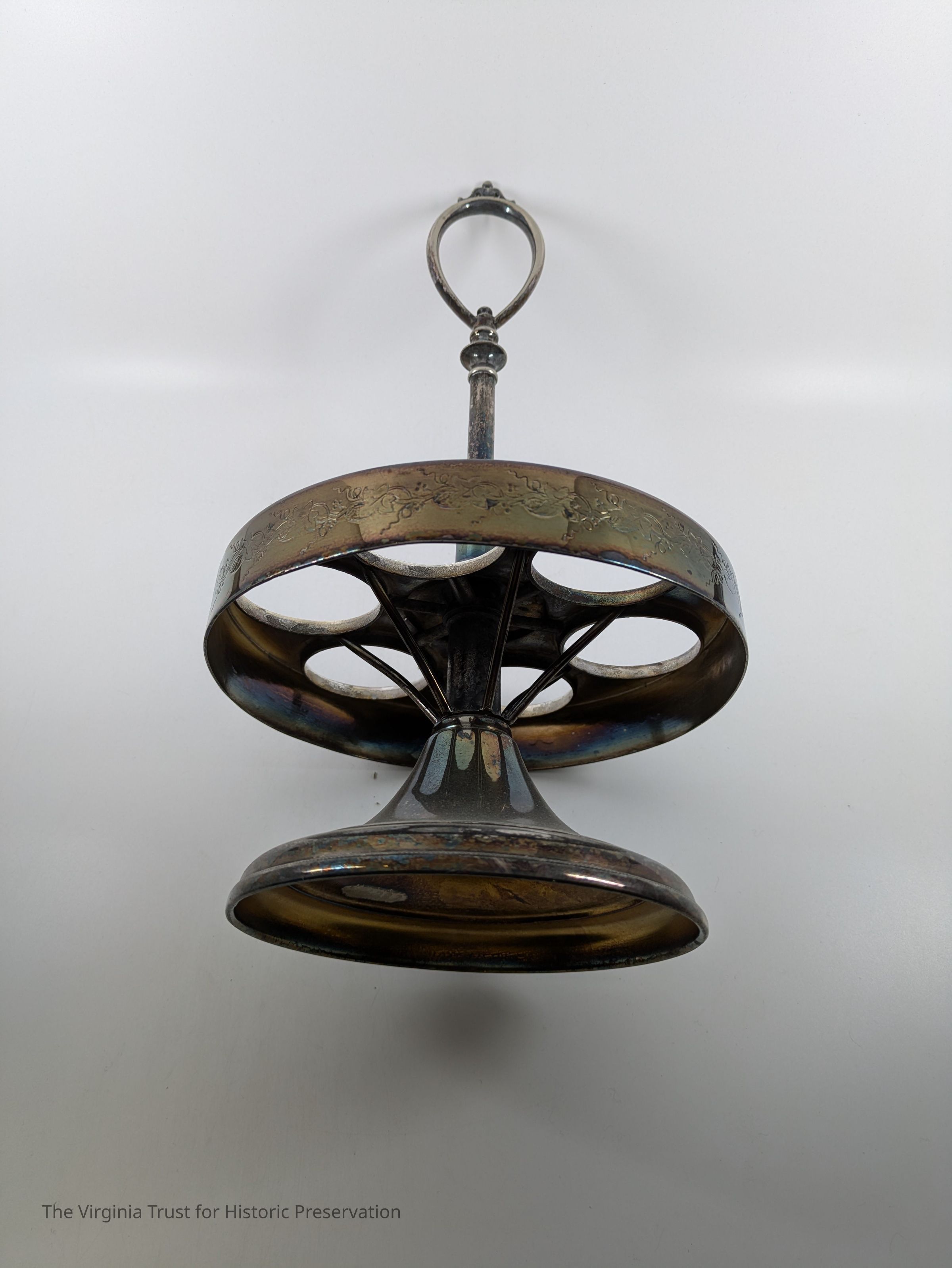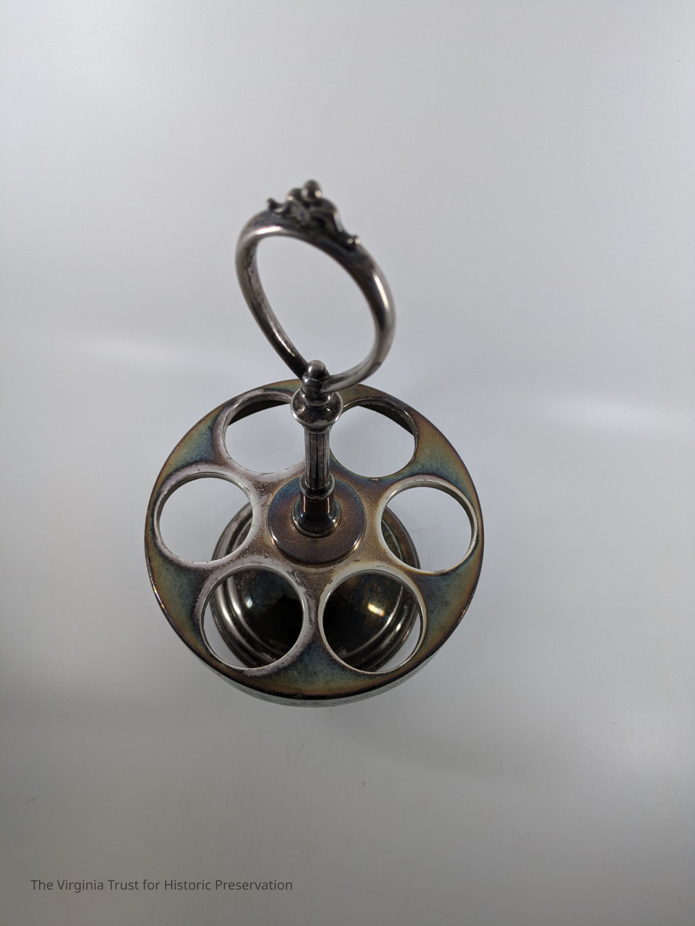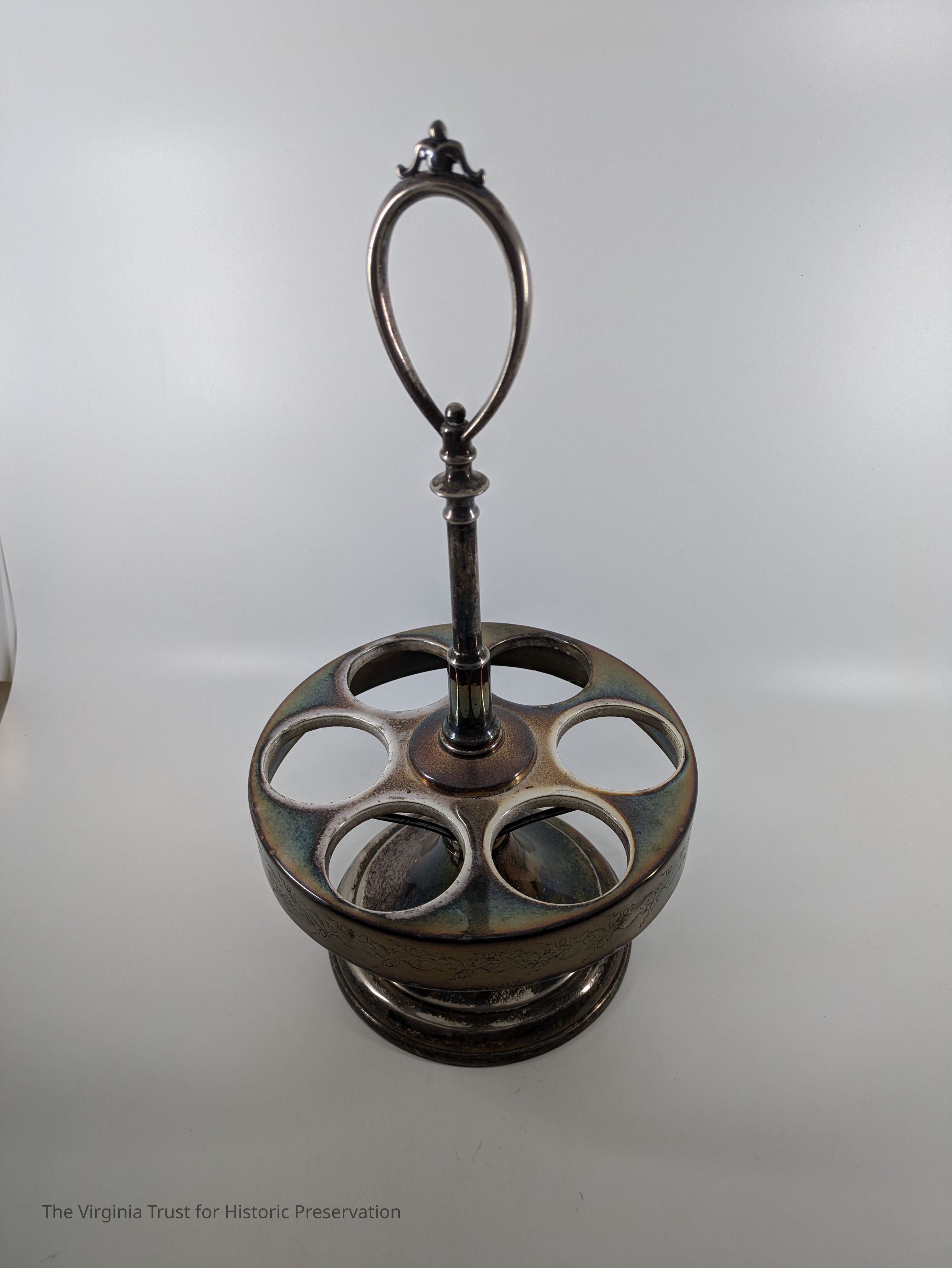 5 bottles; Four with frosted glass pattern, one plain; 3 metal tops and 2 glass stoppers. Stand marked "Rogers, Smith & Co. New Haven Conn 2037." Stand decorated with a leaf and vine pattern.