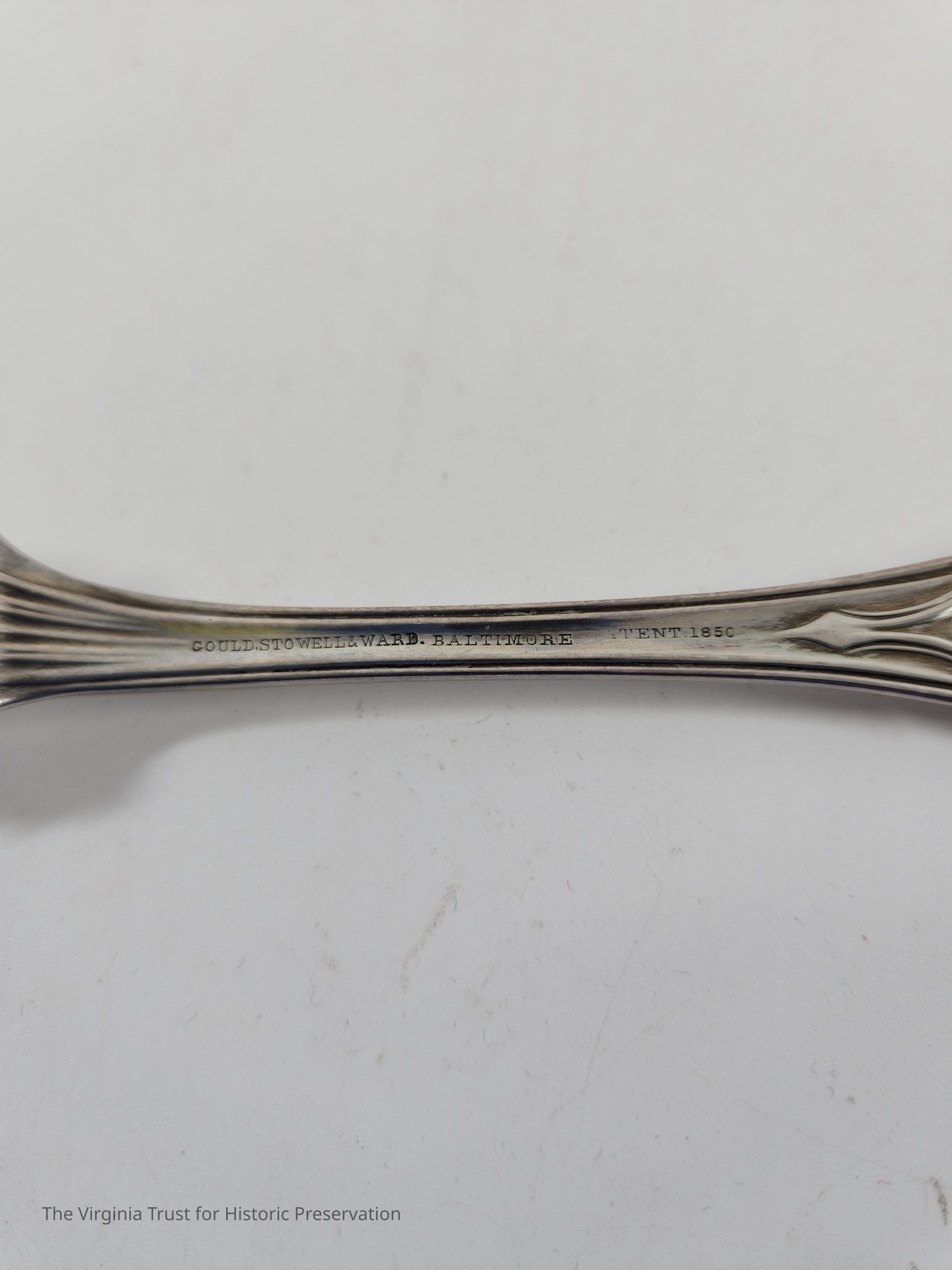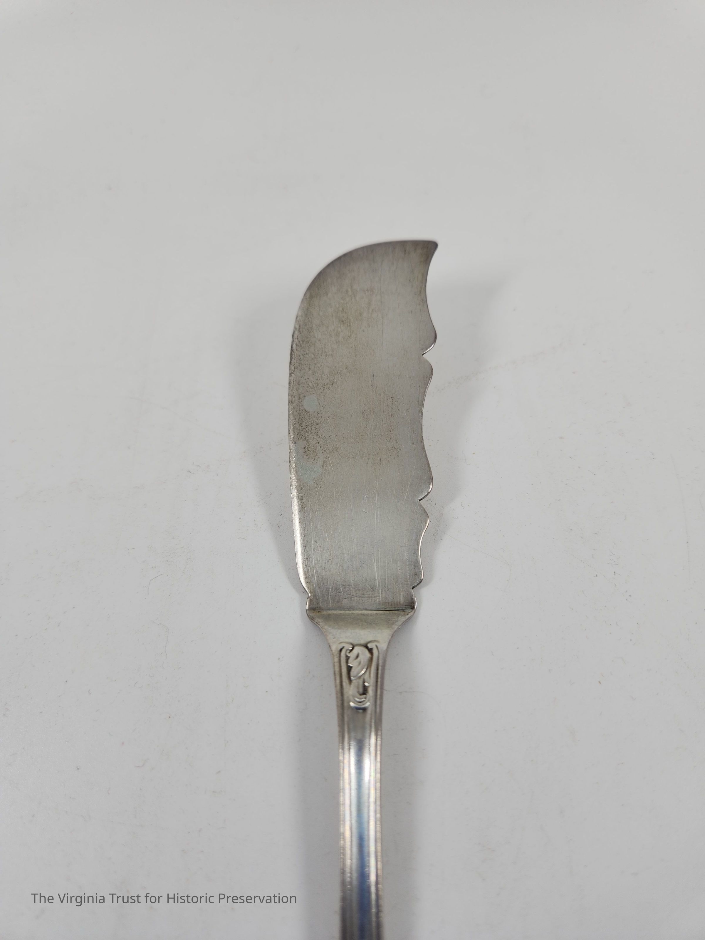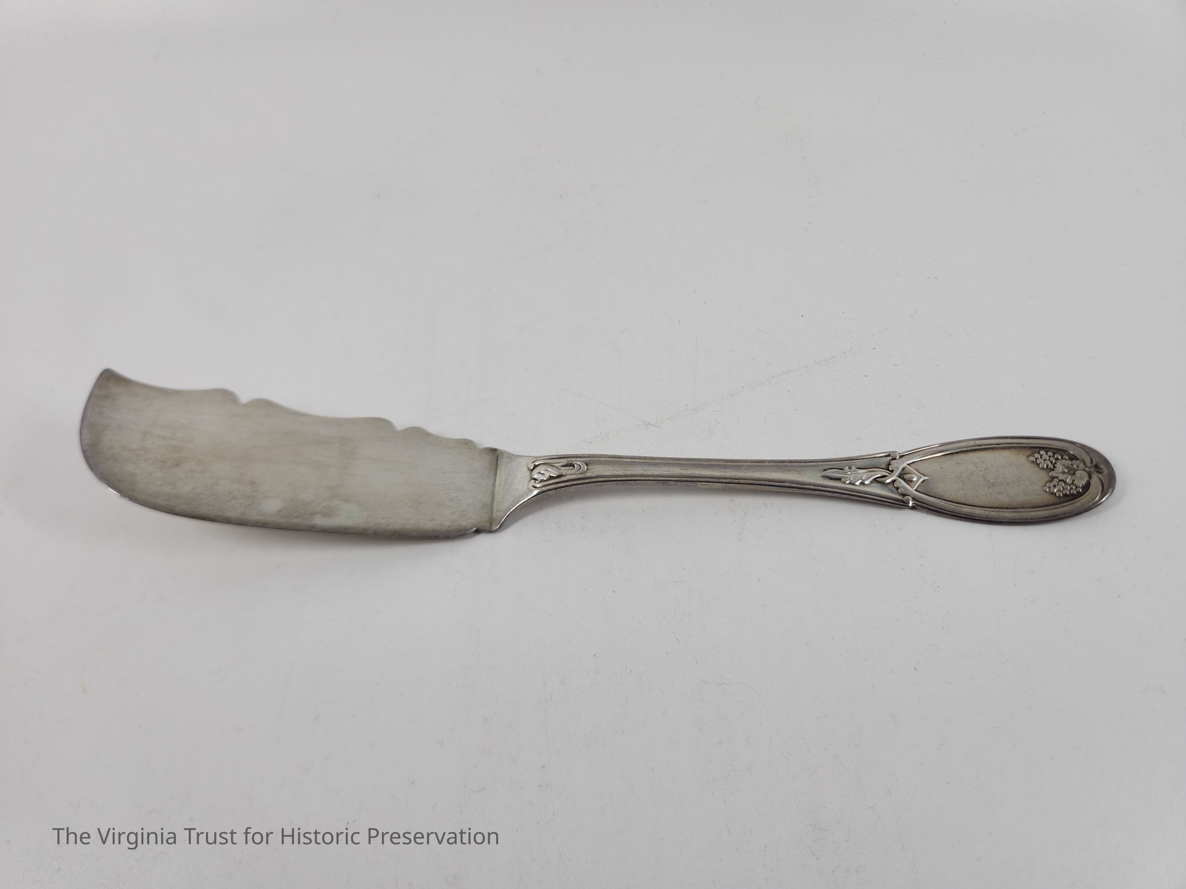 Part of set of two butter knives. Monogram "M" on back of handle. Two bunches of grapes and one grape leaf on handle. Foliate scroll decorated handle. Made by Gould, Stowell, and Ward, Baltimore Patent 1850.