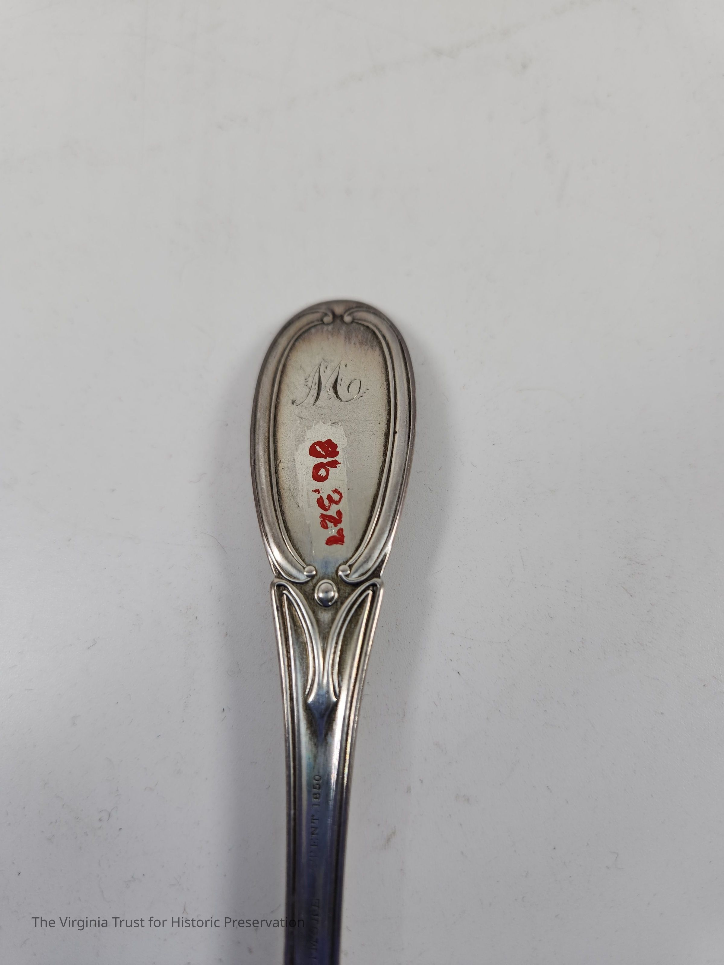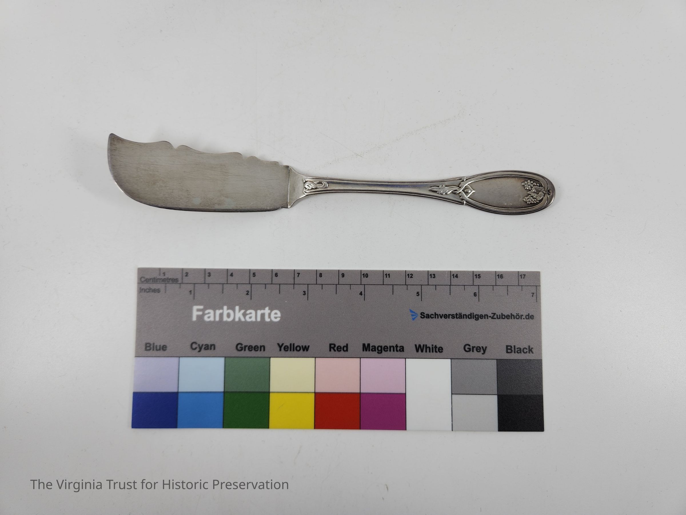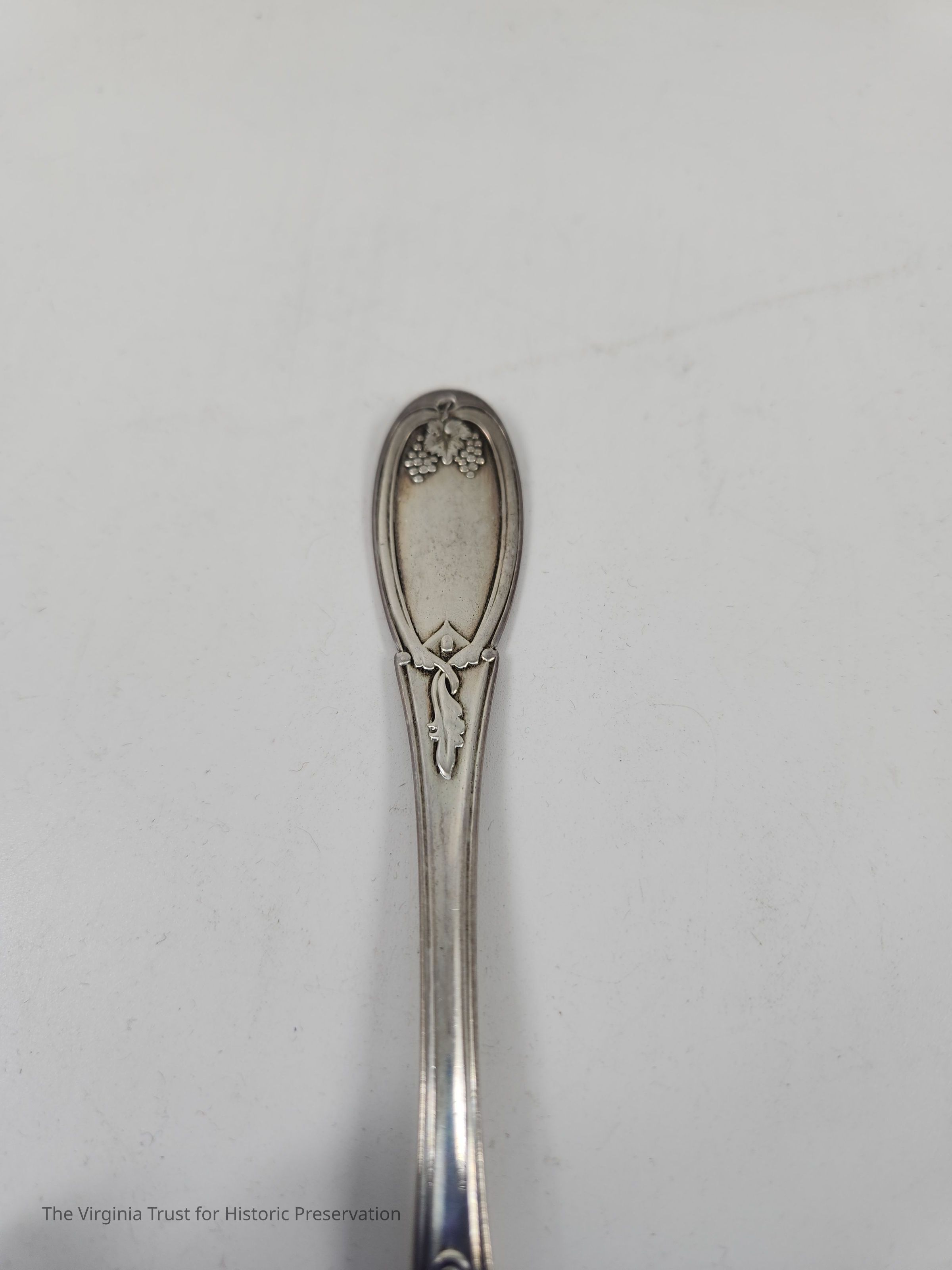 Part of set of two butter knives. Monogram "M" on back of handle. Two bunches of grapes and one grape leaf on handle. Foliate scroll decorated handle. Made by Gould, Stowell, and Ward, Baltimore Patent 1850.