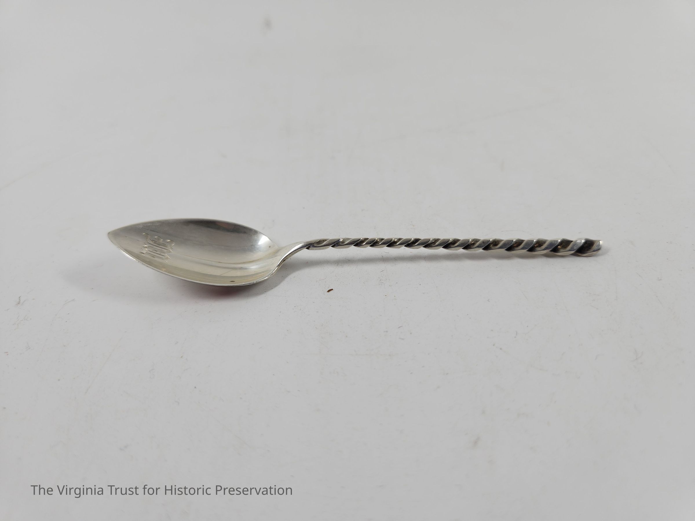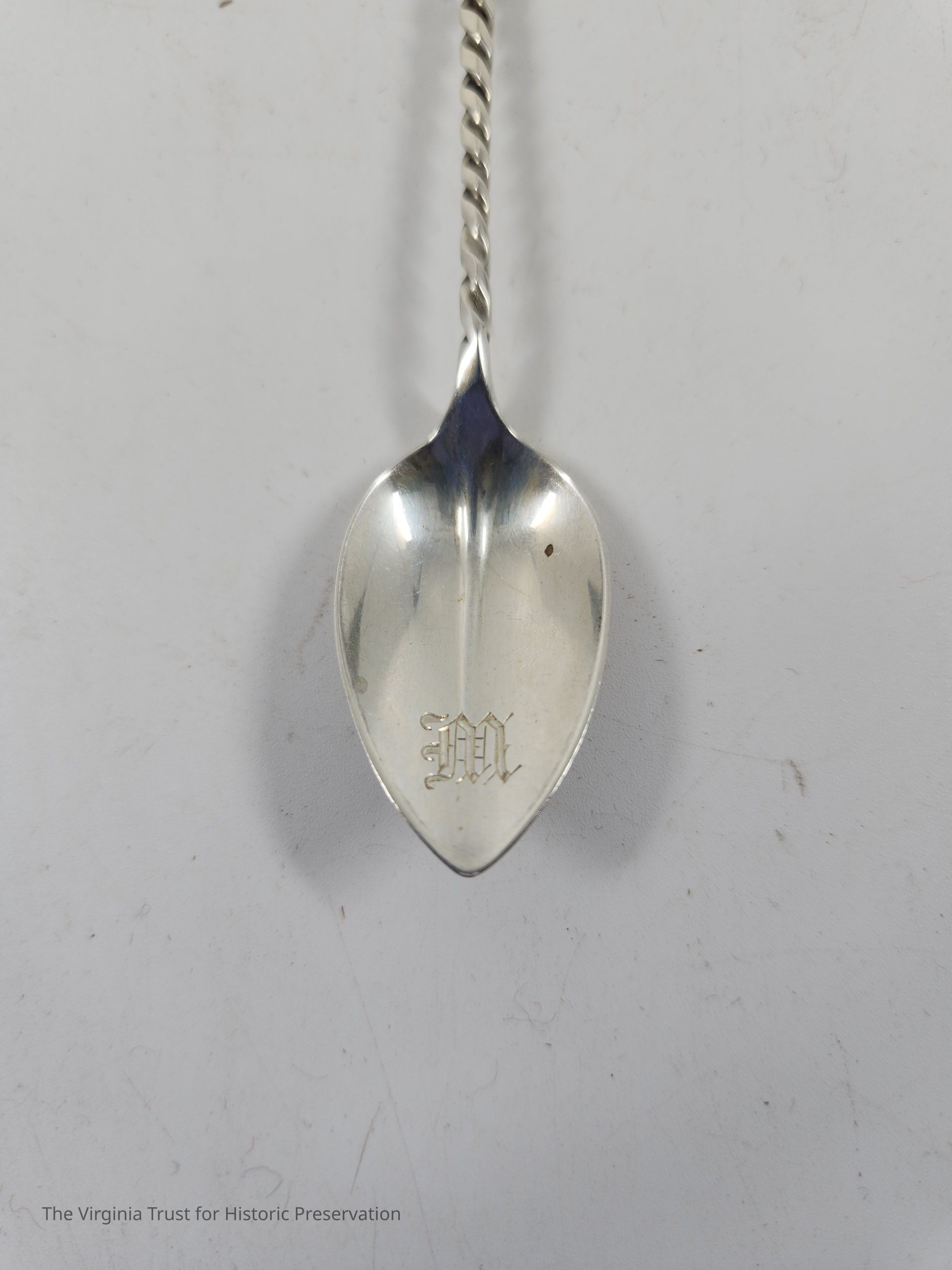 One of a set of six silver demitasse spoons with twisted handle and "M" monogrammed in the bowl