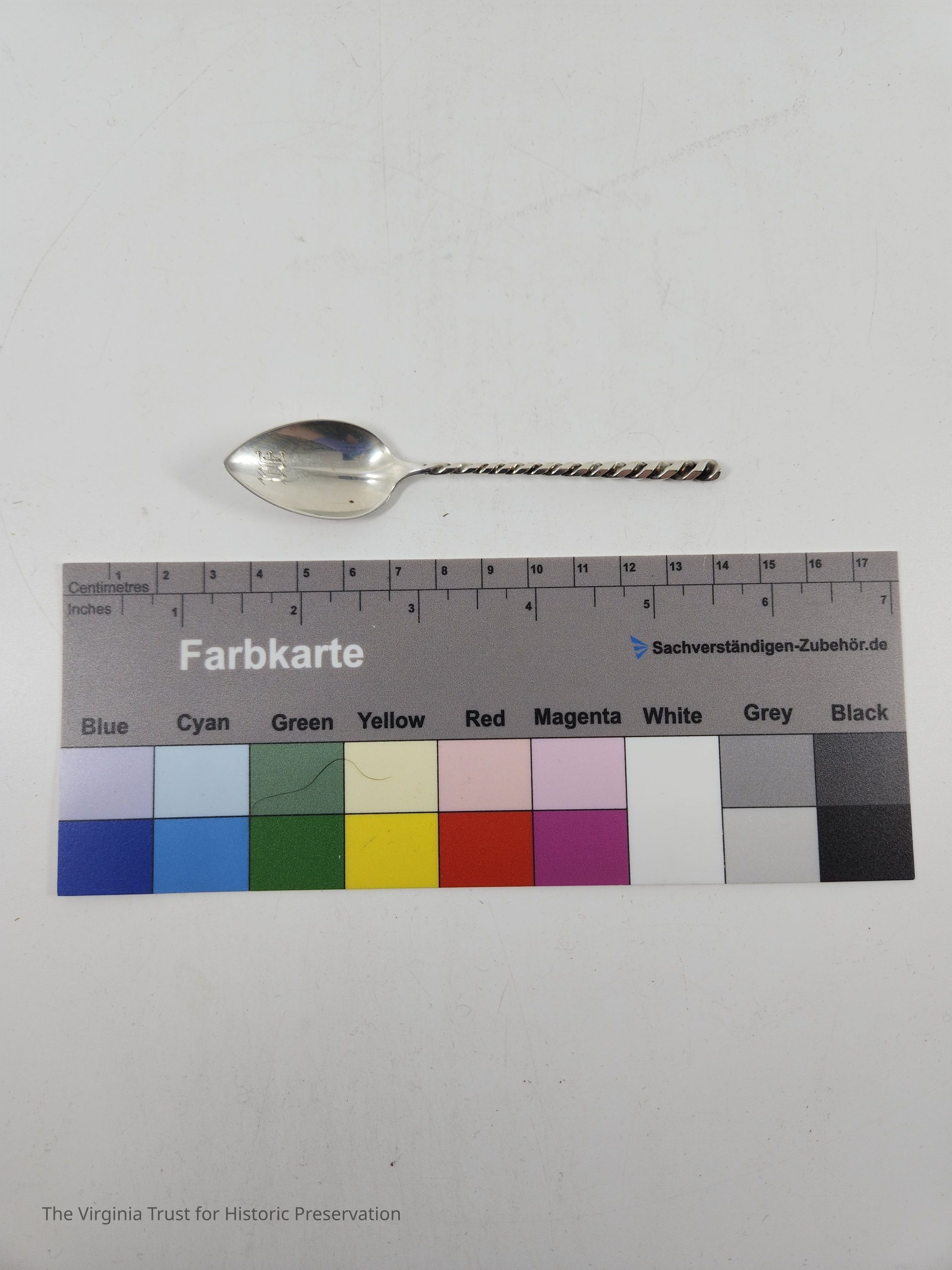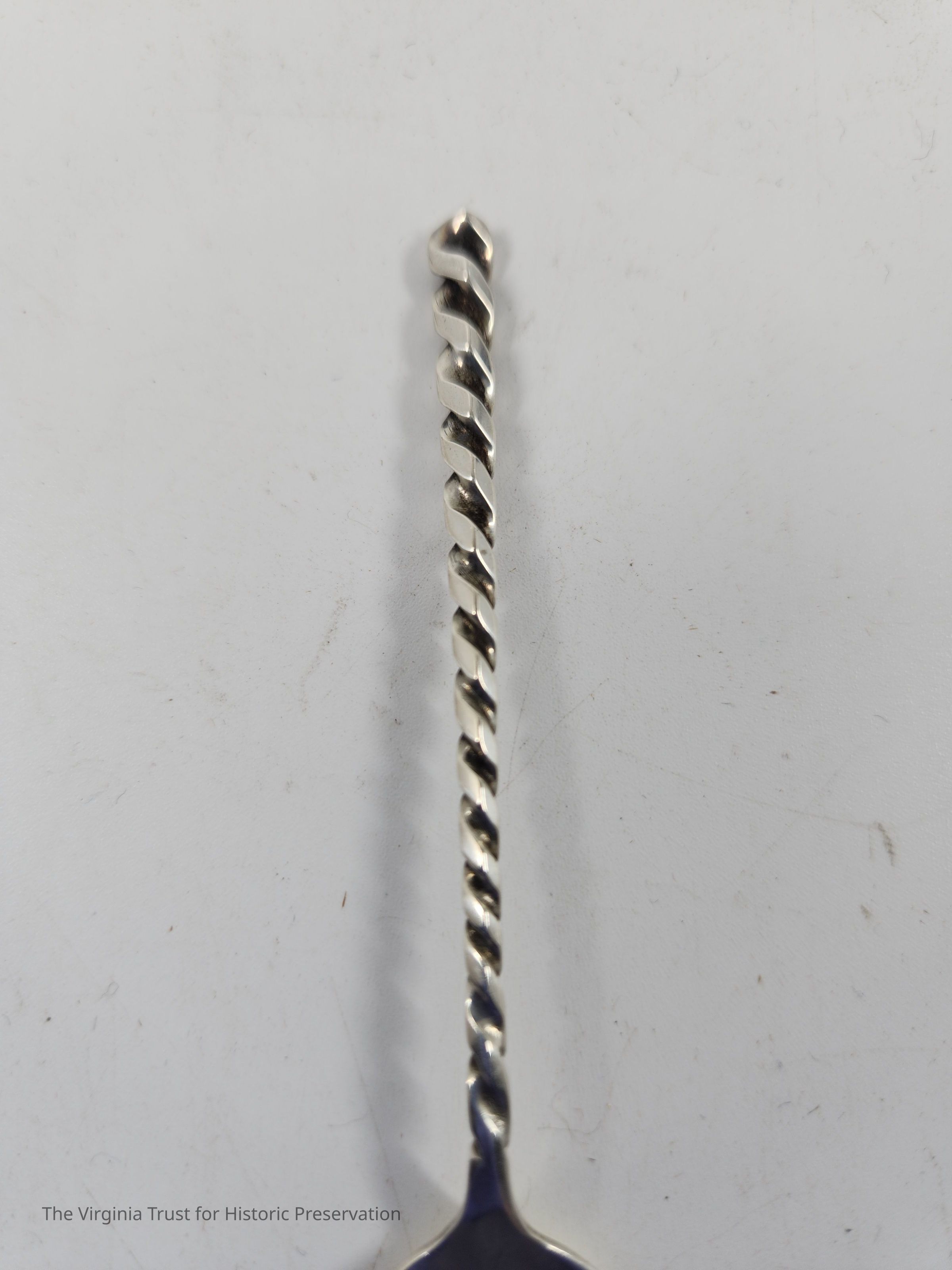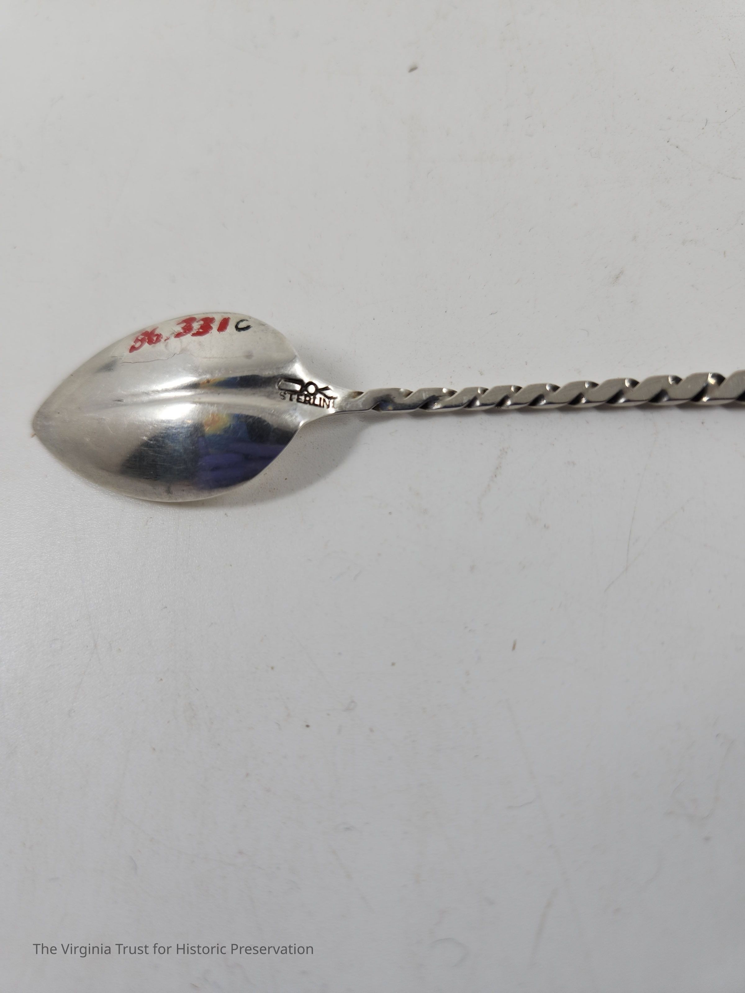 Part of set of six sterling silver demitasse spoons. Monogrammed "M" in bowl. Fully square twisted handle; pointed bowl. has hallmark.