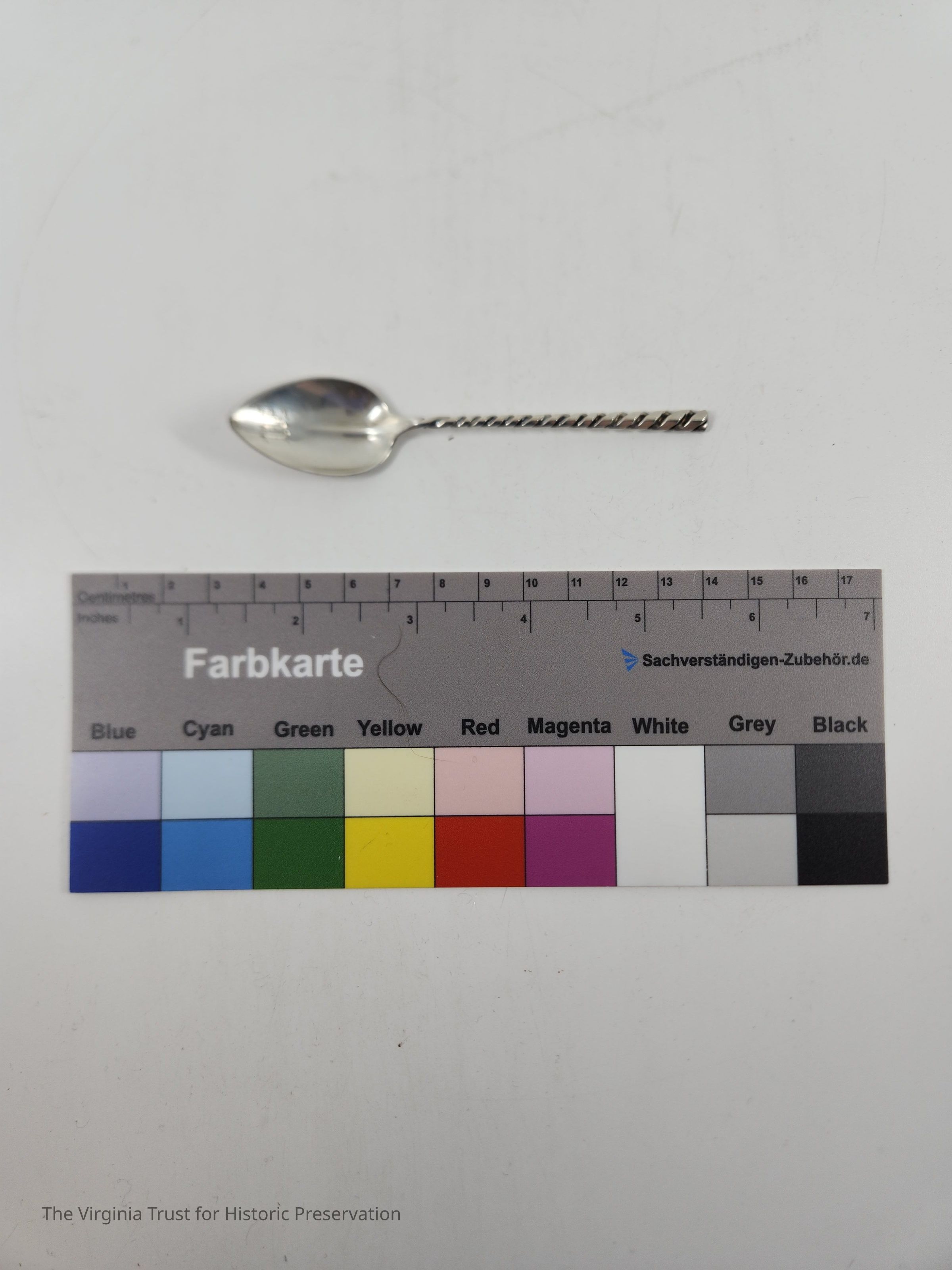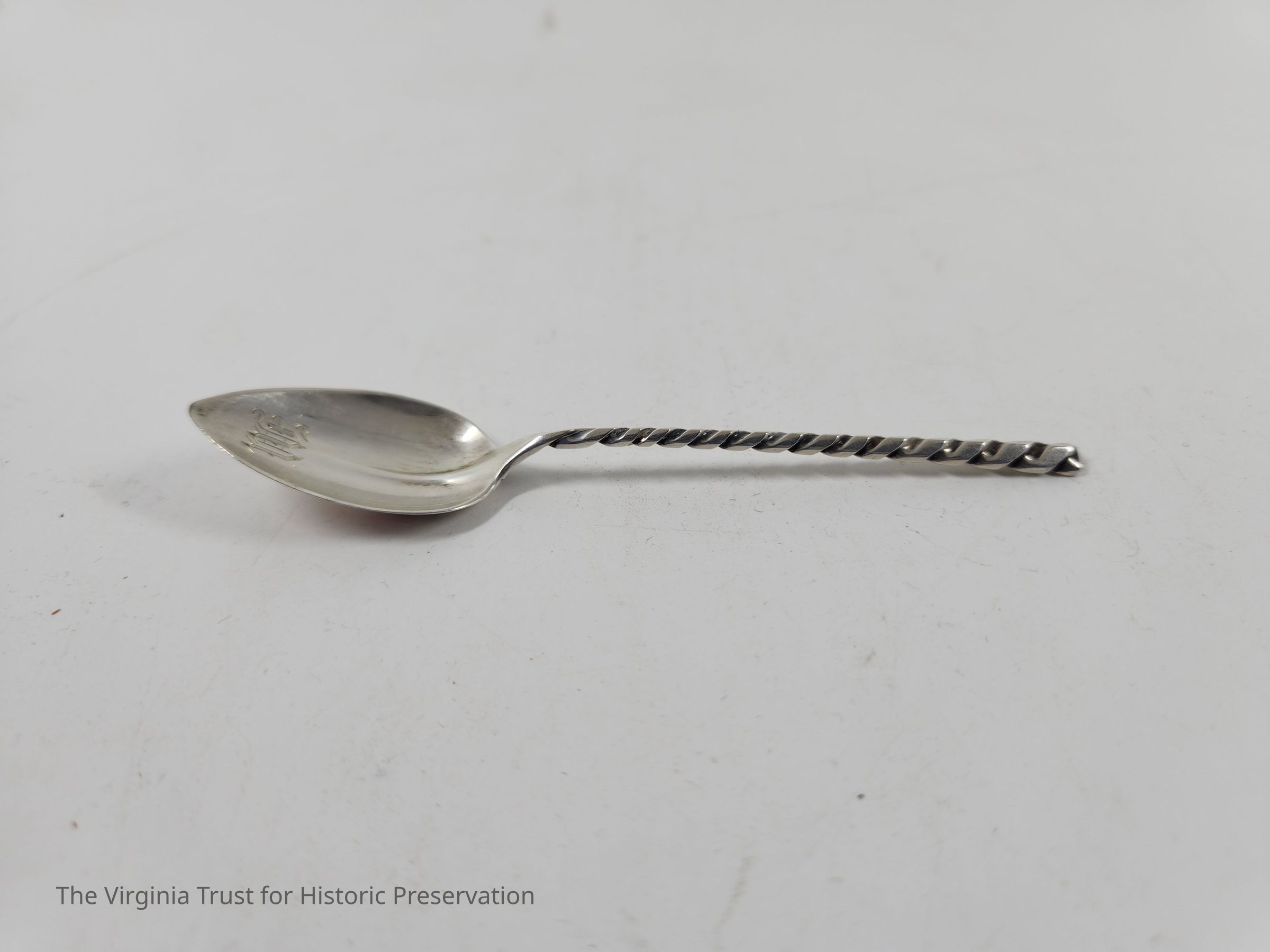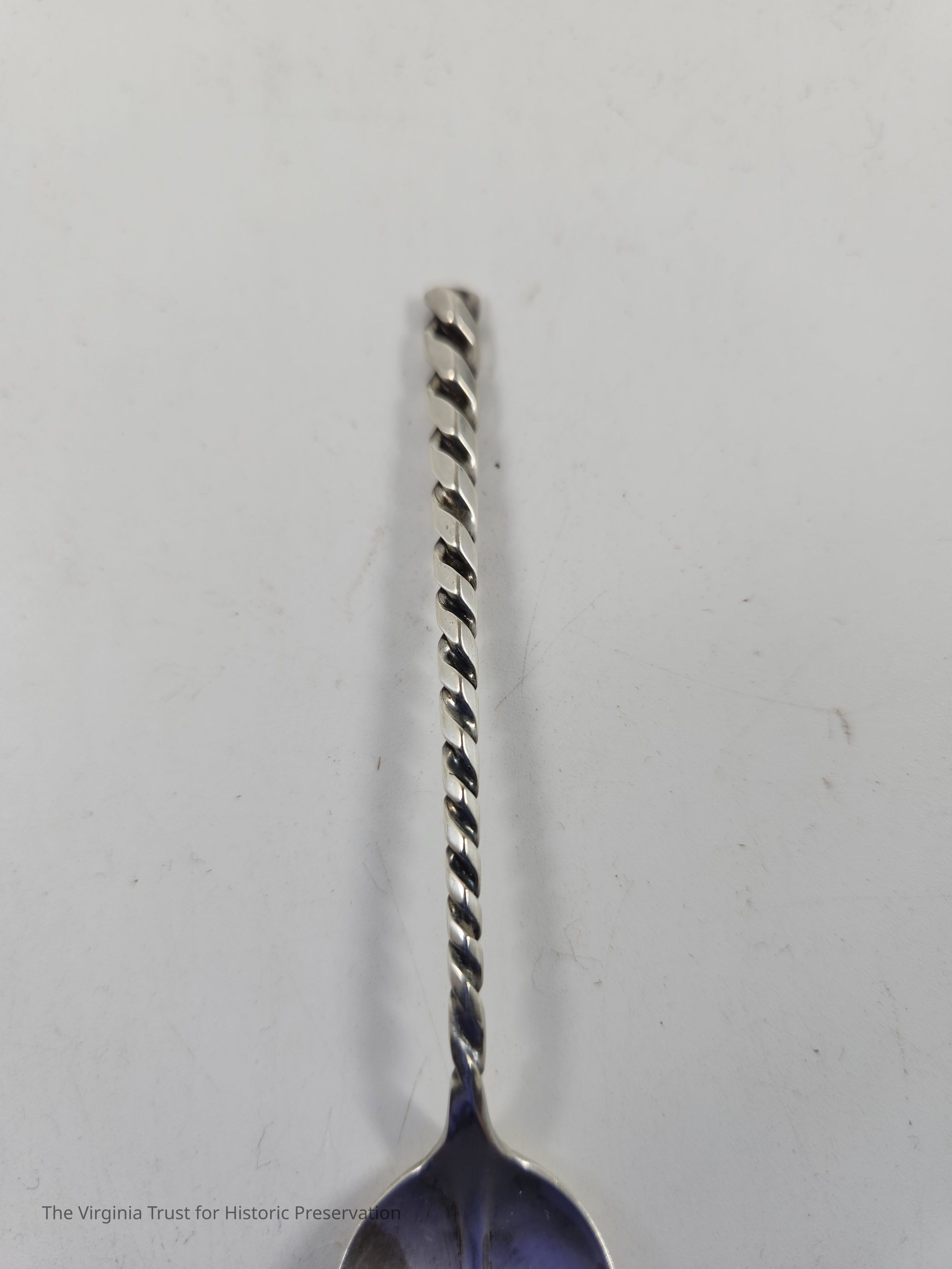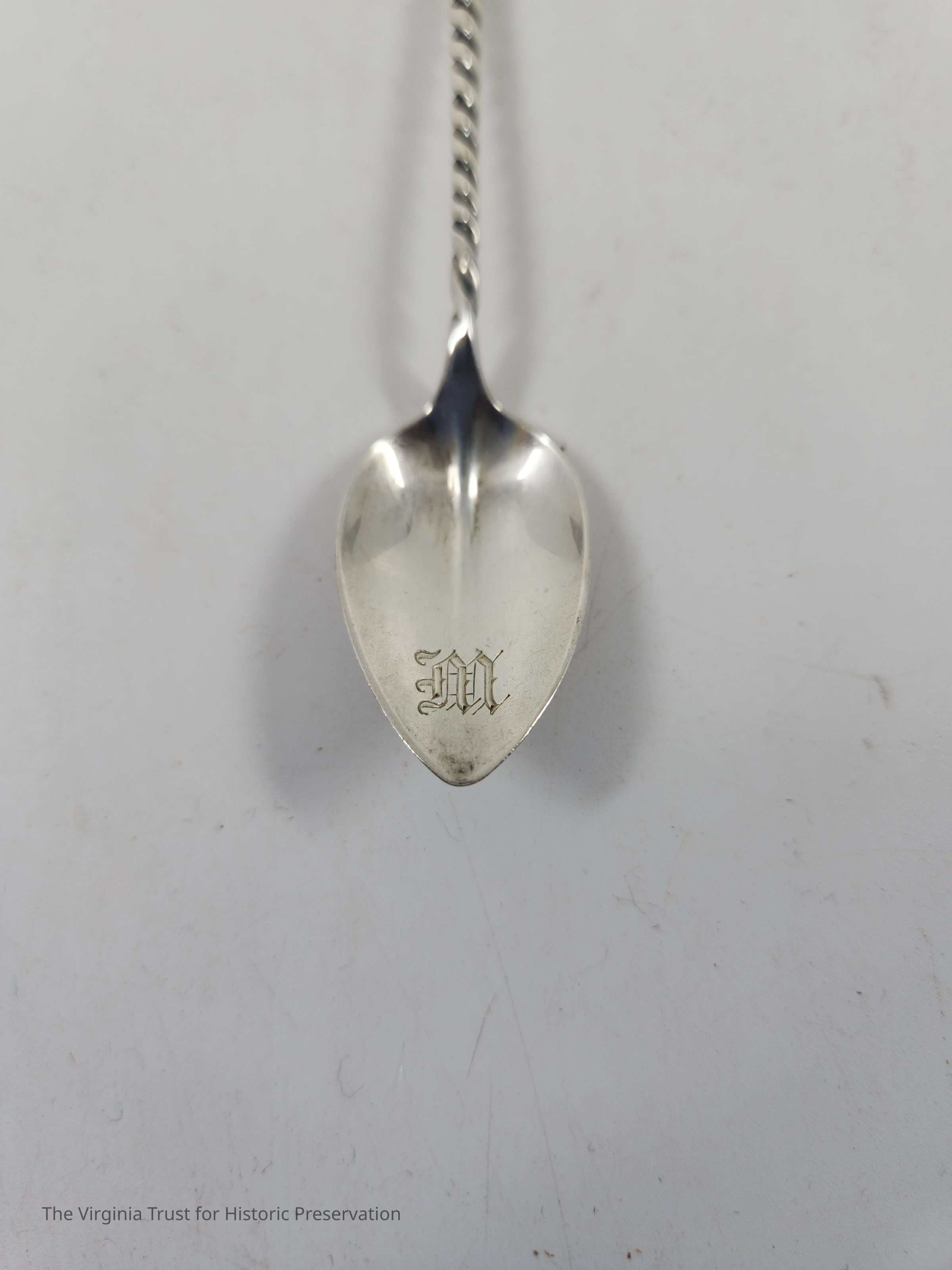 One of a set of six silver demitasse spoons with twisted handle and "M" monogrammed in the bowl