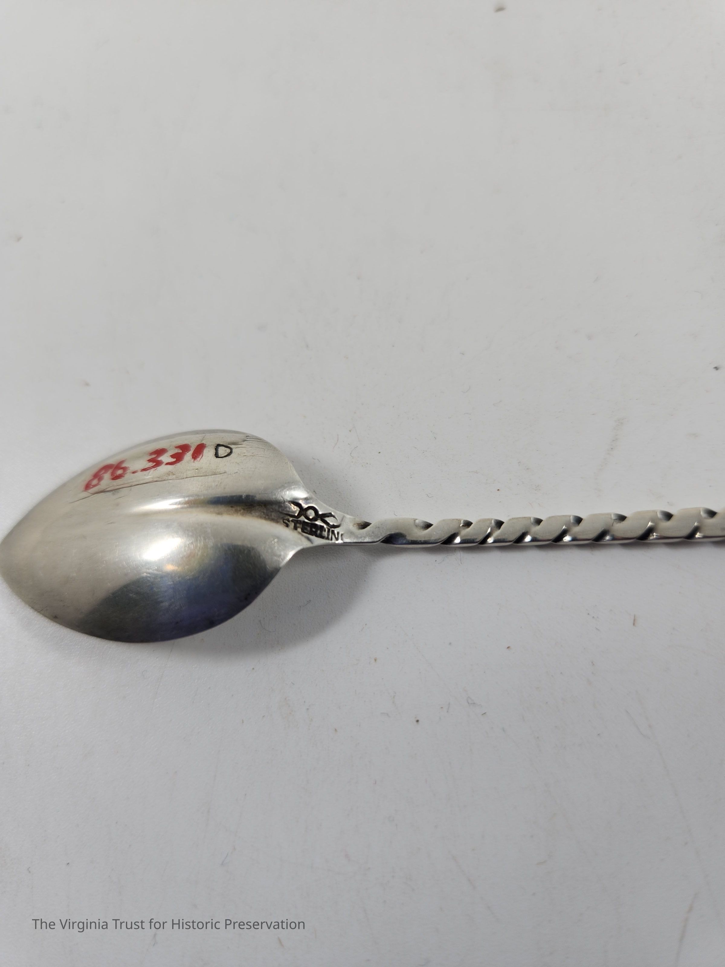 Part of set of six sterling silver demitasse spoons. Monogrammed "M" in bowl. Fully square twisted handle; pointed bowl. has hallmark.
