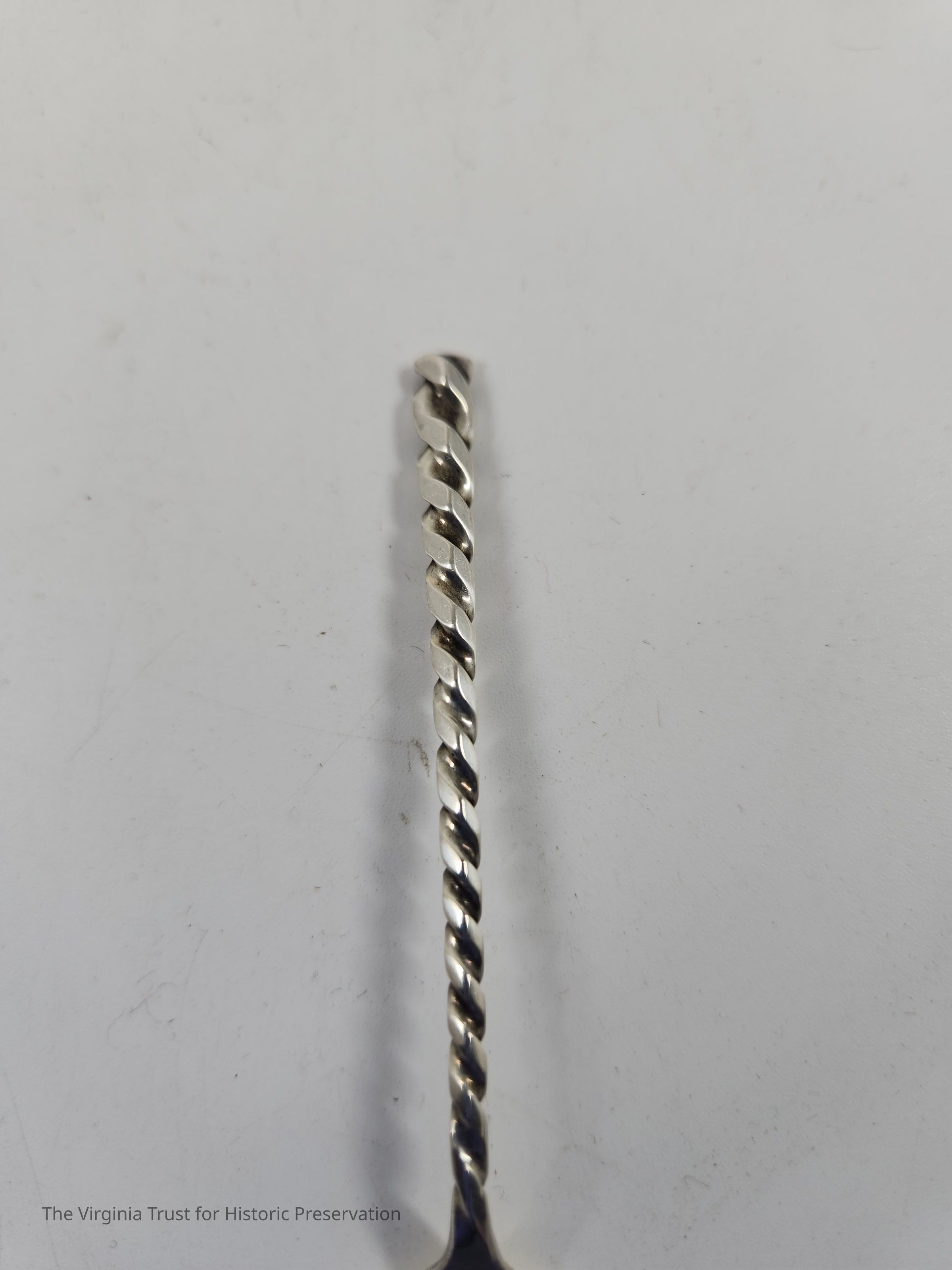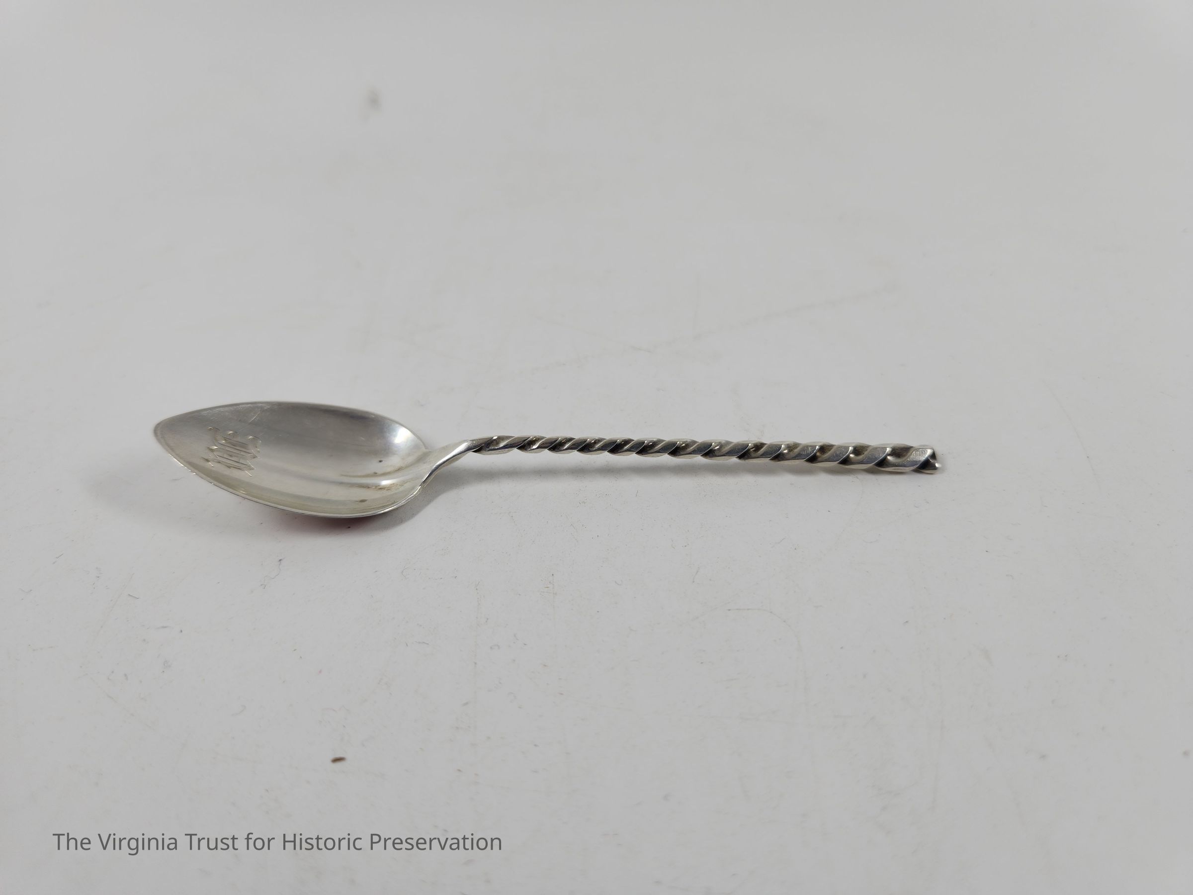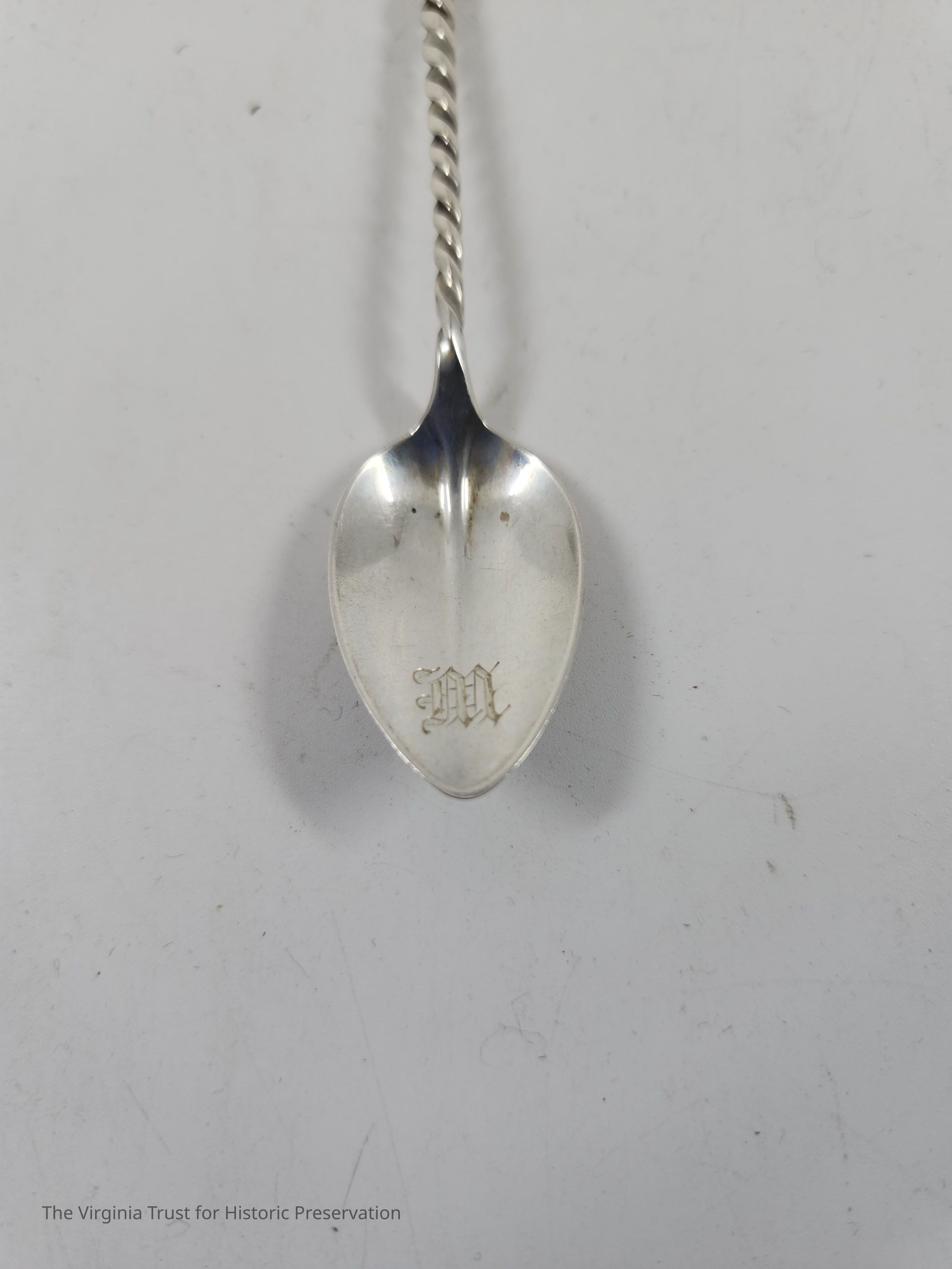 One of a set of six silver demitasse spoons with twisted handle and "M" monogrammed in the bowl