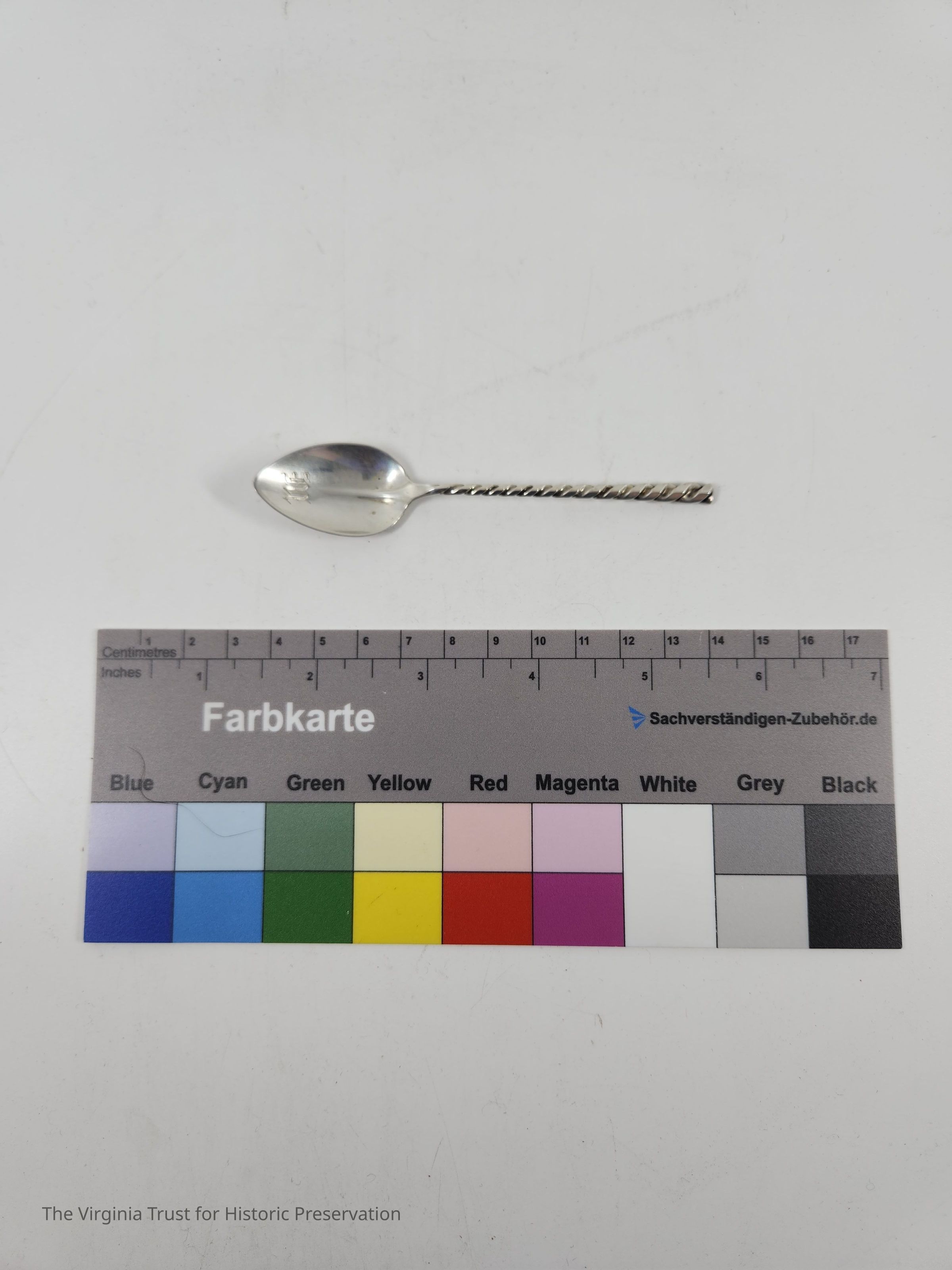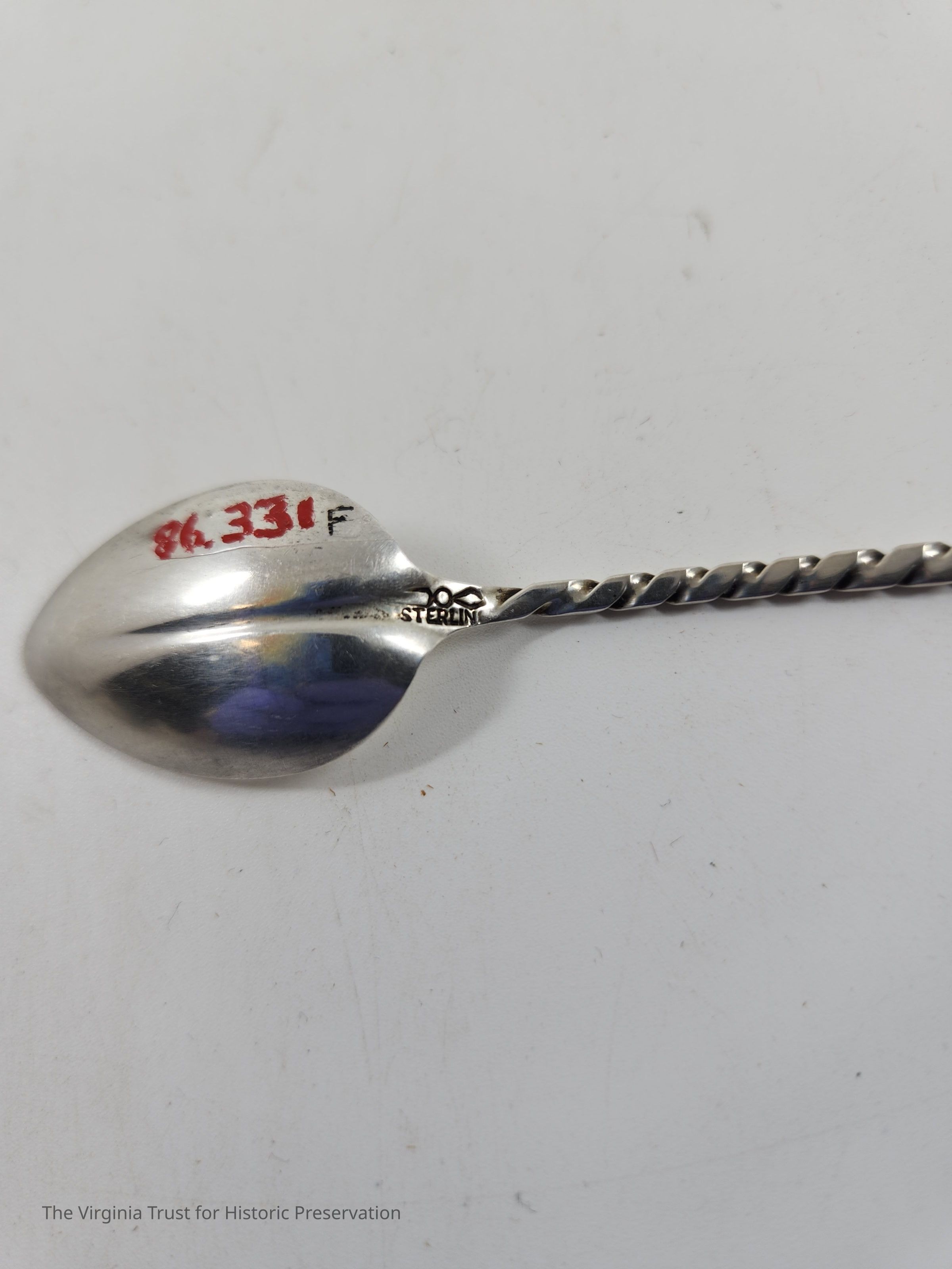 Part of set of six sterling silver demitasse spoons. Monogrammed "M" in bowl. Fully square twisted handle; pointed bowl. has hallmark.