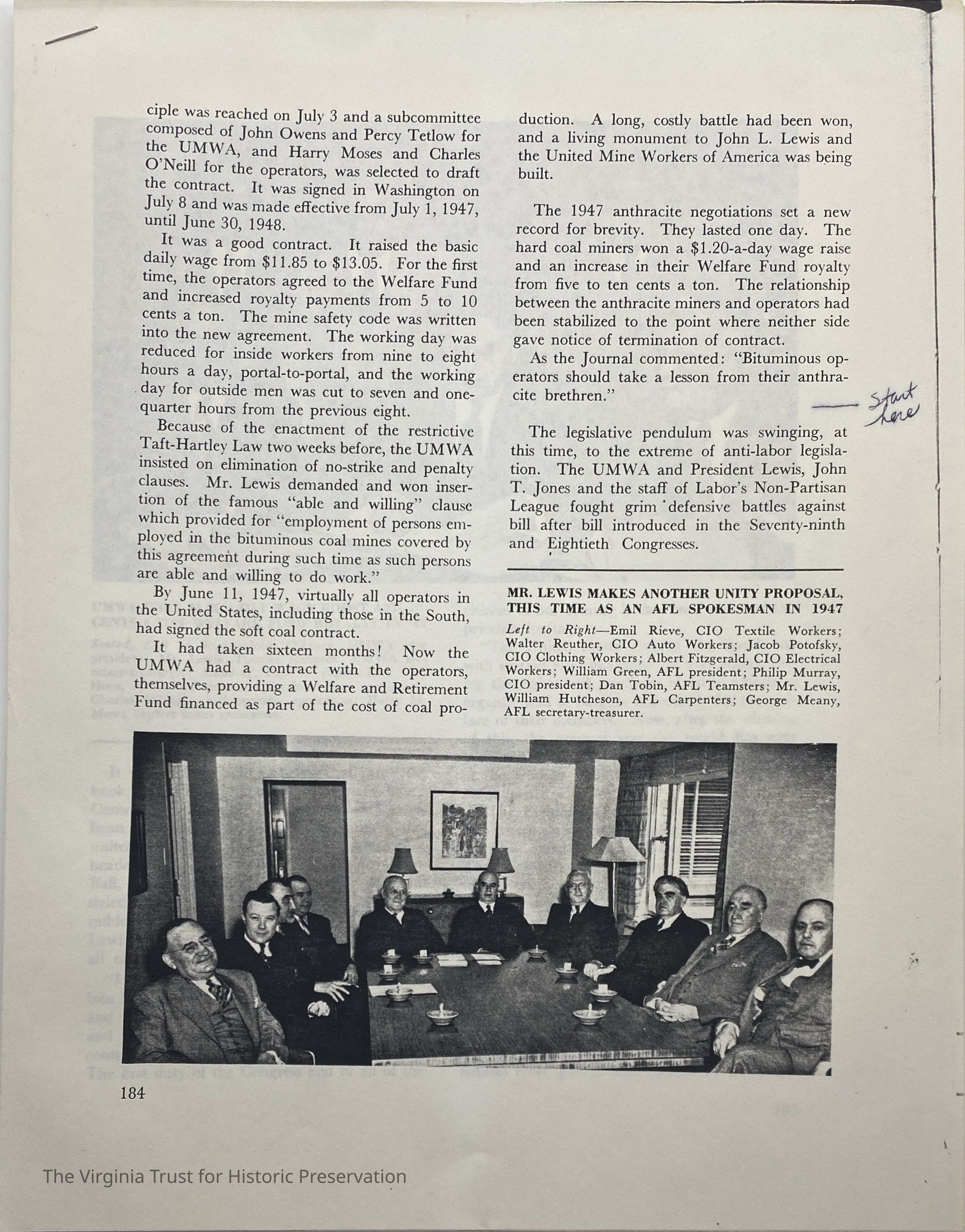 16-page packet of photocopied pages of a book. Focused on John L. Lewis’ work between in 1947-1948, especially on the Taft-Hartley Act.